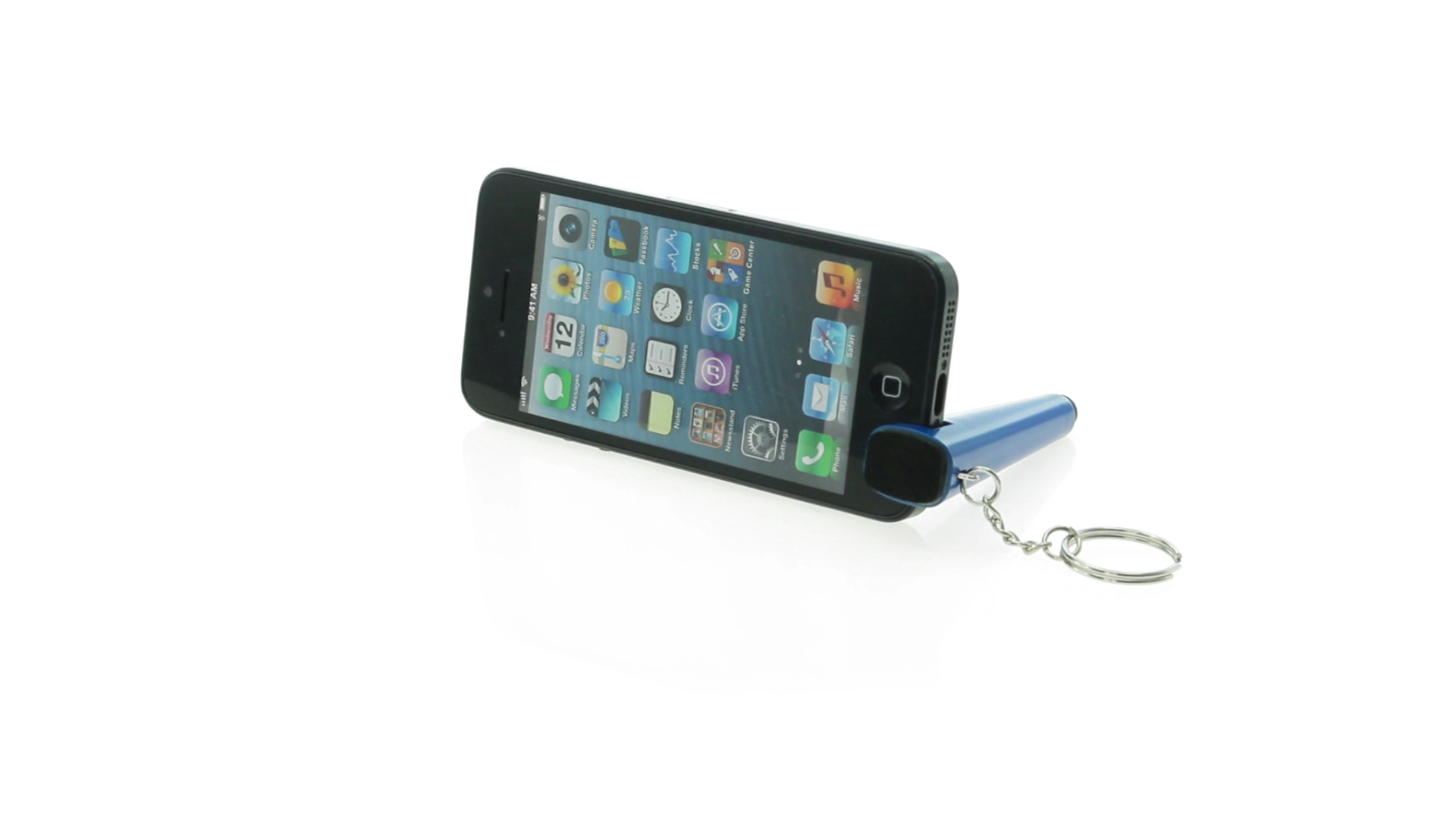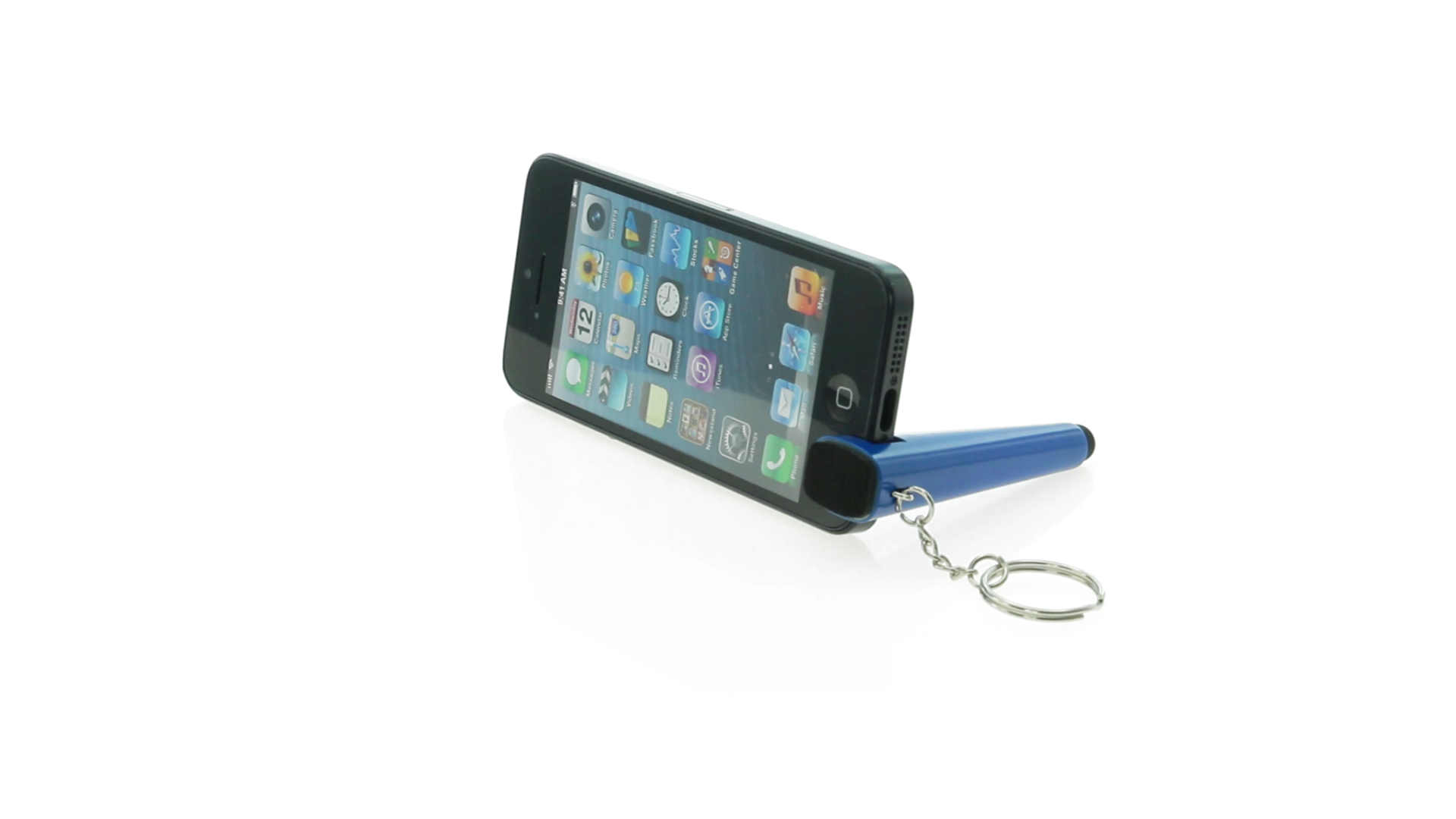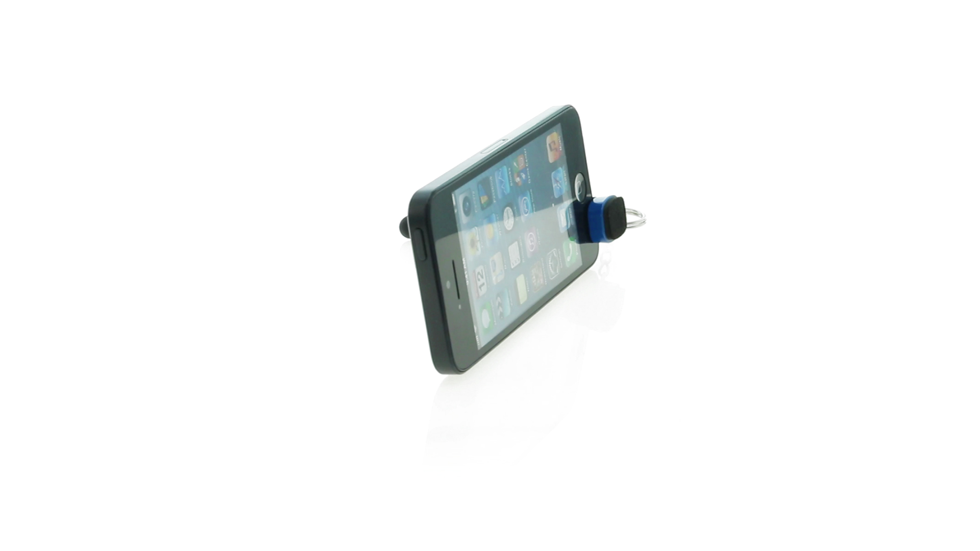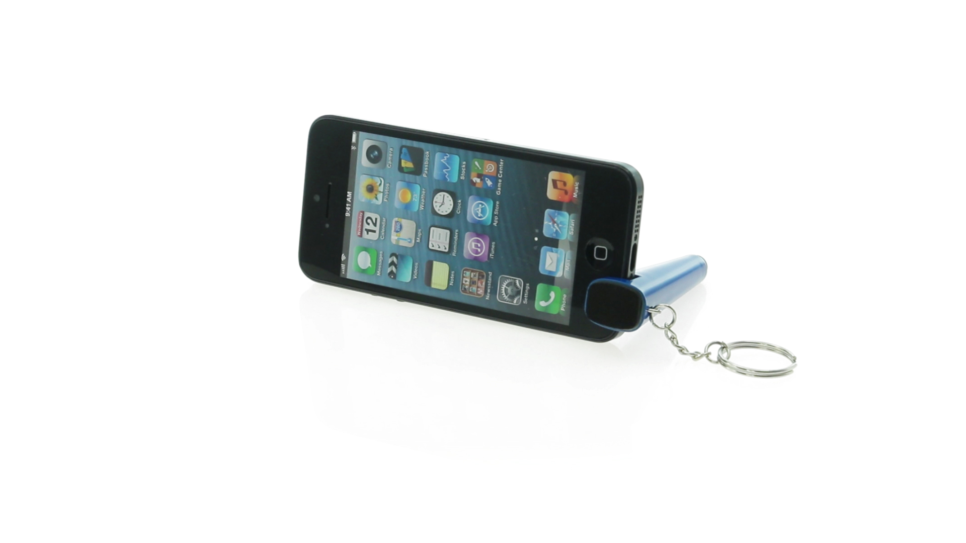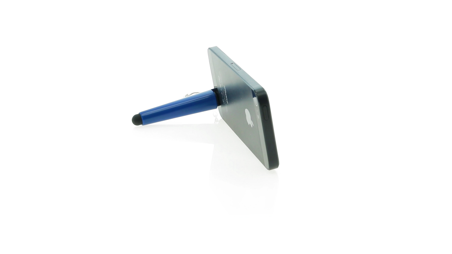 Multifunktions-Schlüsselanhänger mit Smartphone-Ständer und integriertem Stylus. Gehäuse in kräftigen, glänzenden Farben.