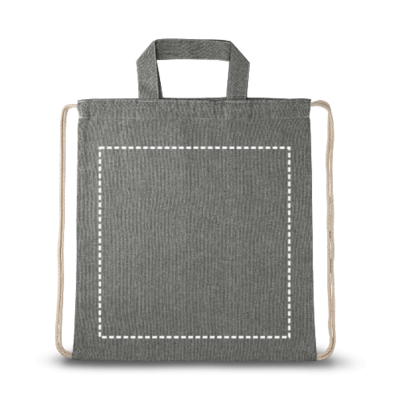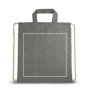 Tragetasche/Turnbeutel (2in1) aus recycelter Baumwolle (70%) und polyester (30% rPET) (140 g/m²) mit 30cm langen Henkeln und Kordeln aus Baumwolle. Recycelte Baumwolle ist ungefärbt. Das Rohmaterial wird in seiner ursprünglichen Form und Farbe verwendet, ohne dass Chemikalien zum Färben oder Bleichen eingesetzt werden, was zu einer geringeren Umweltbelastung beiträgt. 370 x 410 mm
