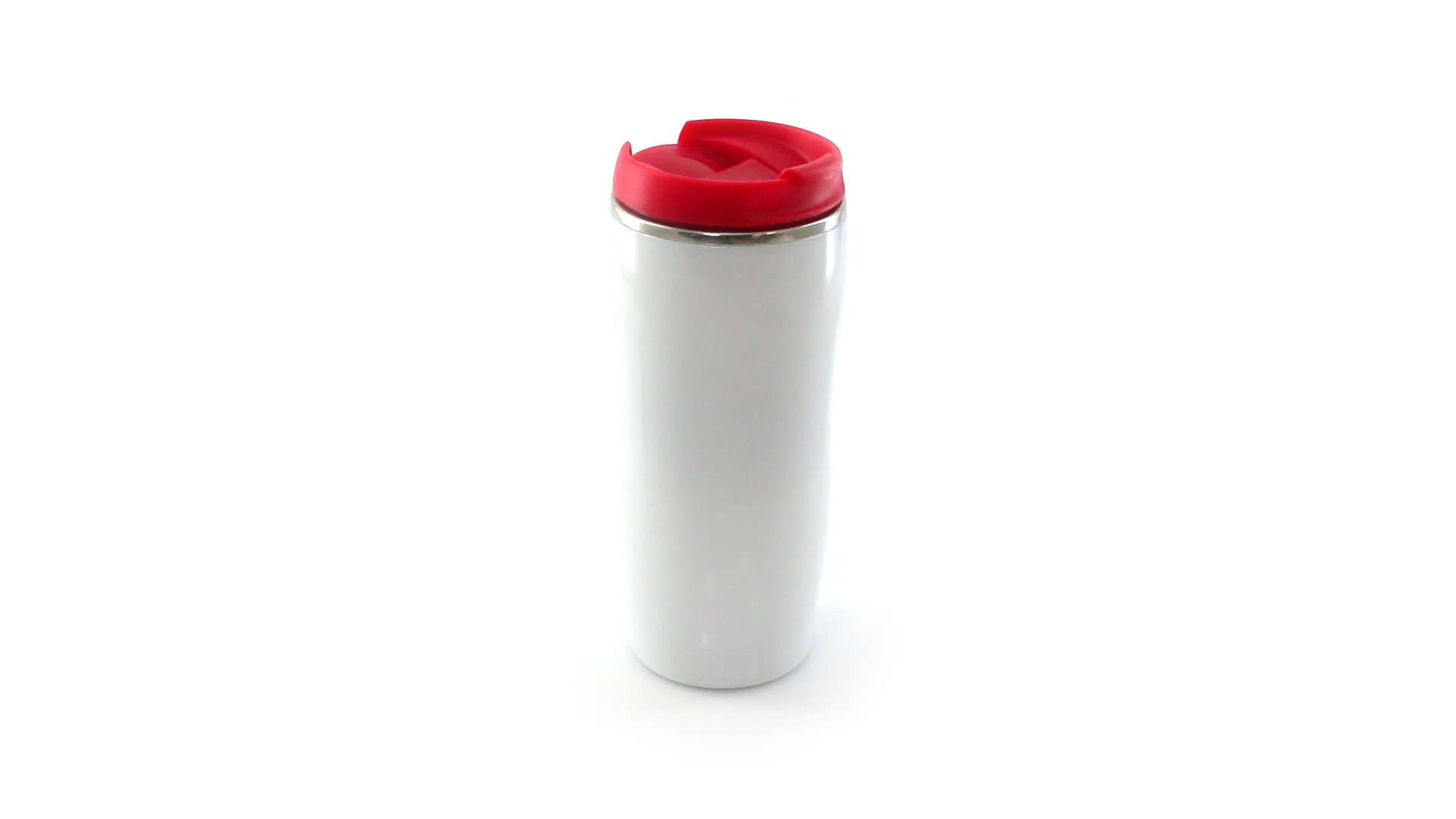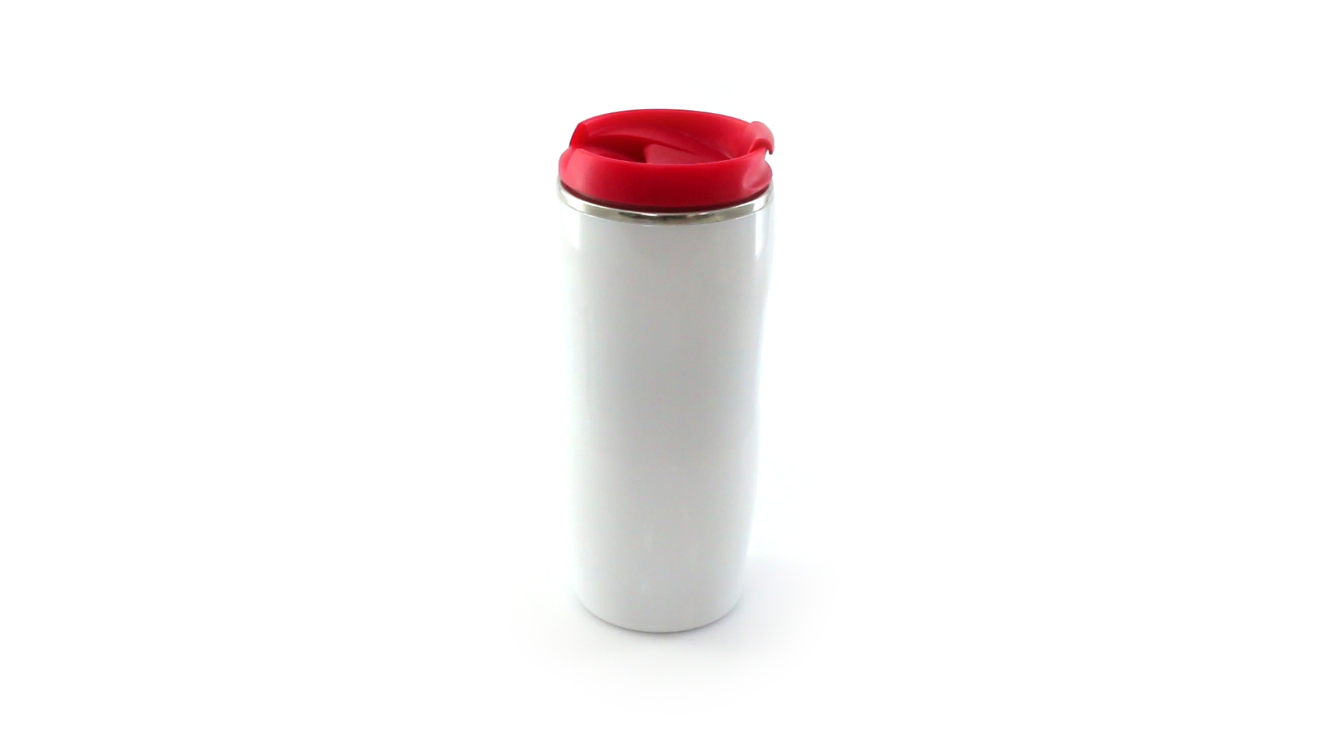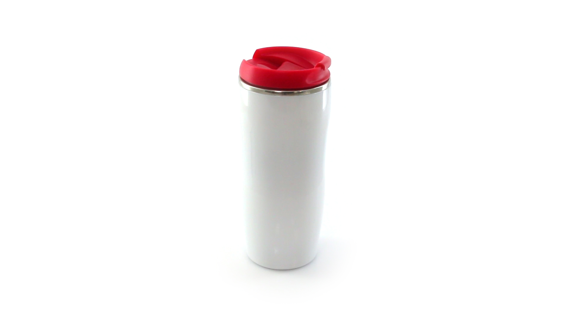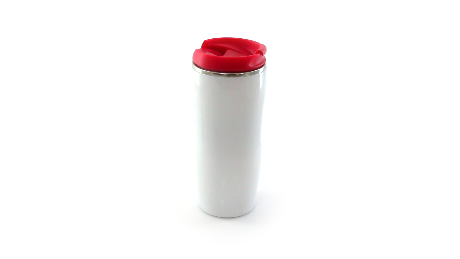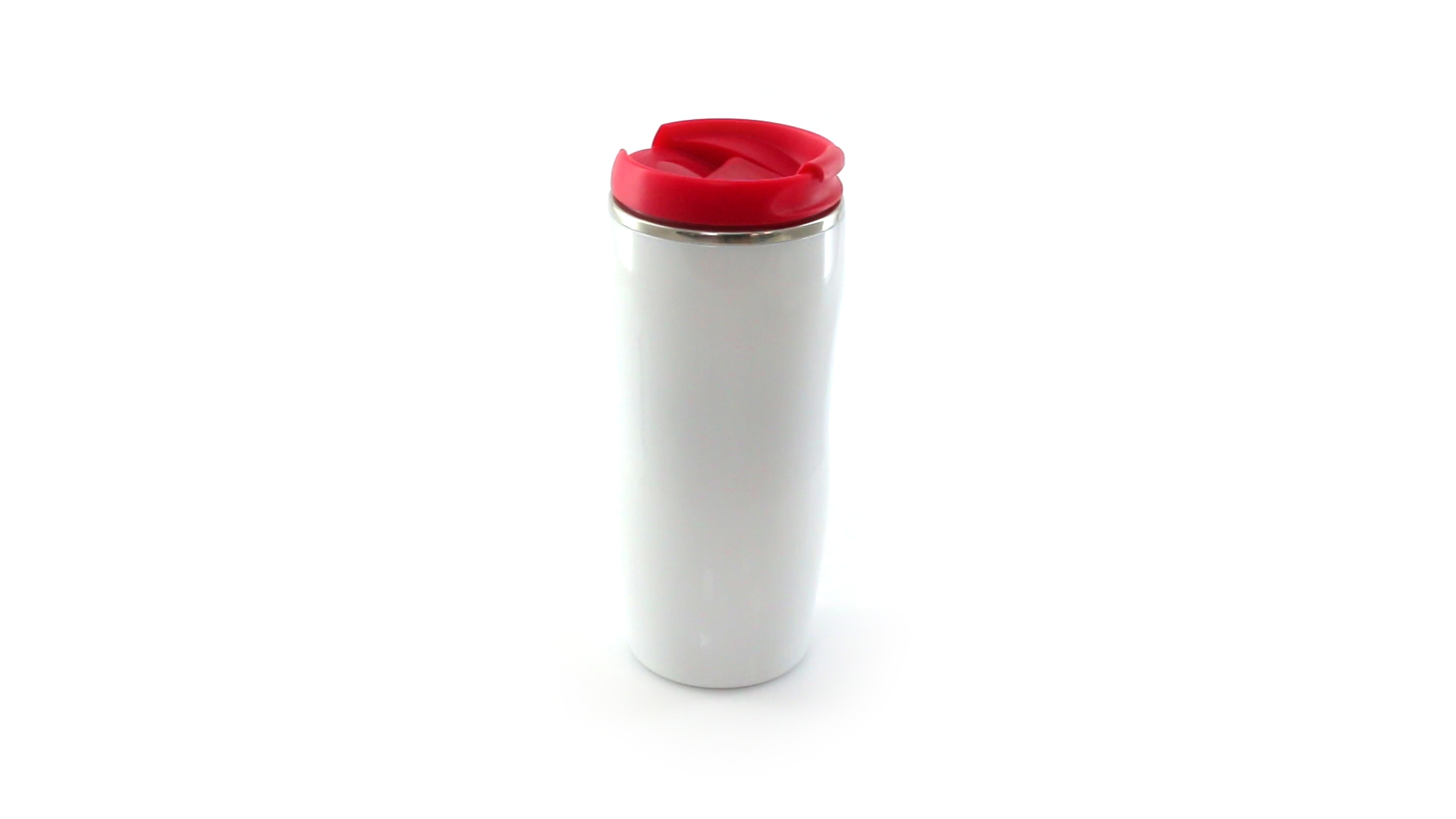 Becher aus Edelstahl mit 400 ml Fassungsvermögen und weissem Metallgehäuse mit Kontrastdetails in kräftigen Farben. Mit Sicherheitsdeckel. Präsentiert in einer individuellen Box.