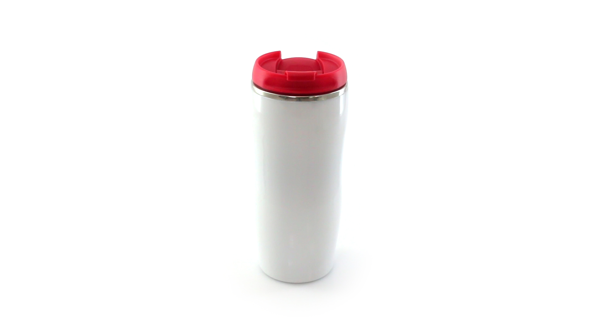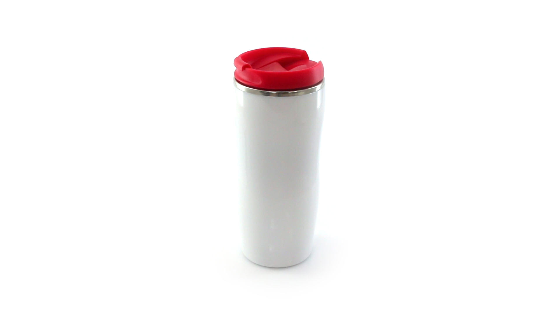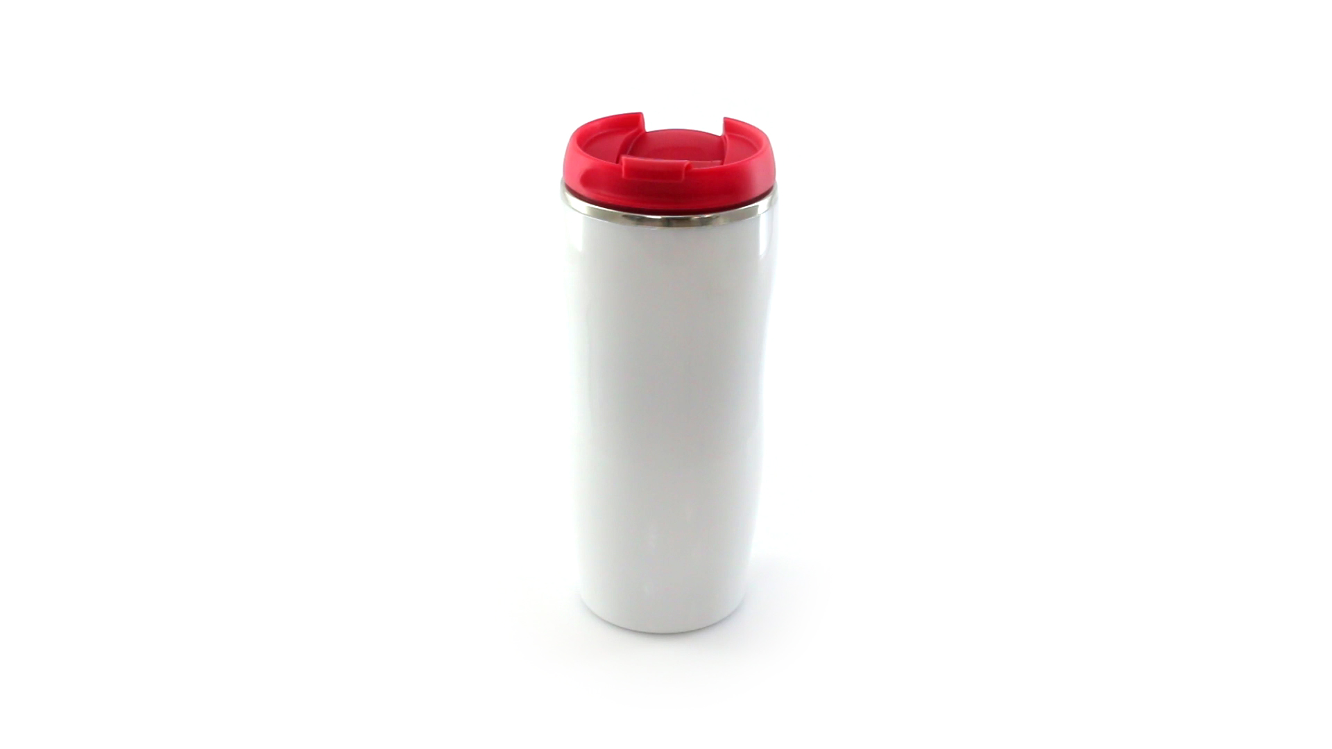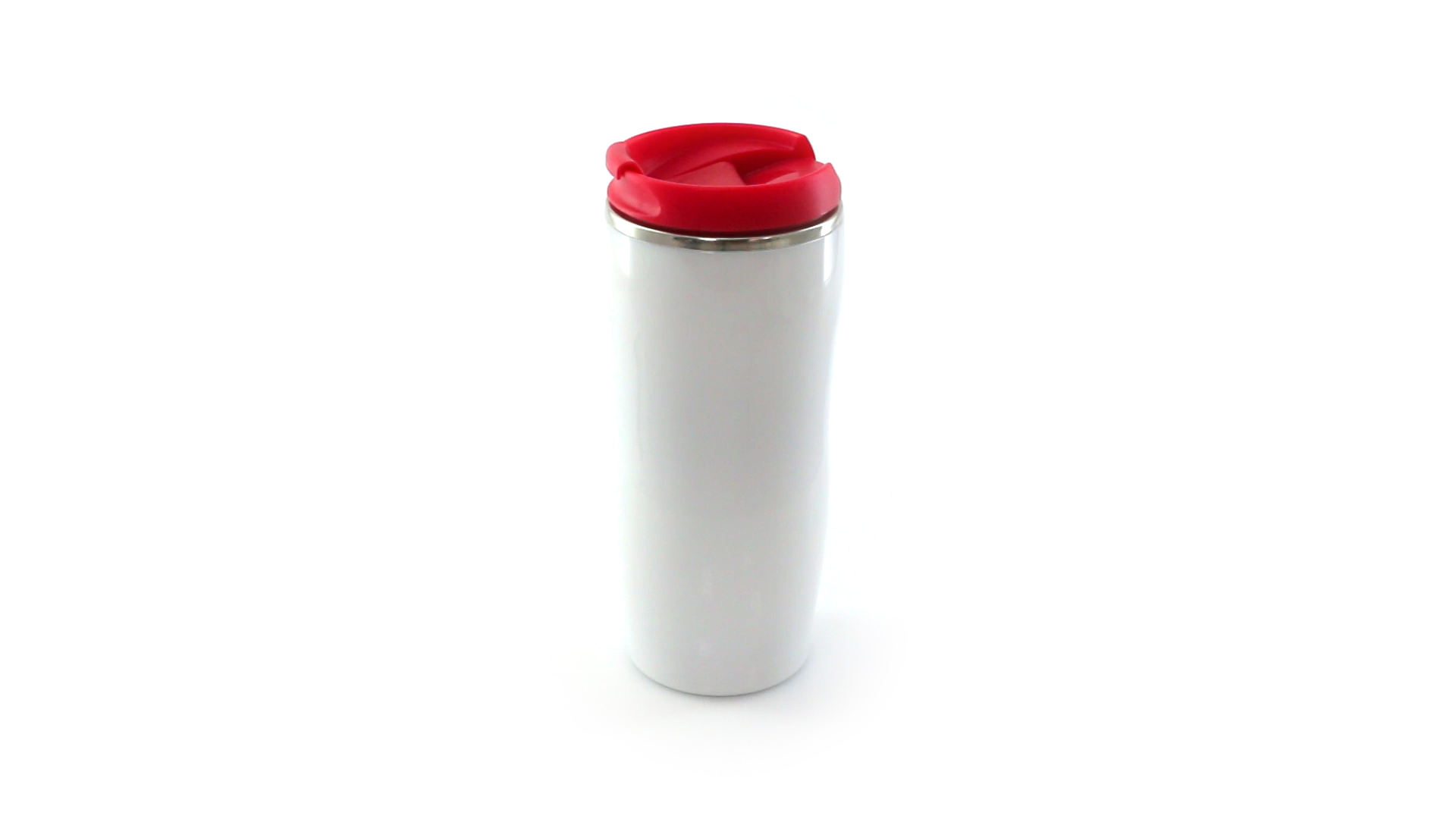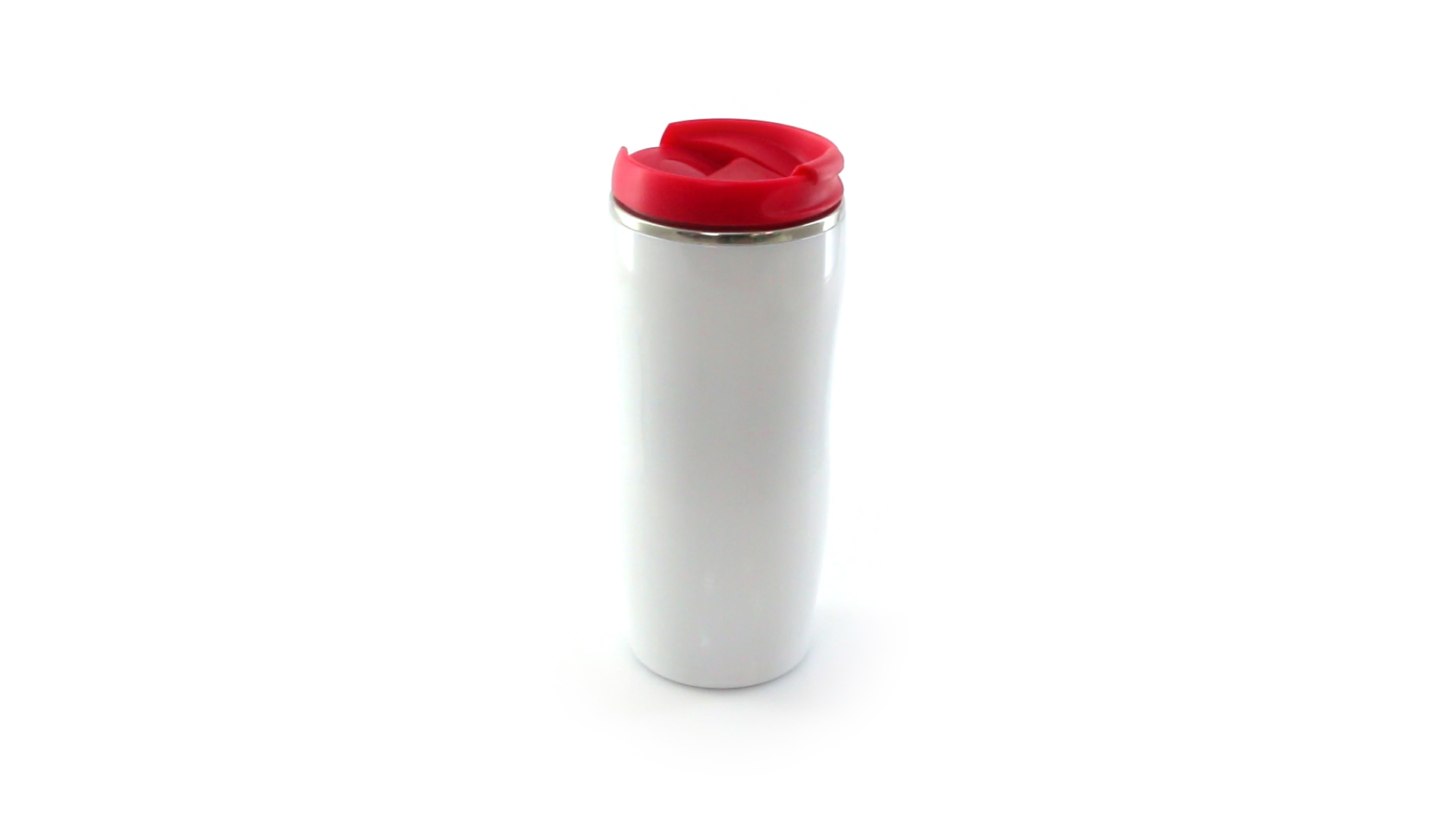 Becher aus Edelstahl mit 400 ml Fassungsvermögen und weissem Metallgehäuse mit Kontrastdetails in kräftigen Farben. Mit Sicherheitsdeckel. Präsentiert in einer individuellen Box.