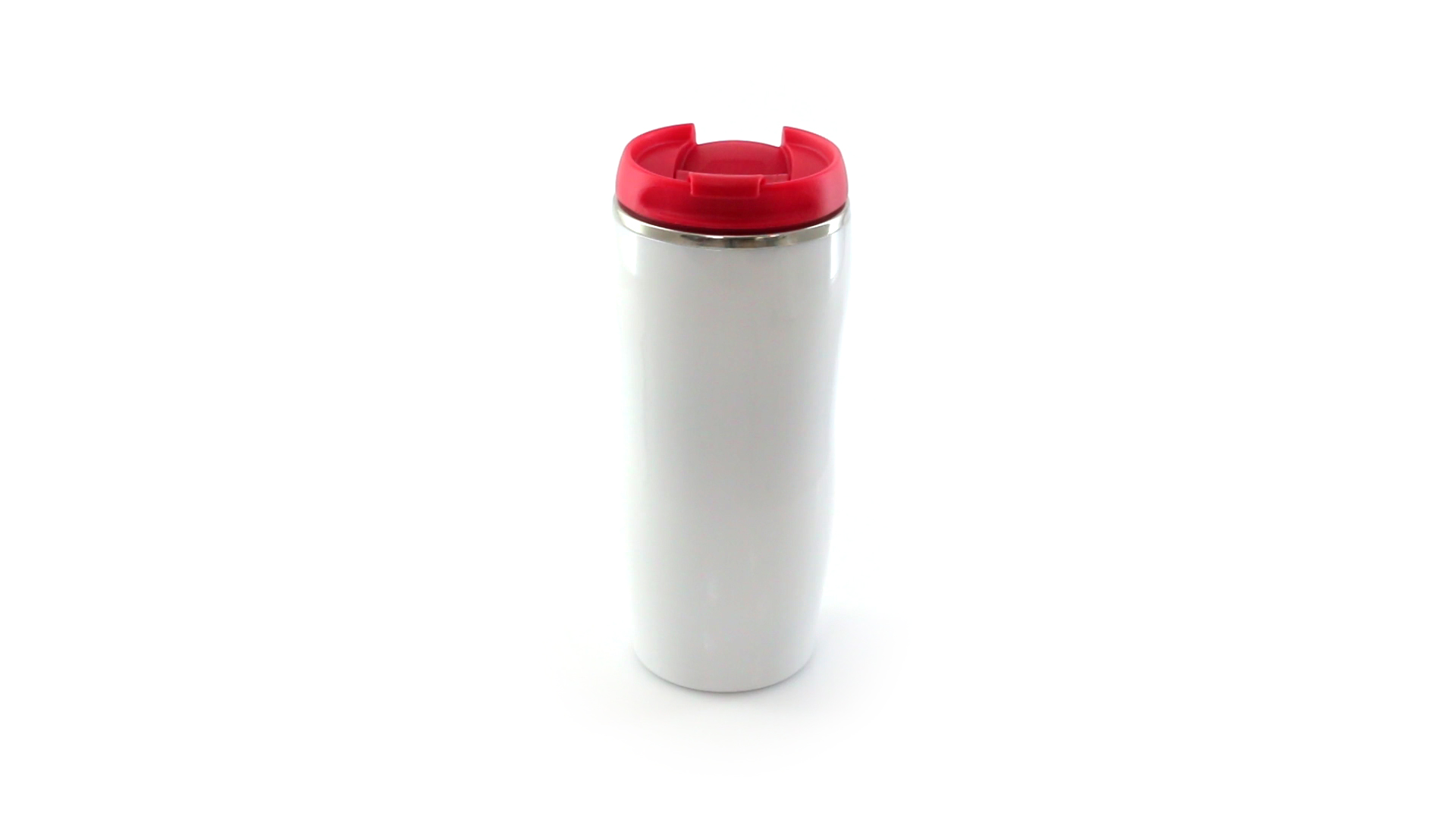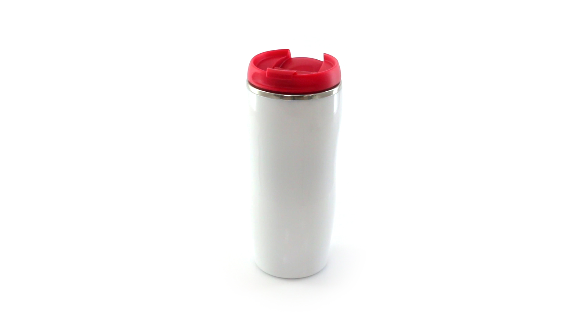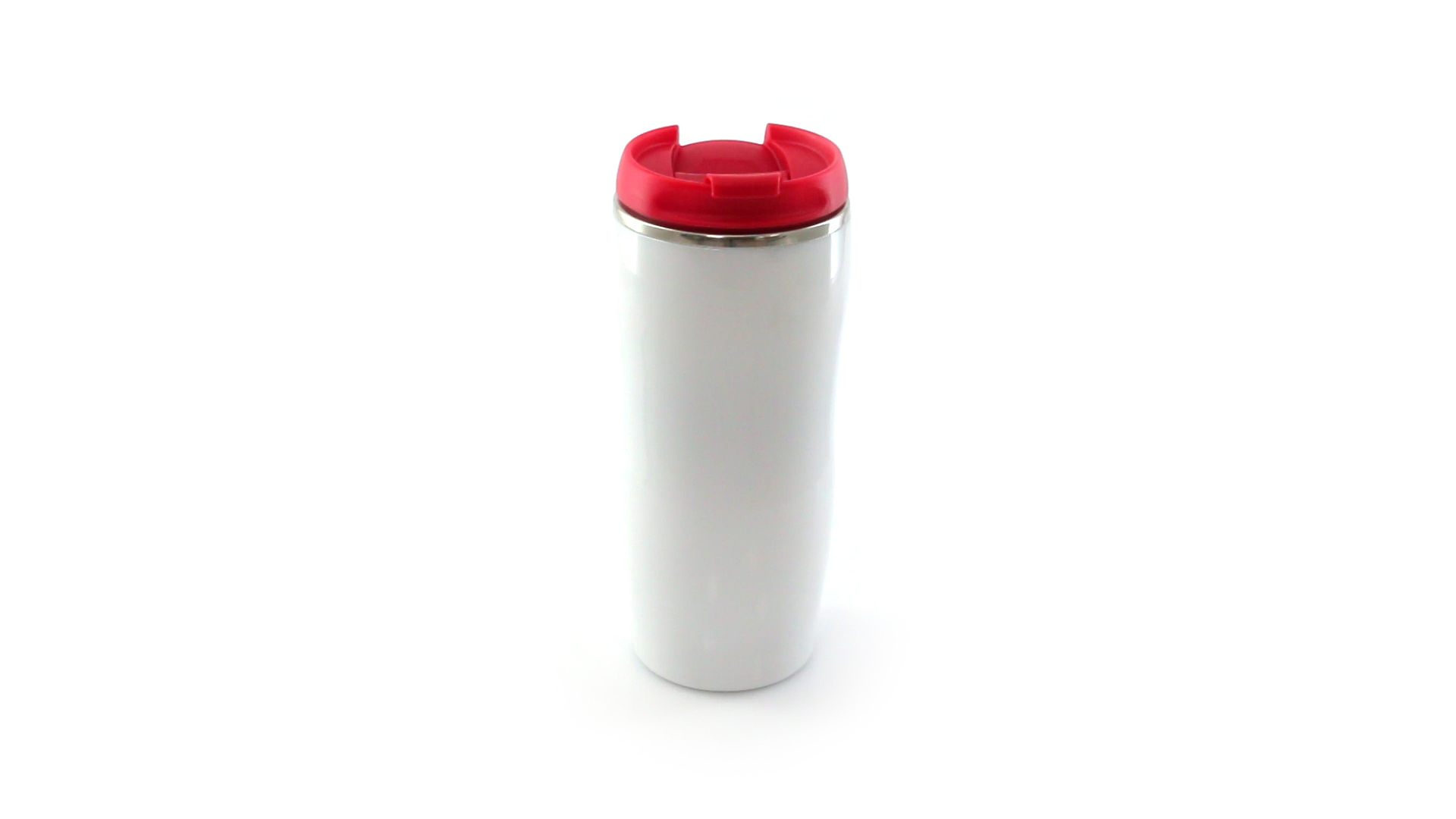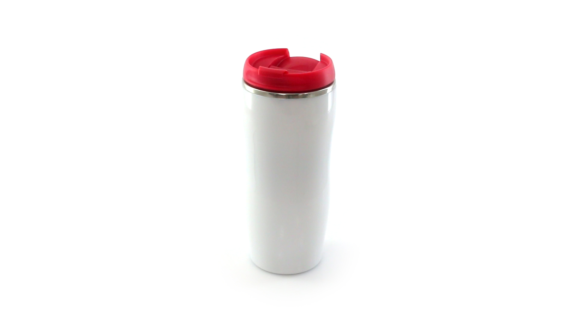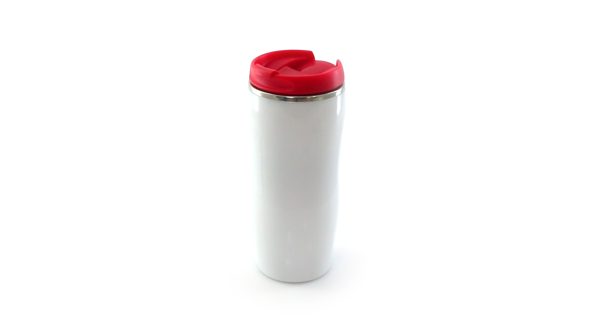 Becher aus Edelstahl mit 400 ml Fassungsvermögen und weissem Metallgehäuse mit Kontrastdetails in kräftigen Farben. Mit Sicherheitsdeckel. Präsentiert in einer individuellen Box.