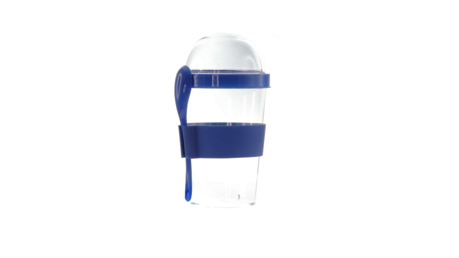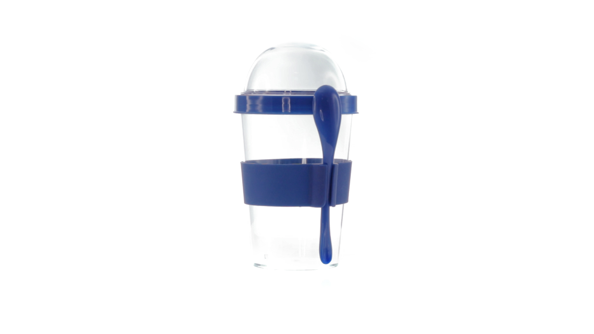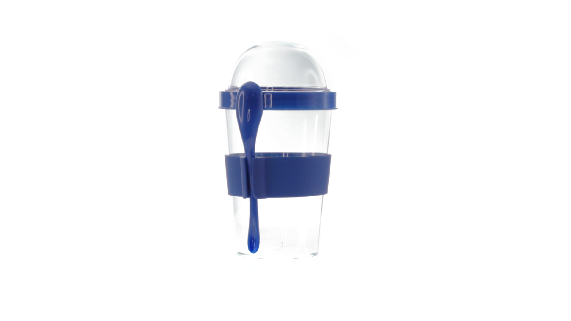 Becher mit 420 ml Fassungsvermögen aus resistentem PS-Kunststoff in transparenter Ausführung. Mit separatem Fach im Deckel und seitlichem Löffelhalter. Deckel und Löffel in verschiedenen lebendigen Farben.