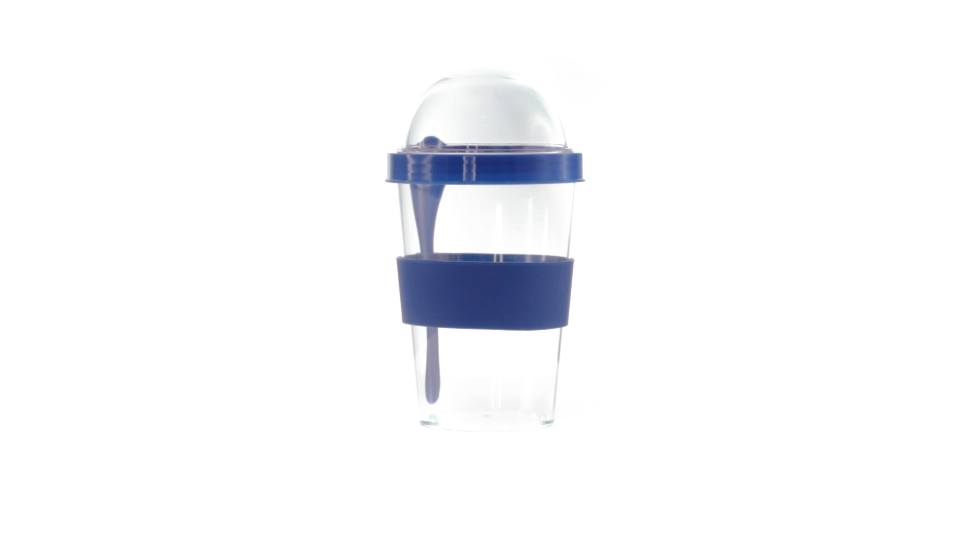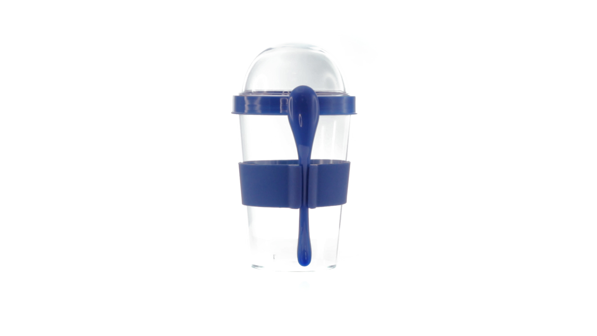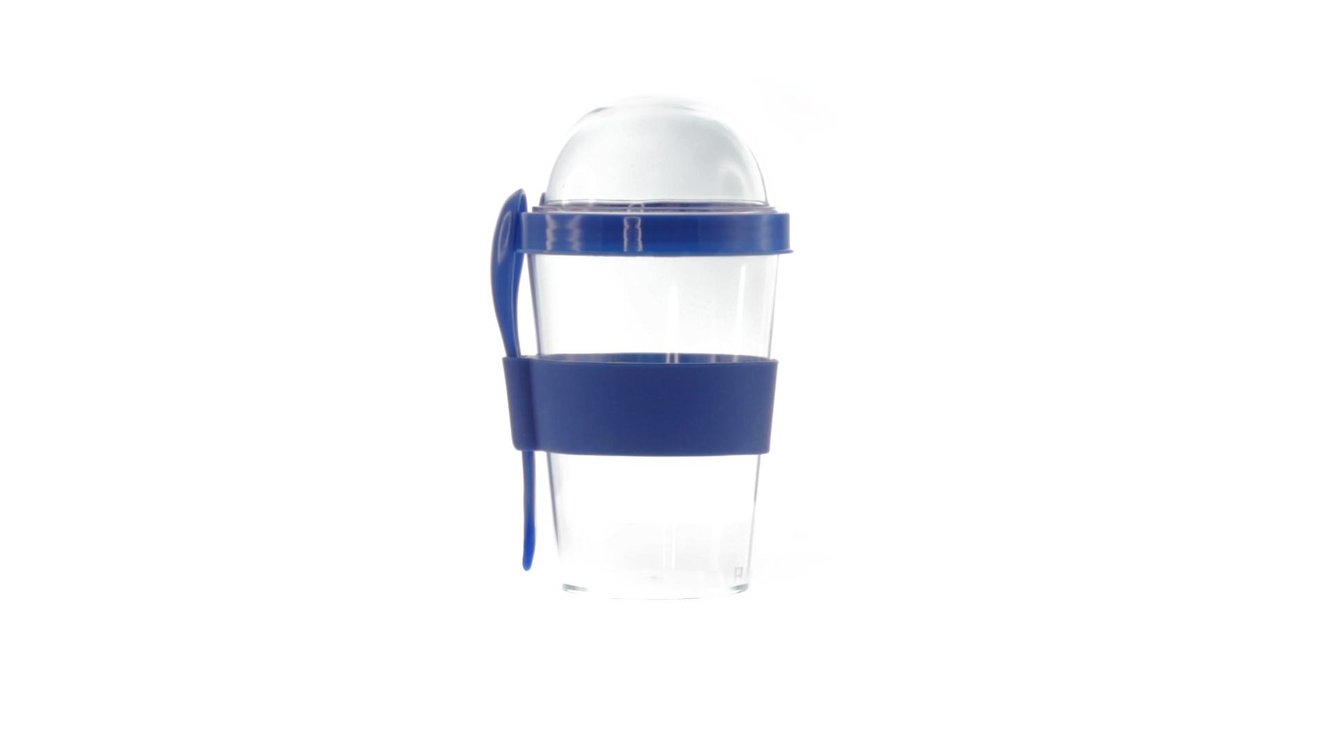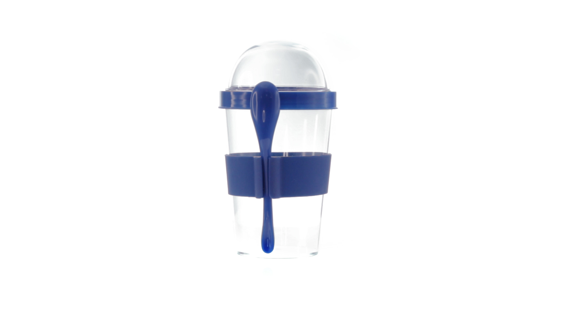 Becher mit 420 ml Fassungsvermögen aus resistentem PS-Kunststoff in transparenter Ausführung. Mit separatem Fach im Deckel und seitlichem Löffelhalter. Deckel und Löffel in verschiedenen lebendigen Farben.