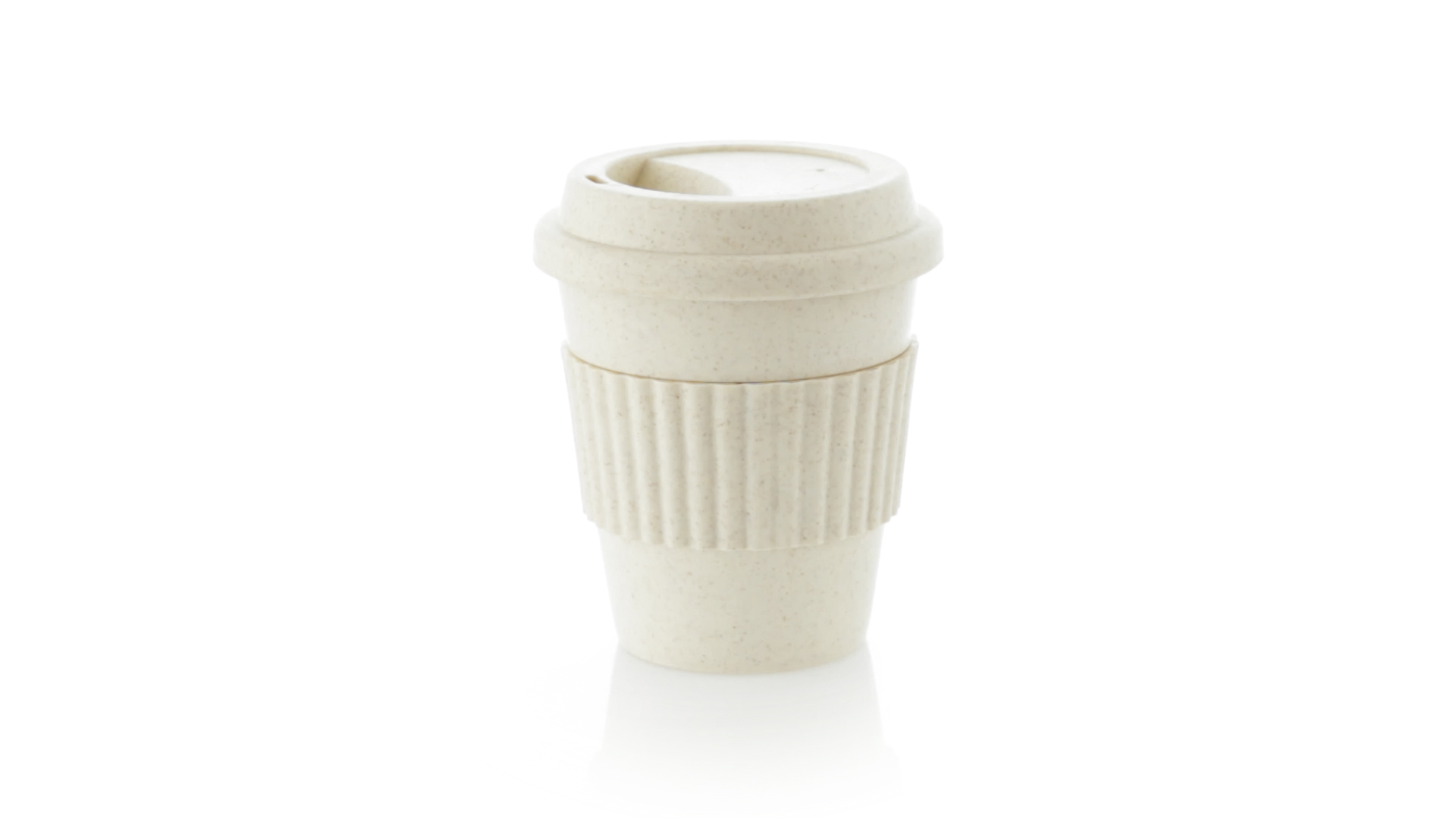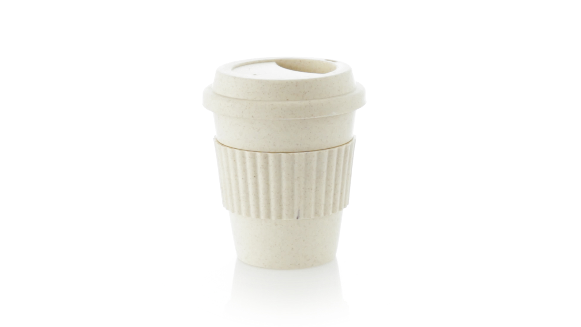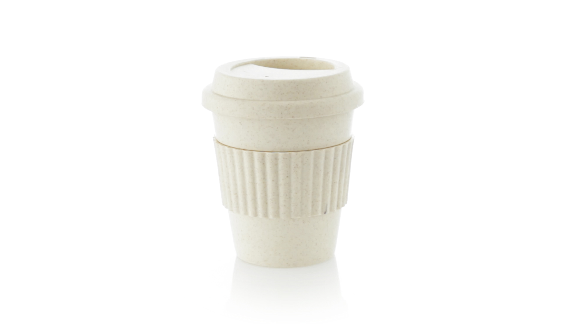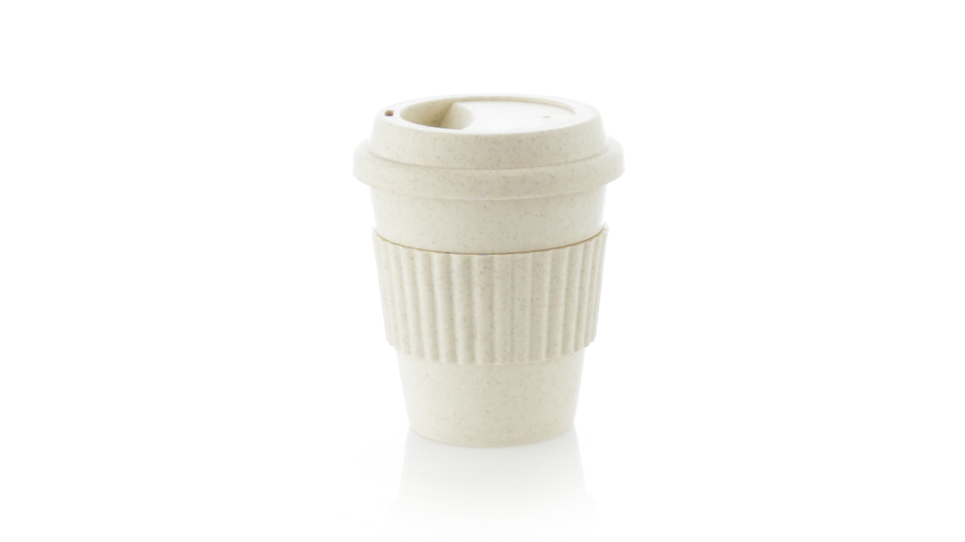Becher der Linie Nature aus natürlichen Bambusfasern und Polypropylen (PP) in Naturfarbe. 380 ml Fassungsvermögen. Mit farblich passendem Silikonband, das vor Verbrennungen schützt, und Deckel mit Trinkloch.