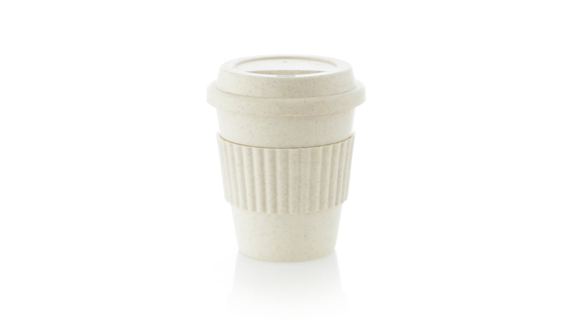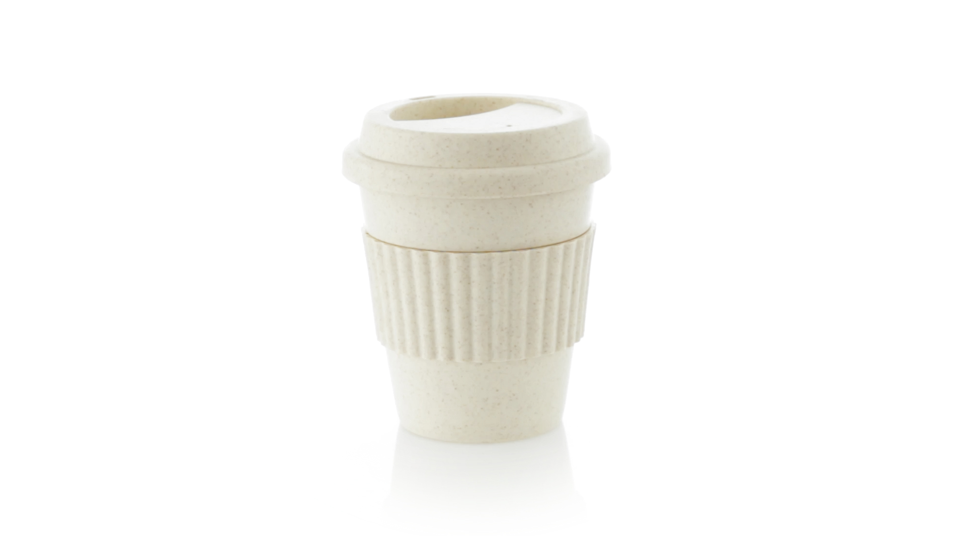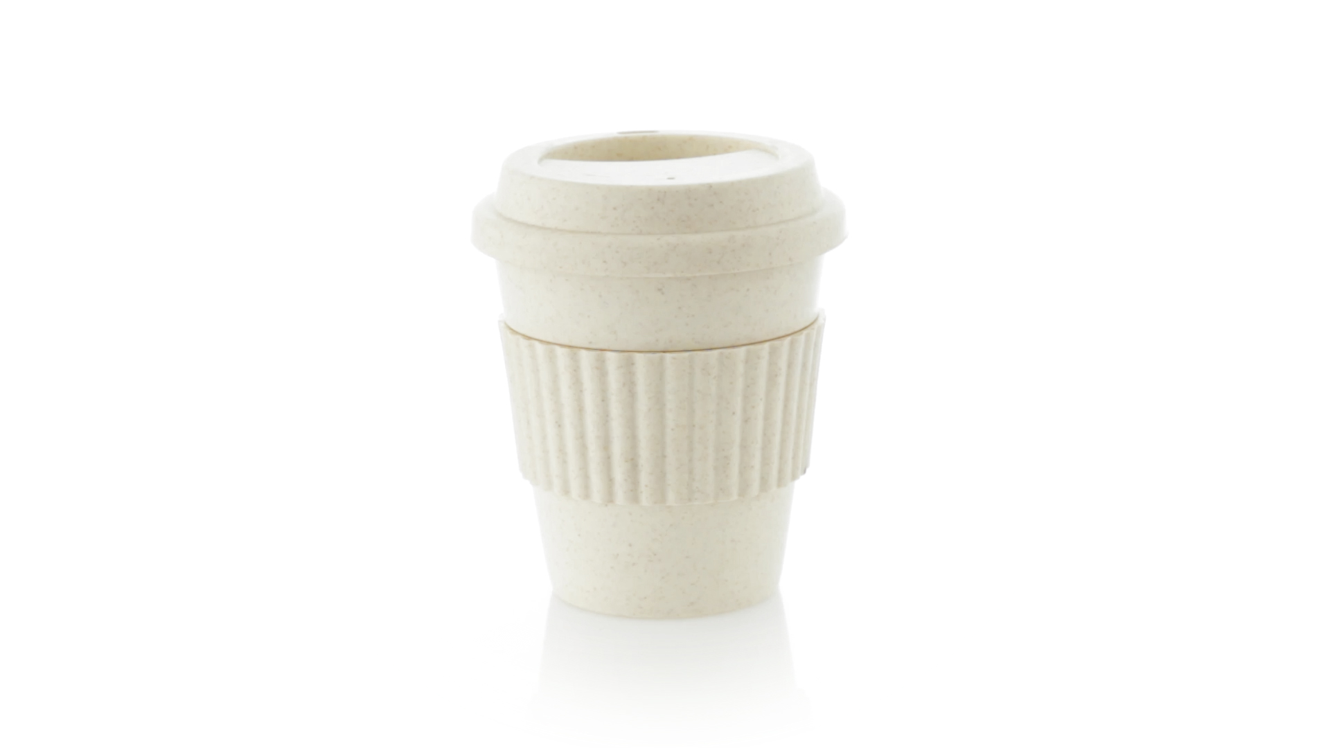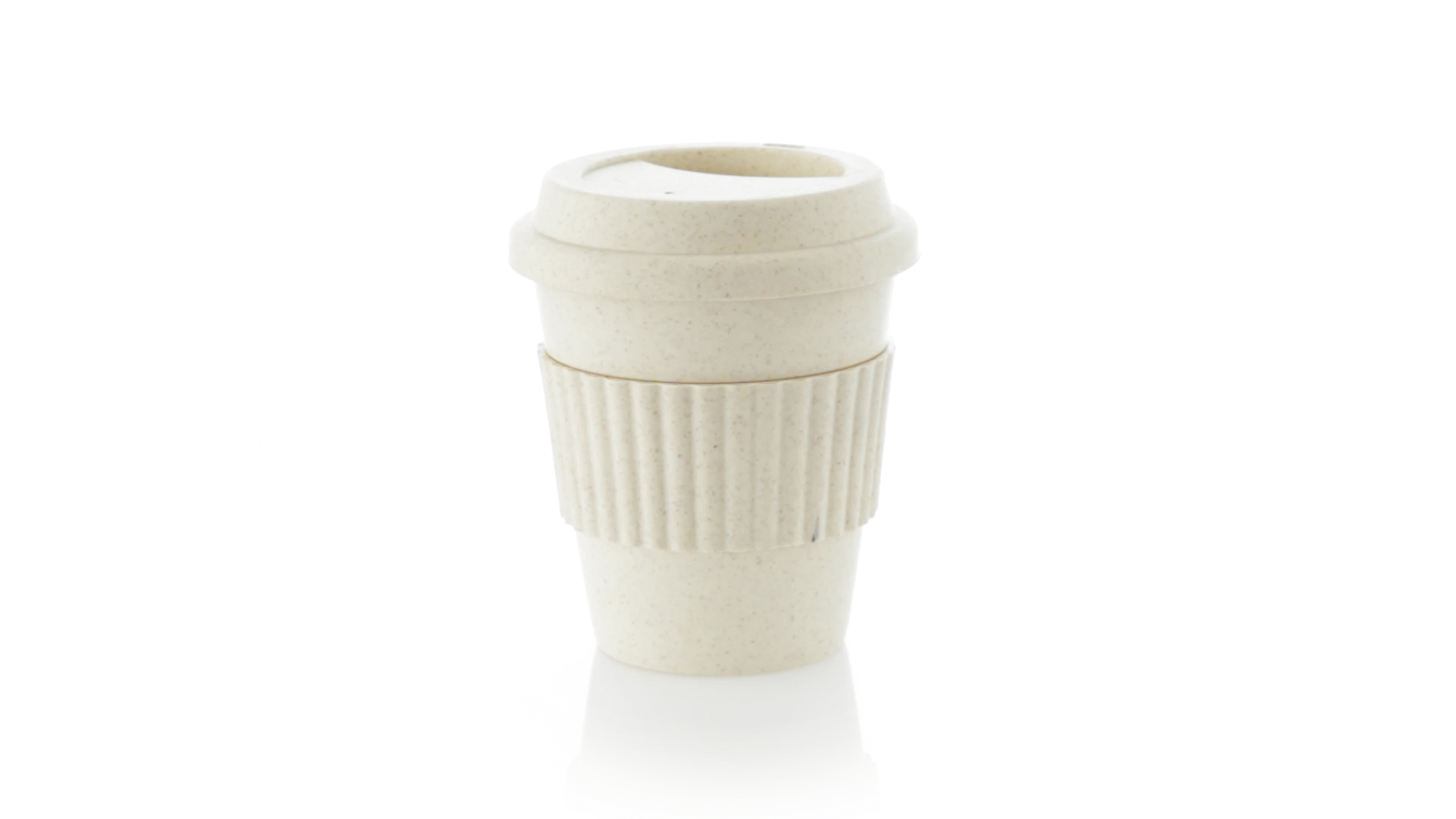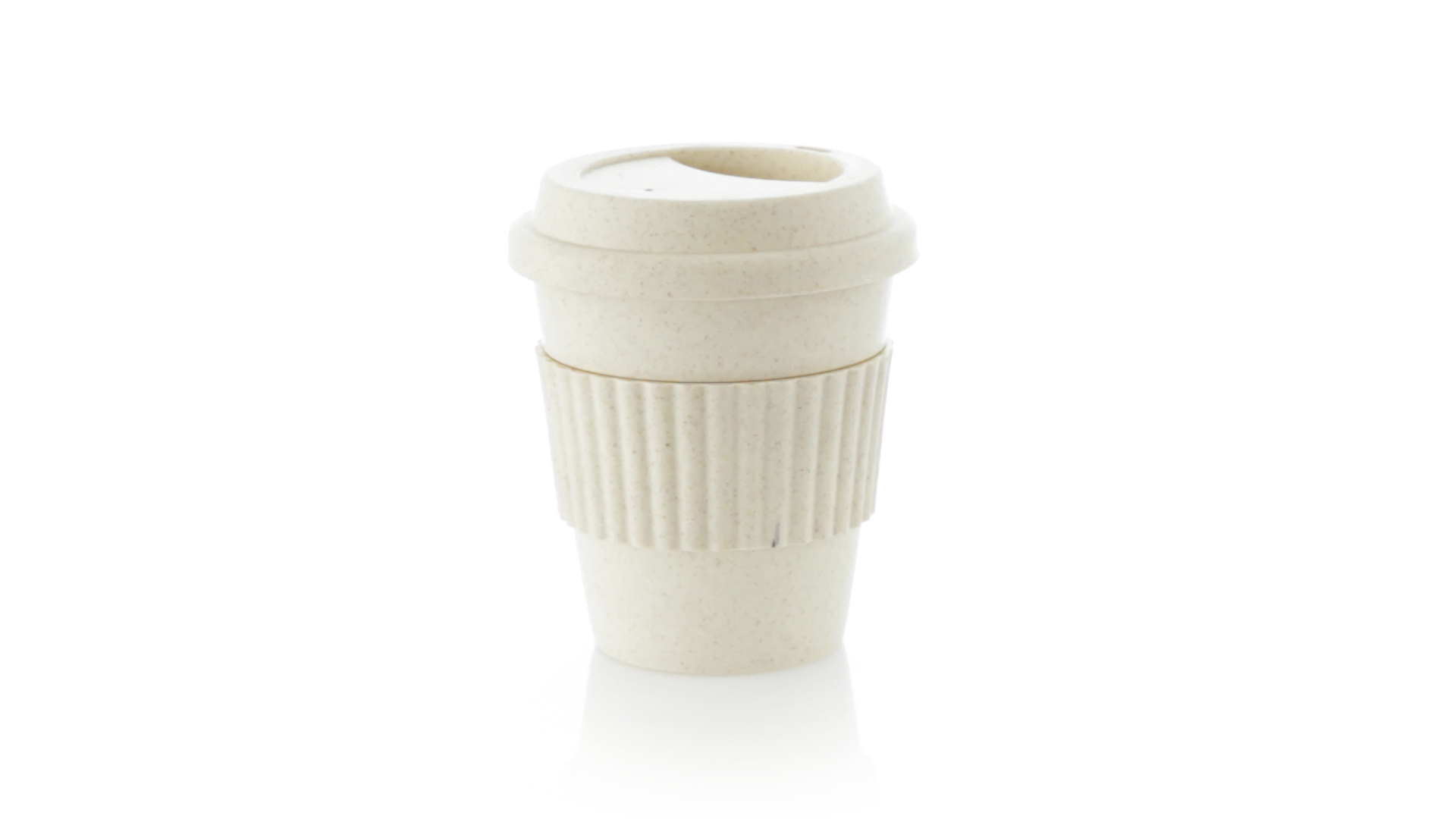 Becher der Linie Nature aus natürlichen Bambusfasern und Polypropylen (PP) in Naturfarbe. 380 ml Fassungsvermögen. Mit farblich passendem Silikonband, das vor Verbrennungen schützt, und Deckel mit Trinkloch.
