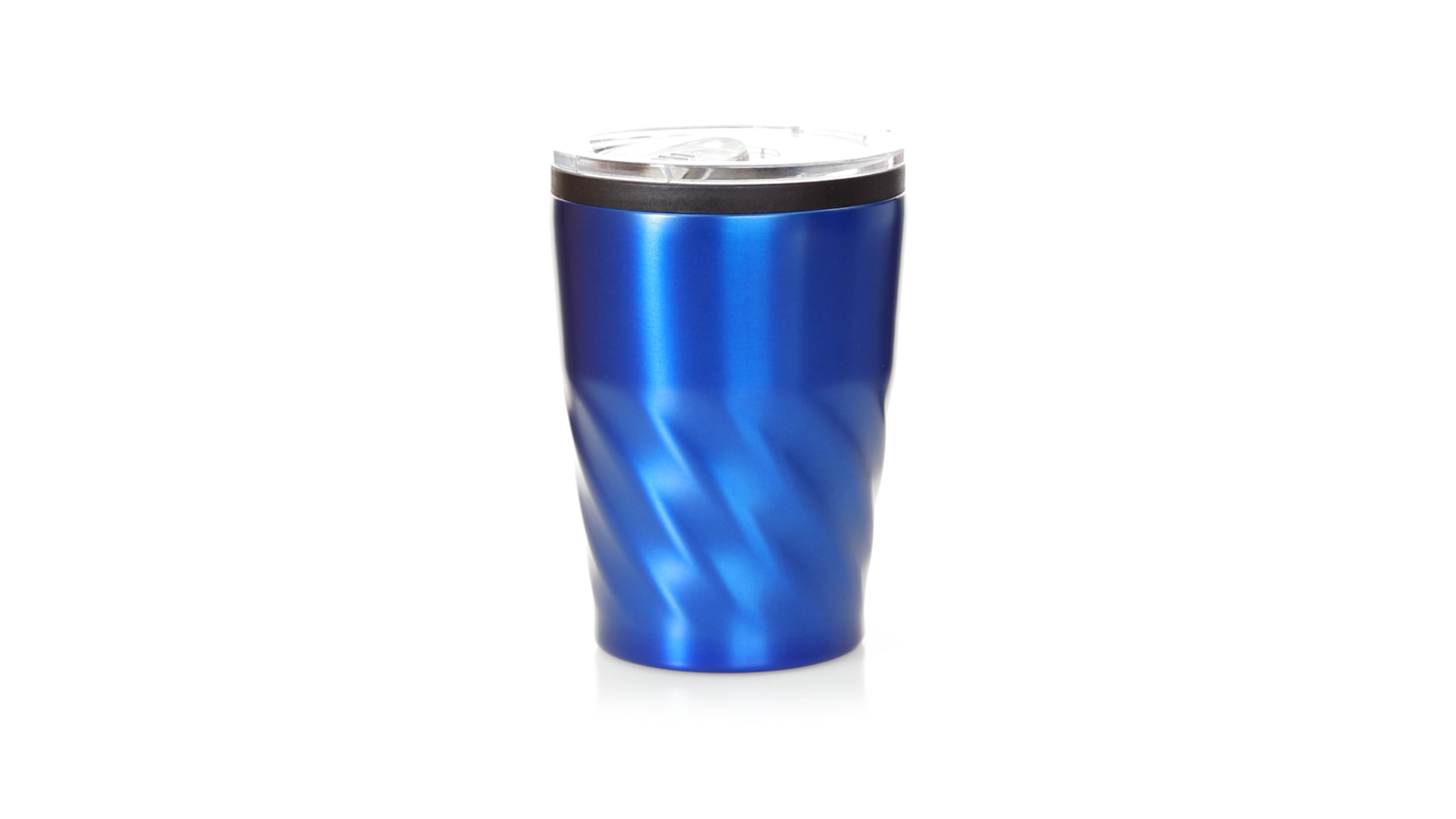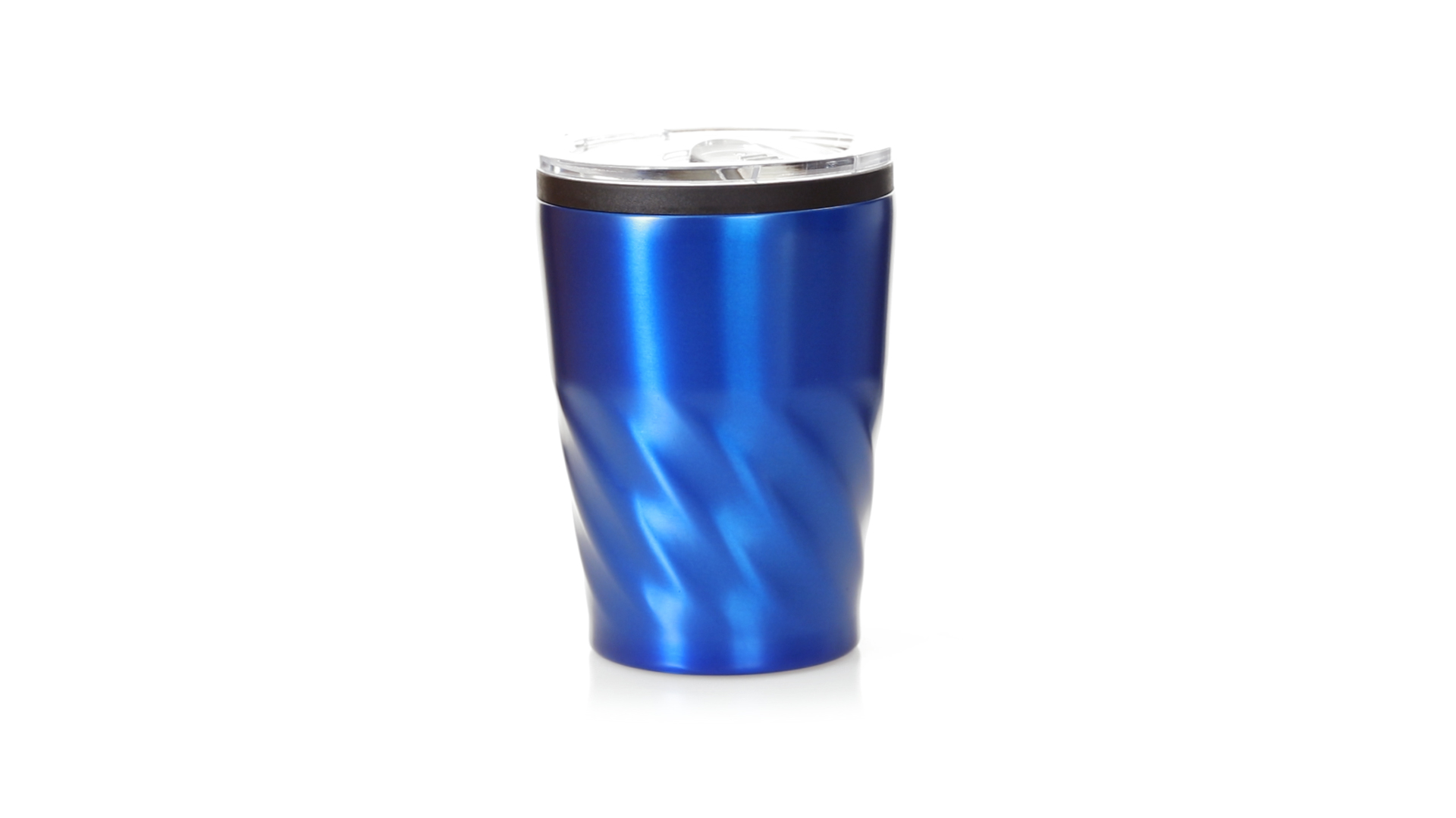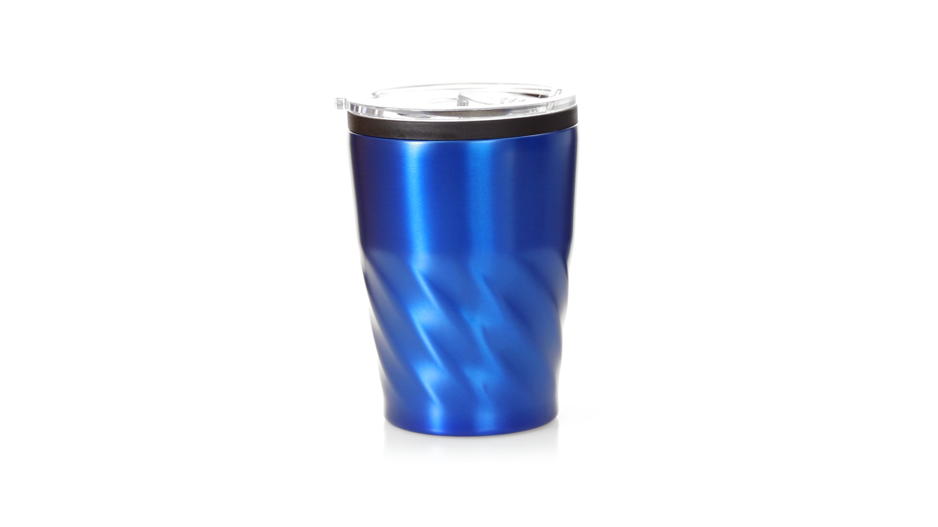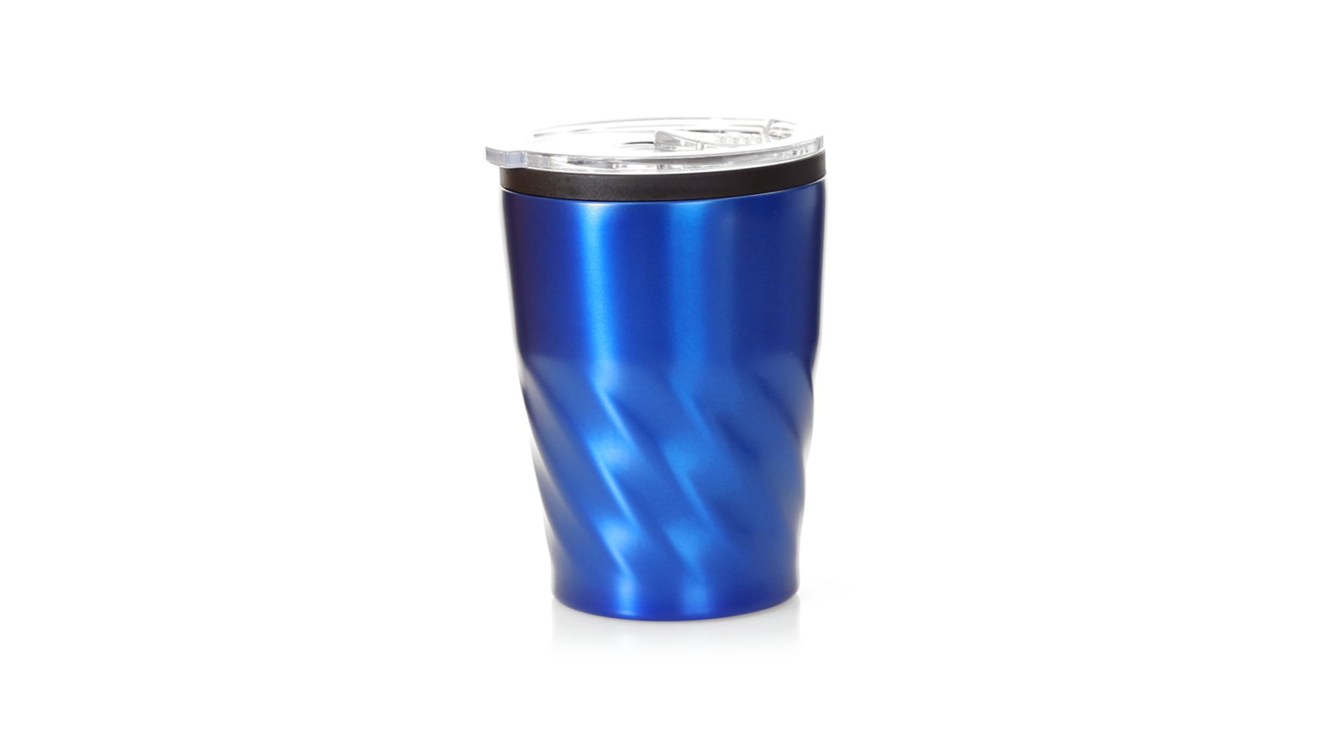 Trinkbecher aus rostfreiem Stahl mit einem Fassungsvermögen von 350 ml. Konisches Design mit schwarzem Ring. Mit origineller transparenter Spenderkappe und Easy-Opener. Es ist ideal für Ihren Schreibtisch, Tisch oder jede andere Oberfläche, auf der Sie in Ruhe Ihr Lieblingsgetränk geniessen können.