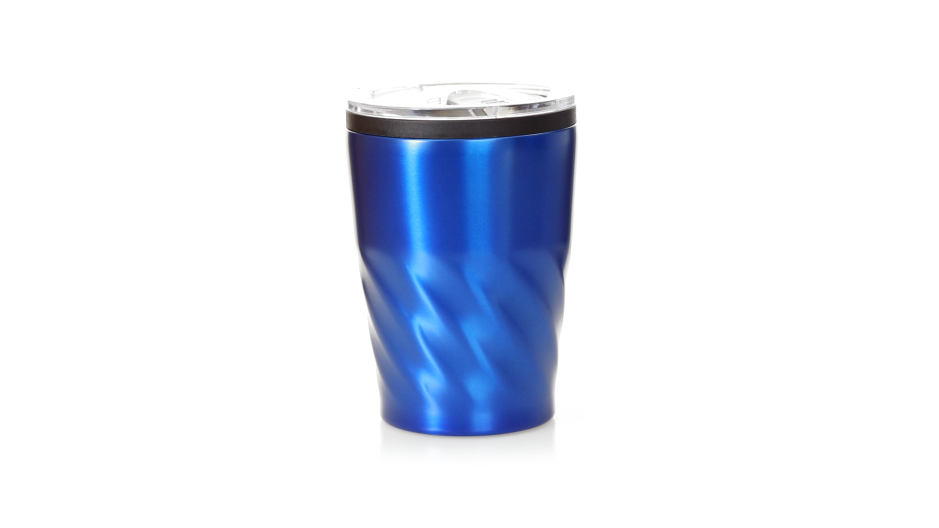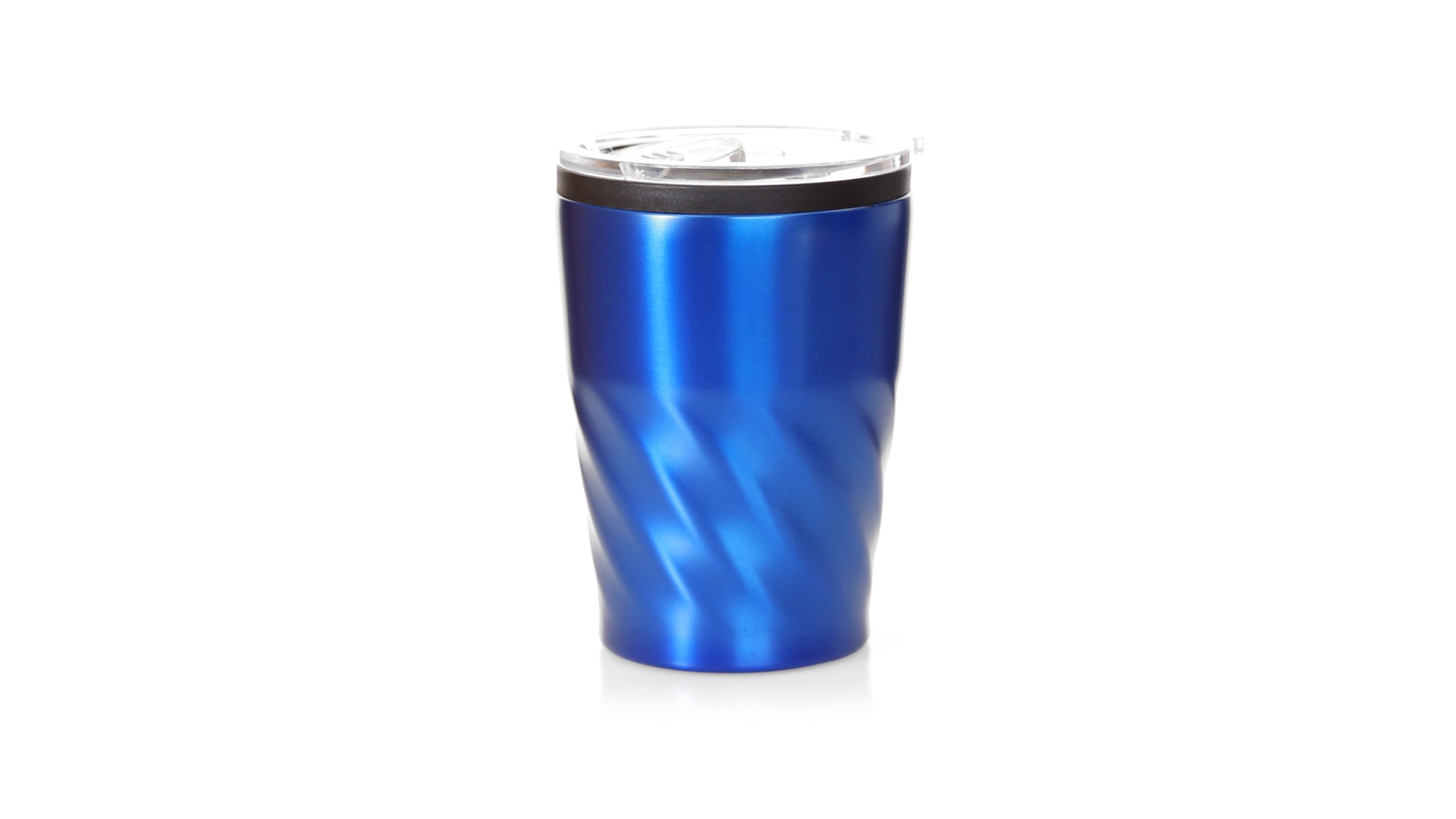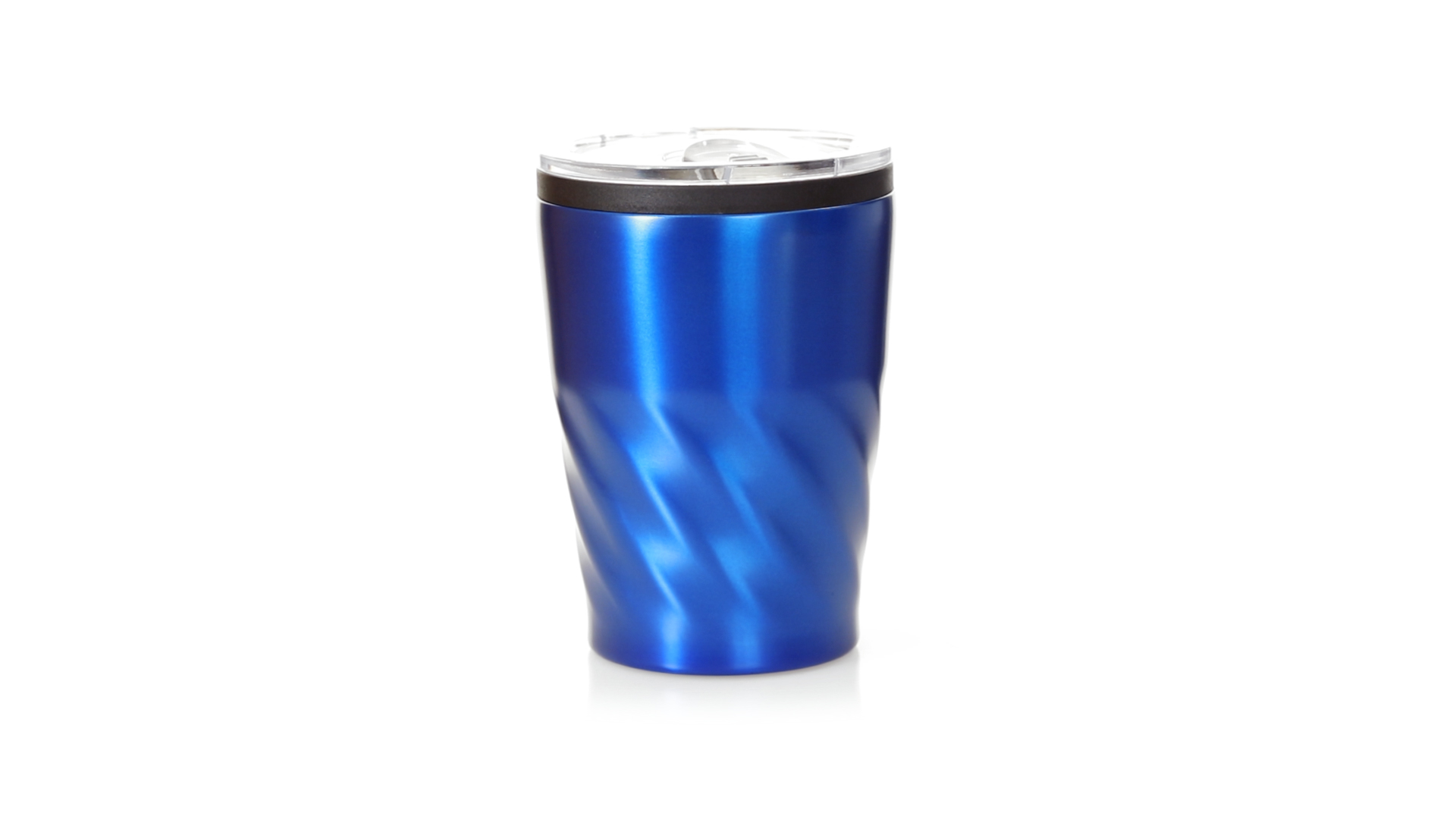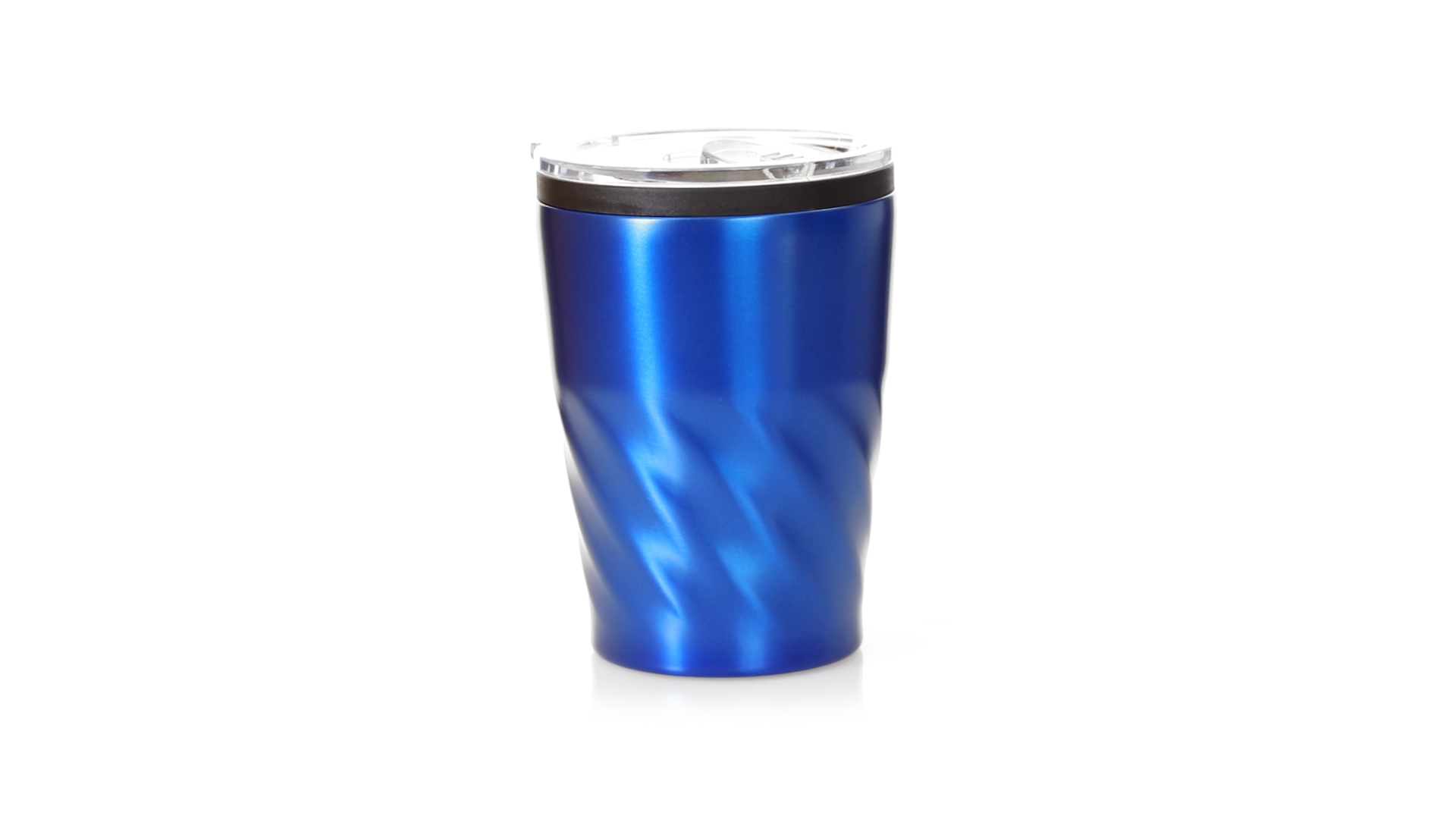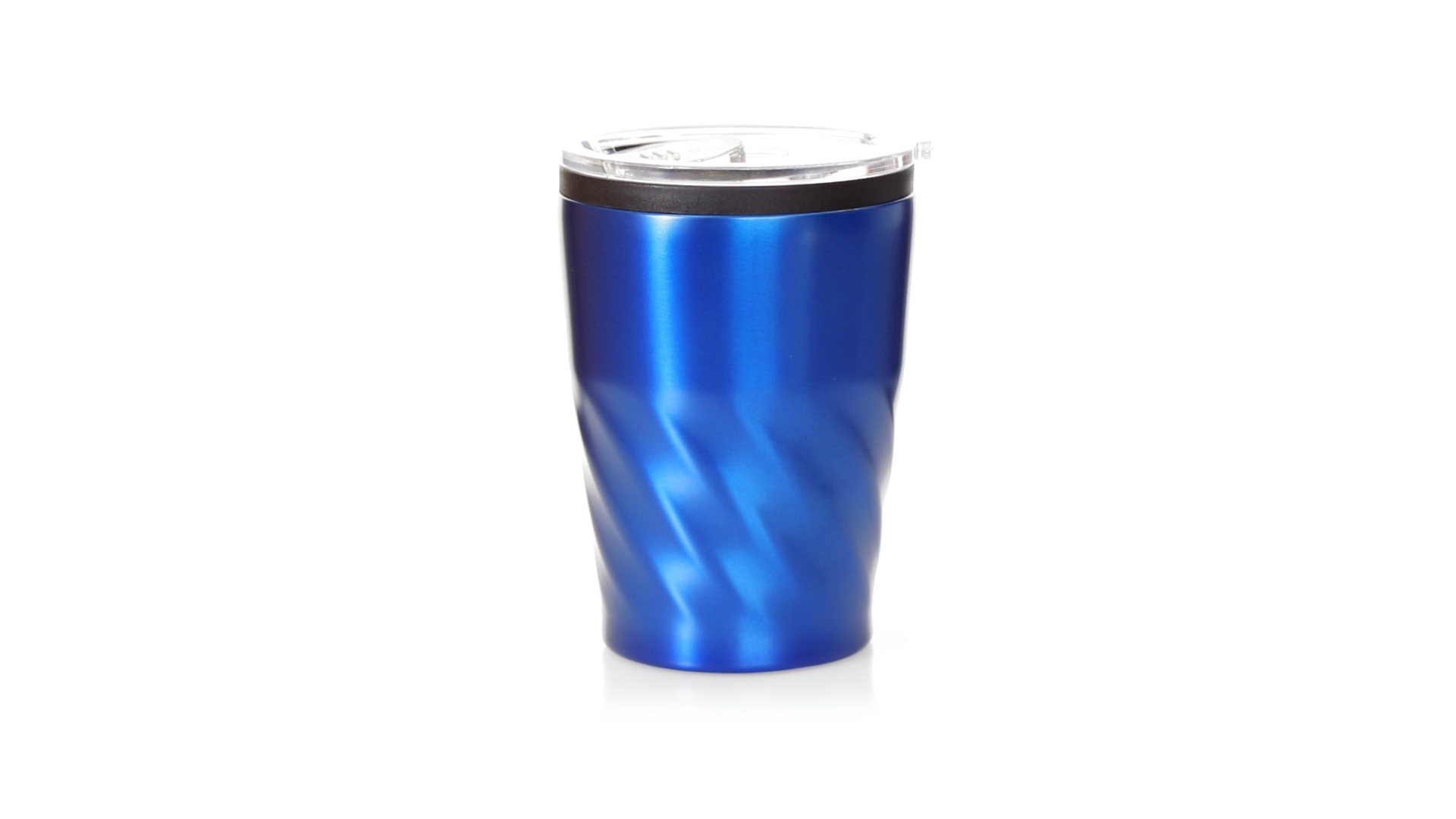 Trinkbecher aus rostfreiem Stahl mit einem Fassungsvermögen von 350 ml. Konisches Design mit schwarzem Ring. Mit origineller transparenter Spenderkappe und Easy-Opener. Es ist ideal für Ihren Schreibtisch, Tisch oder jede andere Oberfläche, auf der Sie in Ruhe Ihr Lieblingsgetränk geniessen können.