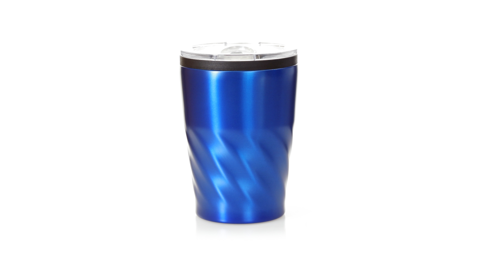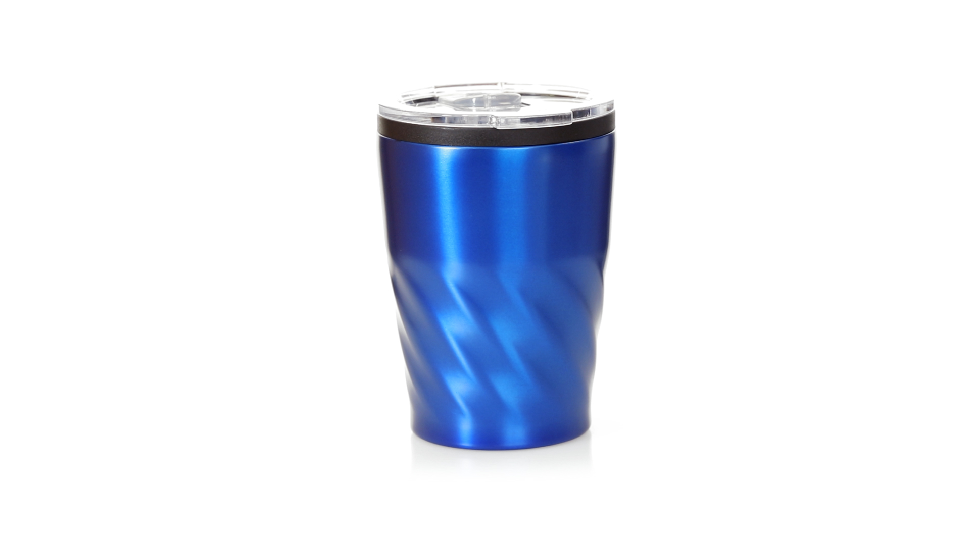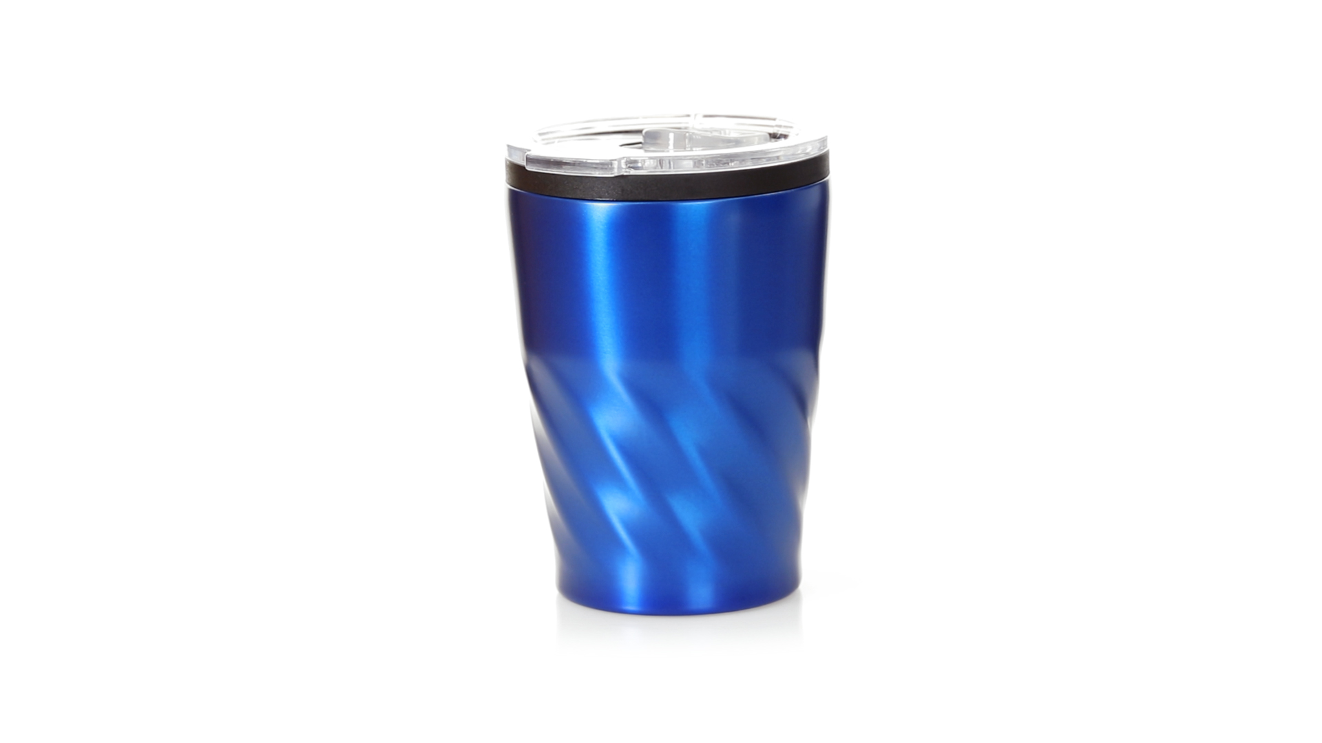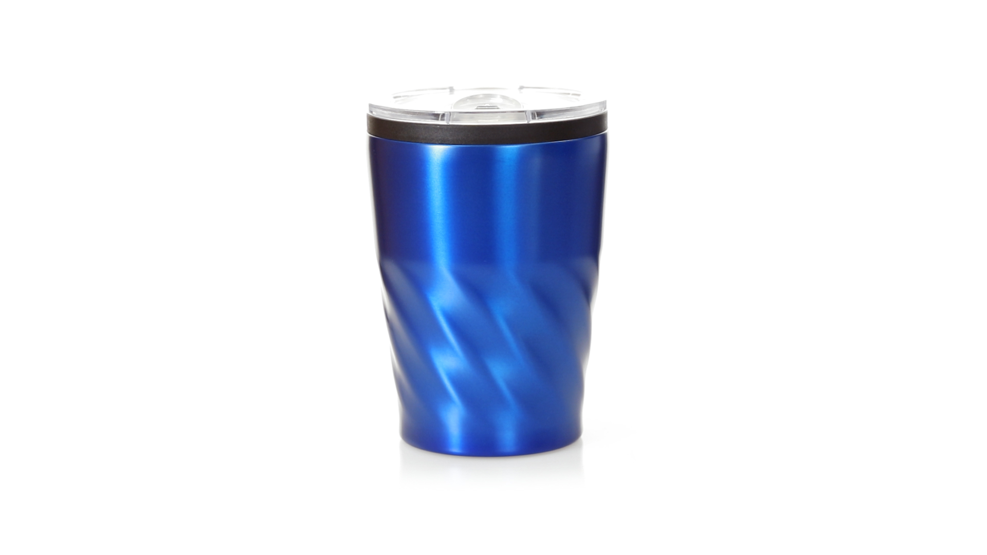 Trinkbecher aus rostfreiem Stahl mit einem Fassungsvermögen von 350 ml. Konisches Design mit schwarzem Ring. Mit origineller transparenter Spenderkappe und Easy-Opener. Es ist ideal für Ihren Schreibtisch, Tisch oder jede andere Oberfläche, auf der Sie in Ruhe Ihr Lieblingsgetränk geniessen können.
