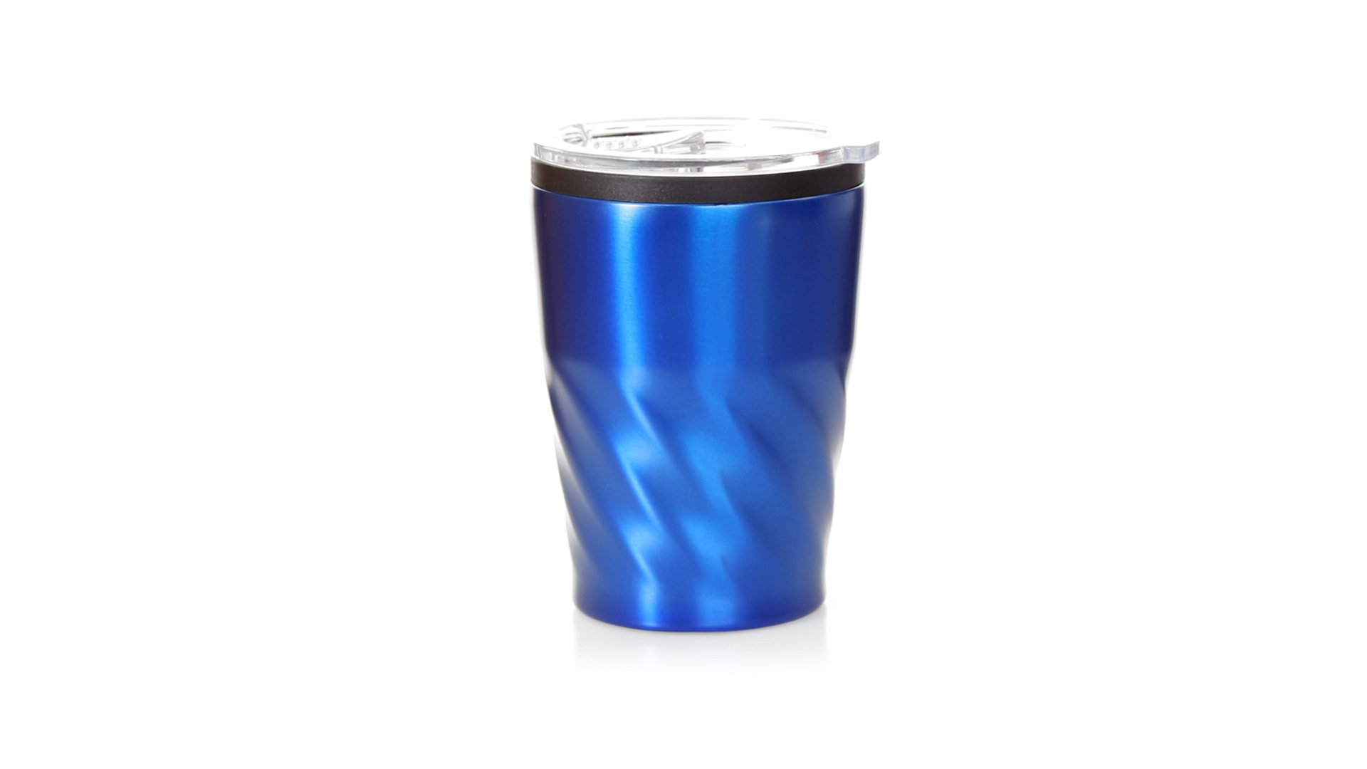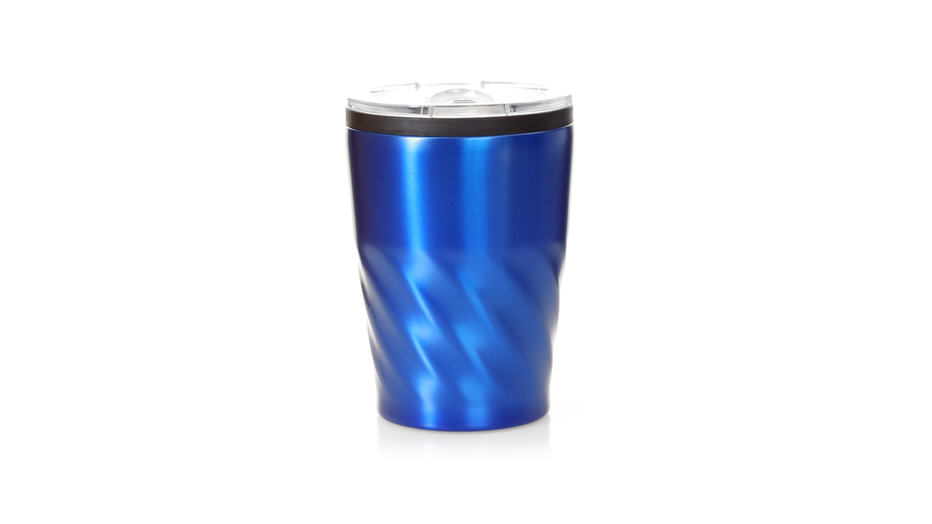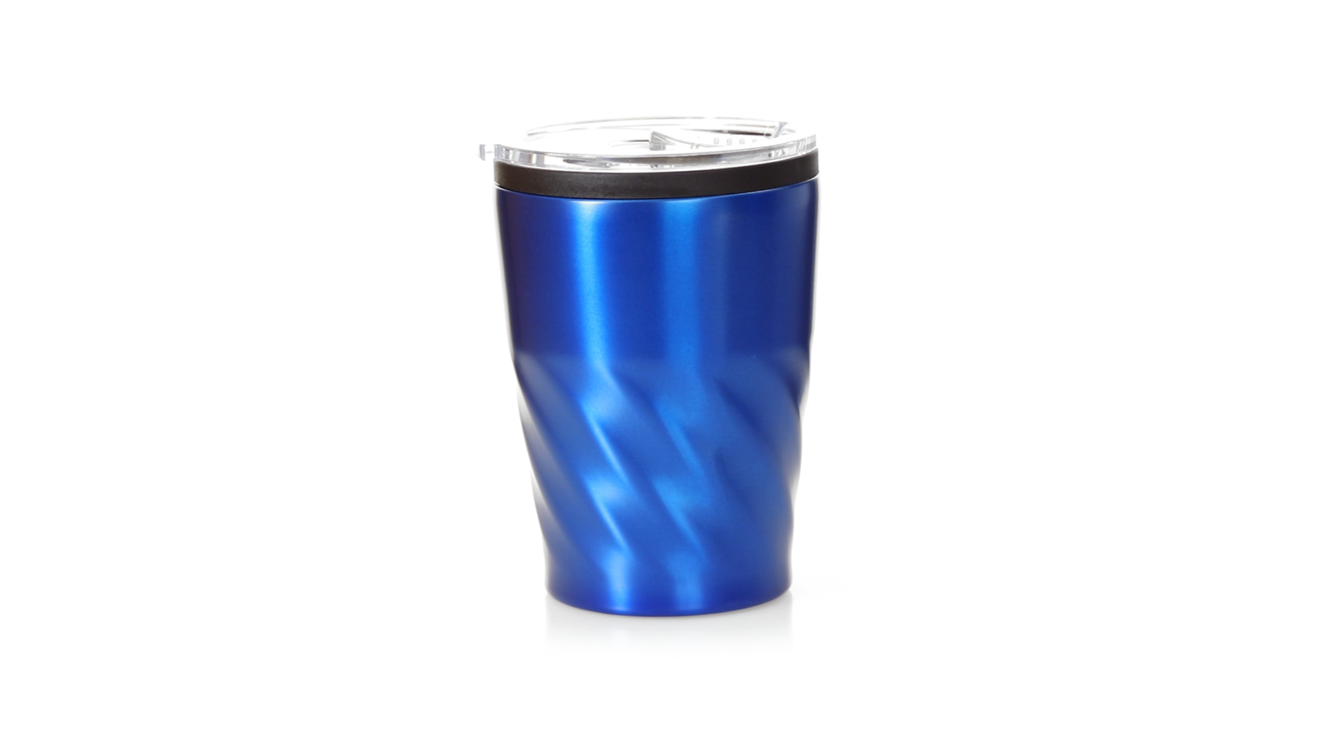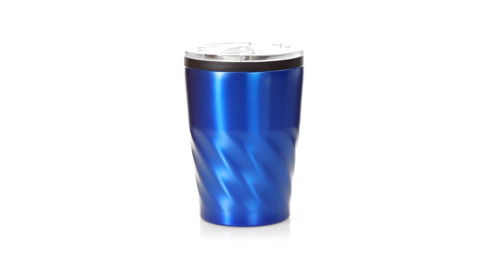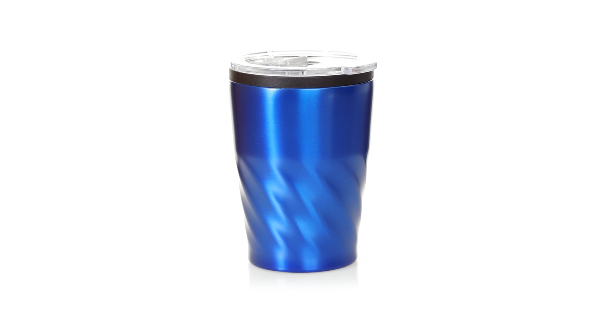 Trinkbecher aus rostfreiem Stahl mit einem Fassungsvermögen von 350 ml. Konisches Design mit schwarzem Ring. Mit origineller transparenter Spenderkappe und Easy-Opener. Es ist ideal für Ihren Schreibtisch, Tisch oder jede andere Oberfläche, auf der Sie in Ruhe Ihr Lieblingsgetränk geniessen können.