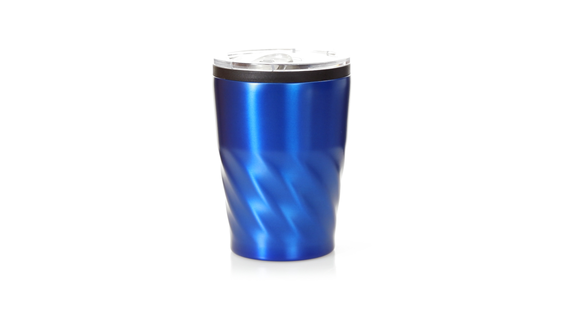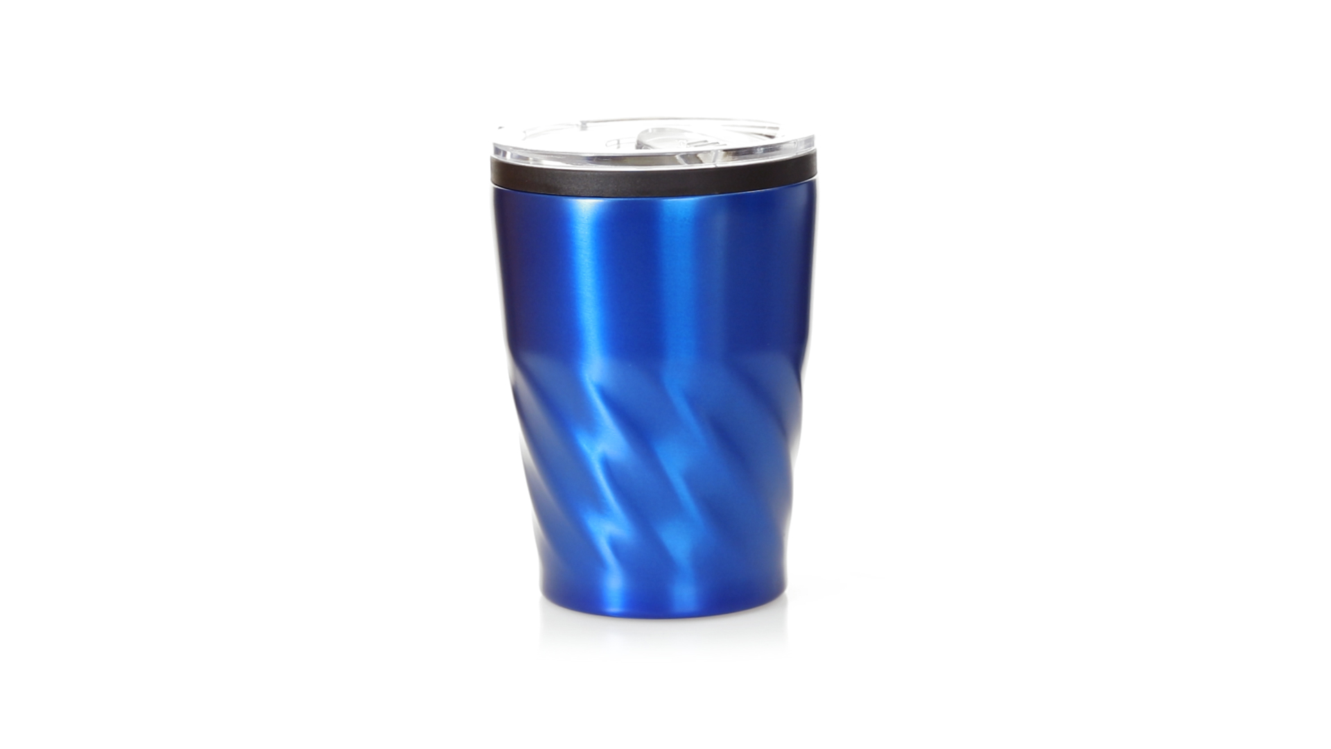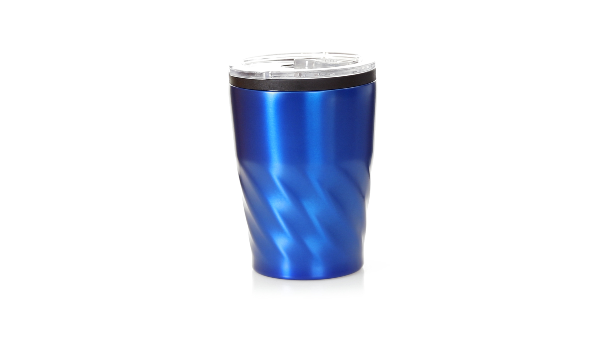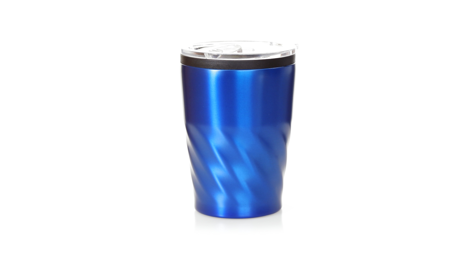 Trinkbecher aus rostfreiem Stahl mit einem Fassungsvermögen von 350 ml. Konisches Design mit schwarzem Ring. Mit origineller transparenter Spenderkappe und Easy-Opener. Es ist ideal für Ihren Schreibtisch, Tisch oder jede andere Oberfläche, auf der Sie in Ruhe Ihr Lieblingsgetränk geniessen können.