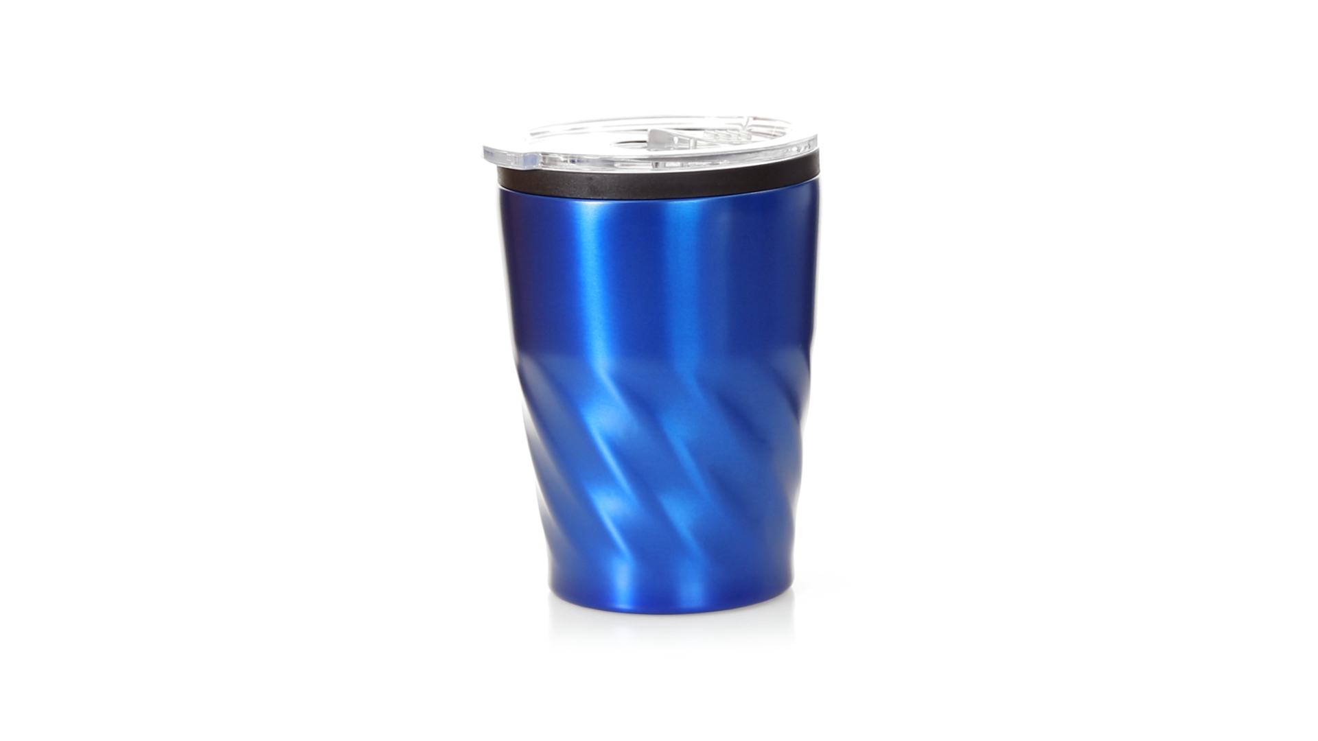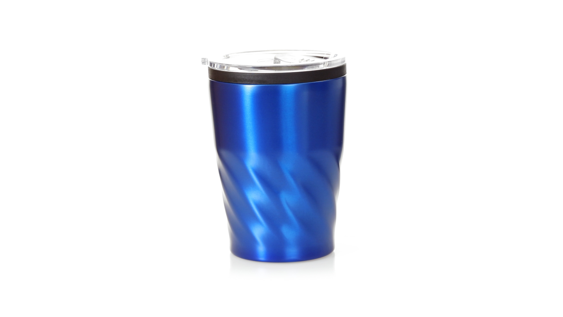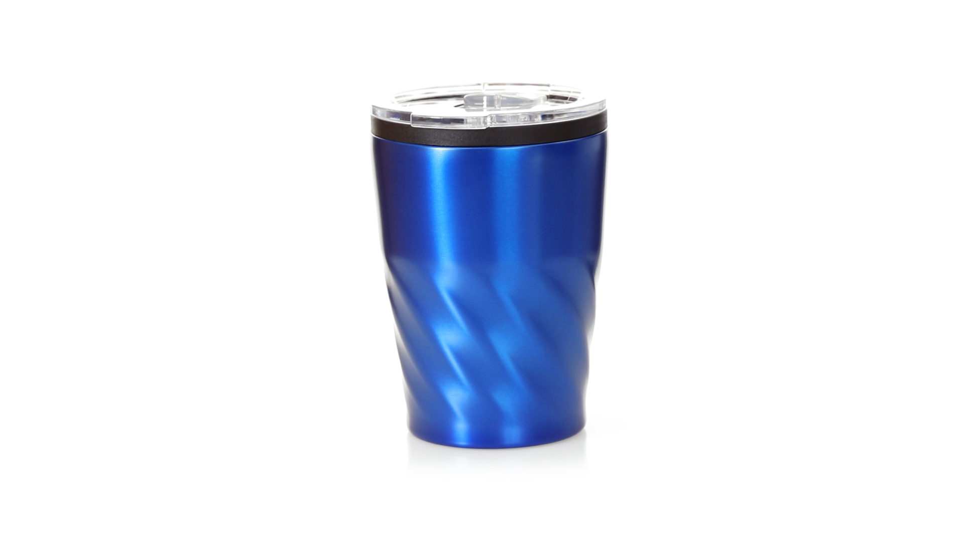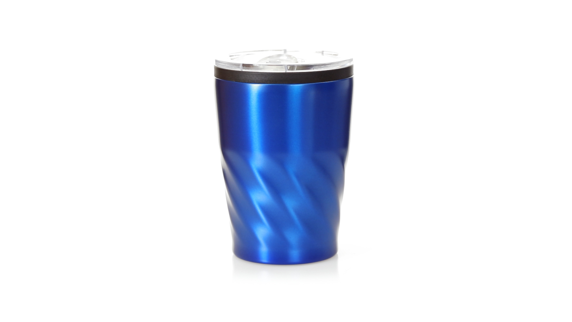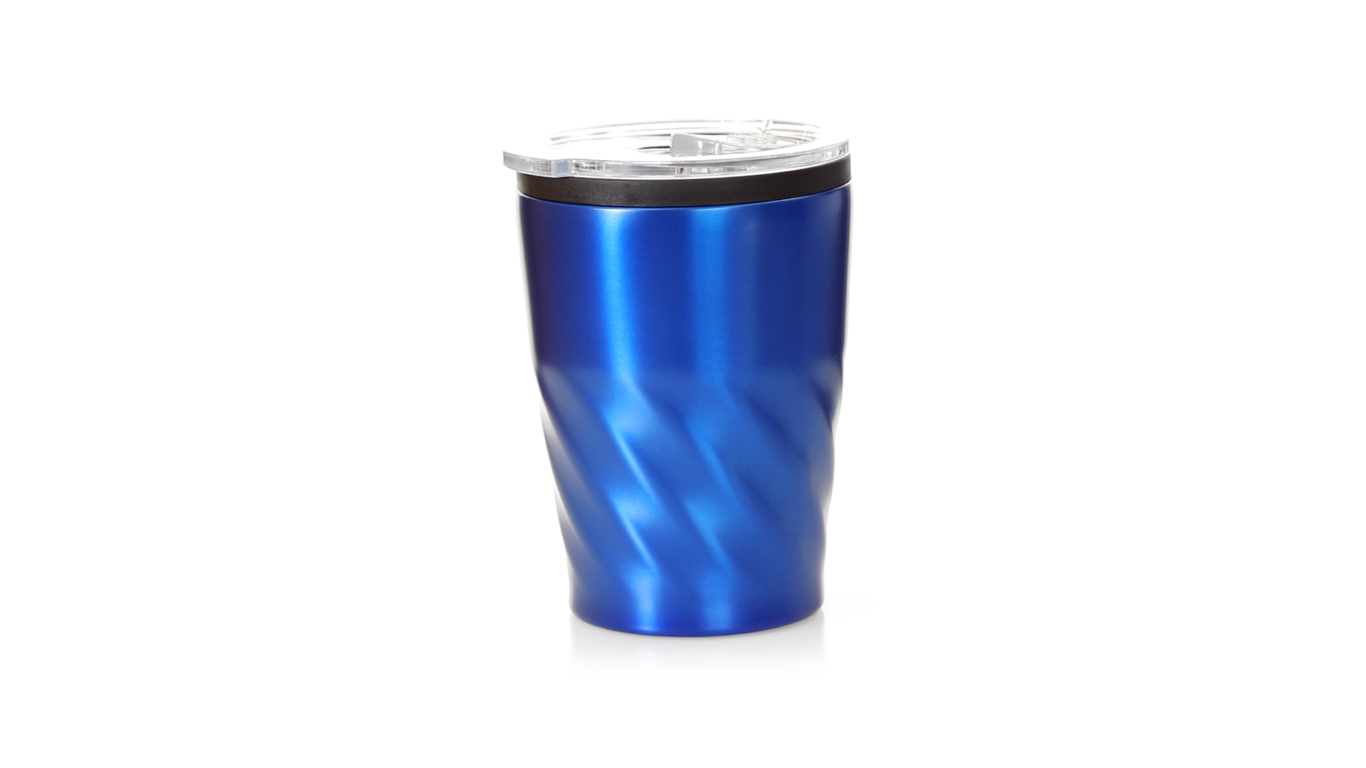 Trinkbecher aus rostfreiem Stahl mit einem Fassungsvermögen von 350 ml. Konisches Design mit schwarzem Ring. Mit origineller transparenter Spenderkappe und Easy-Opener. Es ist ideal für Ihren Schreibtisch, Tisch oder jede andere Oberfläche, auf der Sie in Ruhe Ihr Lieblingsgetränk geniessen können.