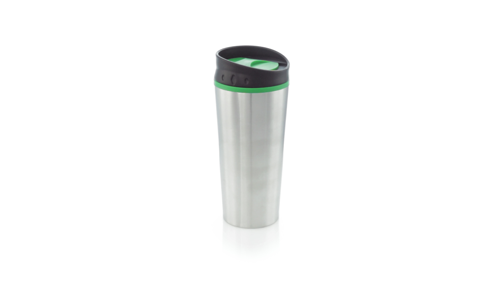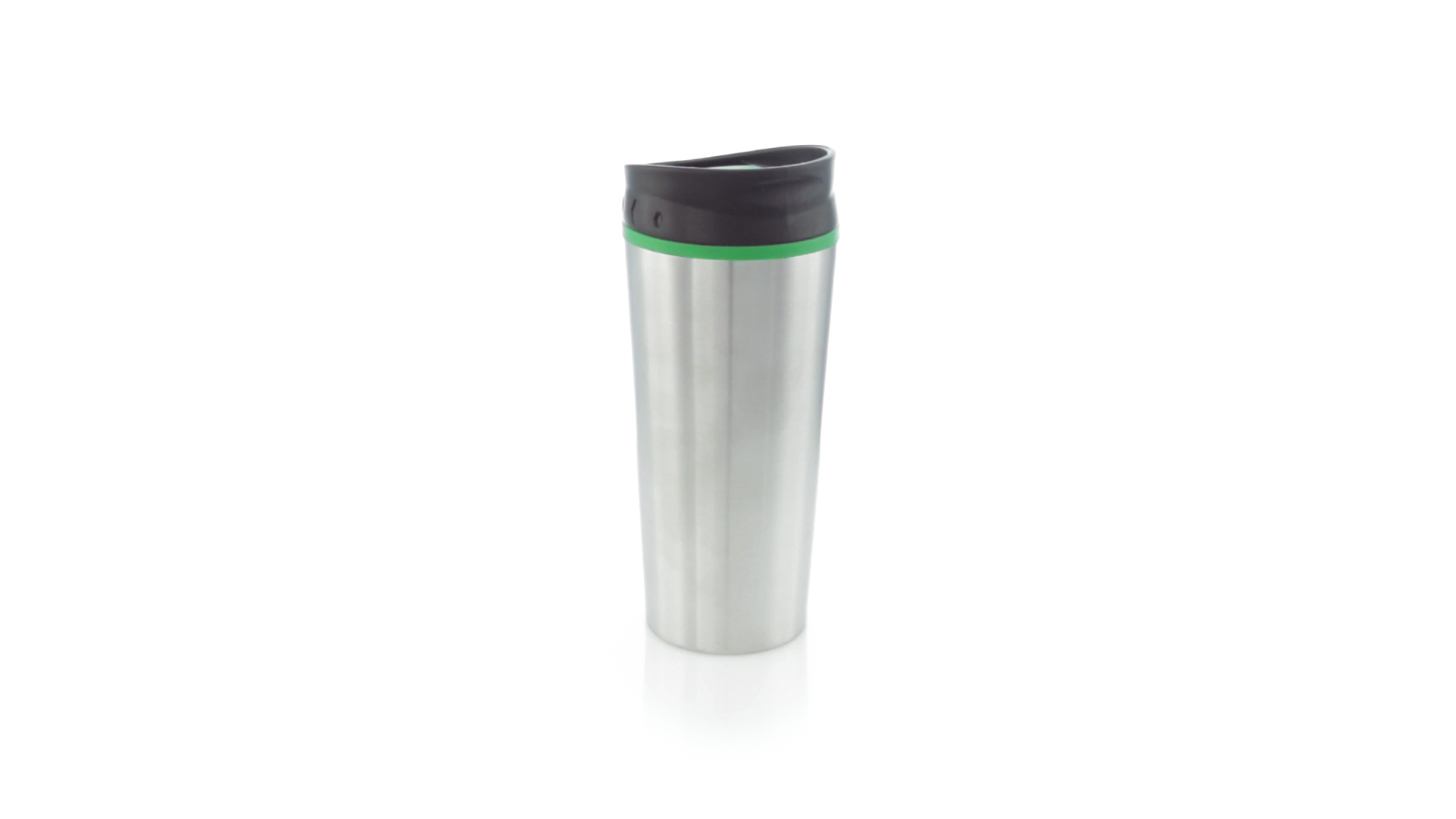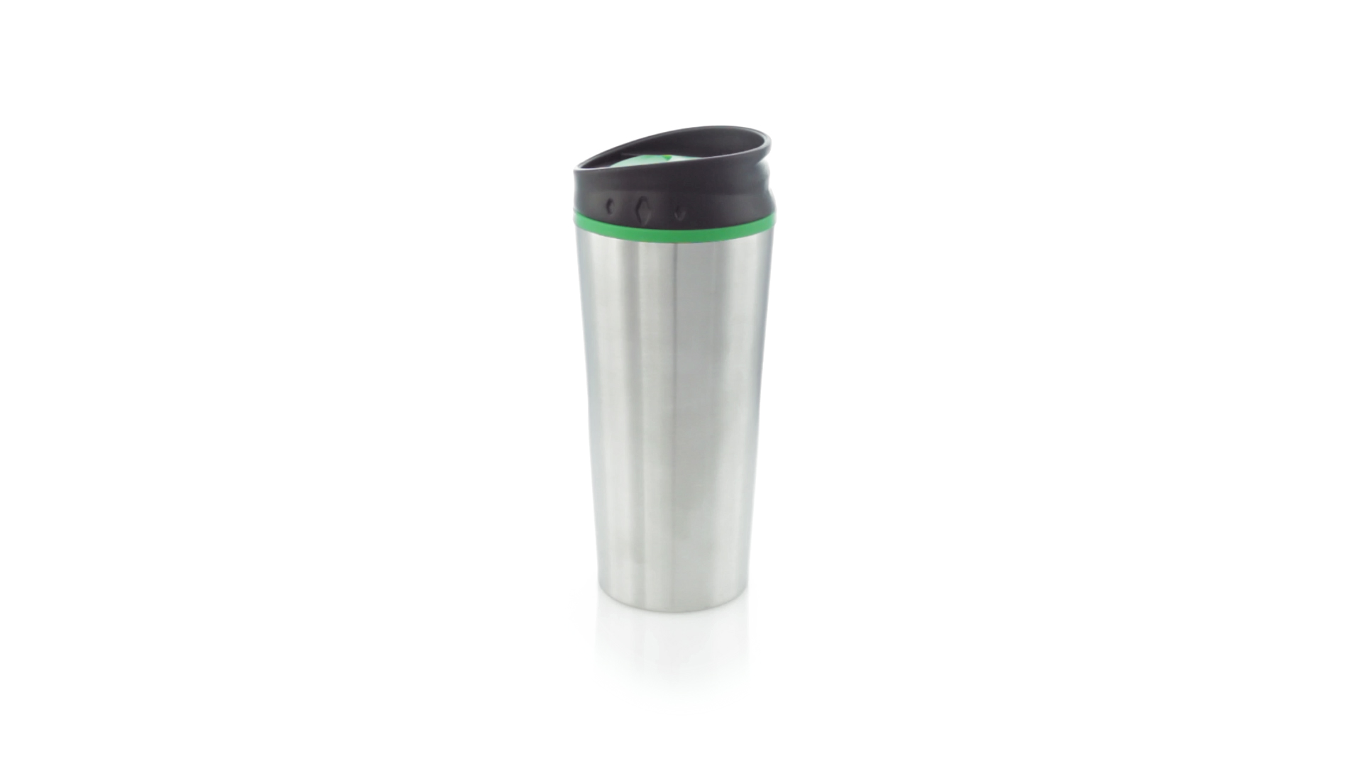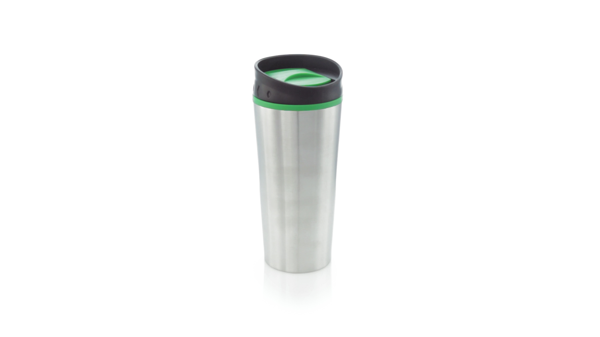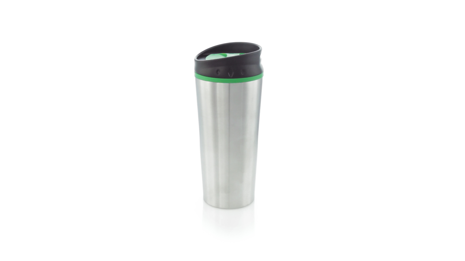 Becher aus Edelstahl mit 500 ml Fassungsvermögen. In Metallic-Ausführung mit Kontrastdetails in lebendigen Farben und Deckel mit Sicherheitsspender. Präsentiert in einer individuellen Box.
