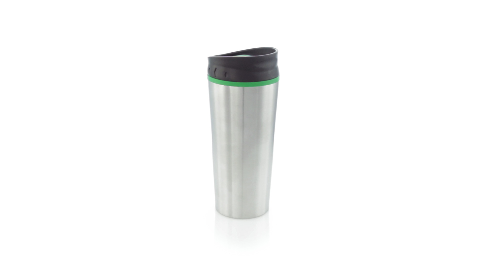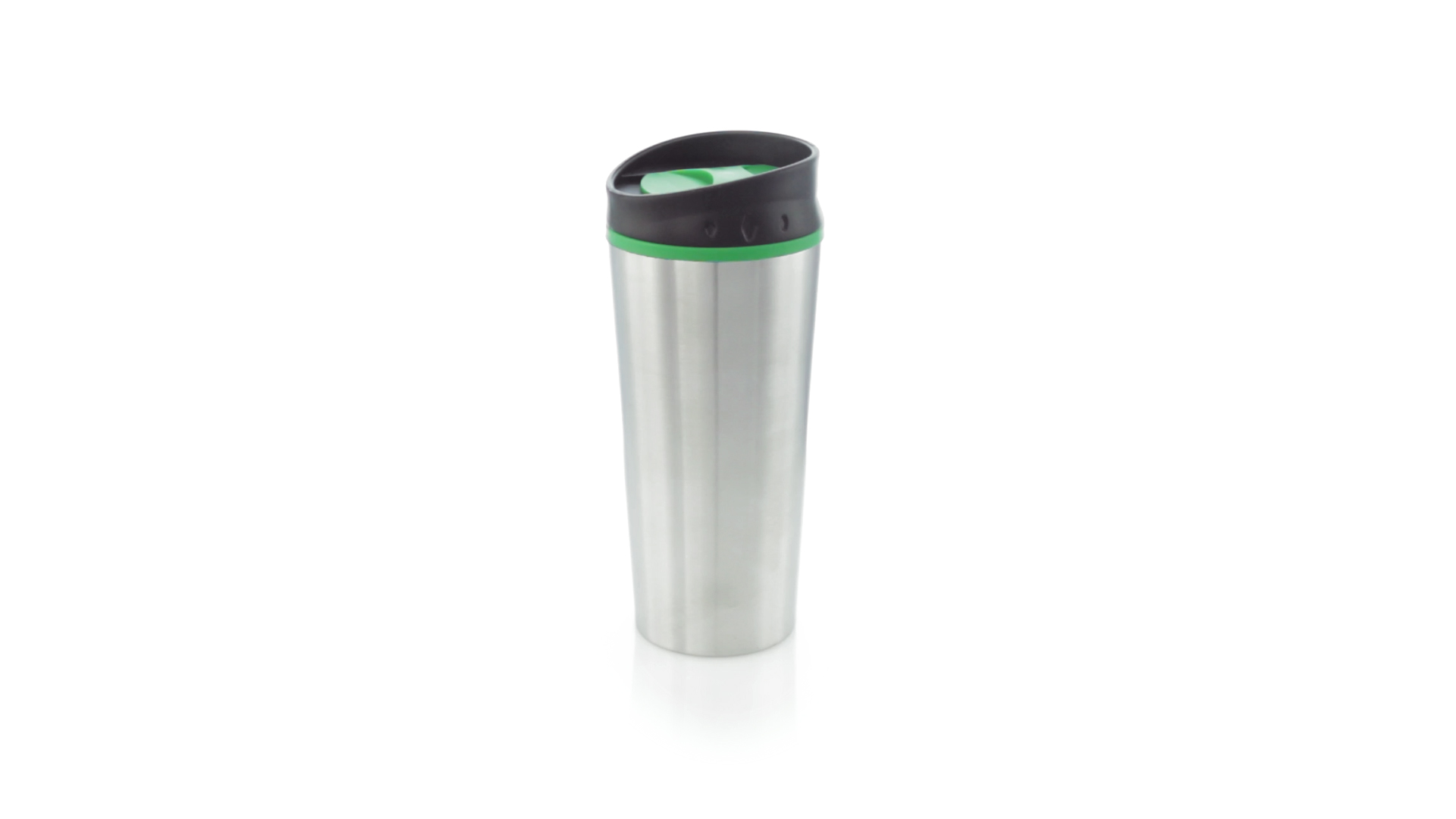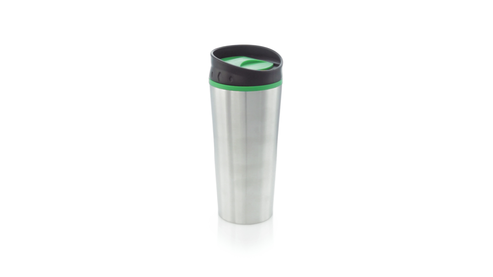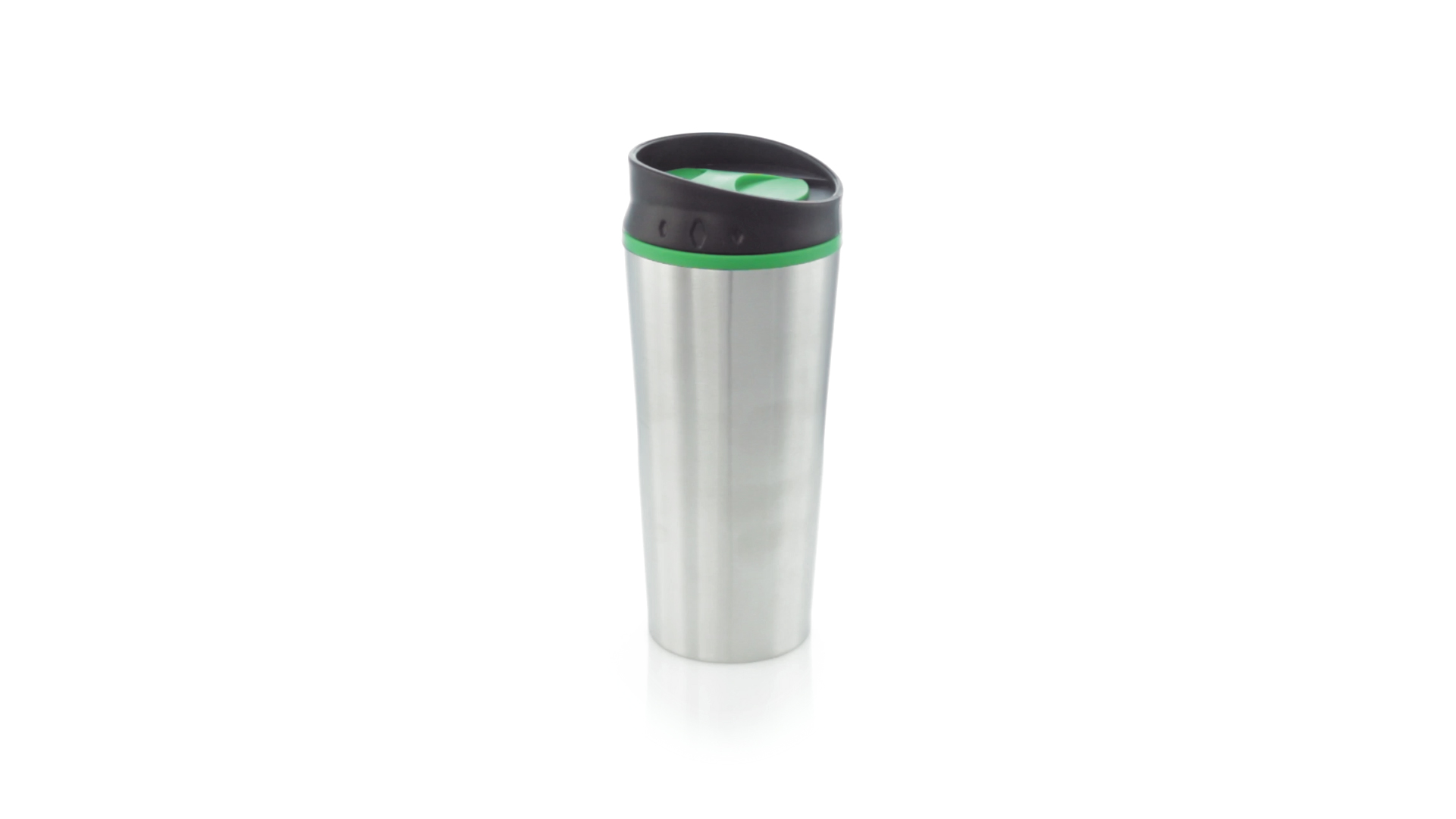Becher aus Edelstahl mit 500 ml Fassungsvermögen. In Metallic-Ausführung mit Kontrastdetails in lebendigen Farben und Deckel mit Sicherheitsspender. Präsentiert in einer individuellen Box.