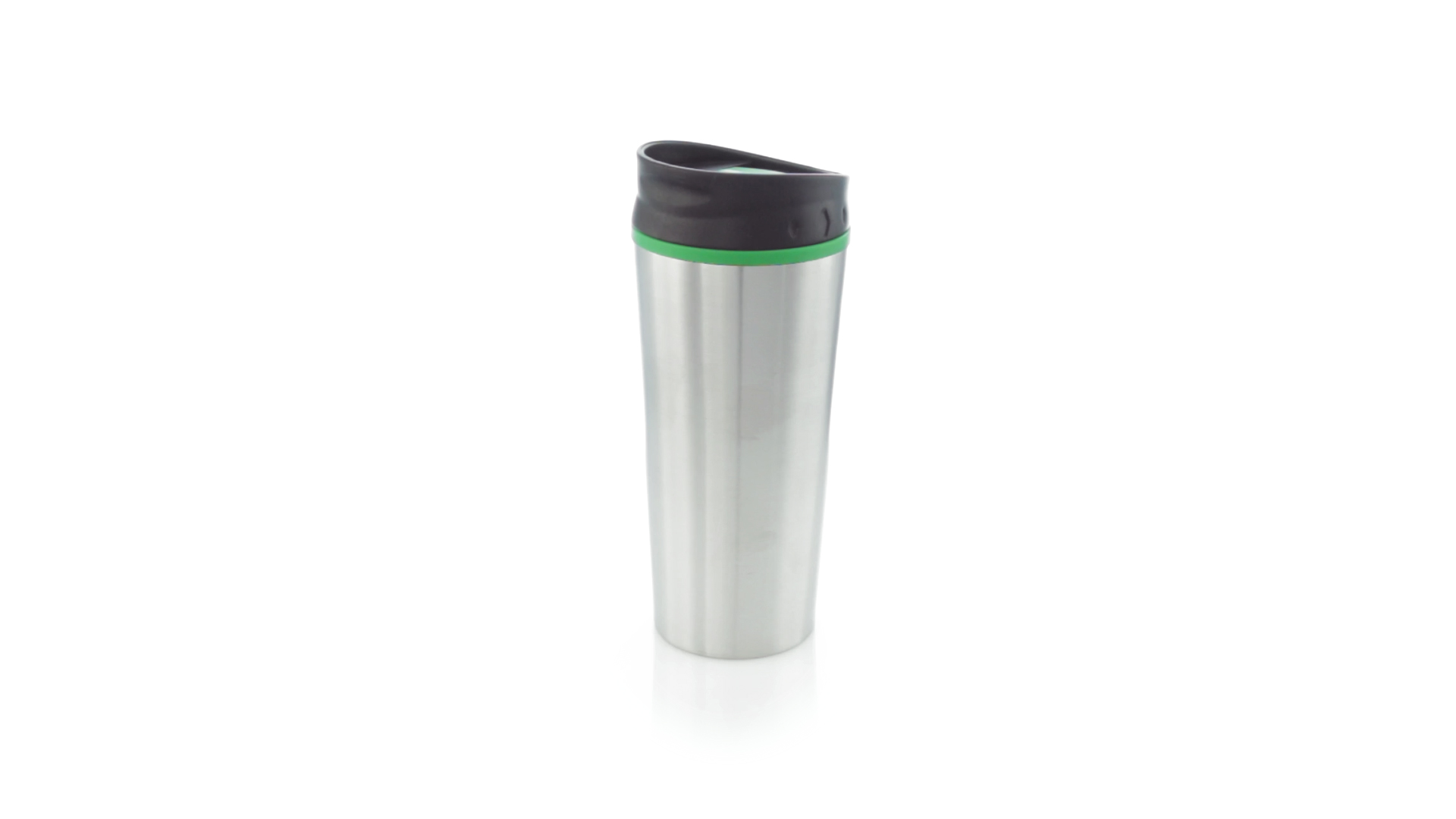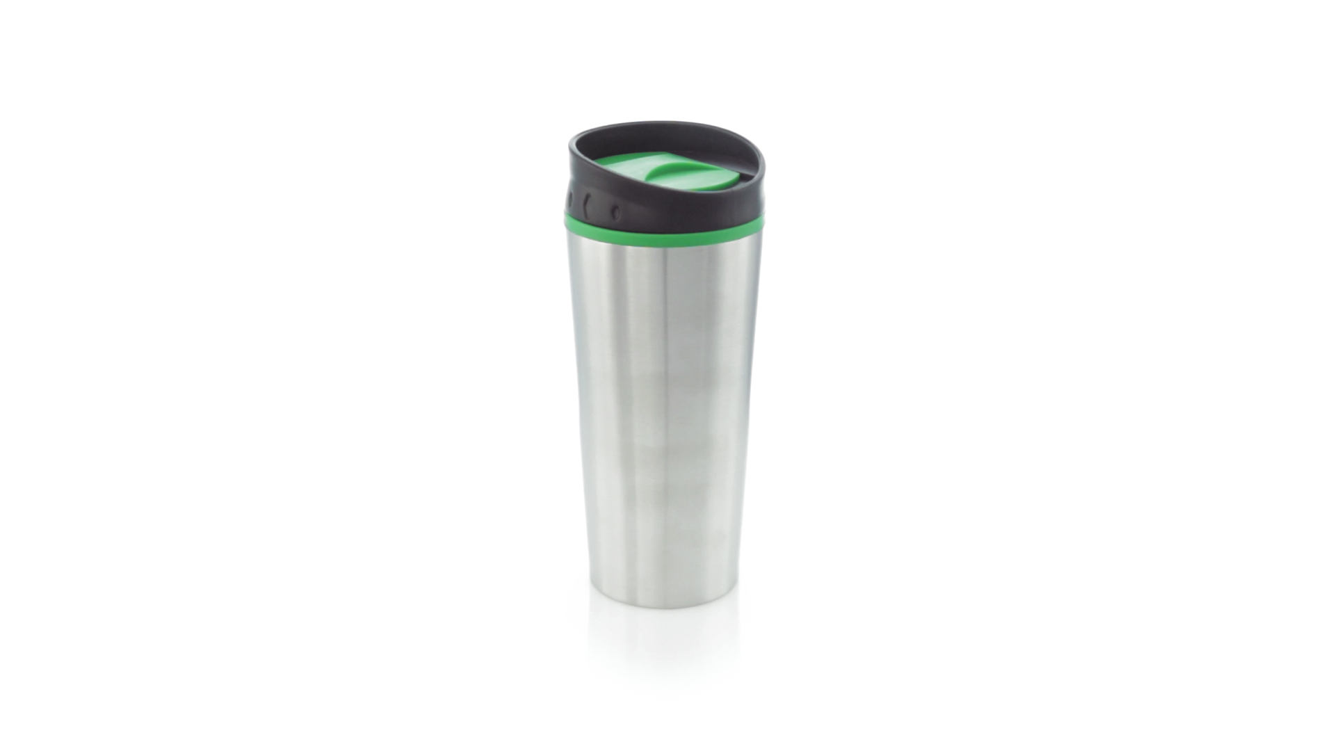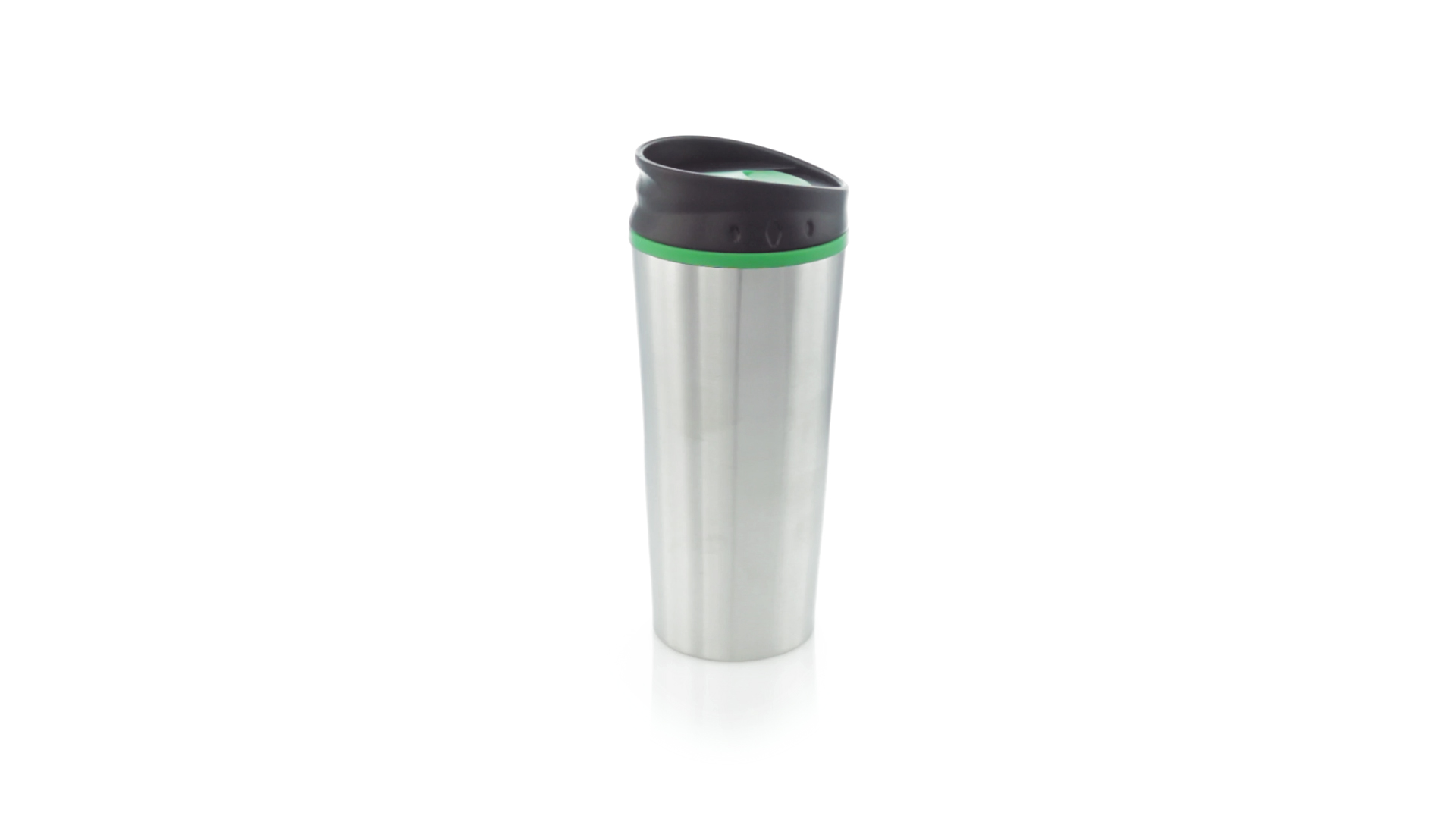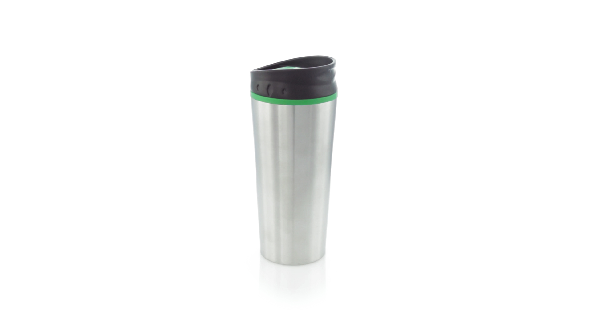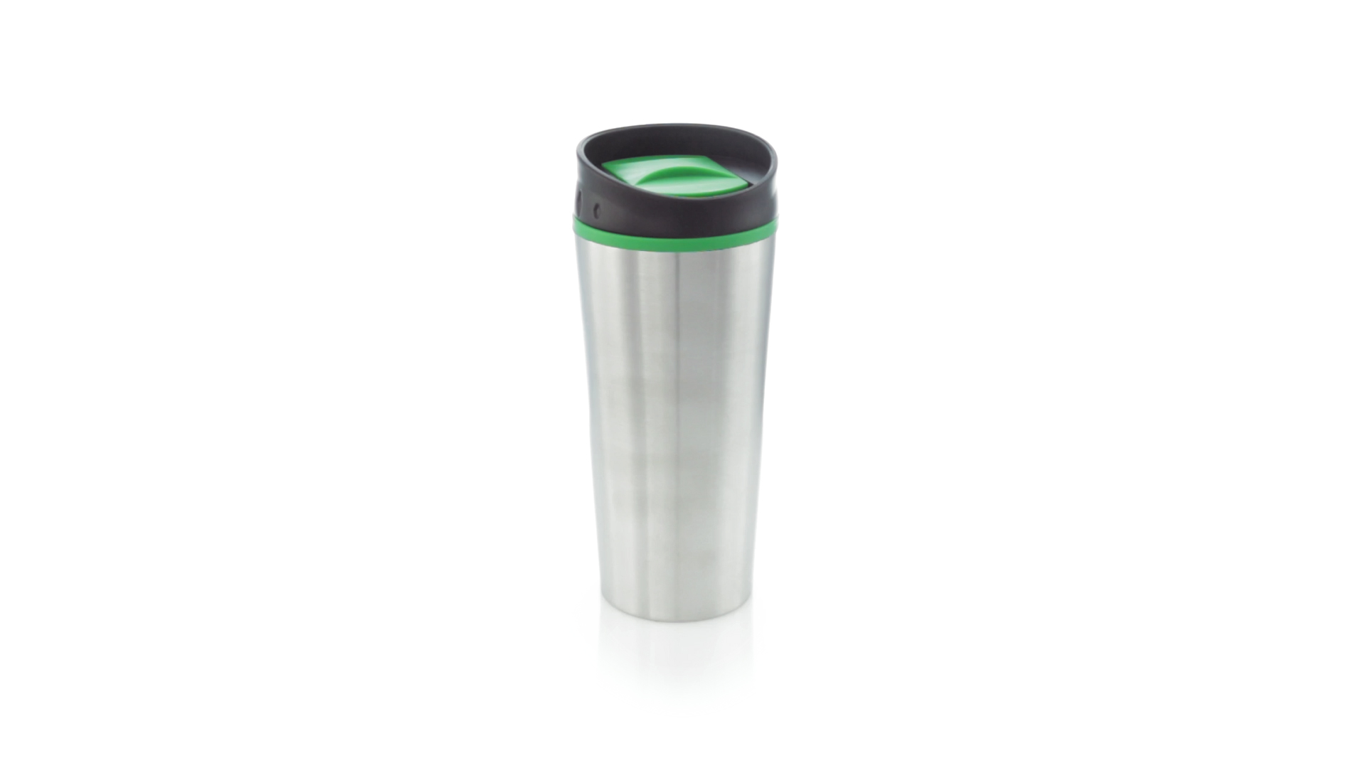 Becher aus Edelstahl mit 500 ml Fassungsvermögen. In Metallic-Ausführung mit Kontrastdetails in lebendigen Farben und Deckel mit Sicherheitsspender. Präsentiert in einer individuellen Box.