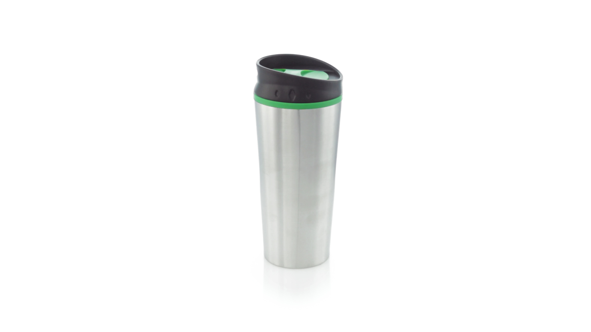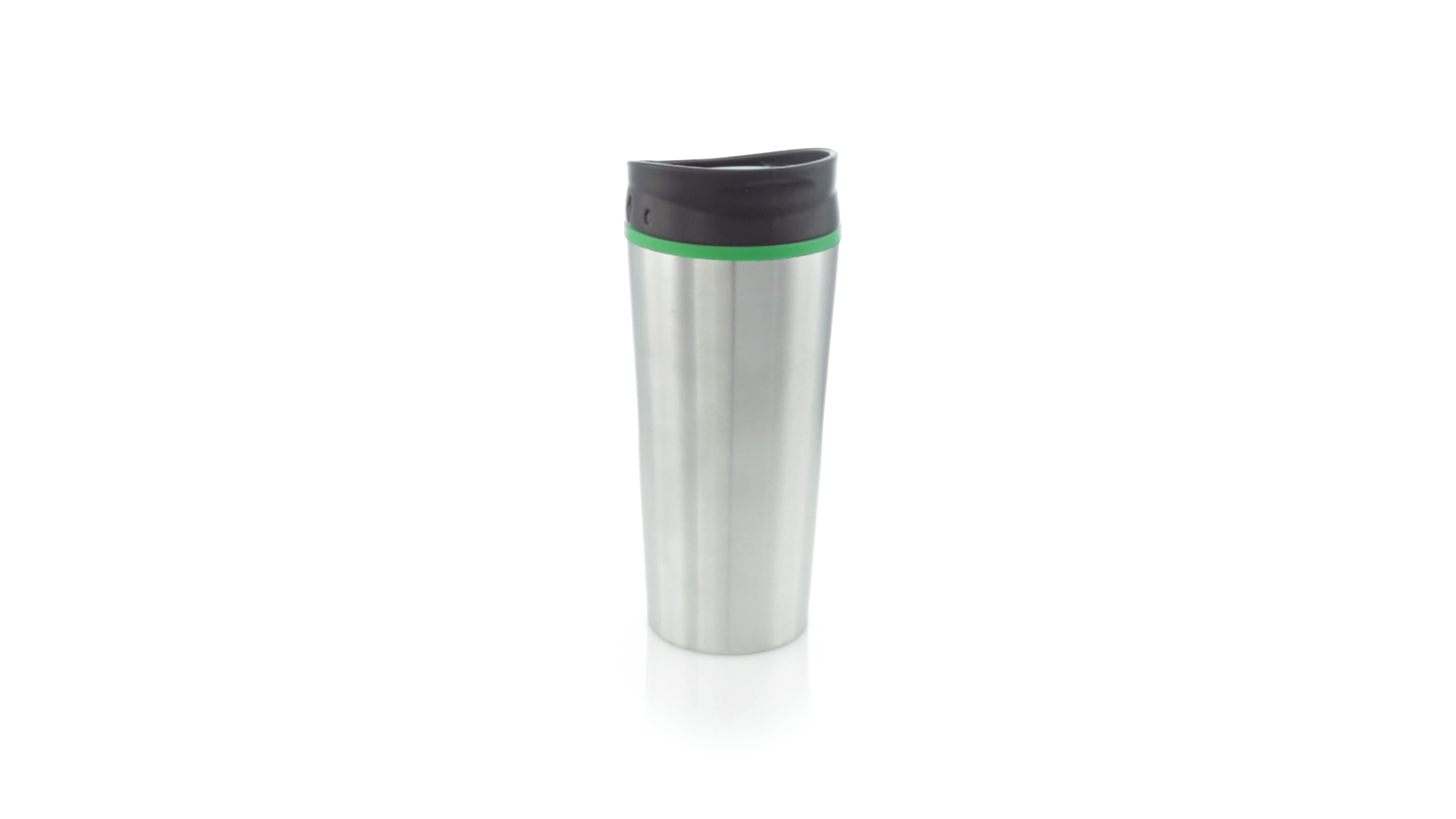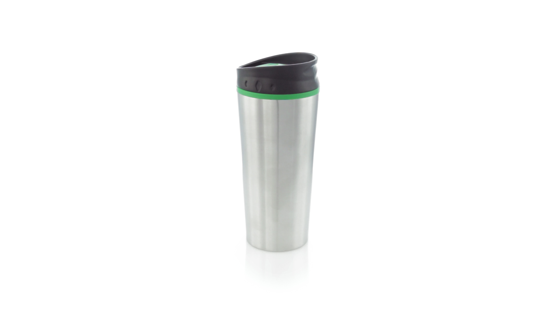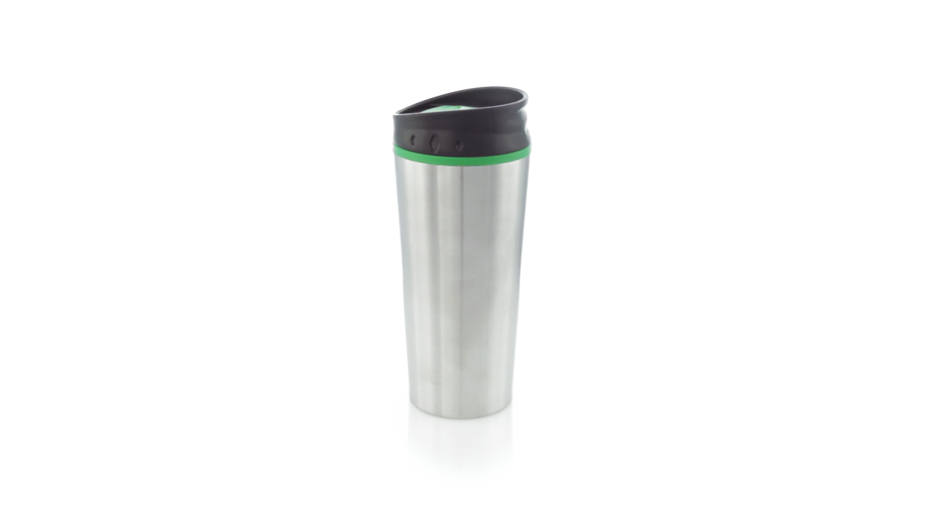 Becher aus Edelstahl mit 500 ml Fassungsvermögen. In Metallic-Ausführung mit Kontrastdetails in lebendigen Farben und Deckel mit Sicherheitsspender. Präsentiert in einer individuellen Box.