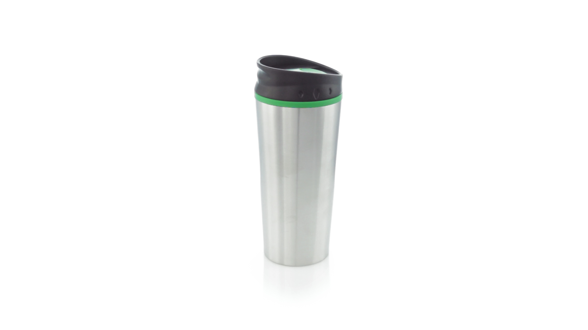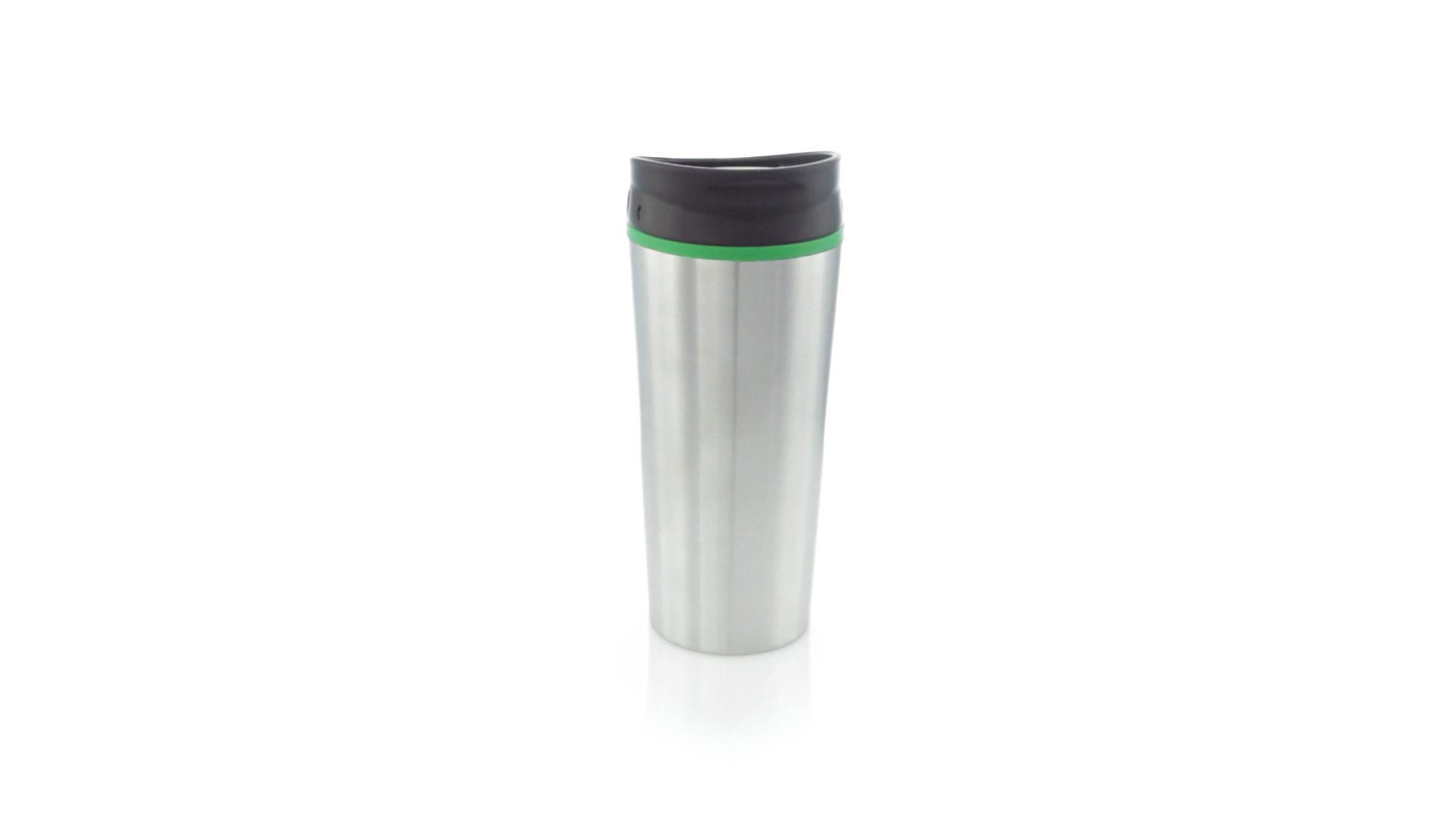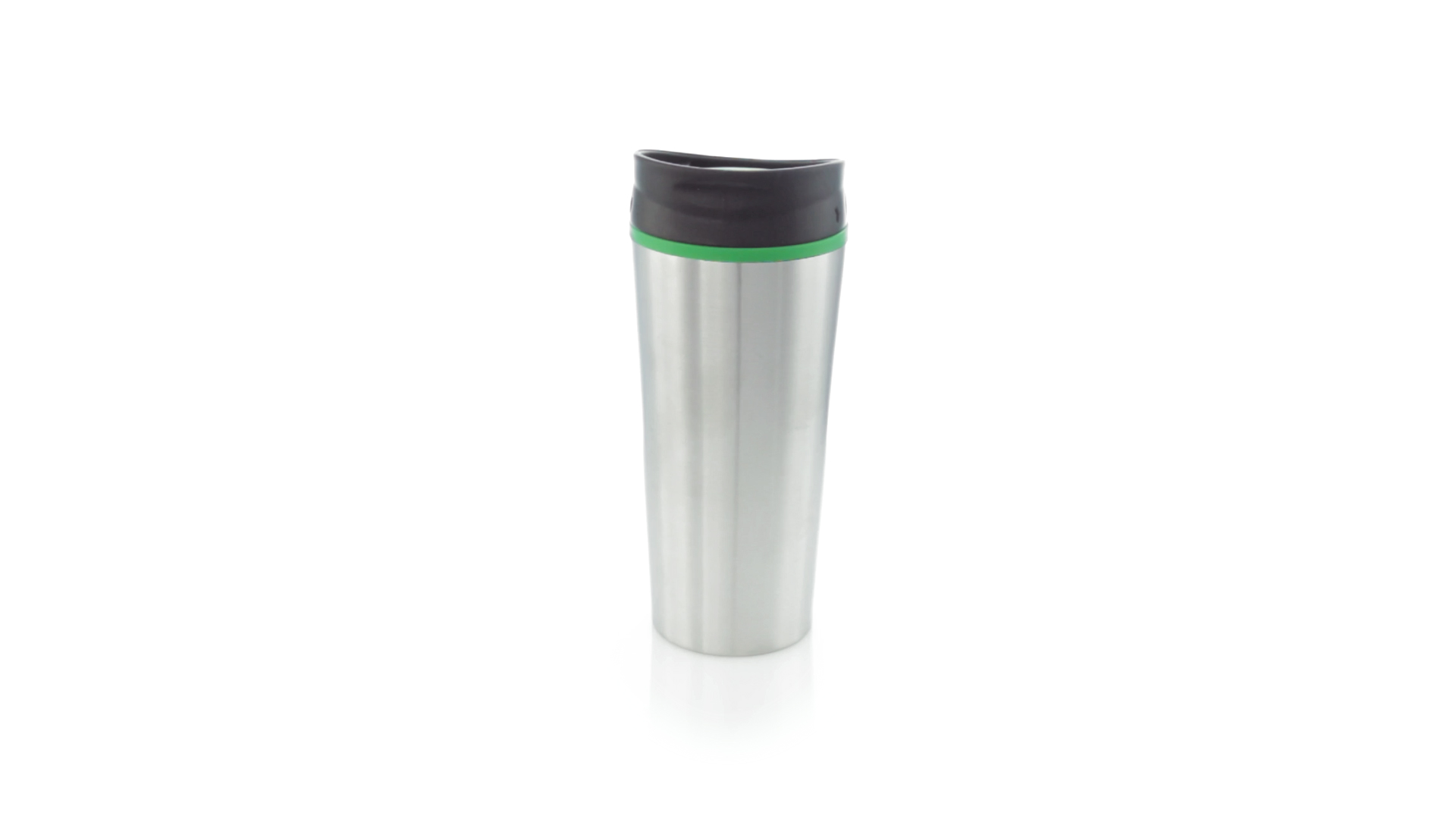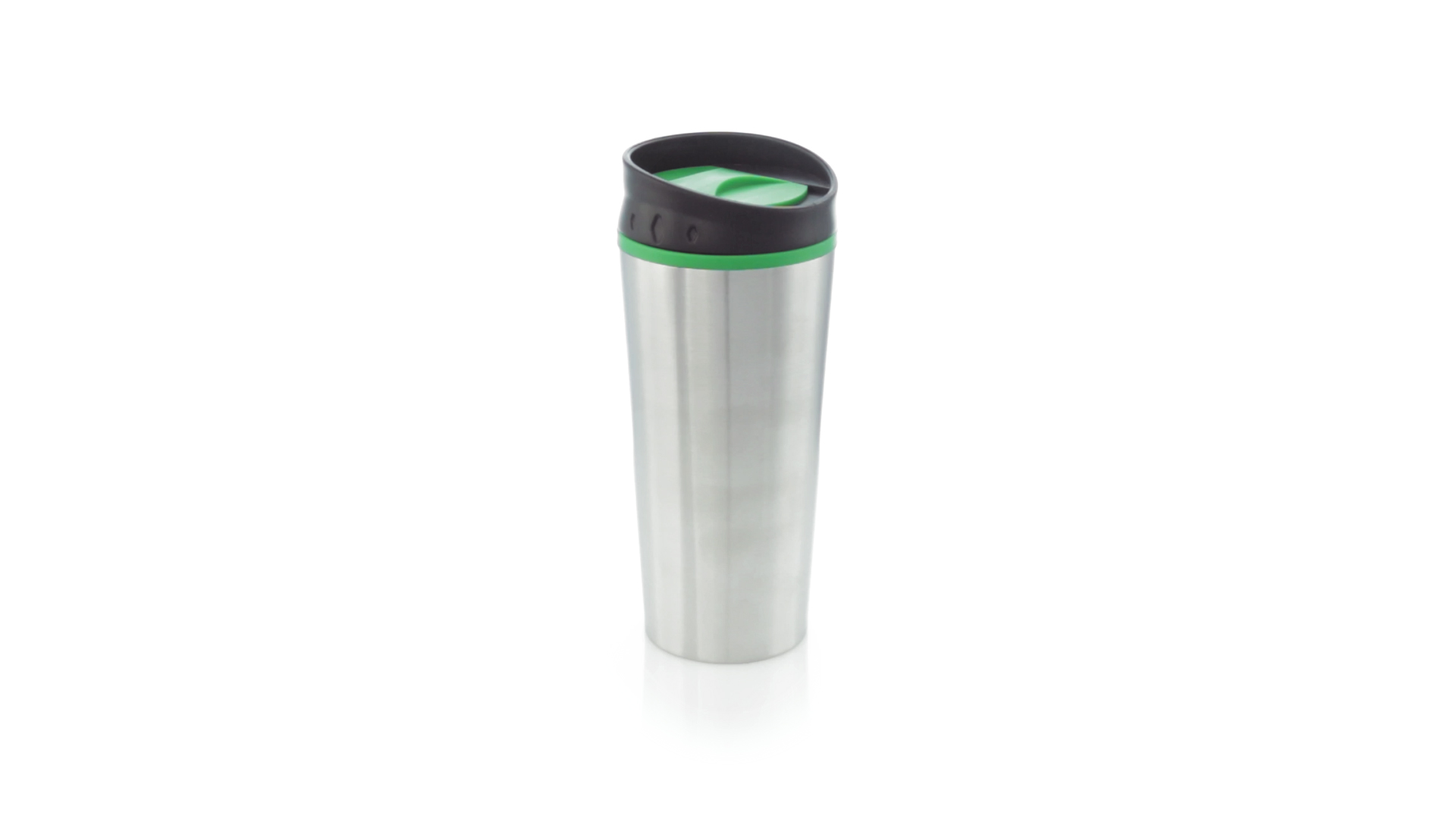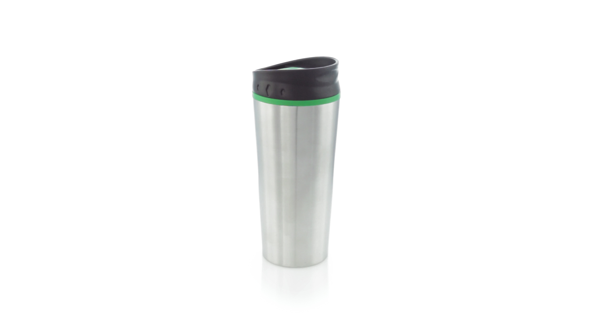 Becher aus Edelstahl mit 500 ml Fassungsvermögen. In Metallic-Ausführung mit Kontrastdetails in lebendigen Farben und Deckel mit Sicherheitsspender. Präsentiert in einer individuellen Box.
