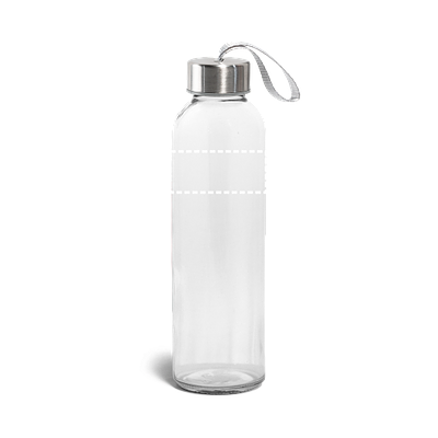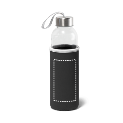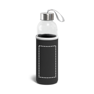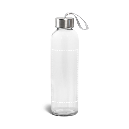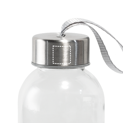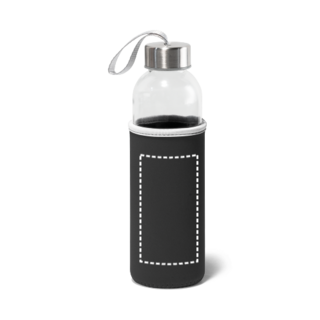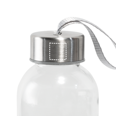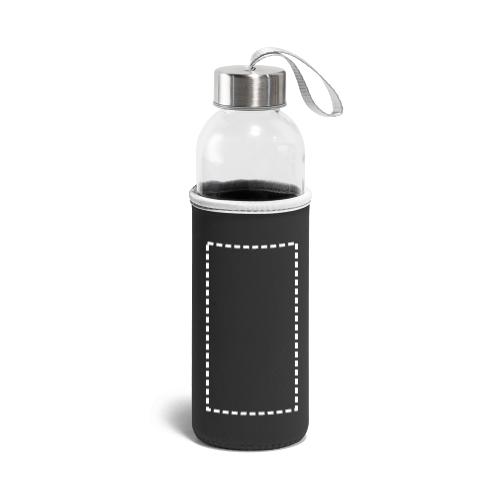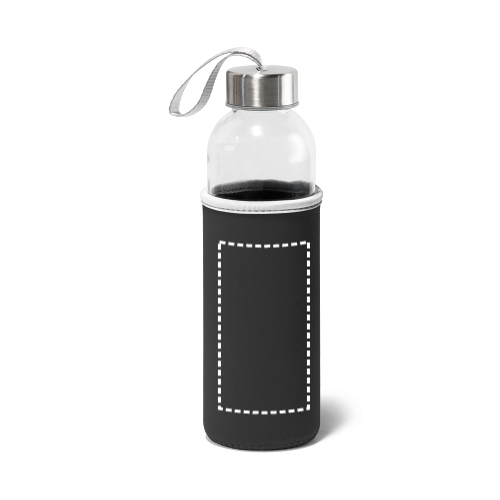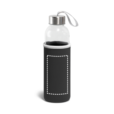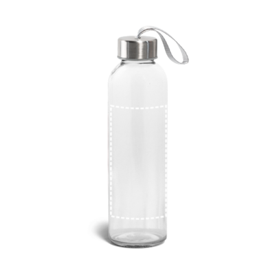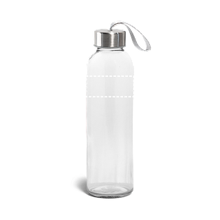 Trinkflasche aus Glas (520 mL) mit farbiger Softshell-Ummantelung. Der Deckel ist aussen aus Edelstahl und hat innen einen Kunstoffeinsatz. Die Schlaufe auf dem Deckel ermöglicht das bequeme und praktische Mitnehmen. ø65 x 225 mm