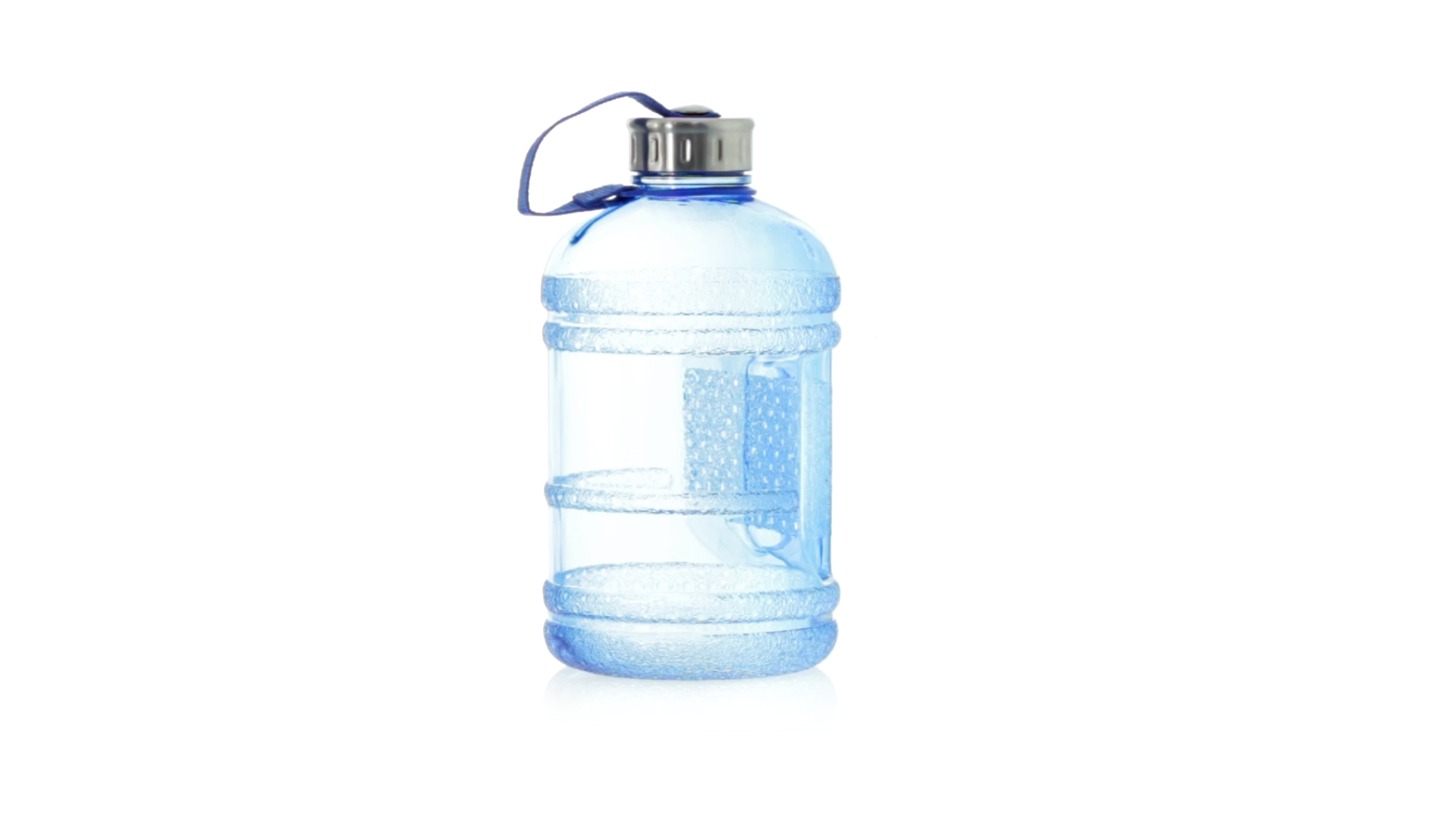 Trinkflasche aus PET mit einem Fassungsvermögen von 1,89 l. Mit Gehäuse in einer Vielzahl von lebendigen transparenten Farben, Sicherheitsschraubverschluss aus Edelstahl, farblich passendem Trageband und praktischem Griff.