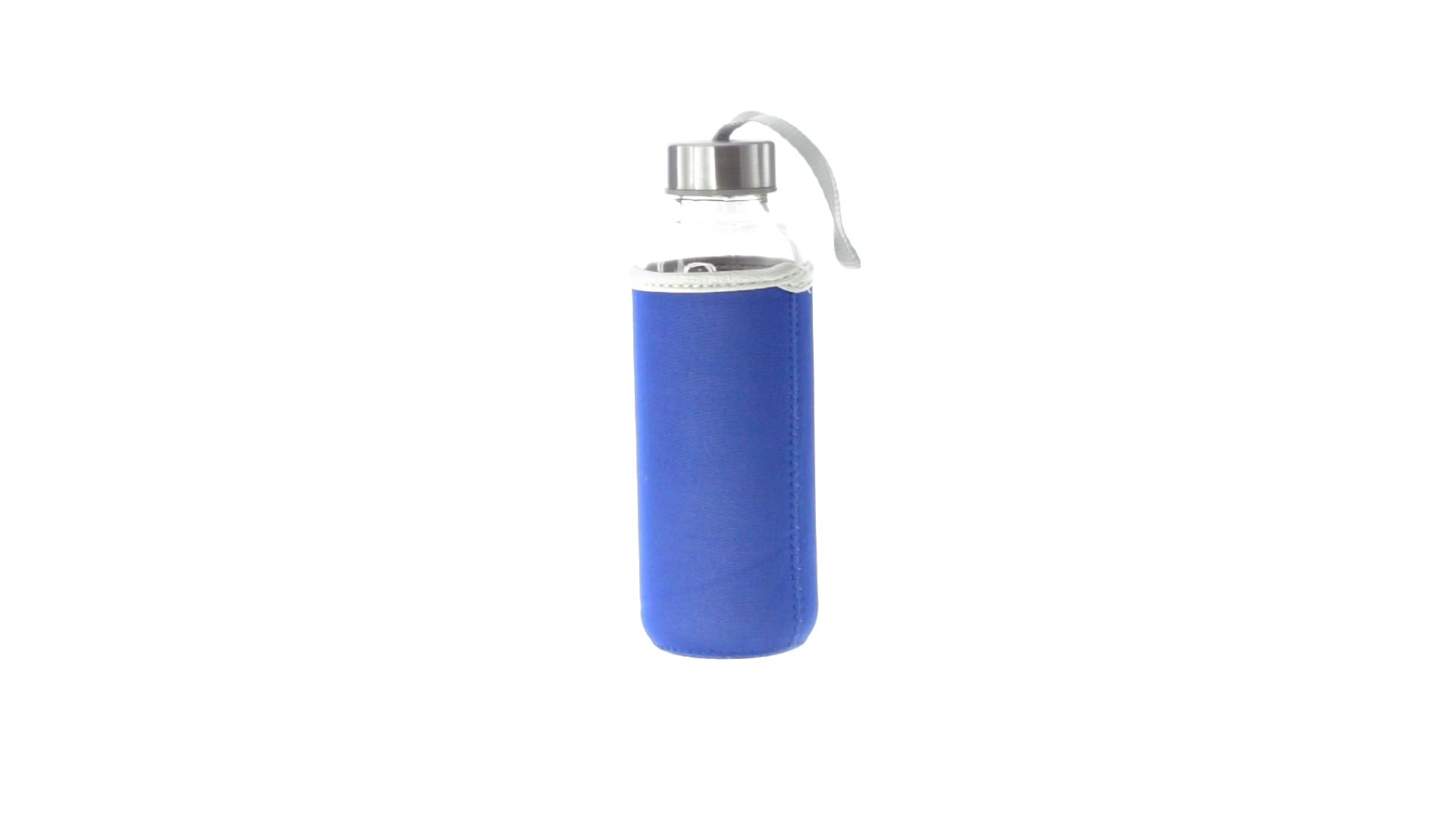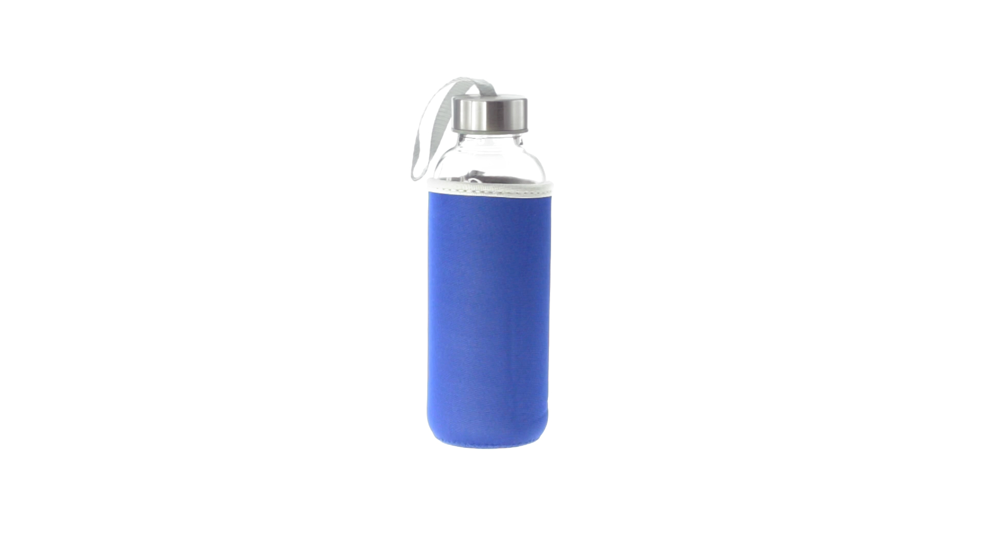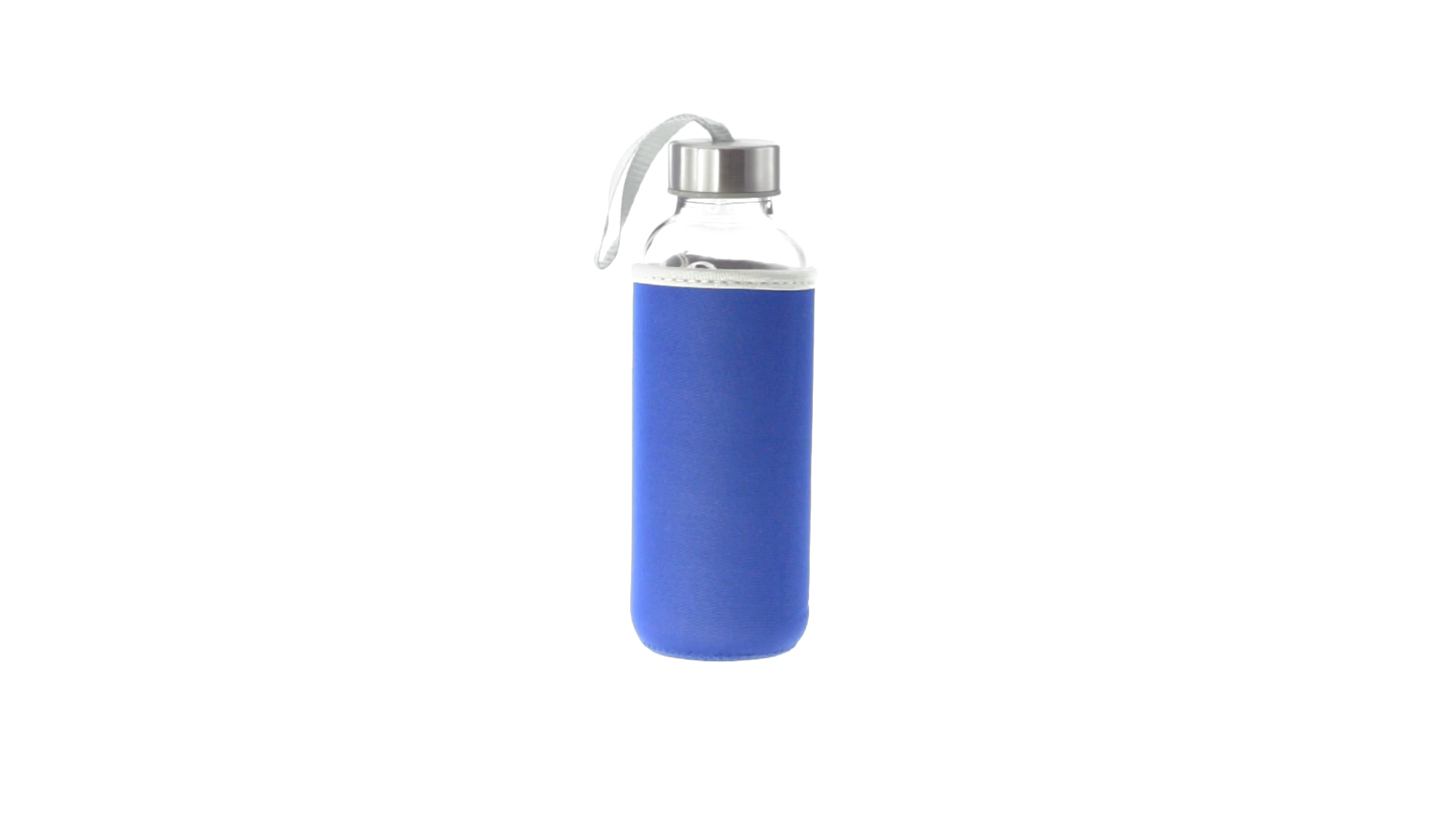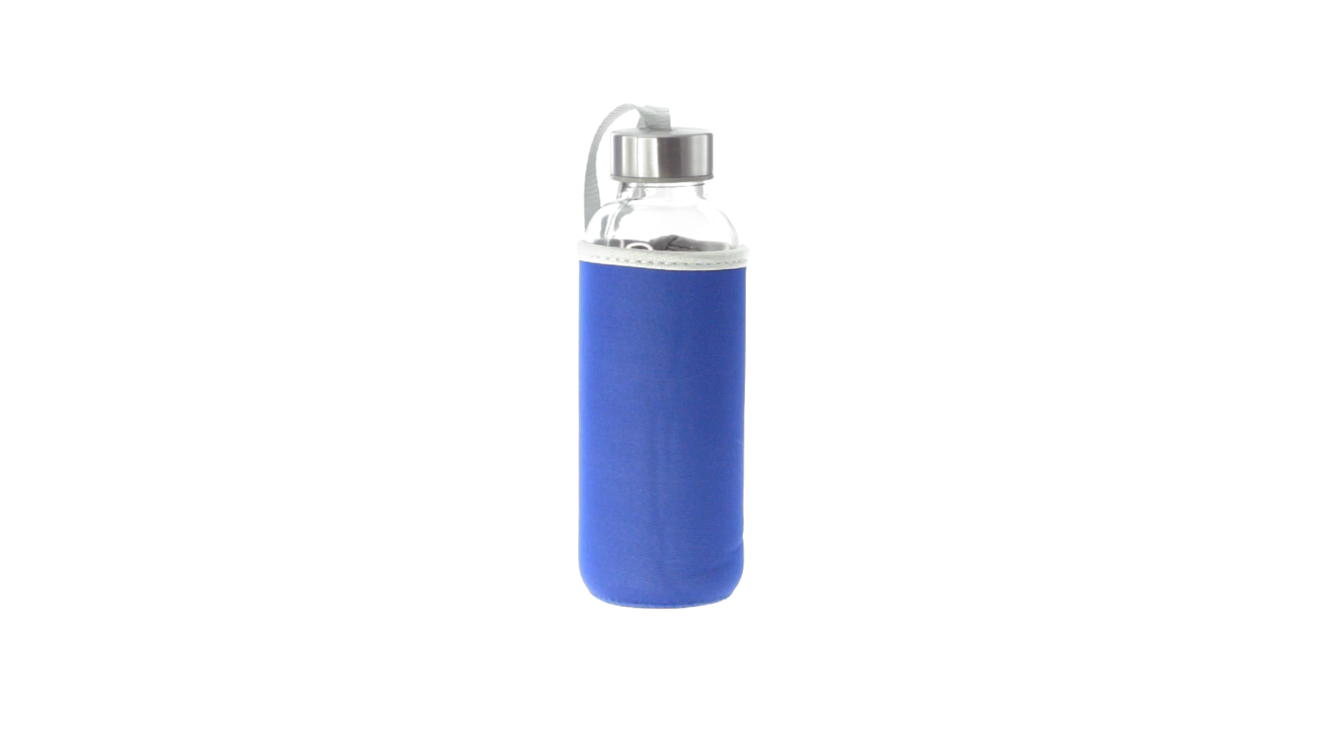 Glas-Trinkflasche mit 420 ml Fassungsvermögen. Mit aufschraubbarem Sicherheitsverschluss und praktischem Trageriemen, dazu eine stylische Neoprenhülle in leuchtenden Farben. Einzeln verpackt in einer Designbox.