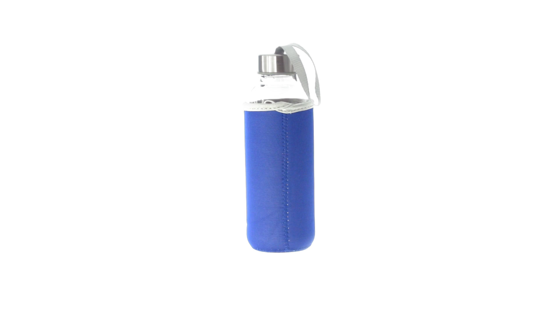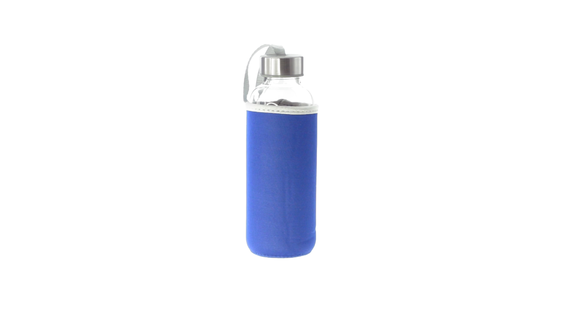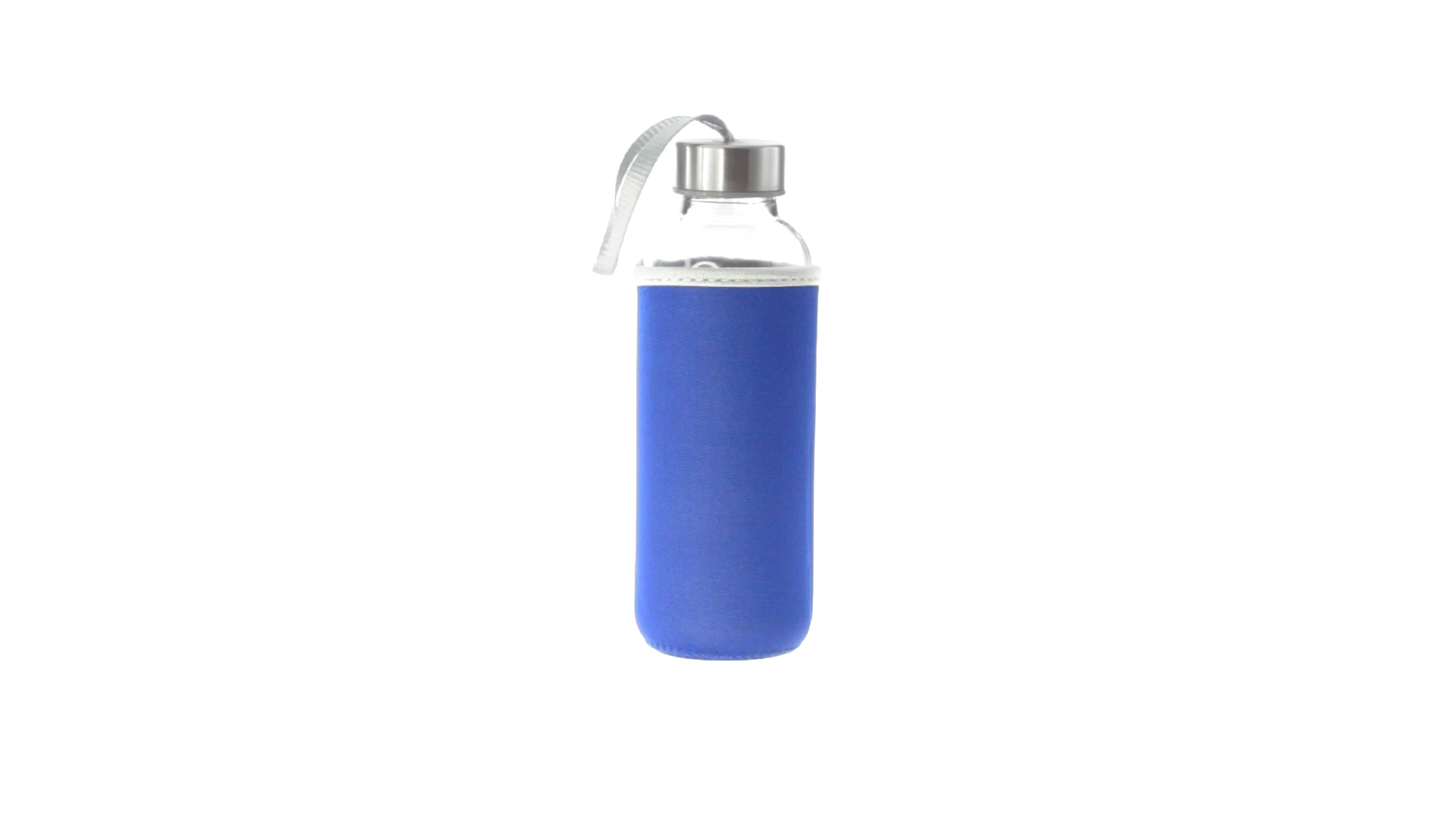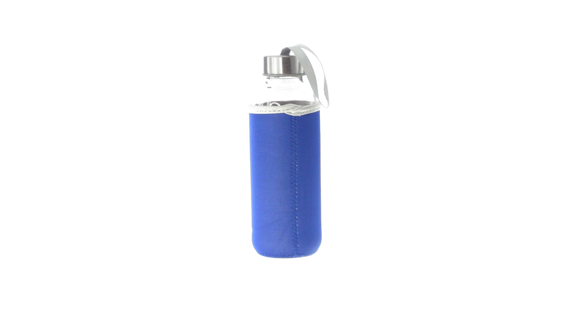 Glas-Trinkflasche mit 420 ml Fassungsvermögen. Mit aufschraubbarem Sicherheitsverschluss und praktischem Trageriemen, dazu eine stylische Neoprenhülle in leuchtenden Farben. Einzeln verpackt in einer Designbox.