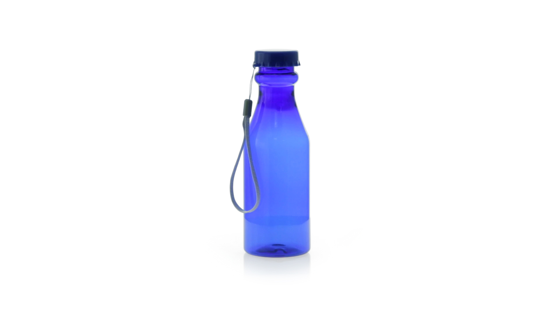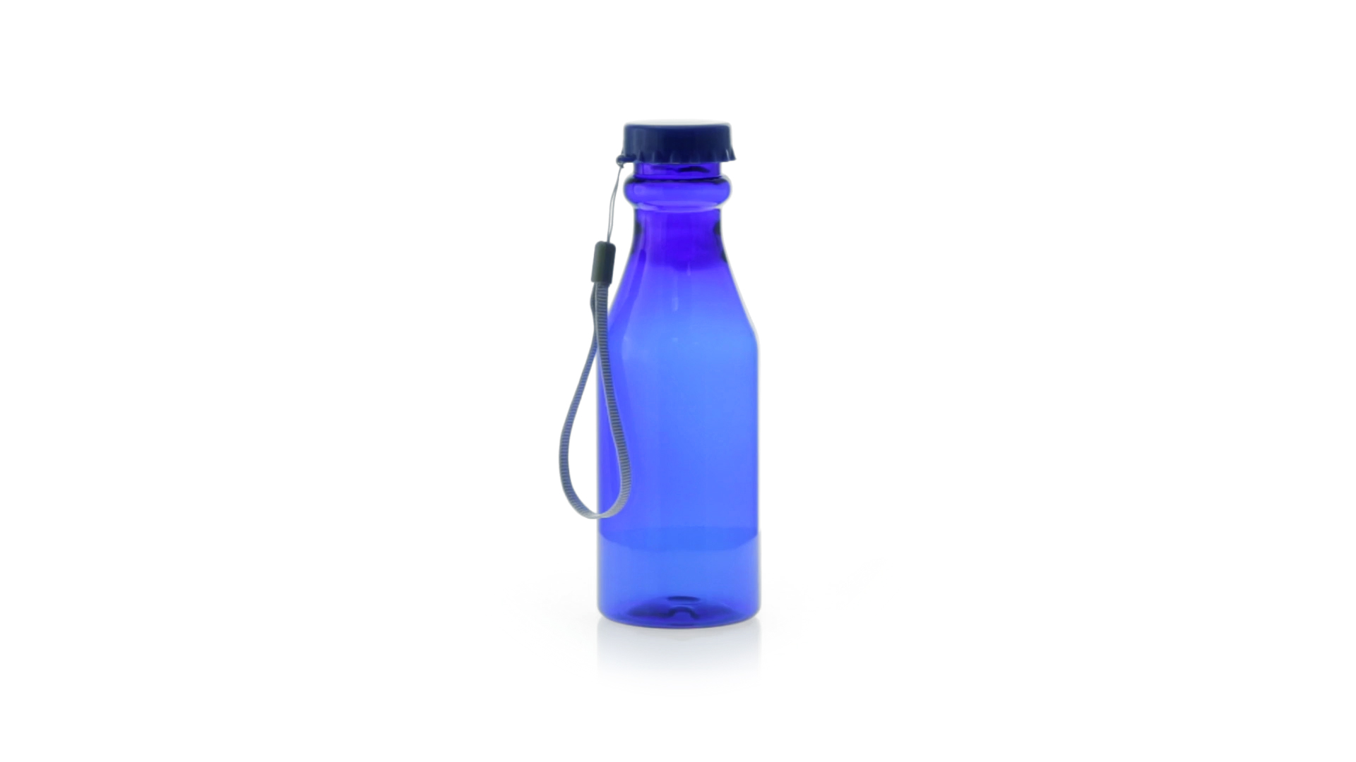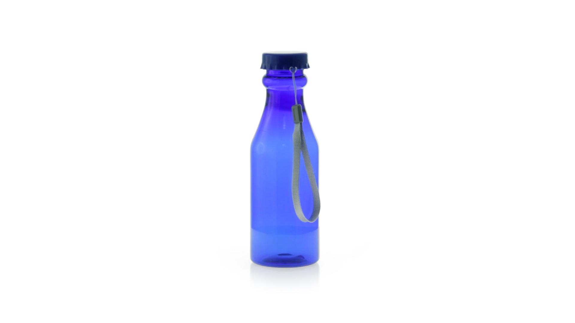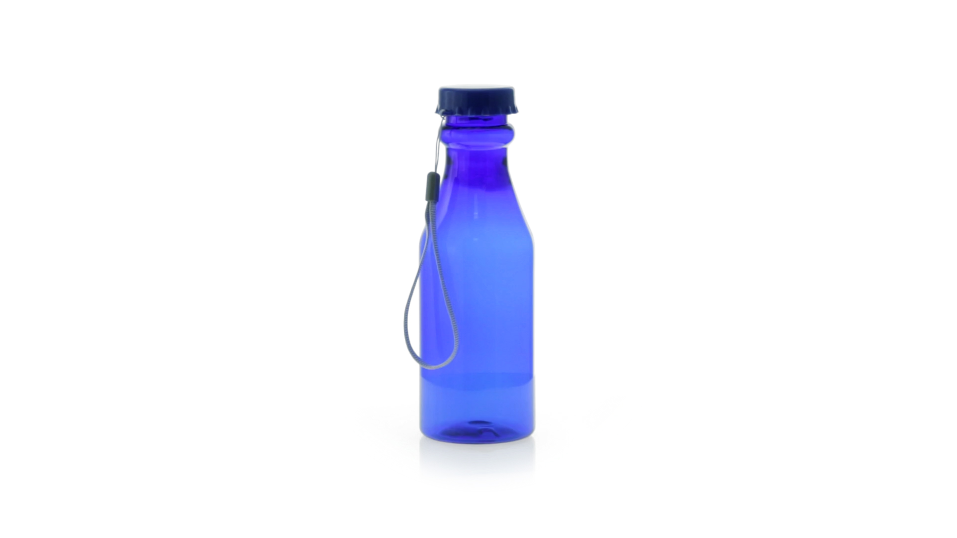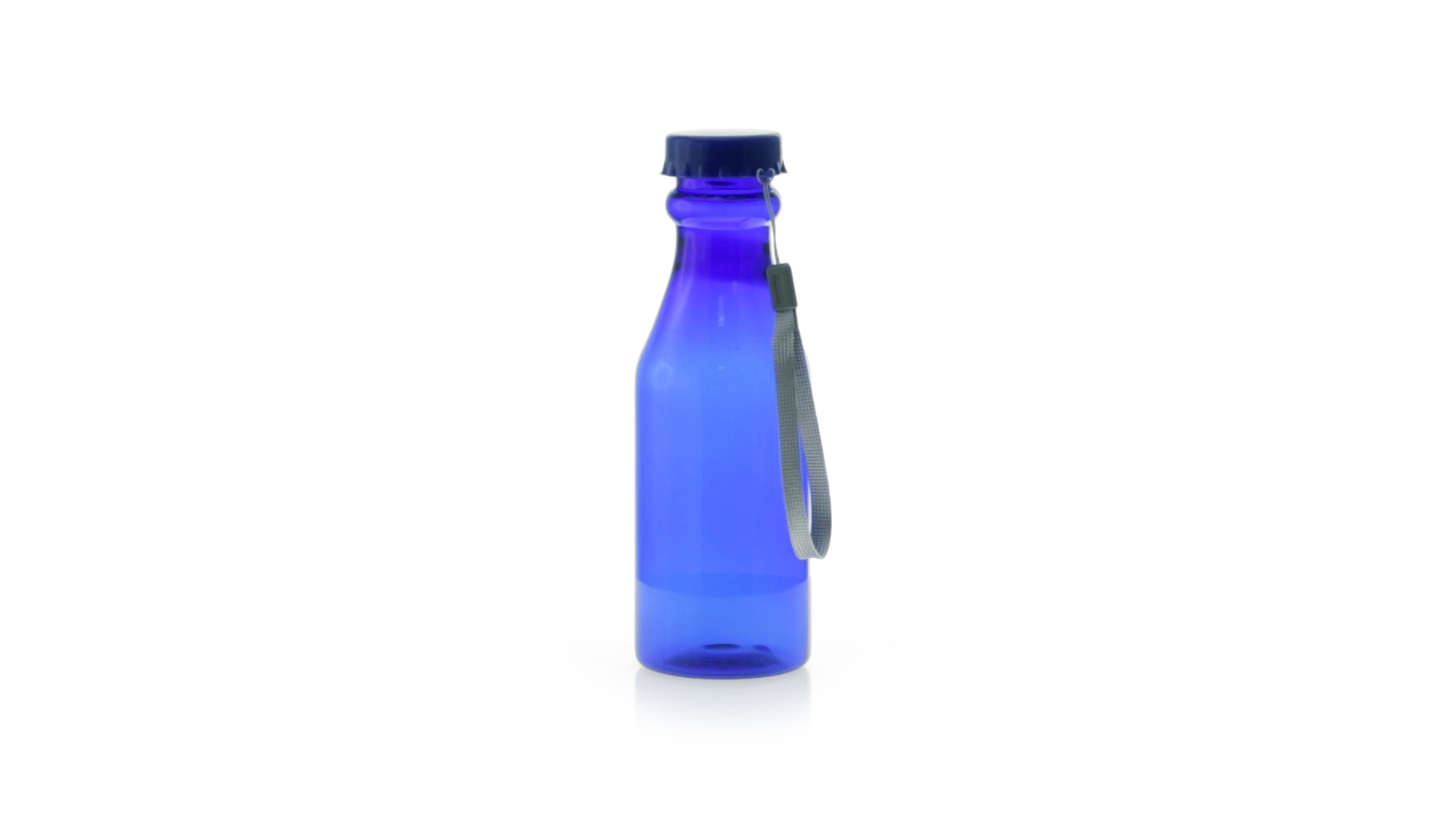 Trinkflasche mit 500 ml Fassungsvermögen und transparentem Körper aus AS-Material mit originellem Deckel in Kronkorken-Form. Mit Schraubverschluss und Trageschlaufe.