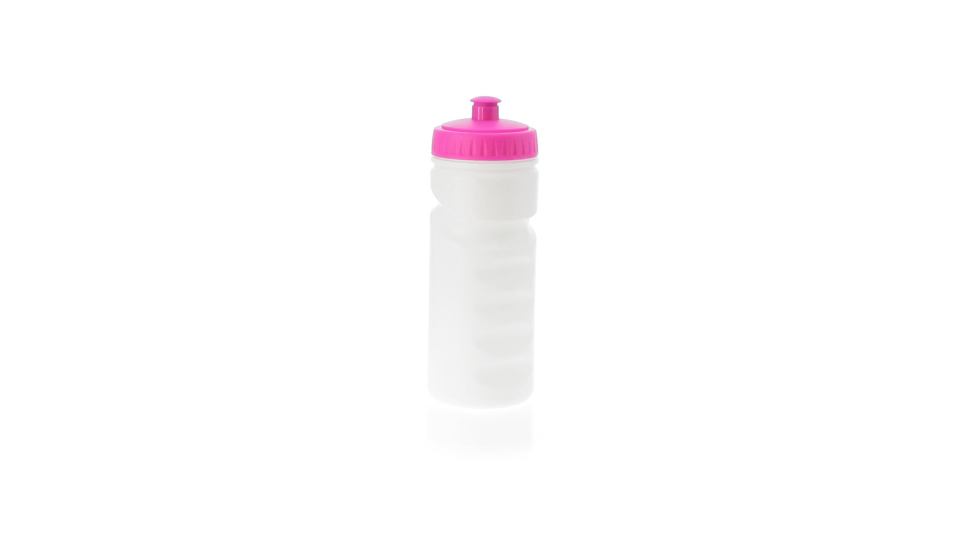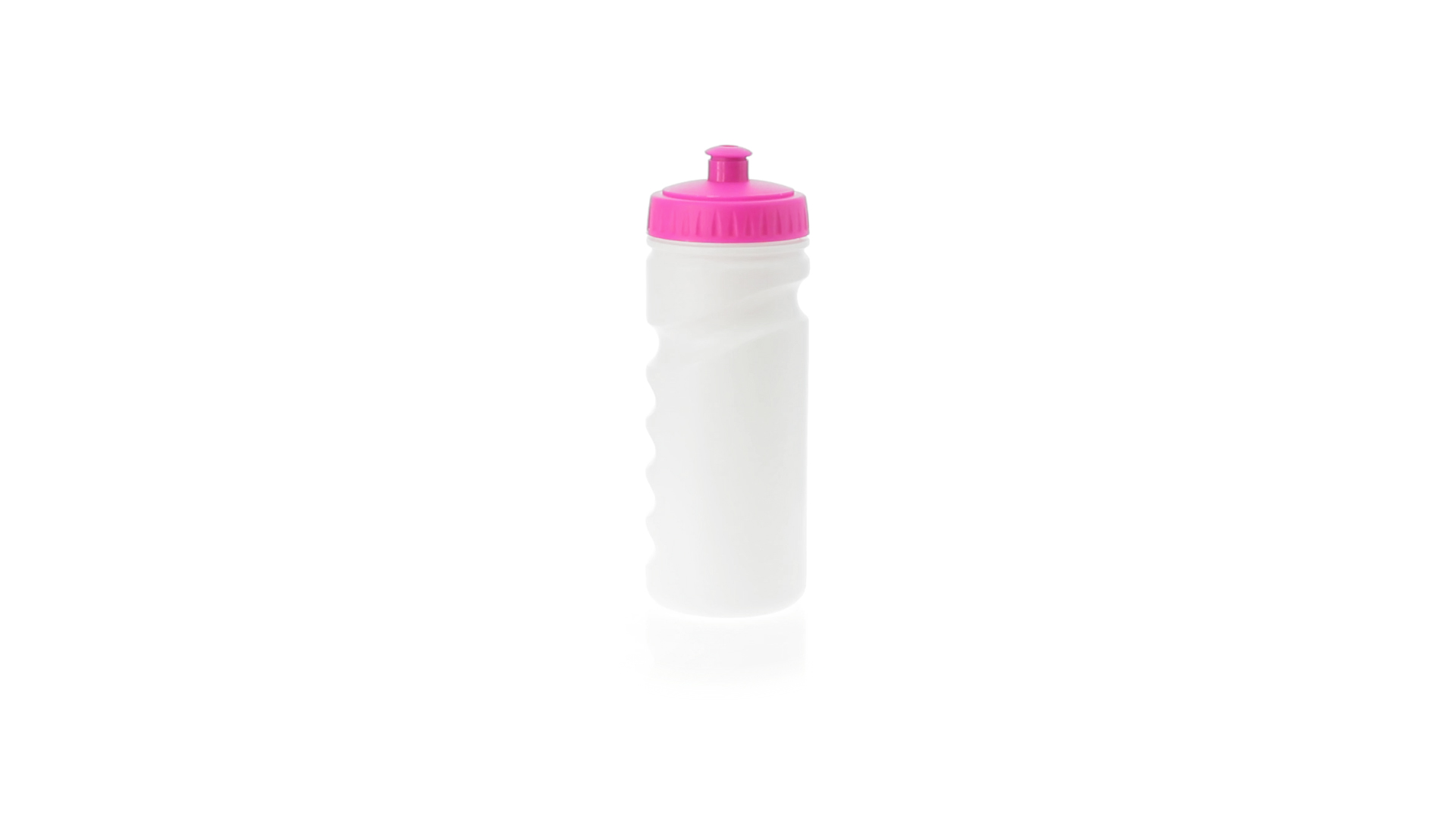 Trinkflasche mit 500 ml Fassungsvermögen und ergonomischem Gehäuse aus weissem PE-Kunststoff. Mit Schraubverschluss in lebendigen Farben und Sicherheitsspender.