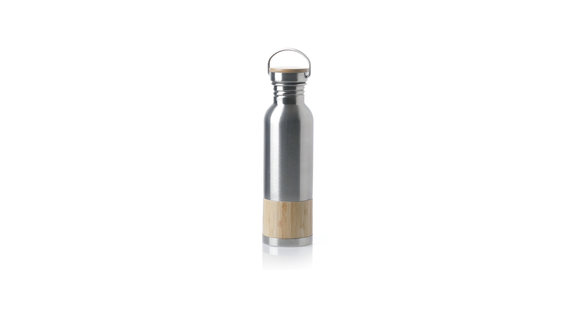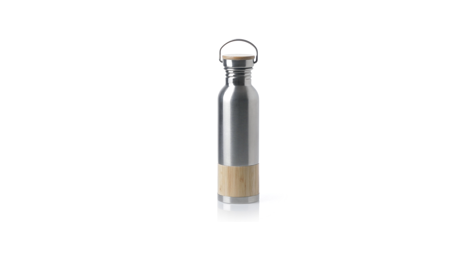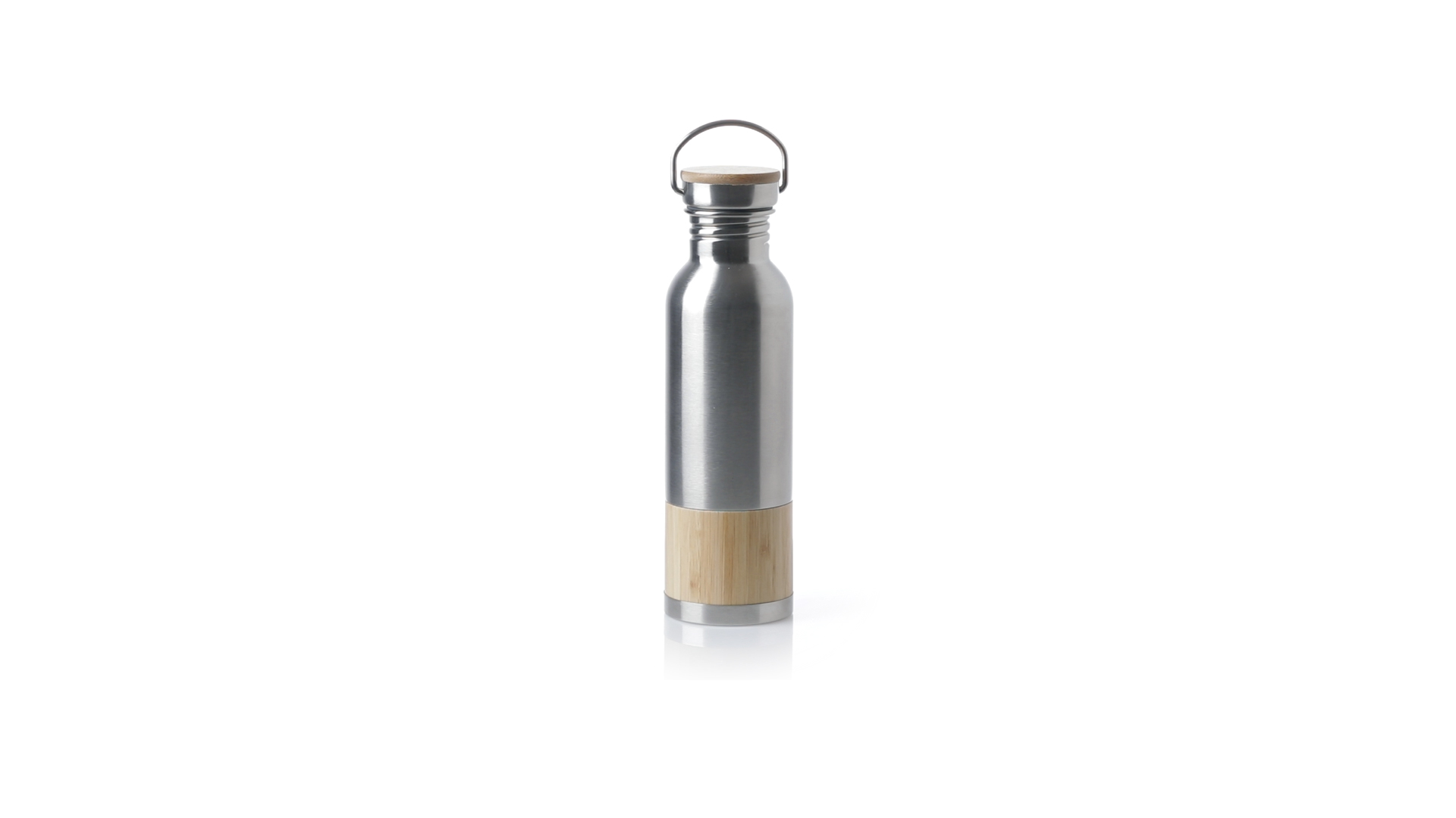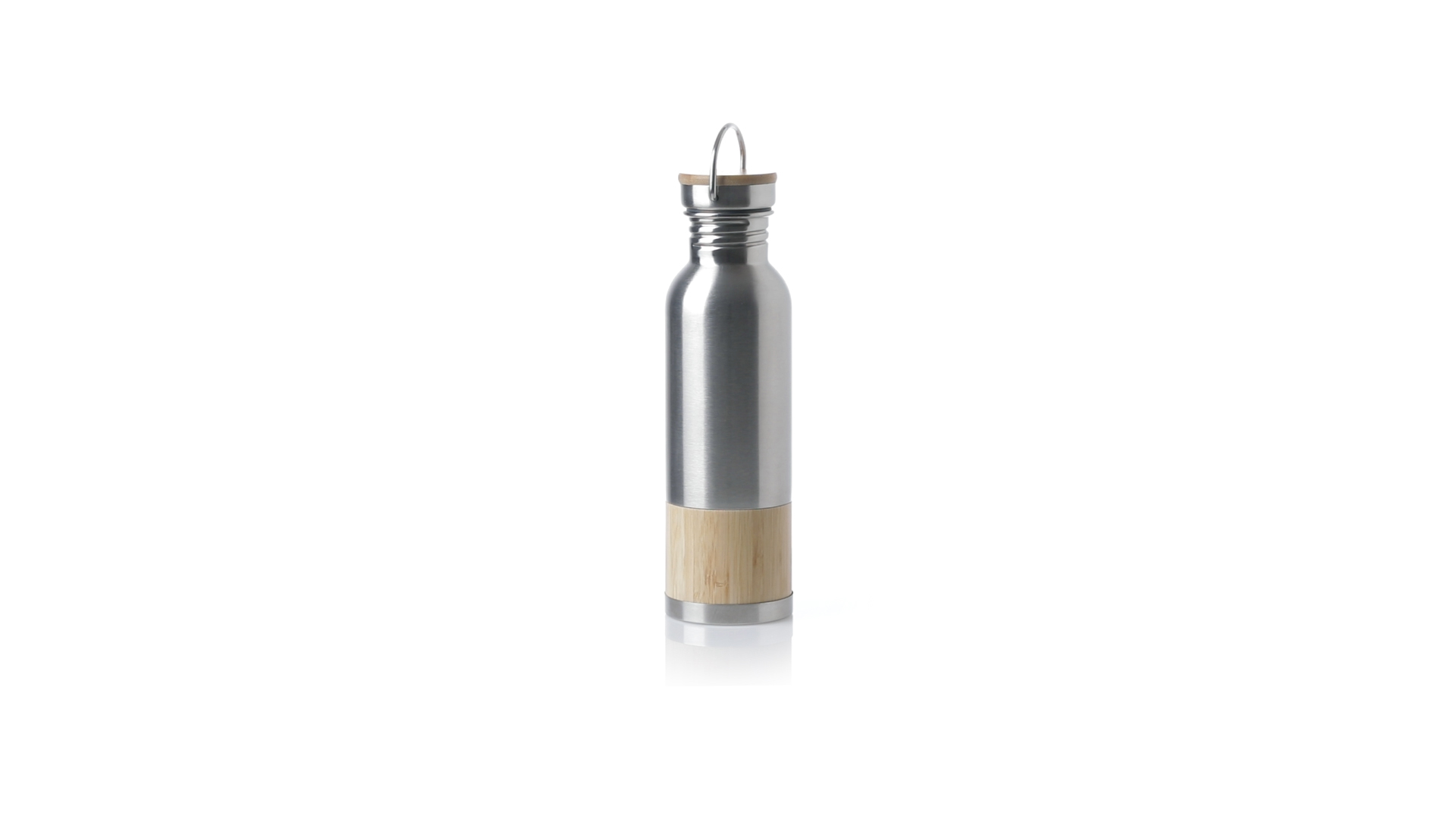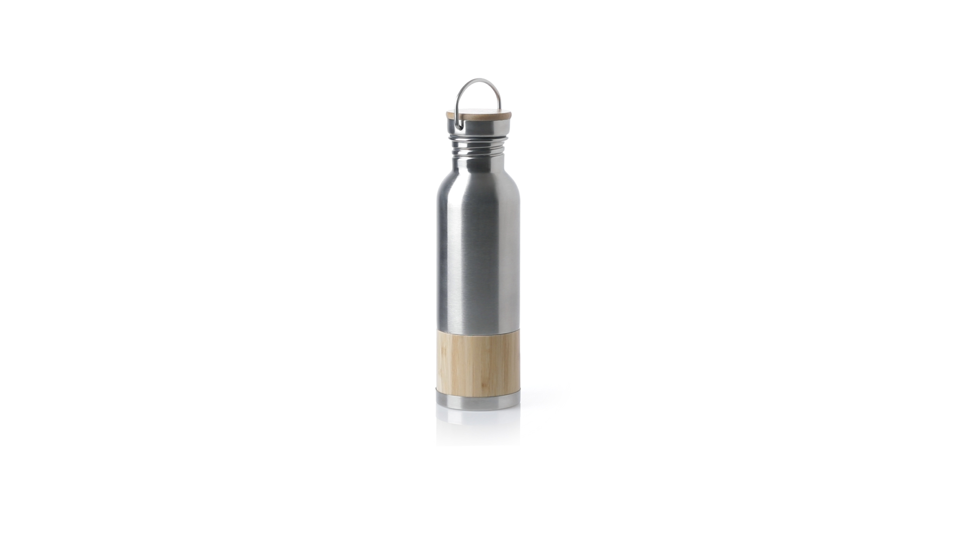 Flasche mit originellem Retro-Stil und 800 ml Fassungsvermögen. Gehäuse aus Edelstahl mit Bambusband, Schraubdeckel aus Edelstahl und Bambus-Detail. Präsentiert in einer individuellen Box von Öko-Design in Kraftkarton.