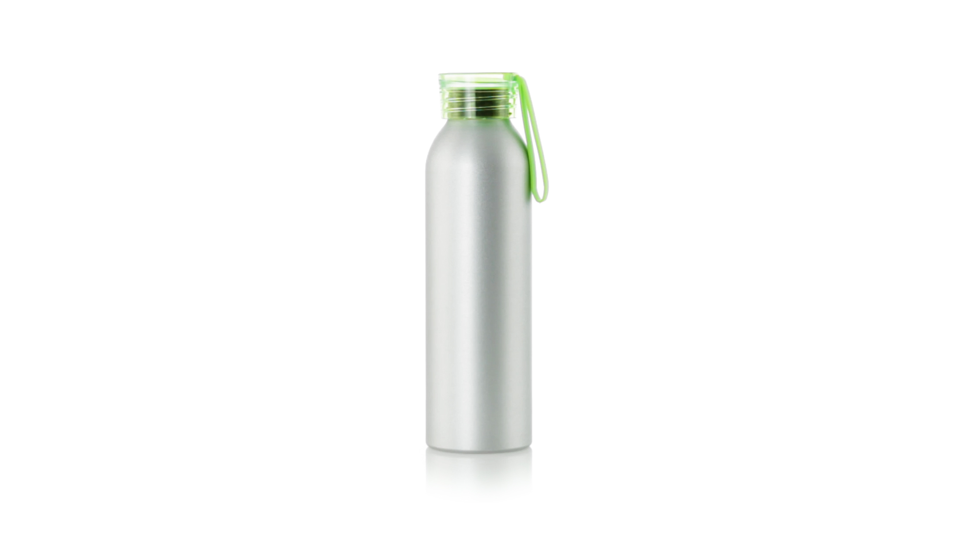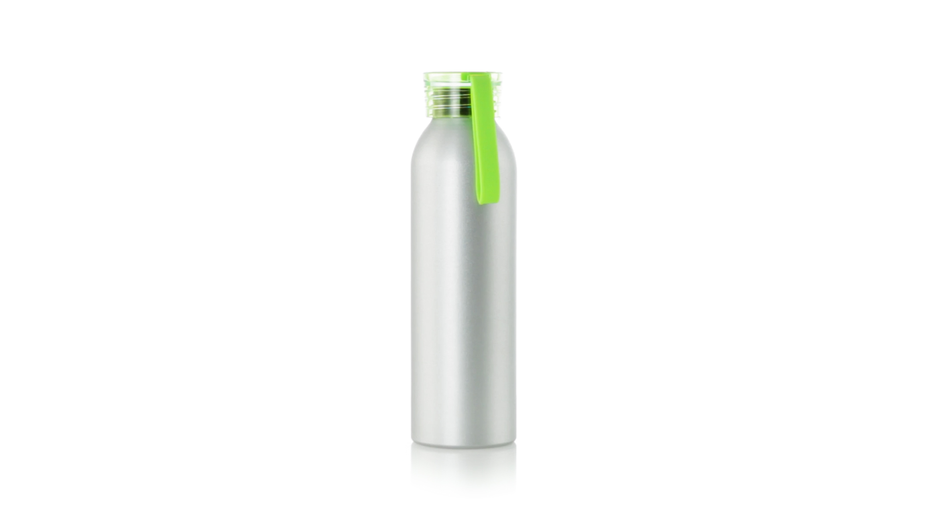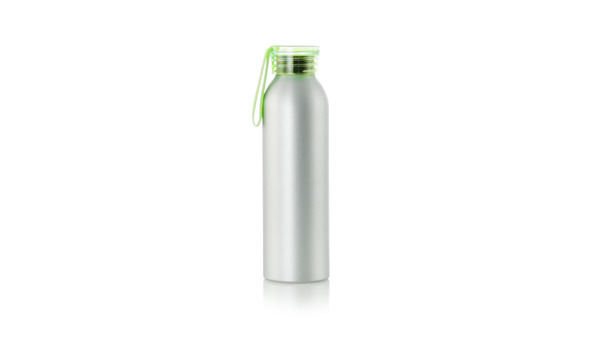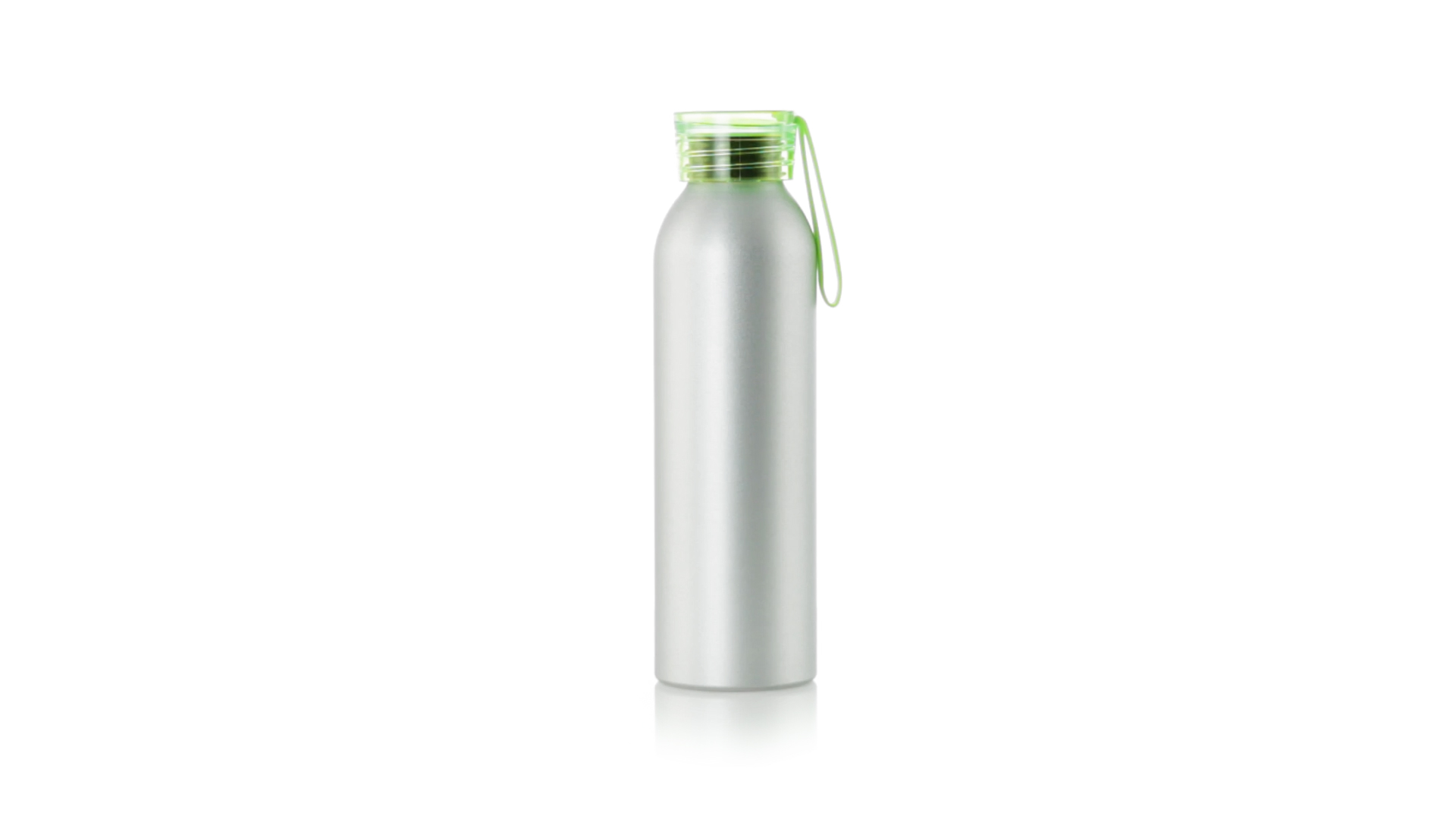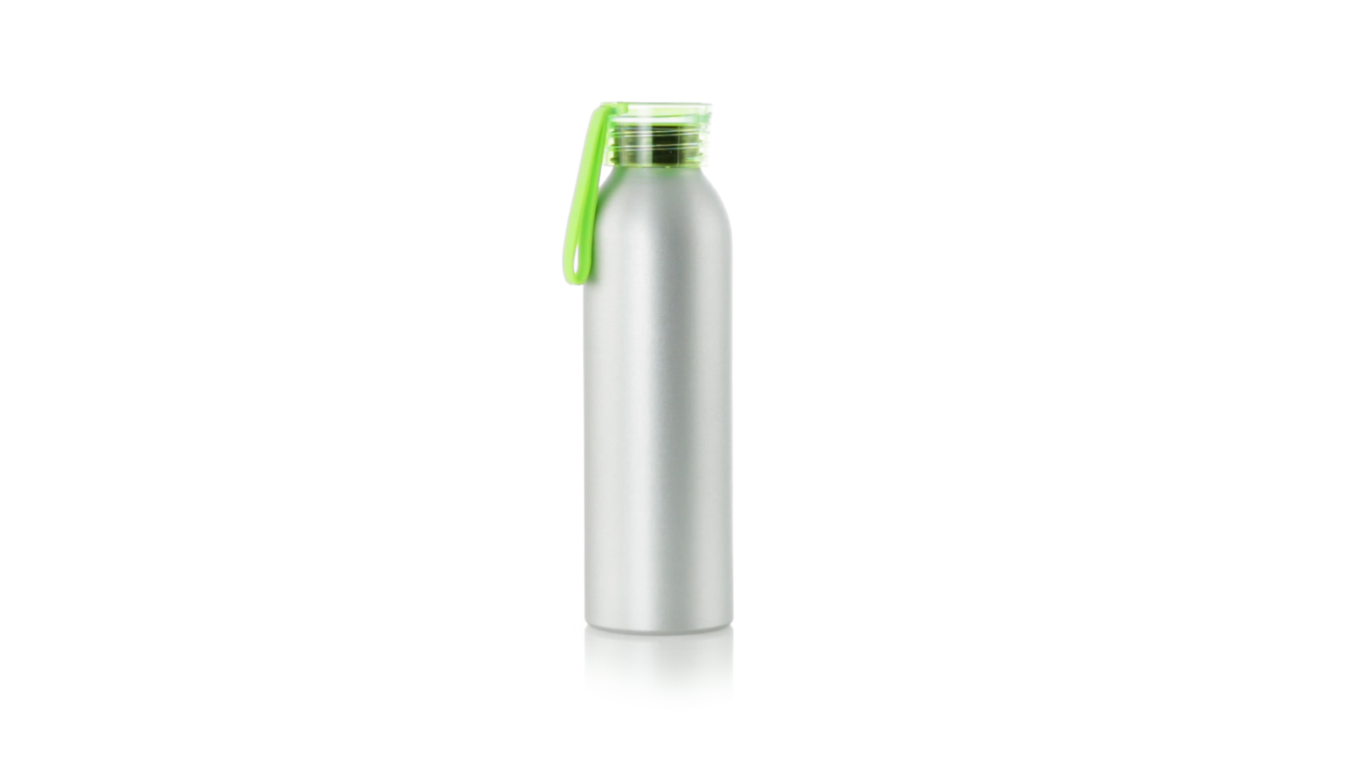 Trinkflasche aus Aluminium mit einem Fassungsvermögen von 650 ml. Silberfarbener Korpus, mit aufschraubbarem Sicherheitsdeckel in verschiedenen transparenten Farben. Passender Trageriemen aus TPR-Material.