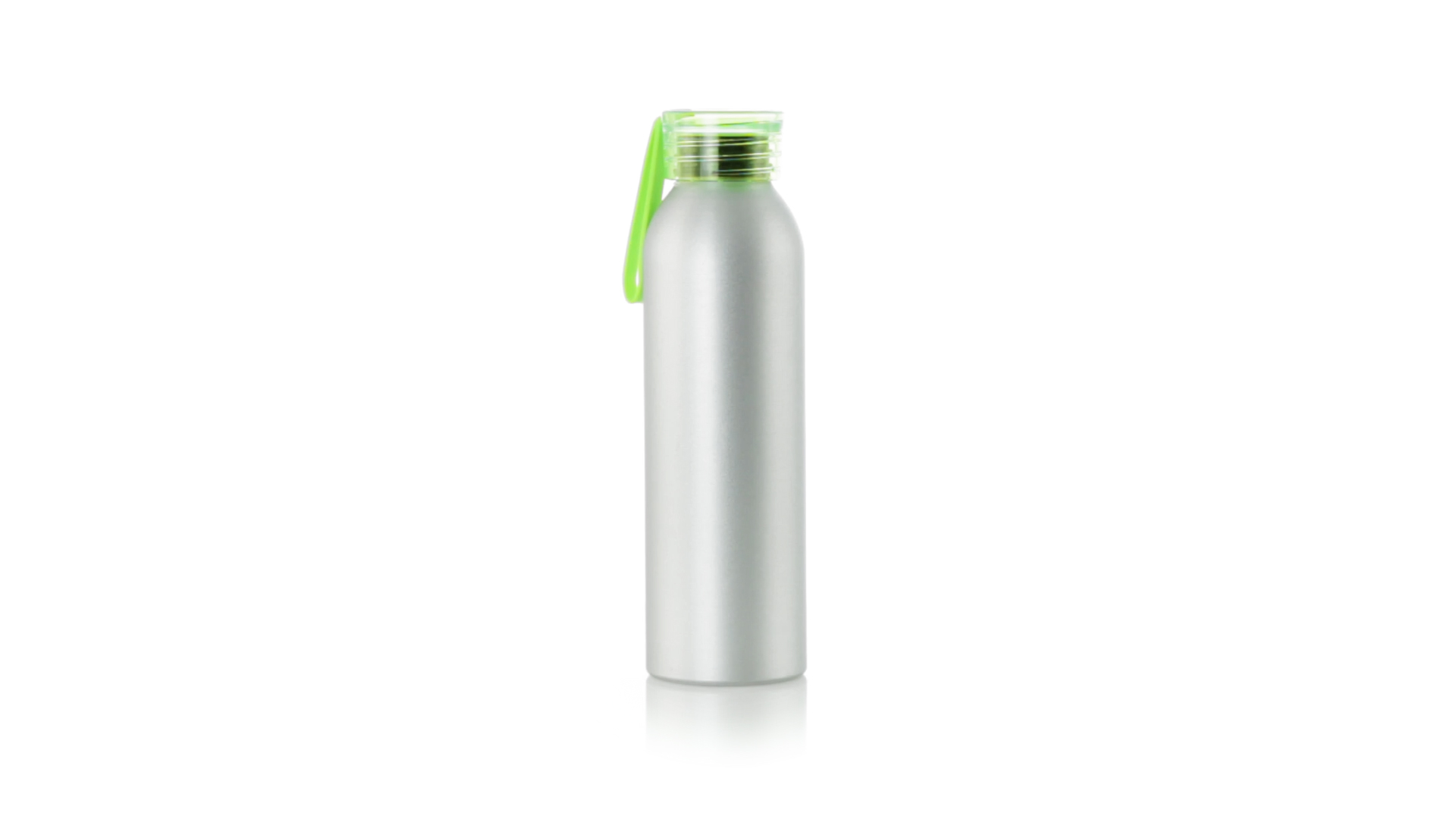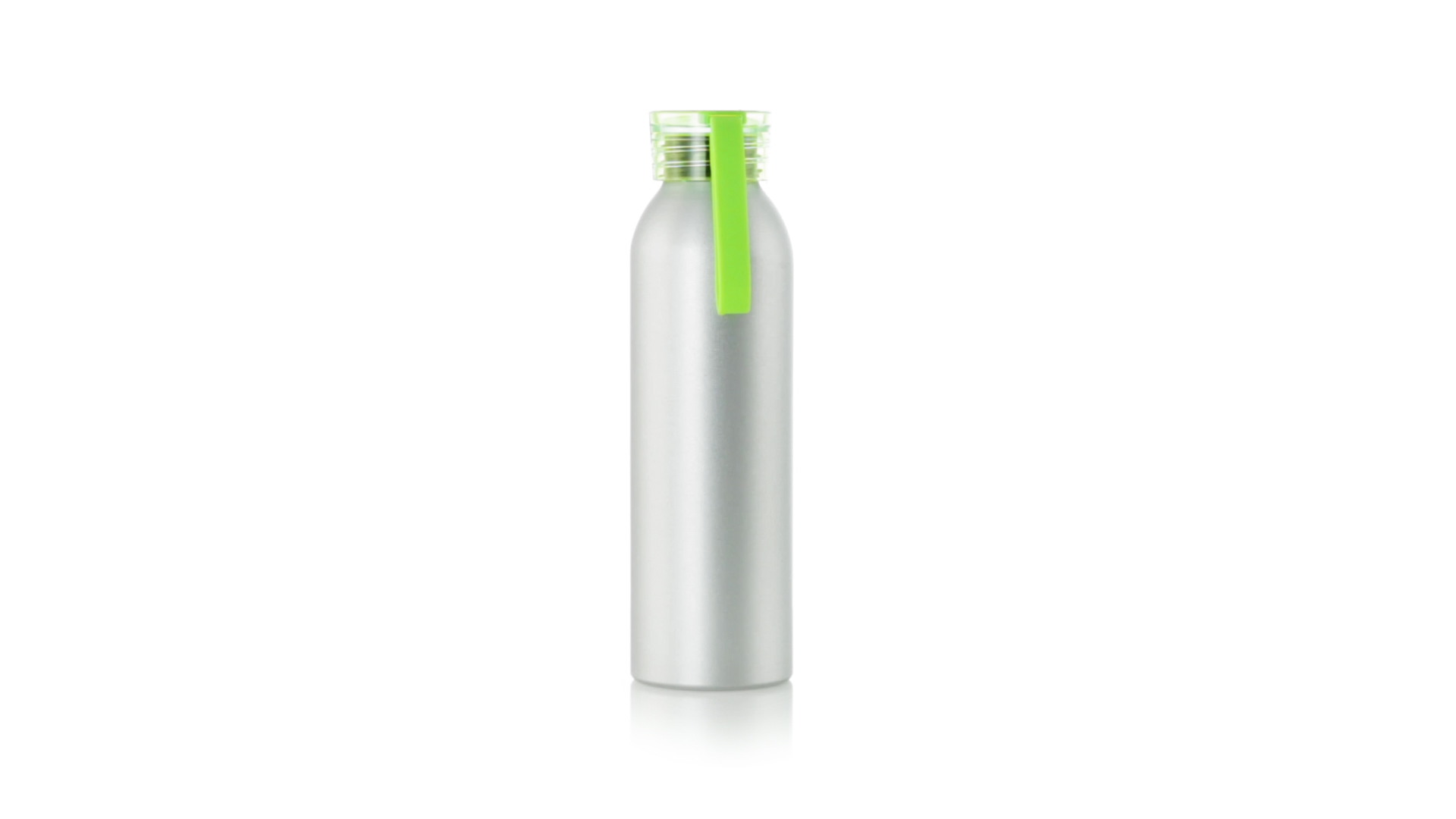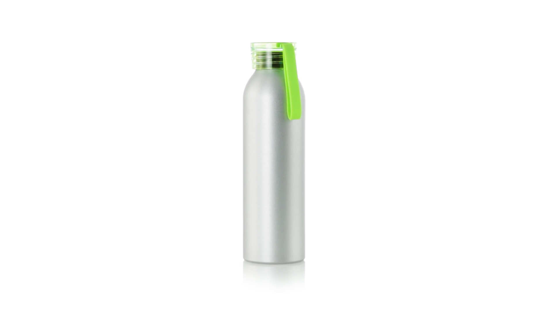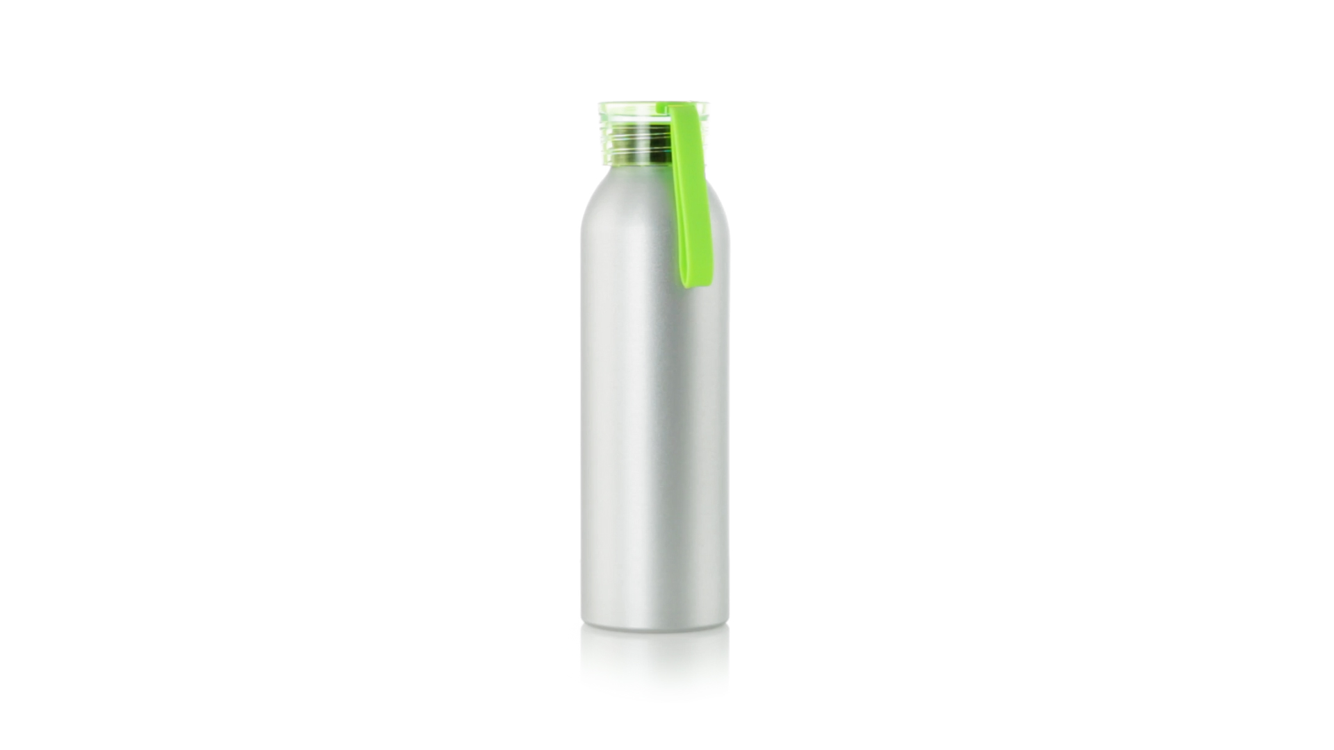 Trinkflasche aus Aluminium mit einem Fassungsvermögen von 650 ml. Silberfarbener Korpus, mit aufschraubbarem Sicherheitsdeckel in verschiedenen transparenten Farben. Passender Trageriemen aus TPR-Material.