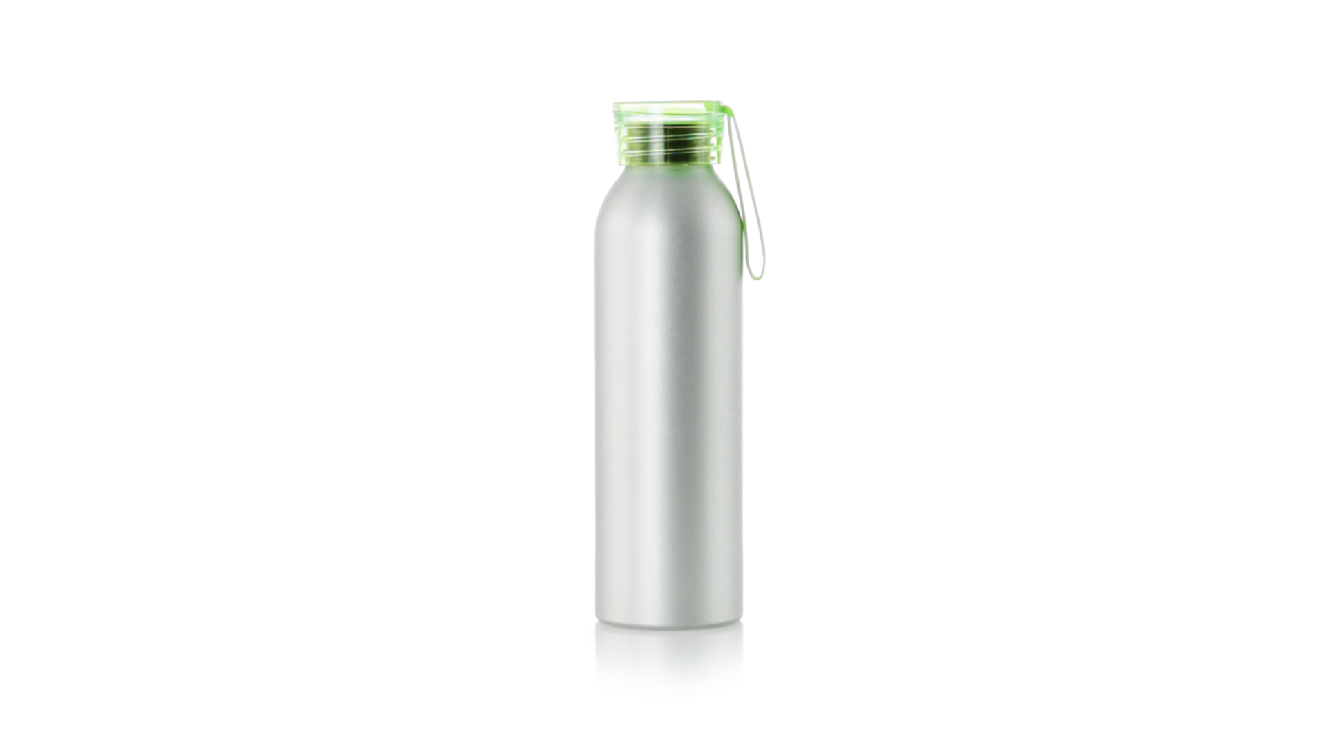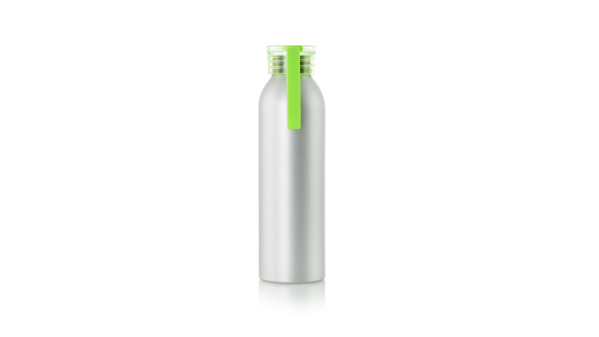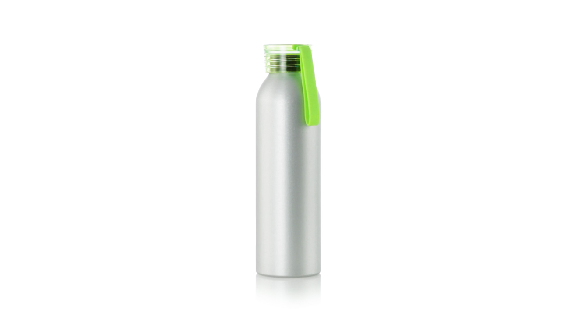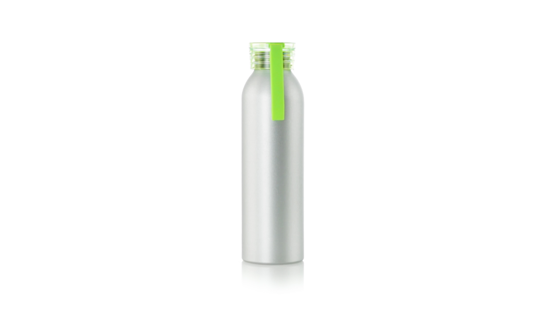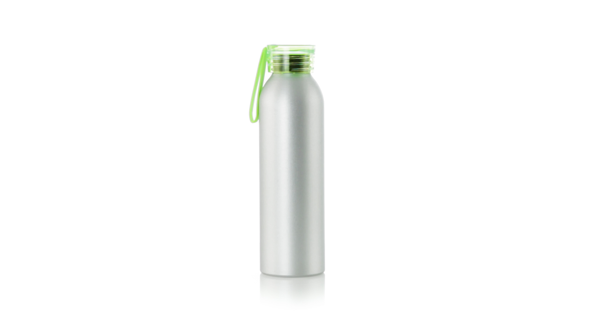 Trinkflasche aus Aluminium mit einem Fassungsvermögen von 650 ml. Silberfarbener Korpus, mit aufschraubbarem Sicherheitsdeckel in verschiedenen transparenten Farben. Passender Trageriemen aus TPR-Material.