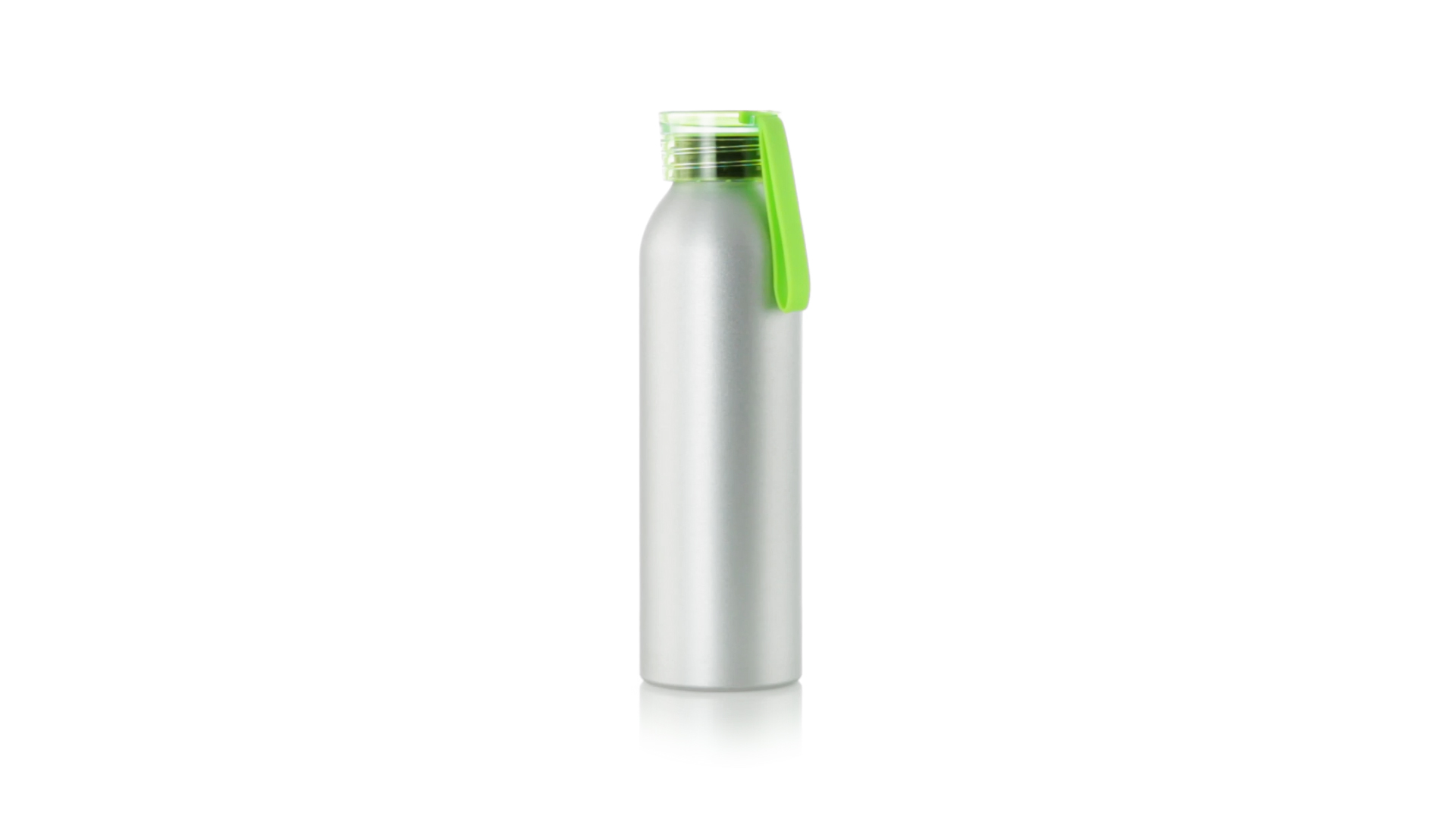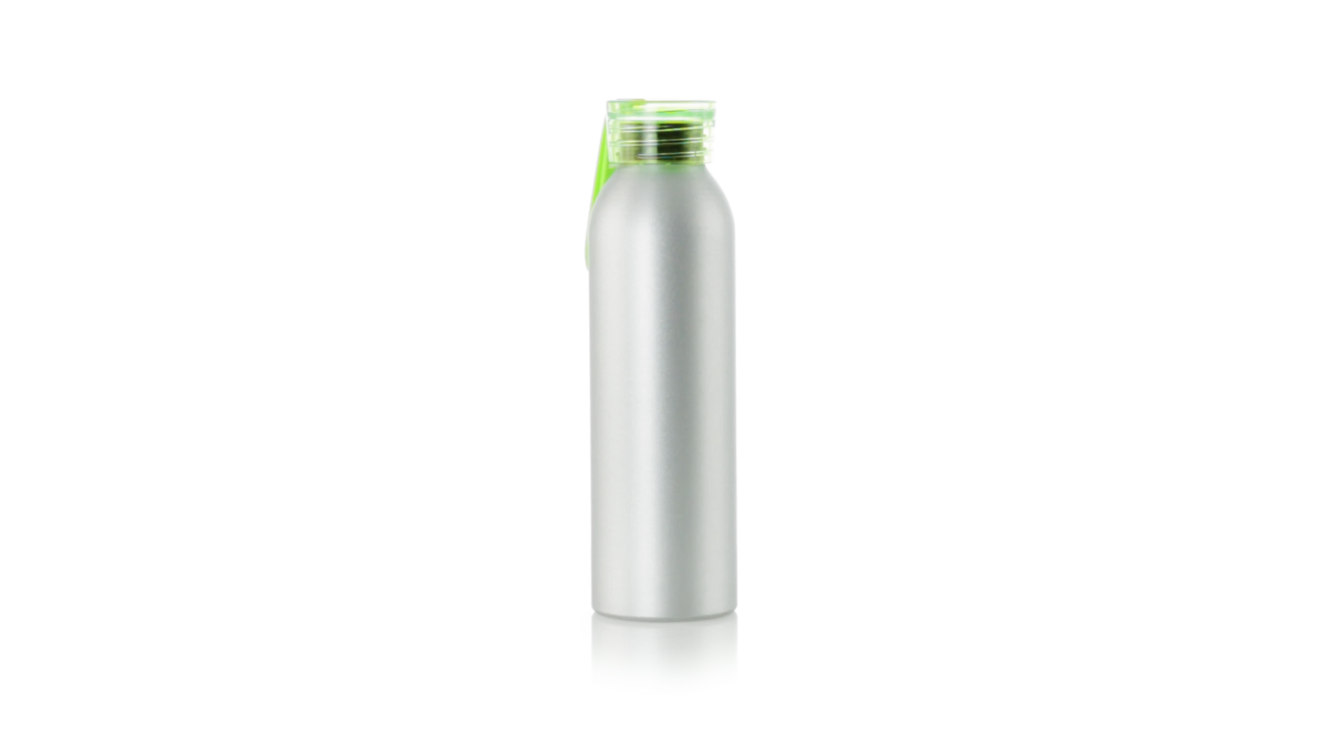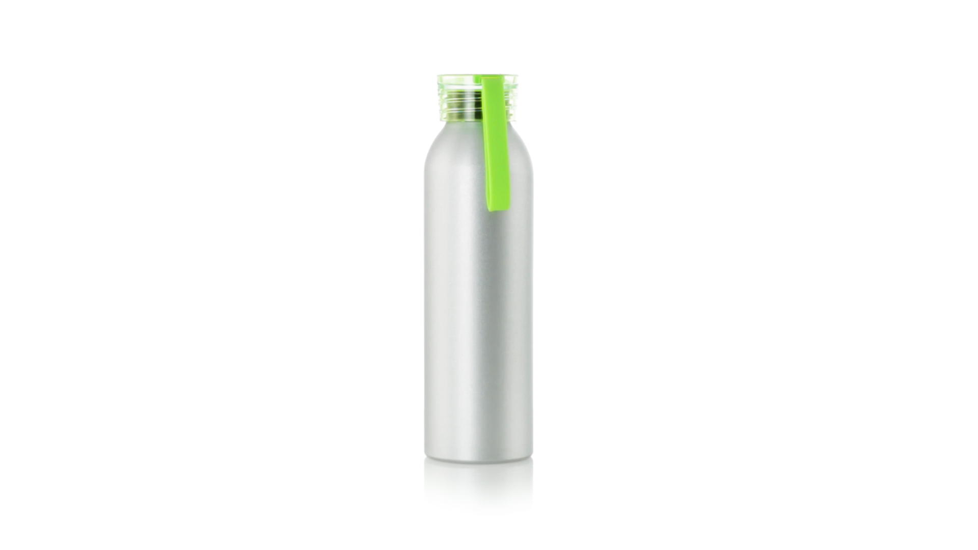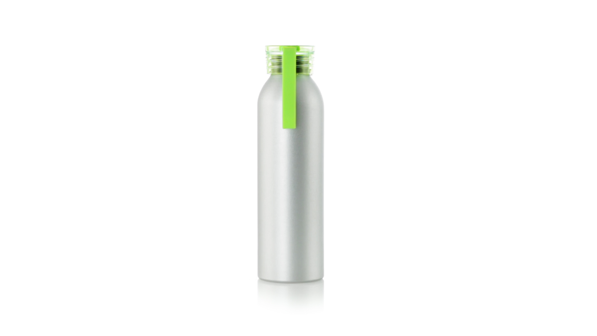 Trinkflasche aus Aluminium mit einem Fassungsvermögen von 650 ml. Silberfarbener Korpus, mit aufschraubbarem Sicherheitsdeckel in verschiedenen transparenten Farben. Passender Trageriemen aus TPR-Material.