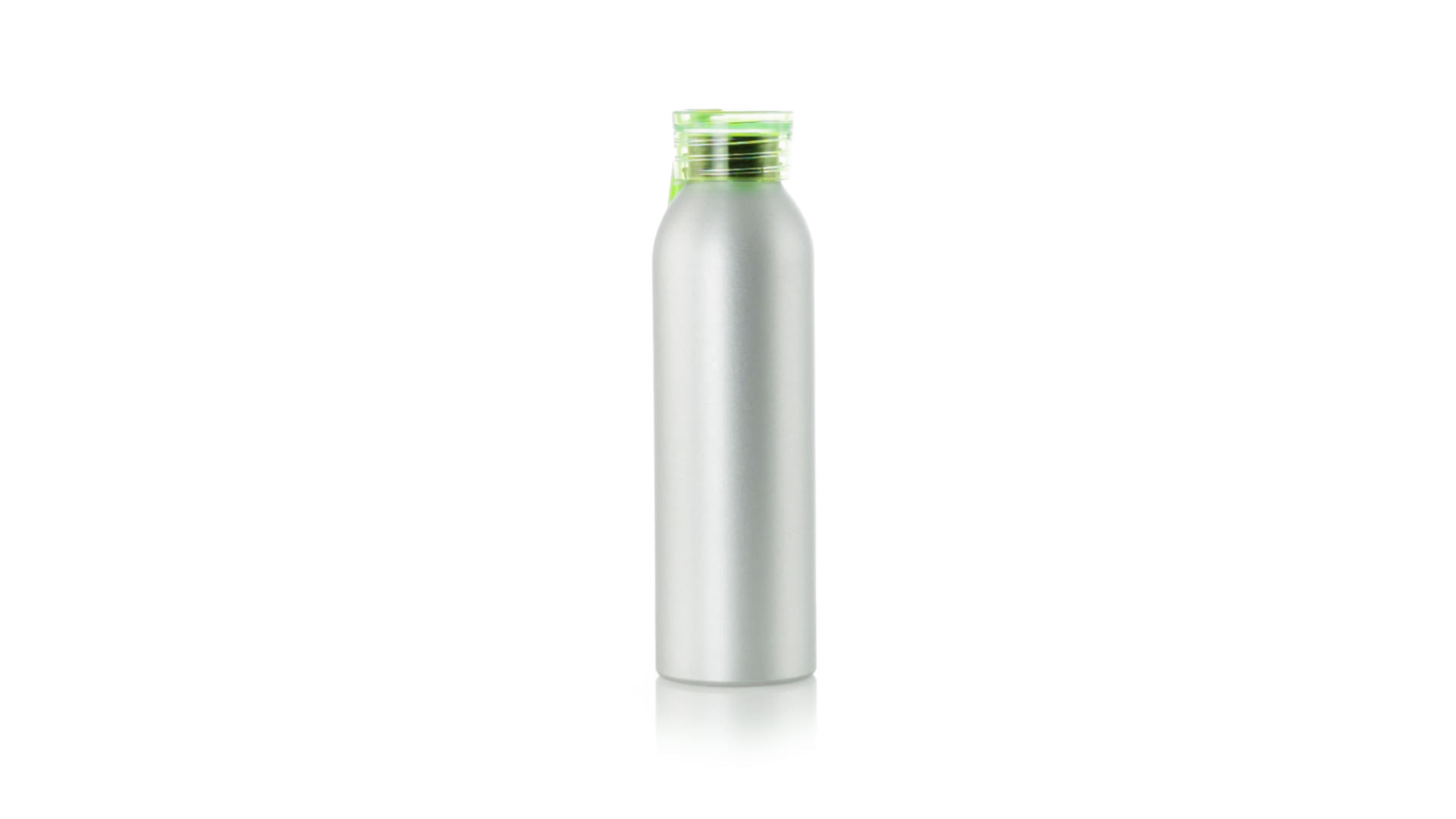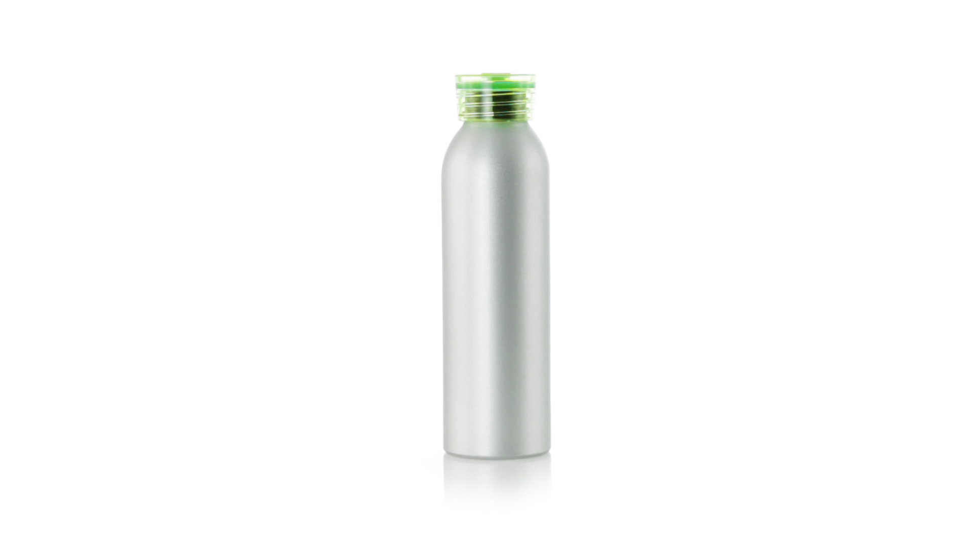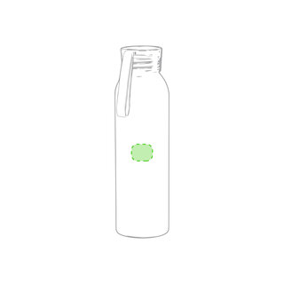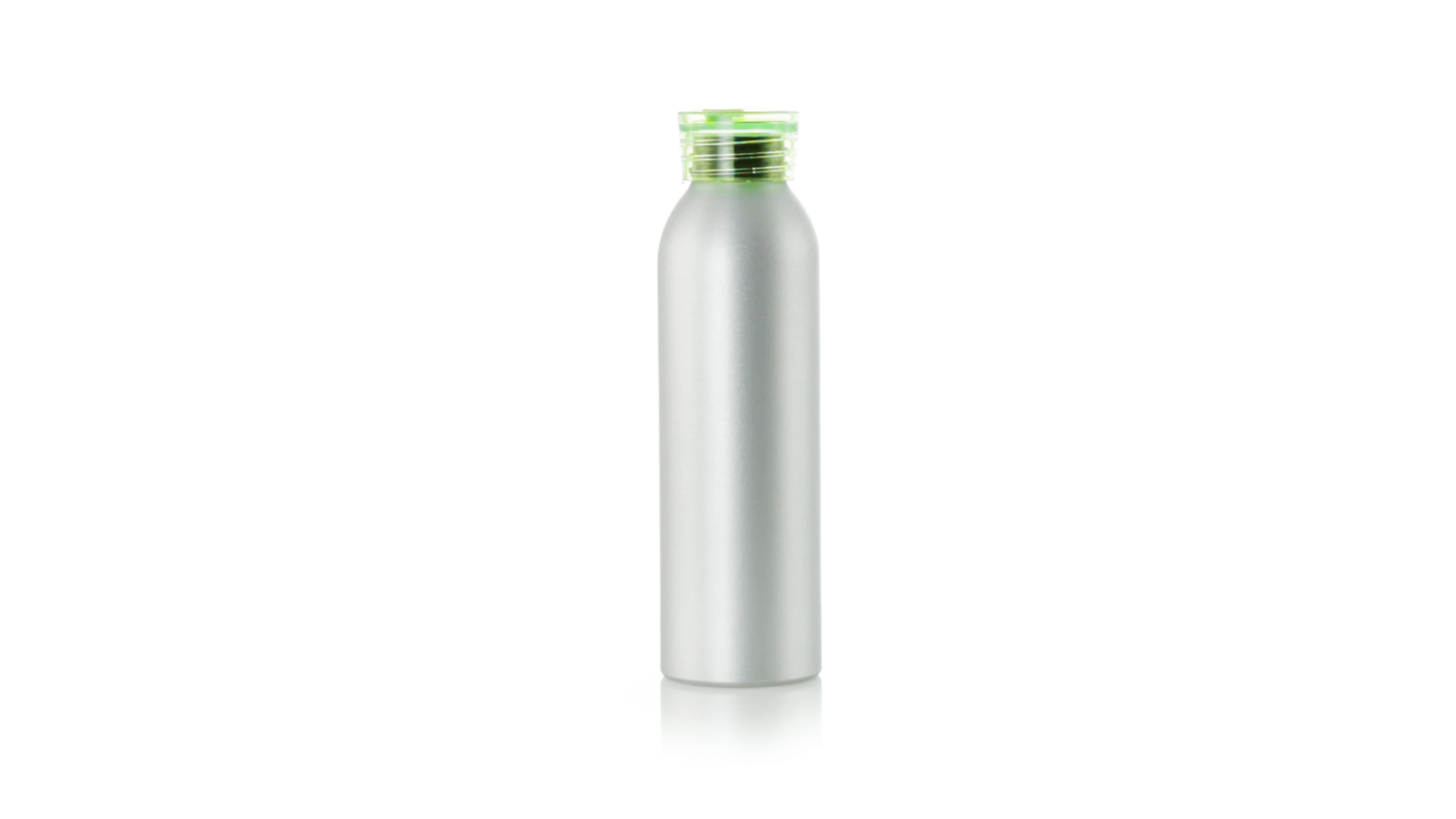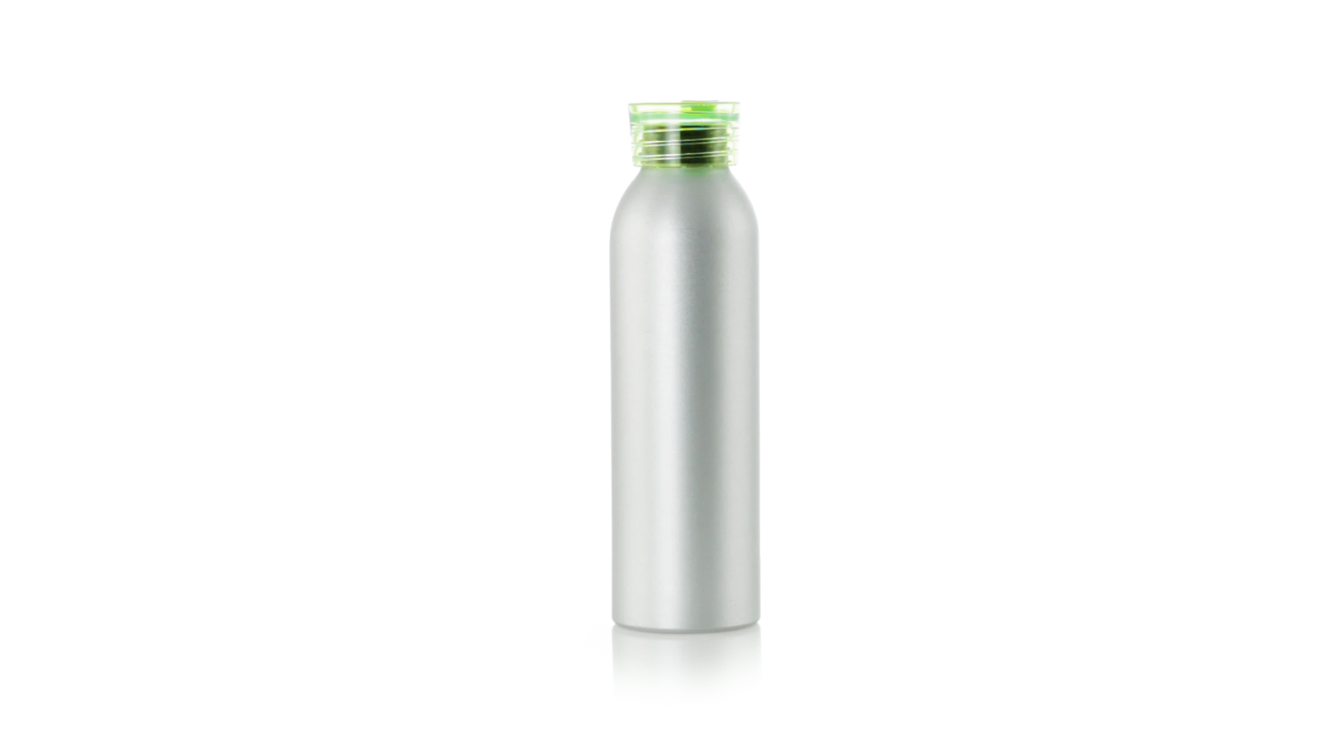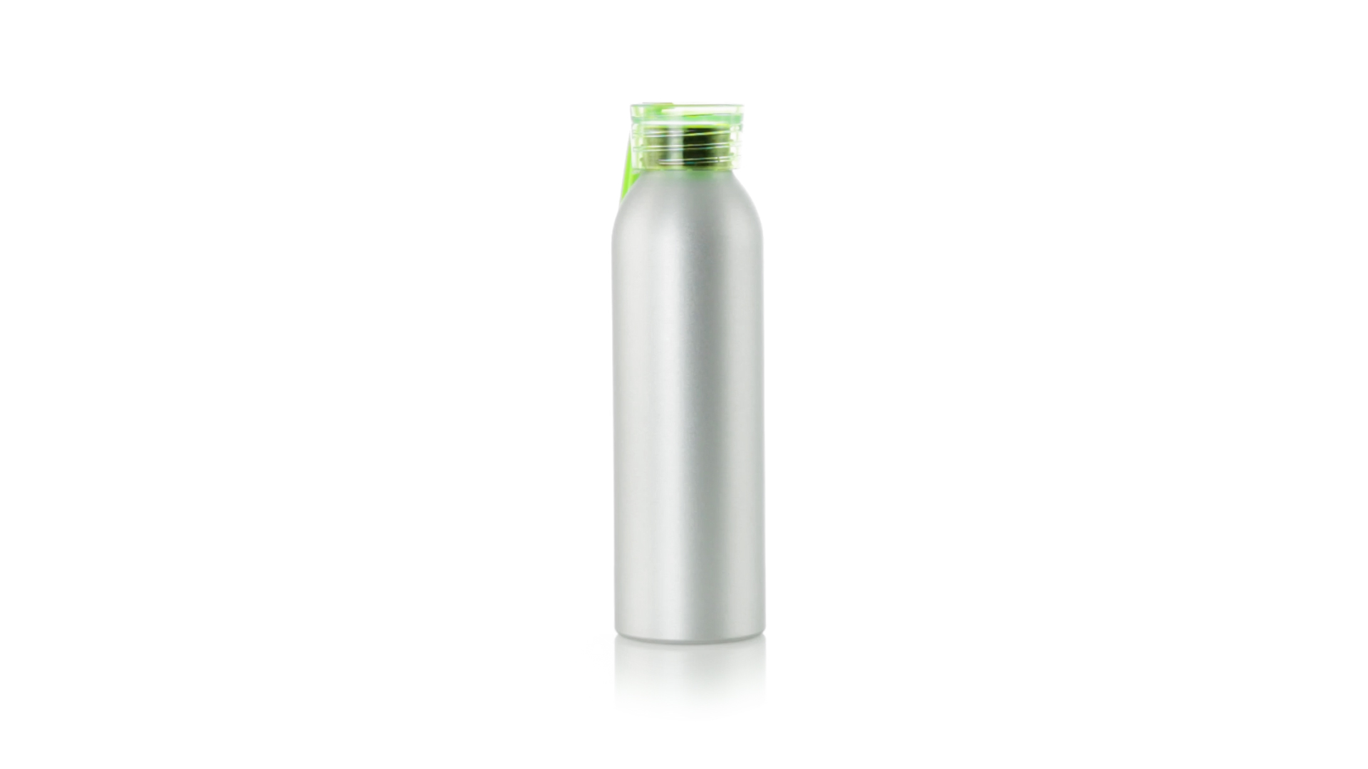 Trinkflasche aus Aluminium mit einem Fassungsvermögen von 650 ml. Silberfarbener Korpus, mit aufschraubbarem Sicherheitsdeckel in verschiedenen transparenten Farben. Passender Trageriemen aus TPR-Material.