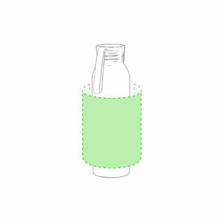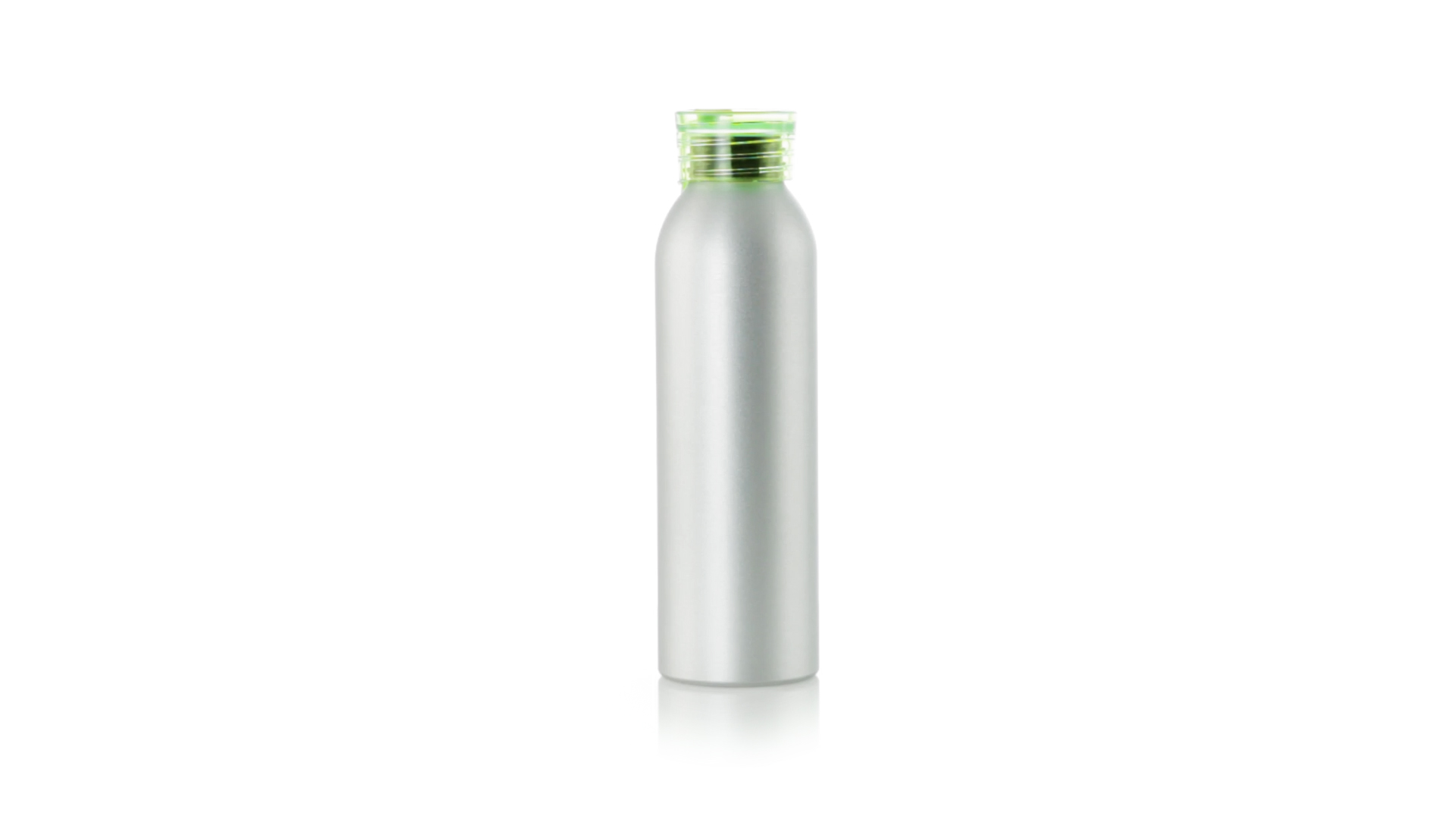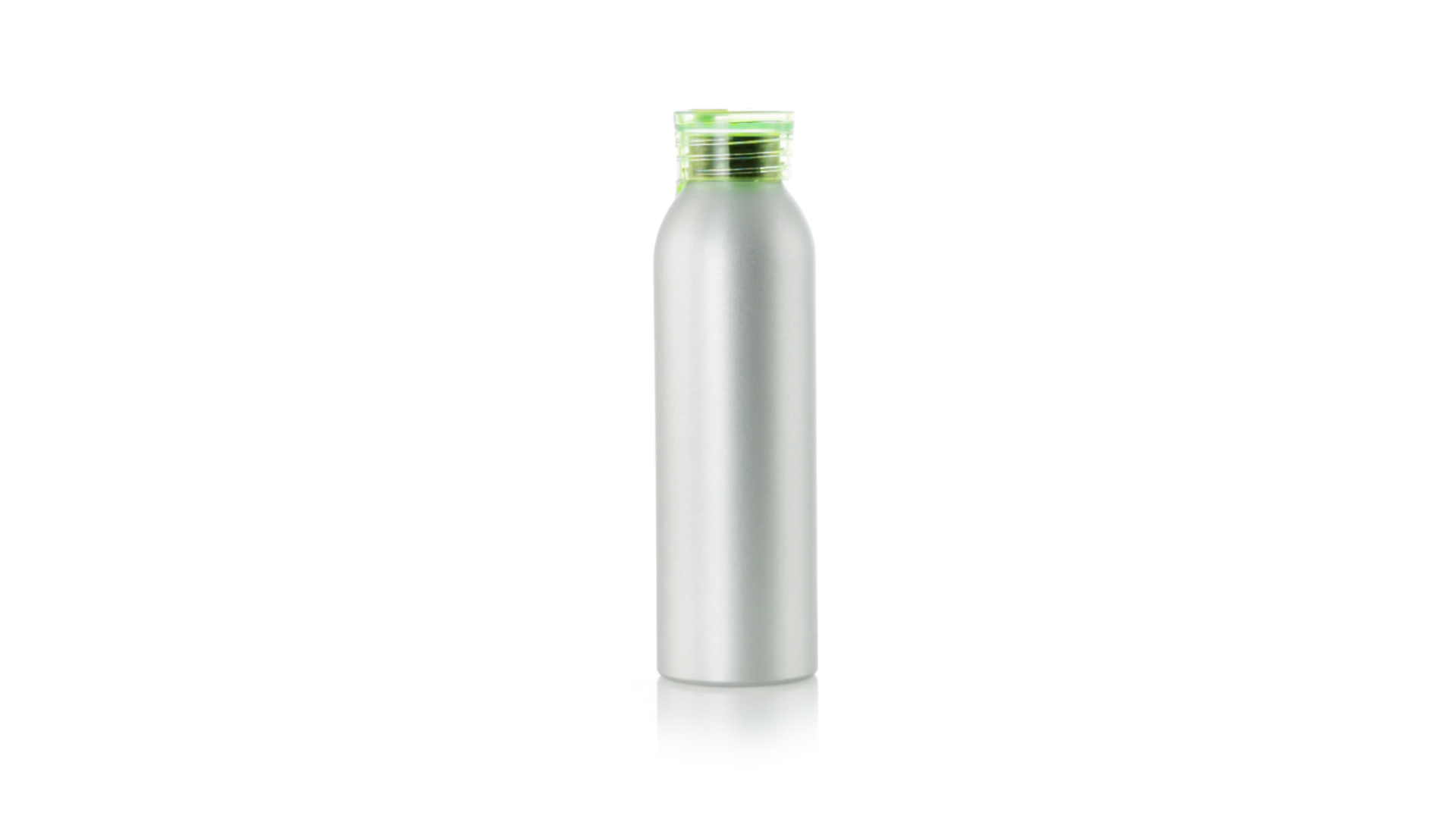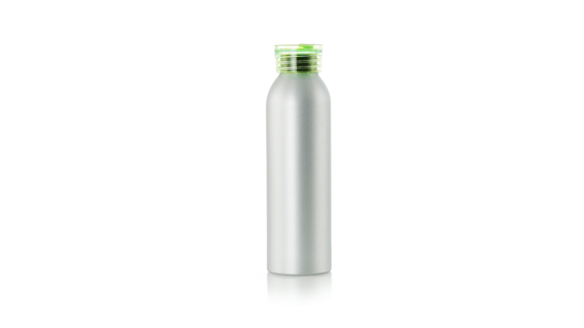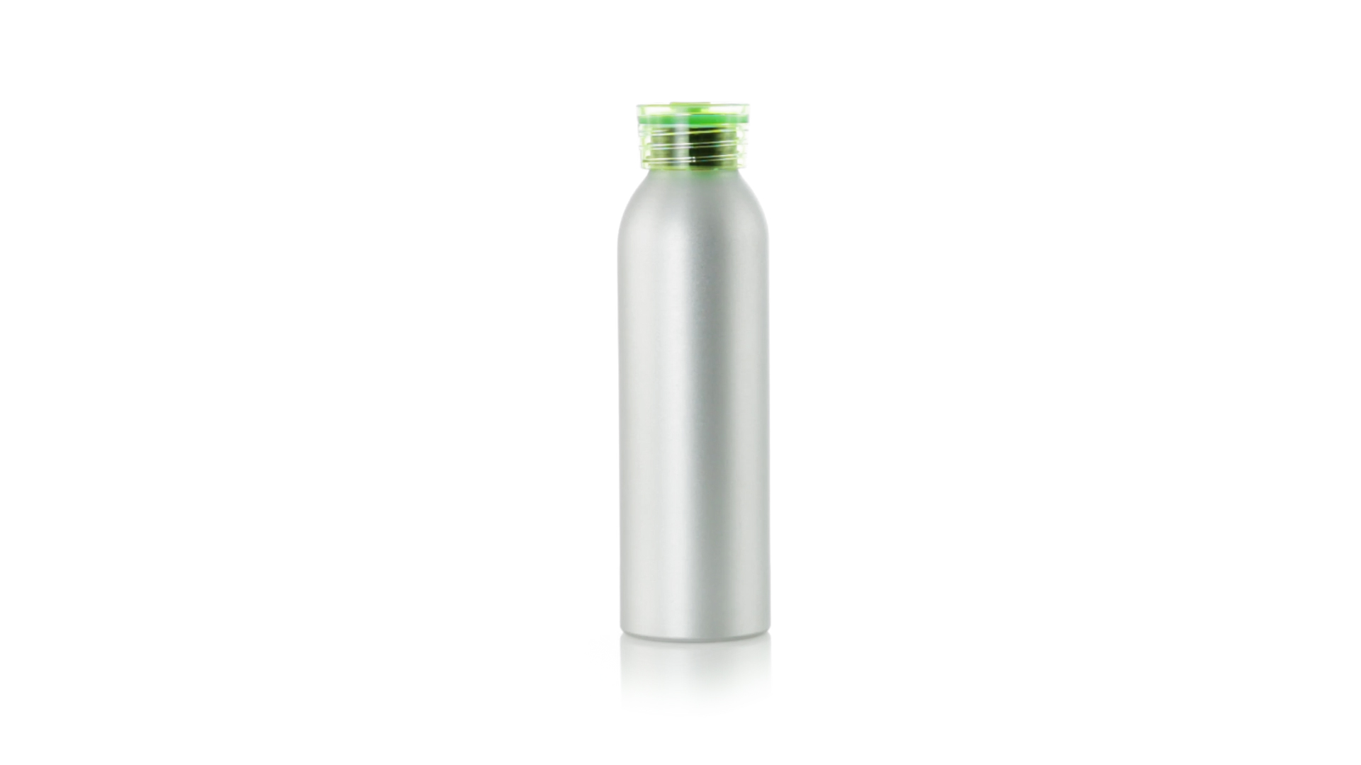 Trinkflasche aus Aluminium mit einem Fassungsvermögen von 650 ml. Silberfarbener Korpus, mit aufschraubbarem Sicherheitsdeckel in verschiedenen transparenten Farben. Passender Trageriemen aus TPR-Material.