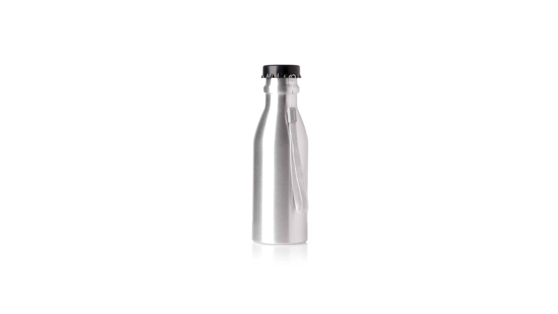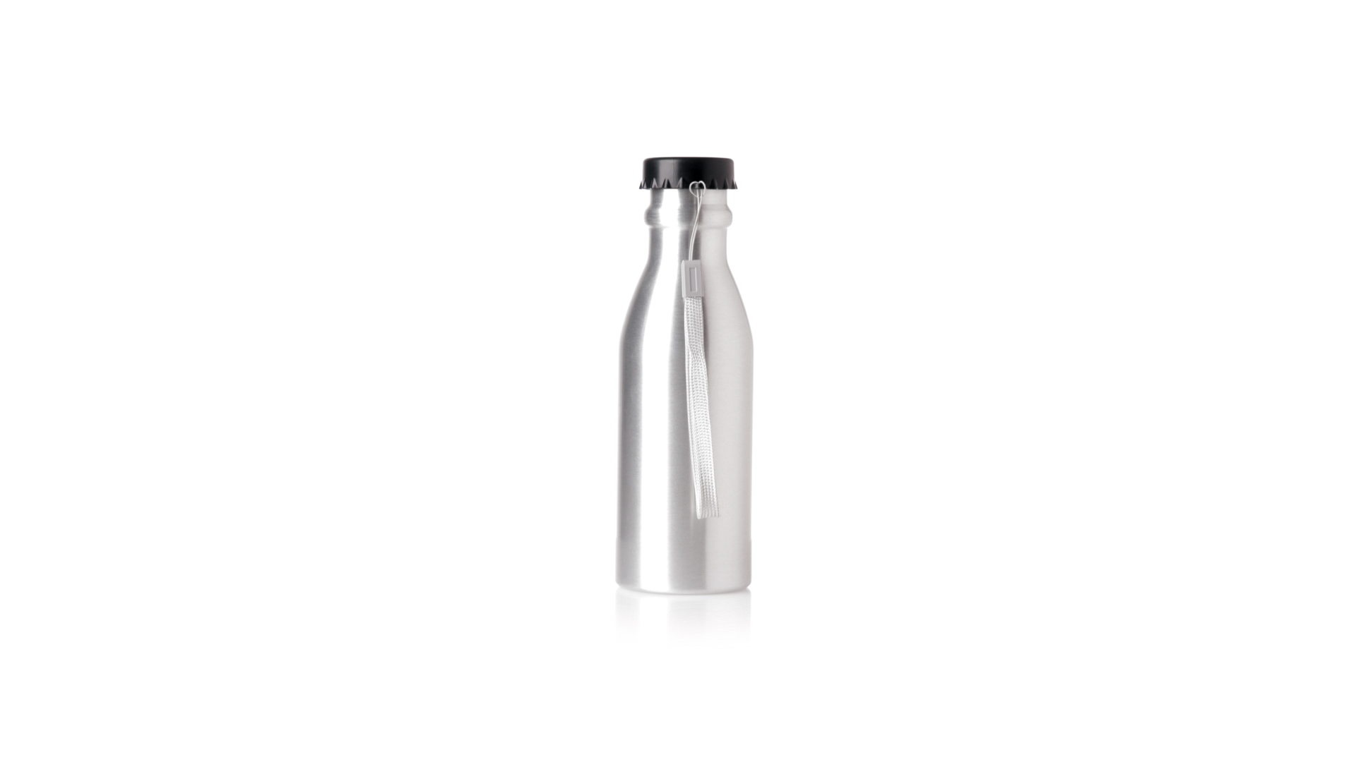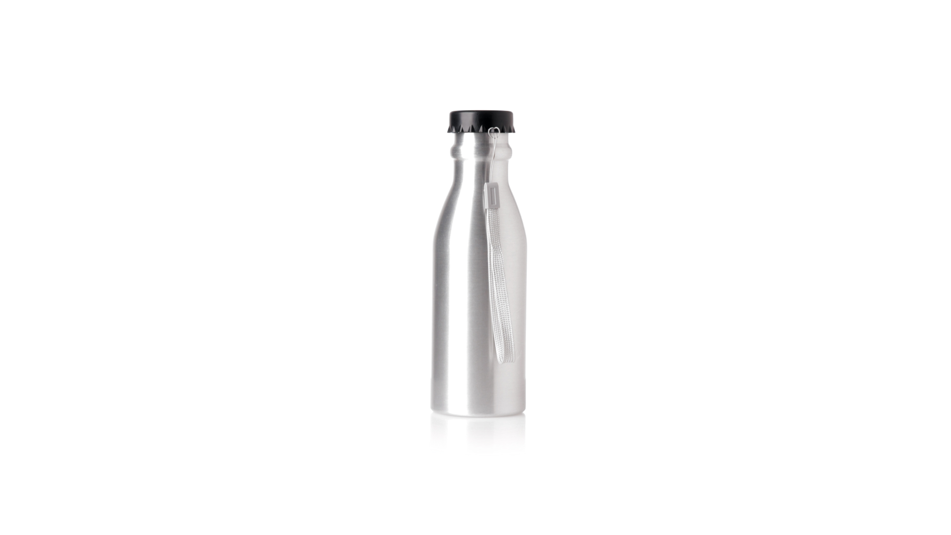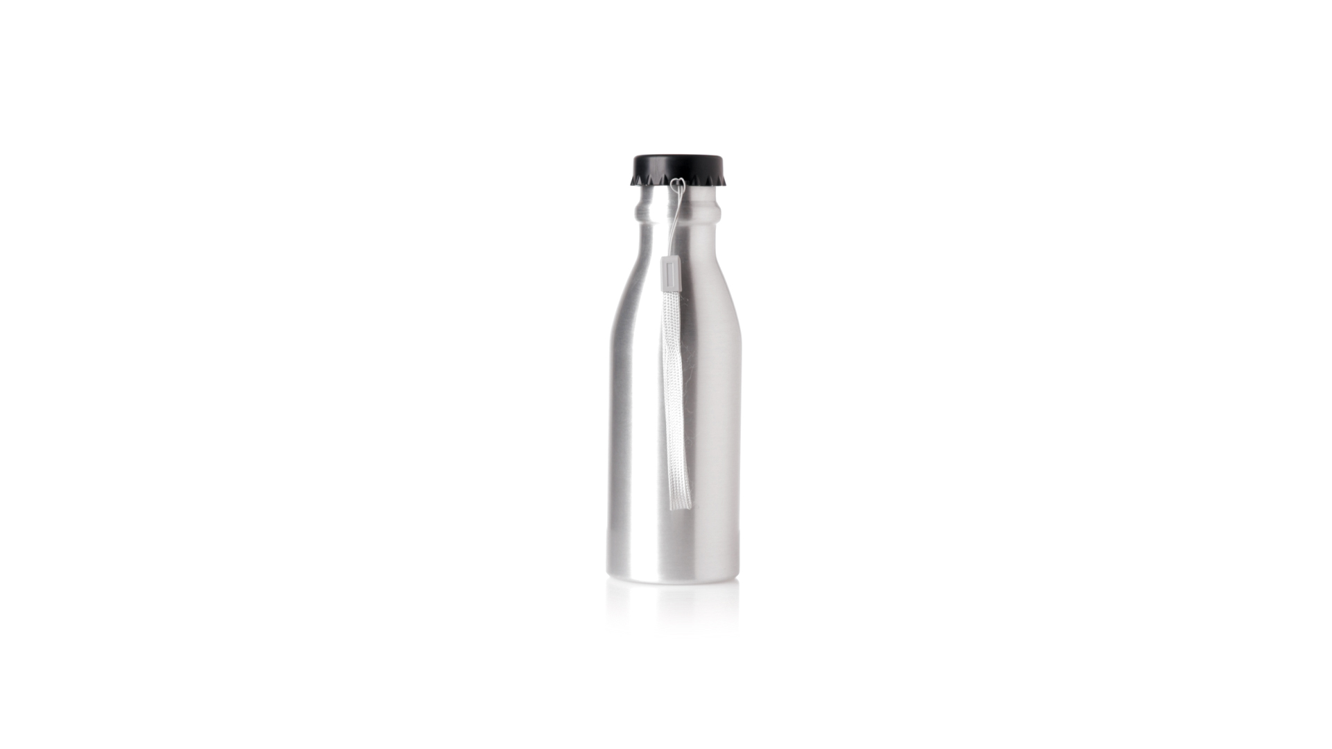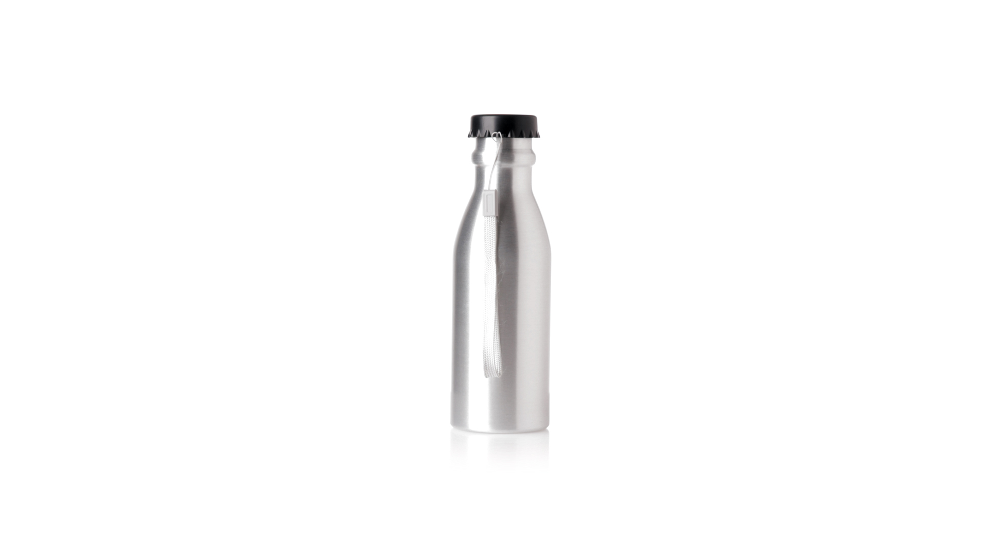 Trinkflasche mit einem Fassungsvermögen von 500 ml, aus Aluminium mit glänzender Oberfläche. Mit einem schwarzen originellen Schraubverschluss und Trageriemen. BPA-frei und in präsentiert in einer individuellen Kraft-Design-Box.