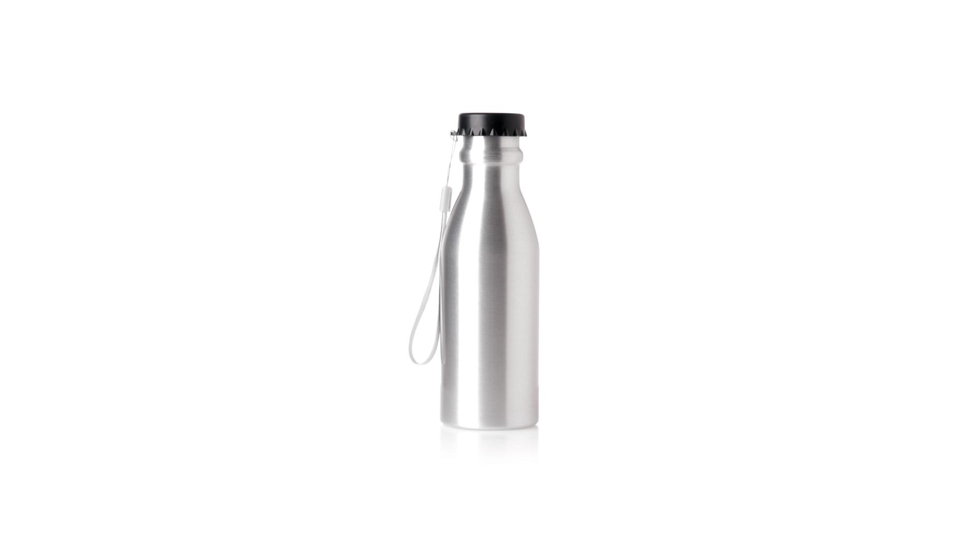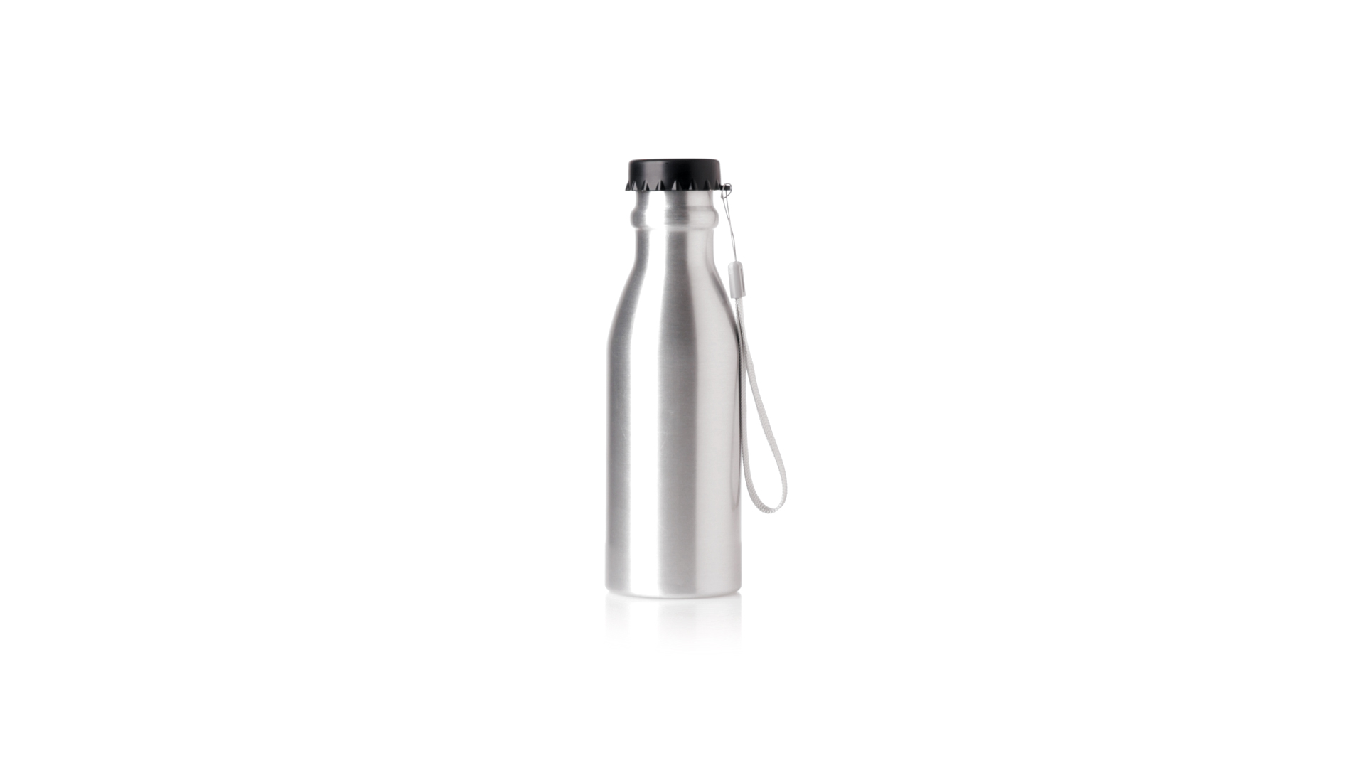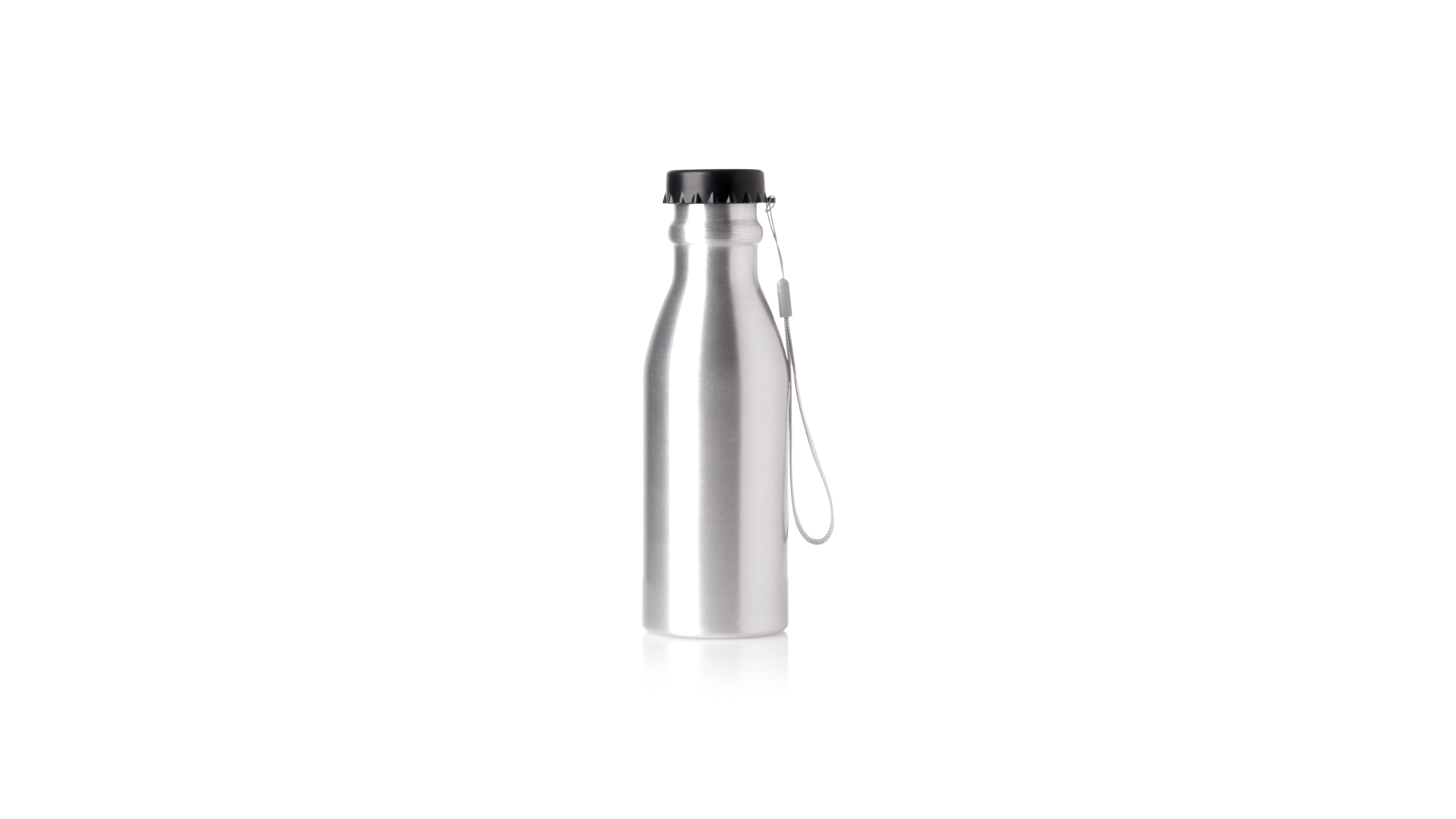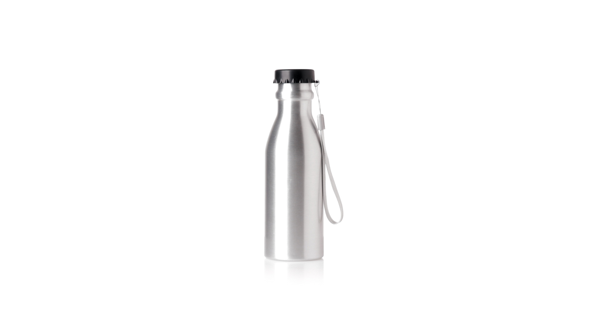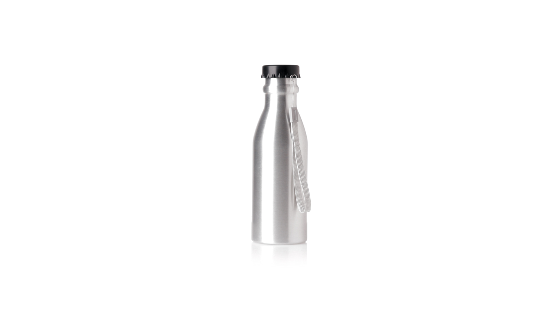 Trinkflasche mit einem Fassungsvermögen von 500 ml, aus Aluminium mit glänzender Oberfläche. Mit einem schwarzen originellen Schraubverschluss und Trageriemen. BPA-frei und in präsentiert in einer individuellen Kraft-Design-Box.