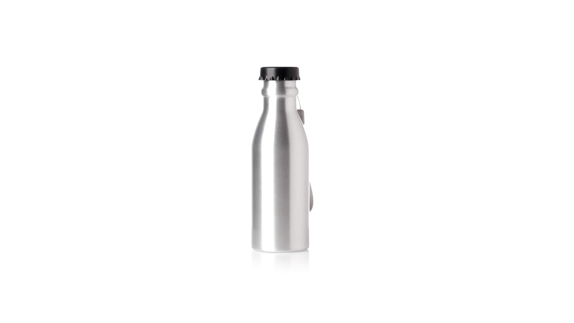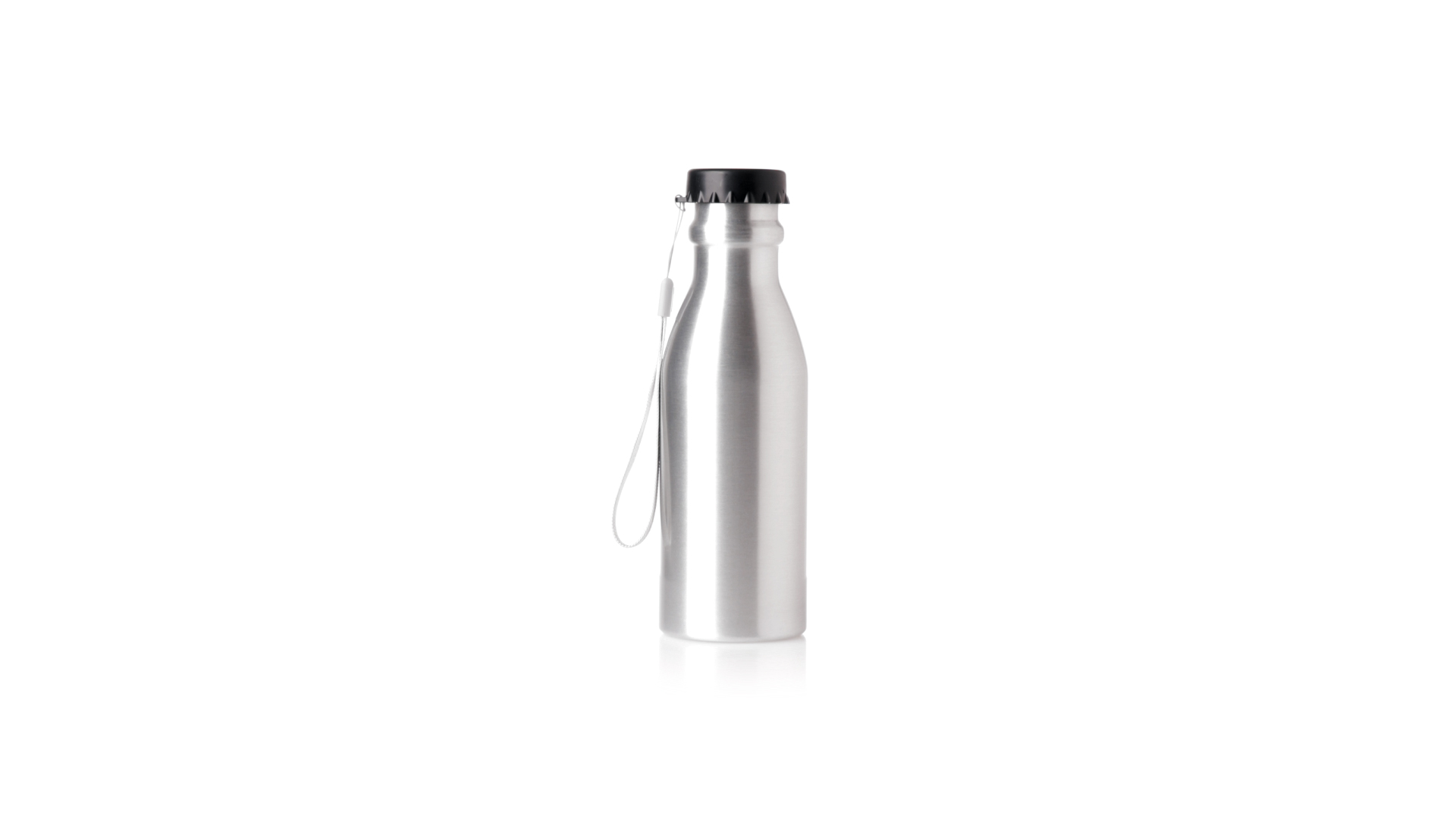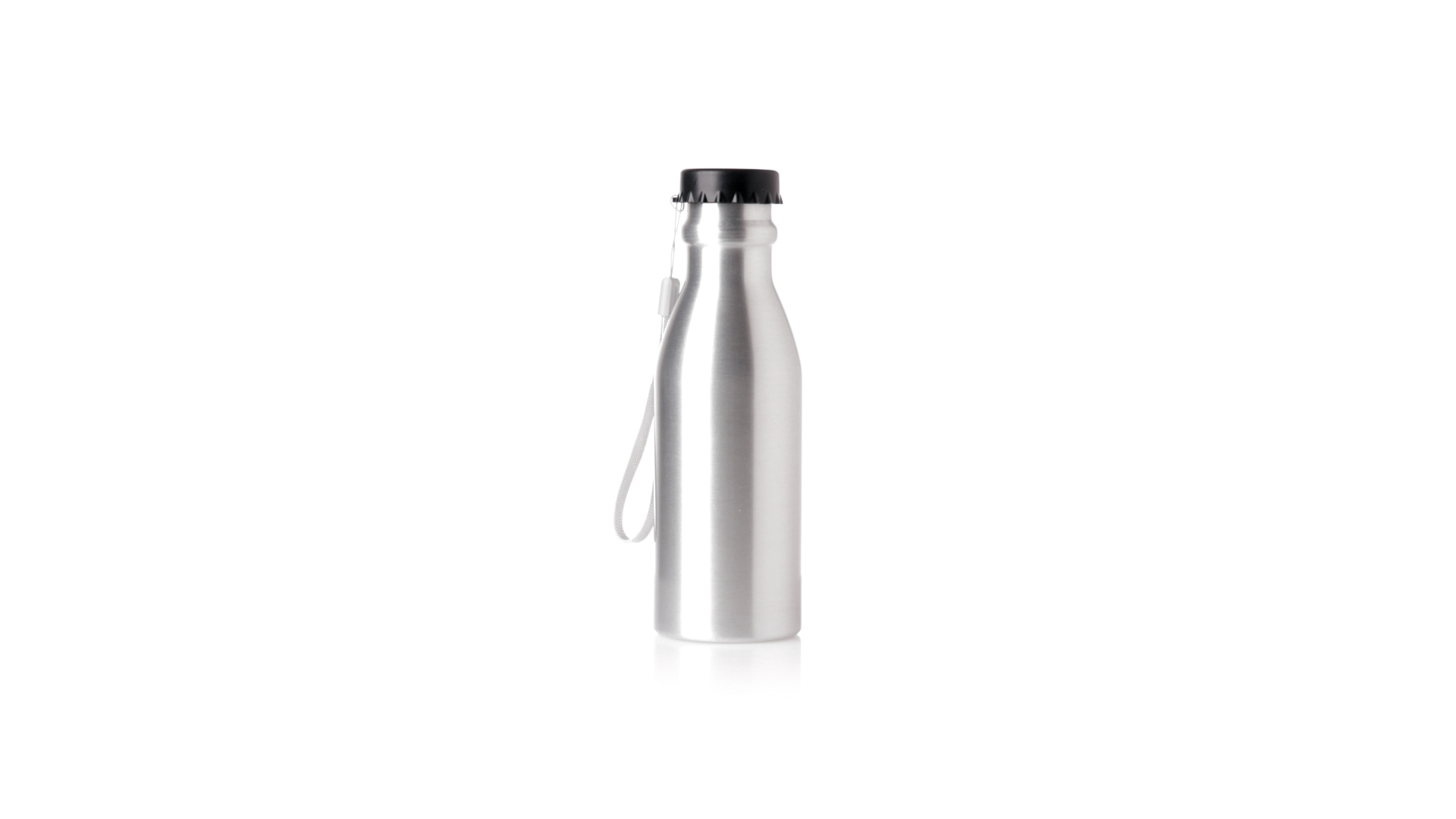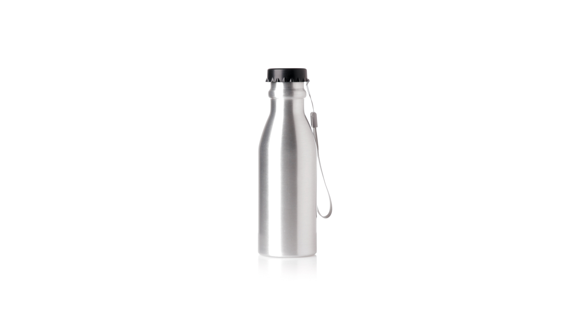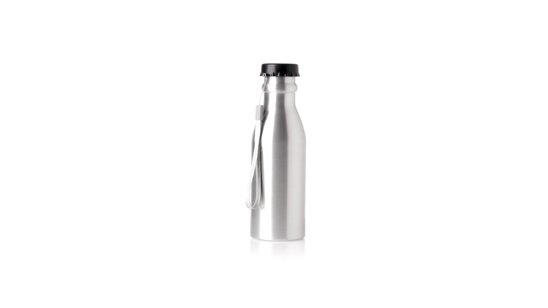 Trinkflasche mit einem Fassungsvermögen von 500 ml, aus Aluminium mit glänzender Oberfläche. Mit einem schwarzen originellen Schraubverschluss und Trageriemen. BPA-frei und in präsentiert in einer individuellen Kraft-Design-Box.