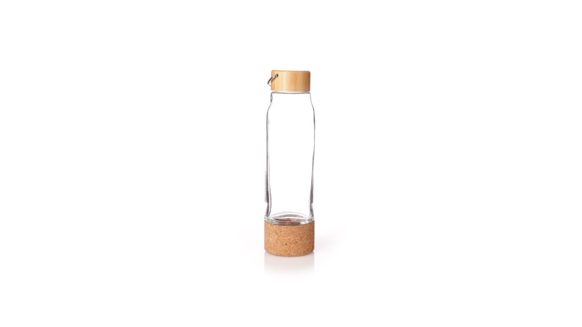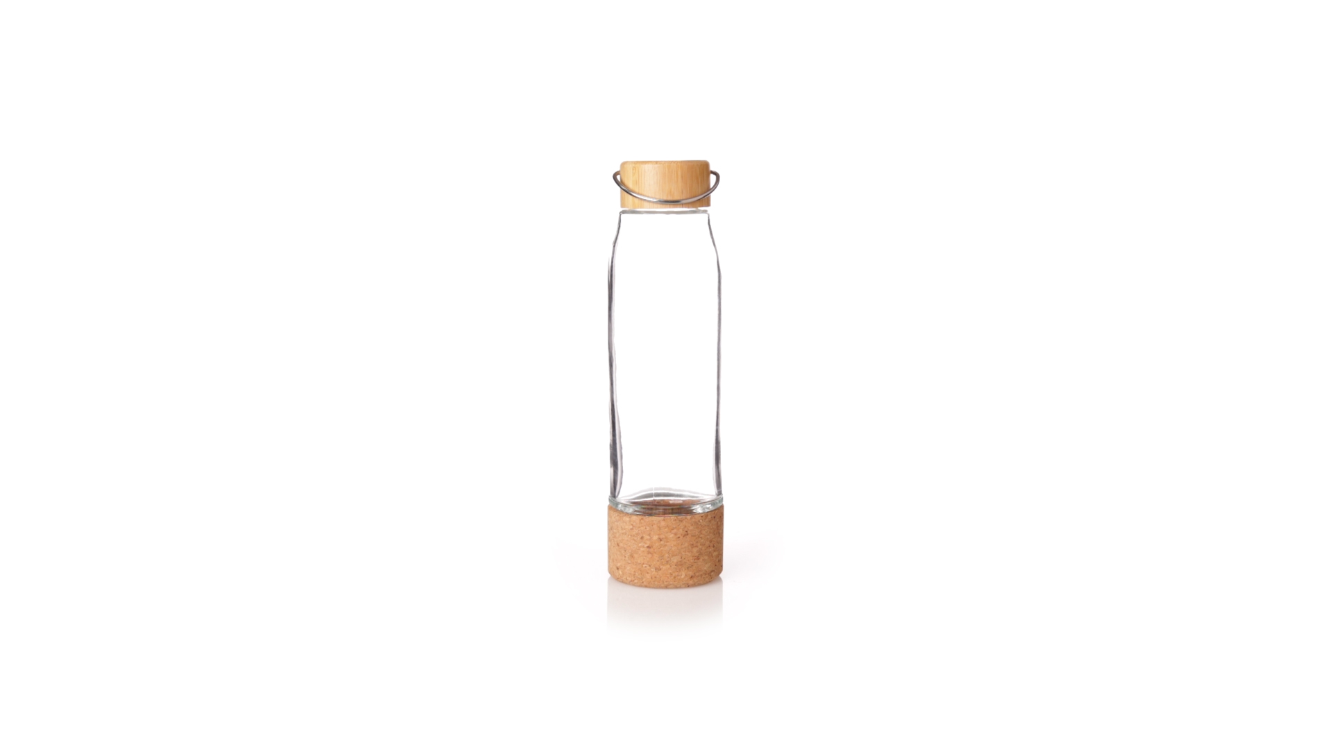 Nature-Line-Flasche mit einem Fassungsvermögen von 470 ml. Korpus aus Glas, mit Korkboden. Inklusive Original-Schraubverschluss aus Bambus mit integriertem Griff. Präsentiert in einer individuellen Ökodesign-Box.