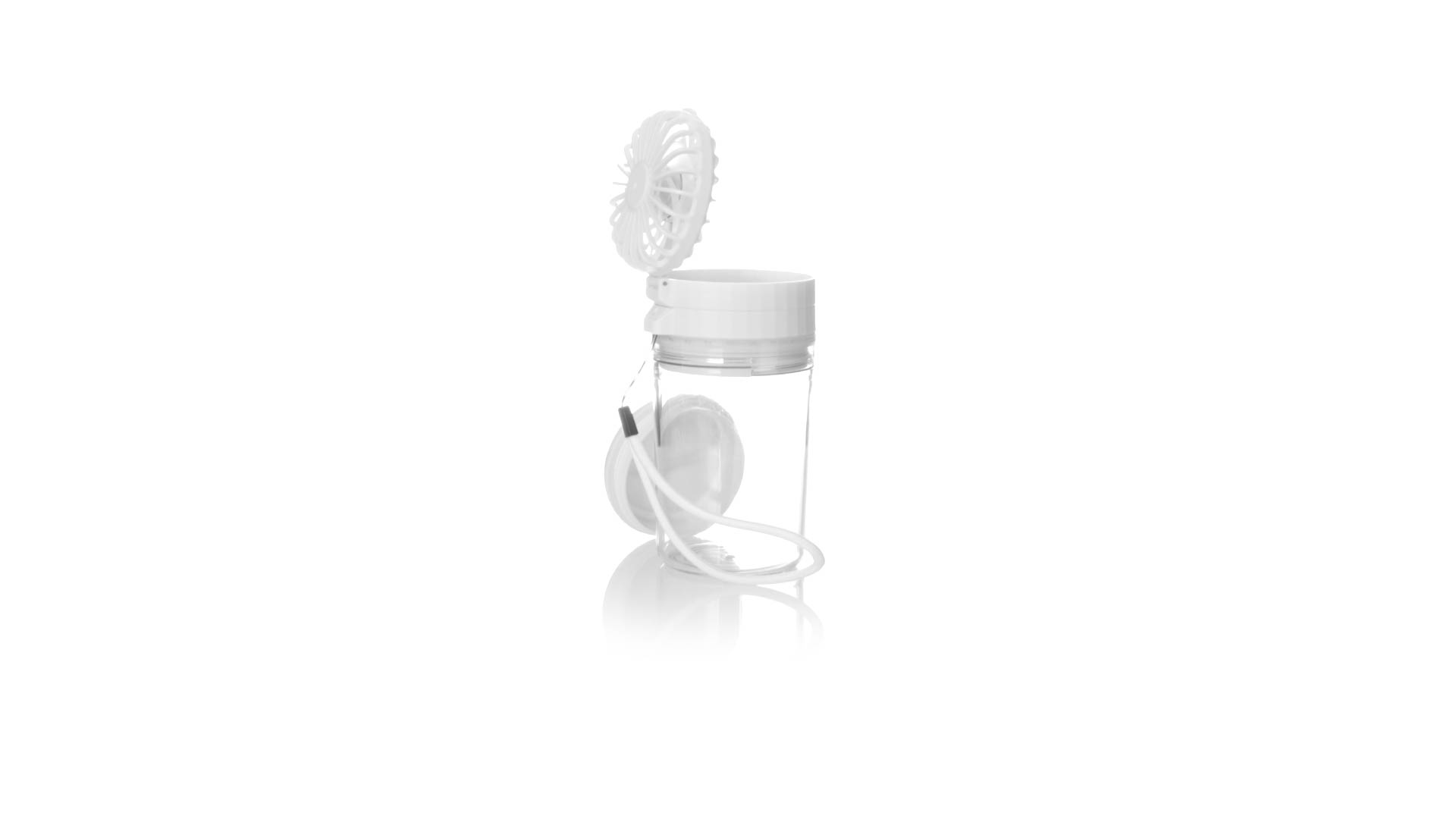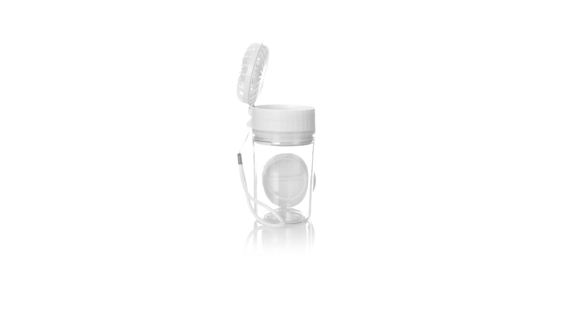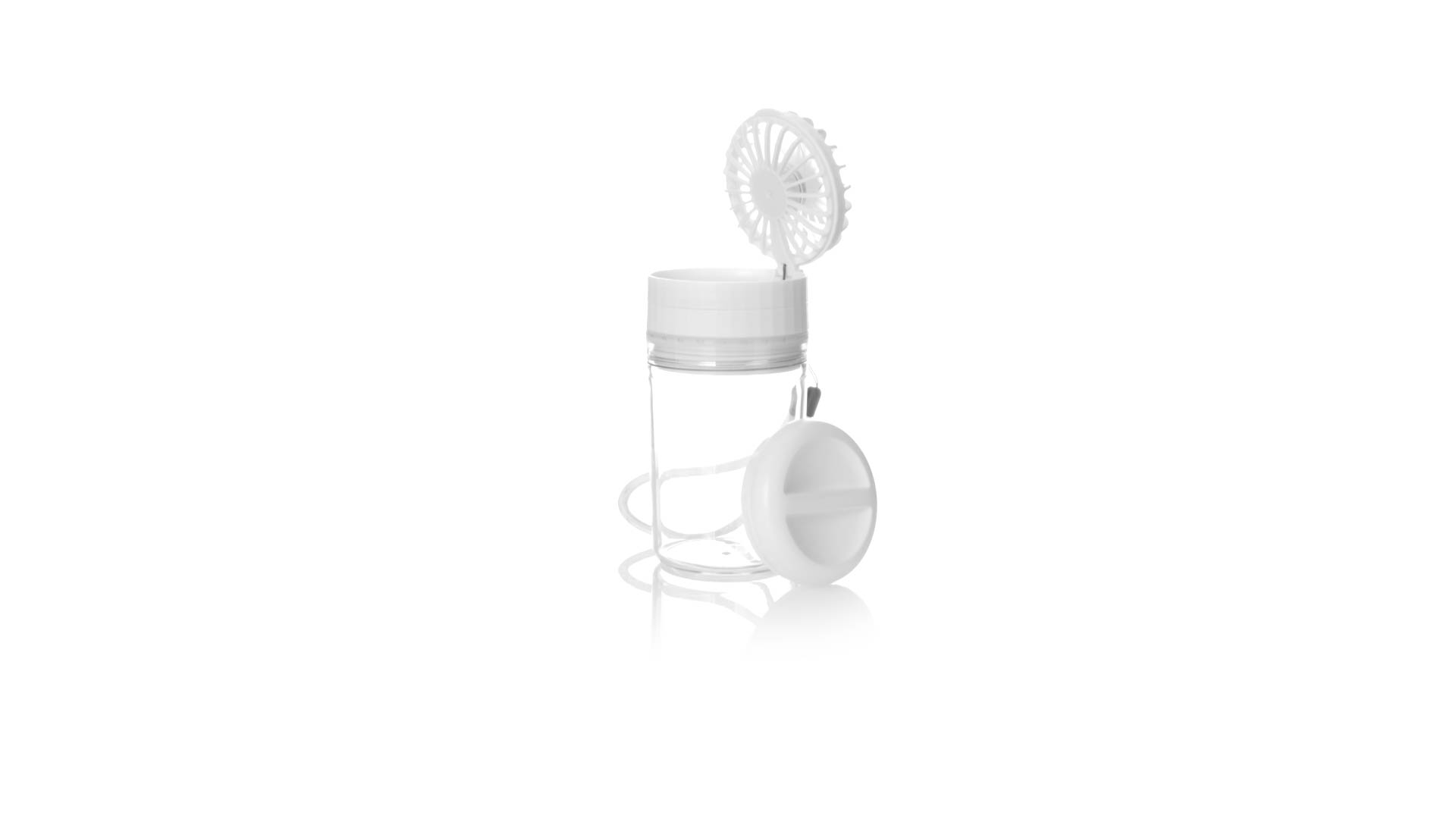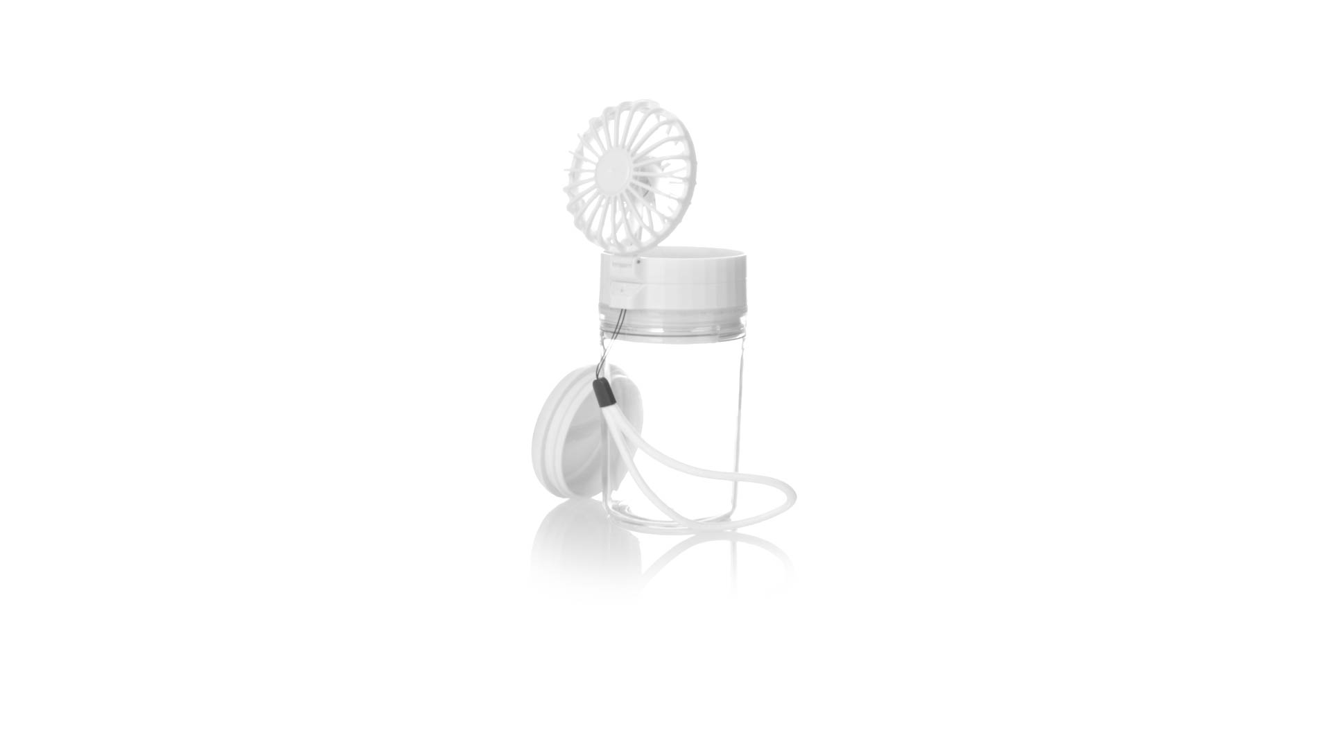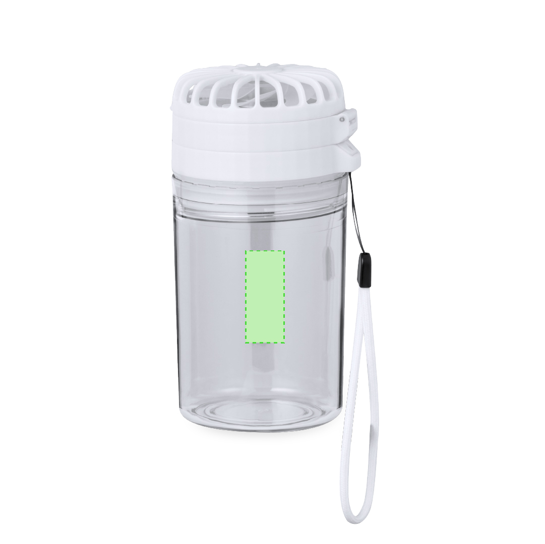 Praktische Flasche mit Ventilator, aus Tritan und mit einem Fassungsvermögen von 350 ml. BPA-frei, mit hermetischem Schraubdeckel, der einen Ventilator mit 3 einstellbaren Intensitäts- und Positionsstufen enthält. Mit 1200-mAh-Akku und einem zusätzlichen Deckel zur separaten Verwendung. Inklusive Umhängeband zum einfachen Tragen und einzeln verpackt in einer Kraftbox.