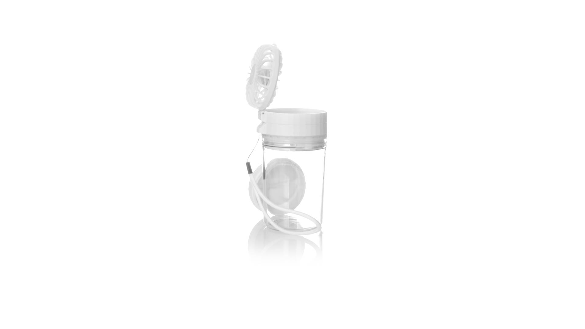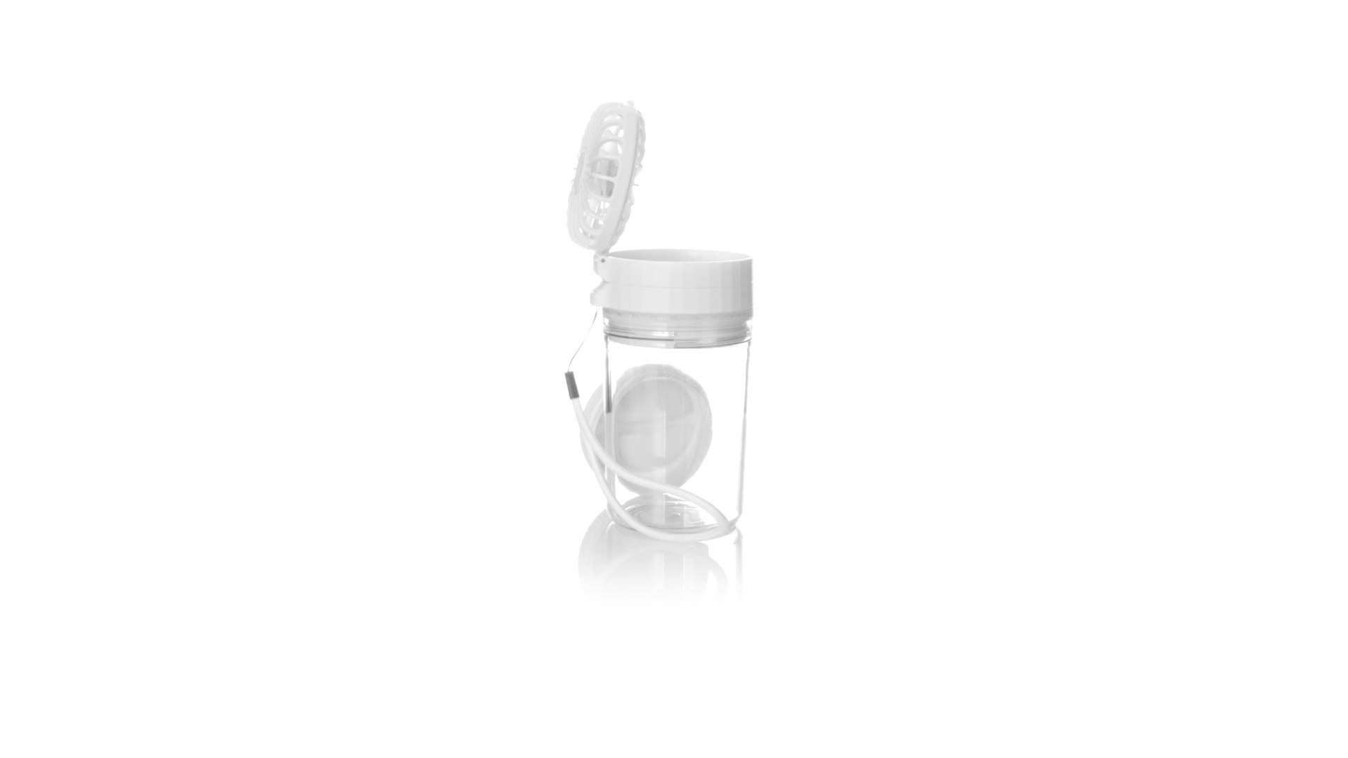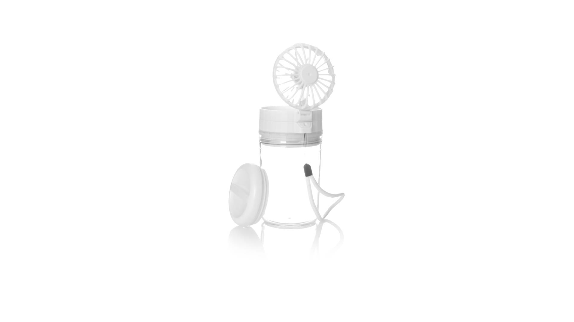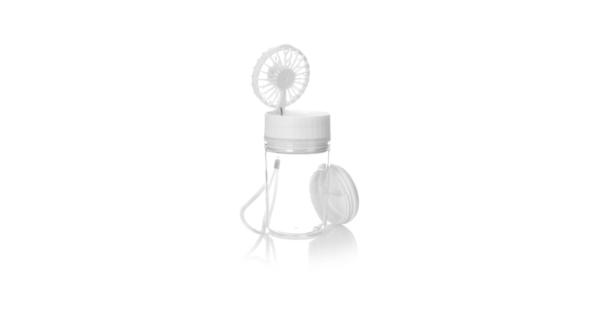 Praktische Flasche mit Ventilator, aus Tritan und mit einem Fassungsvermögen von 350 ml. BPA-frei, mit hermetischem Schraubdeckel, der einen Ventilator mit 3 einstellbaren Intensitäts- und Positionsstufen enthält. Mit 1200-mAh-Akku und einem zusätzlichen Deckel zur separaten Verwendung. Inklusive Umhängeband zum einfachen Tragen und einzeln verpackt in einer Kraftbox.