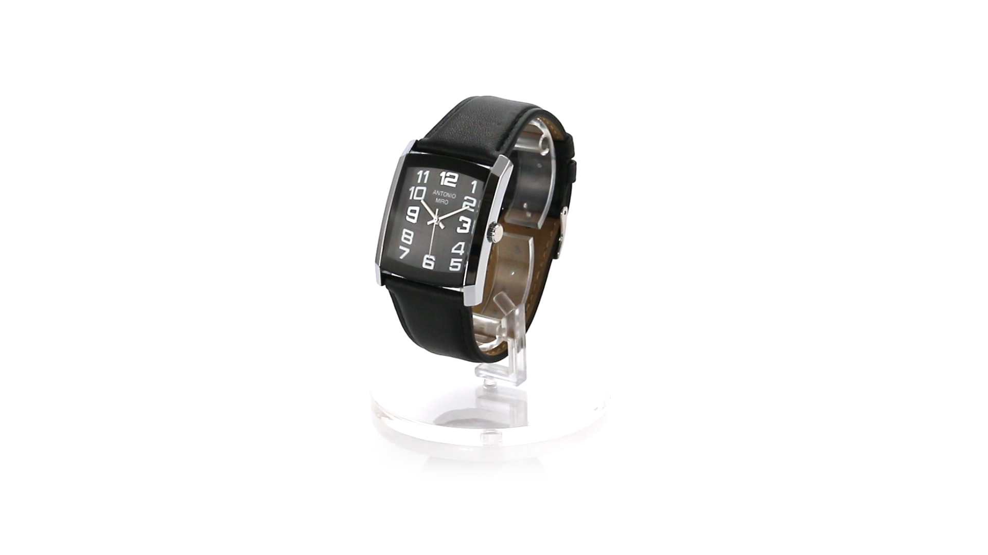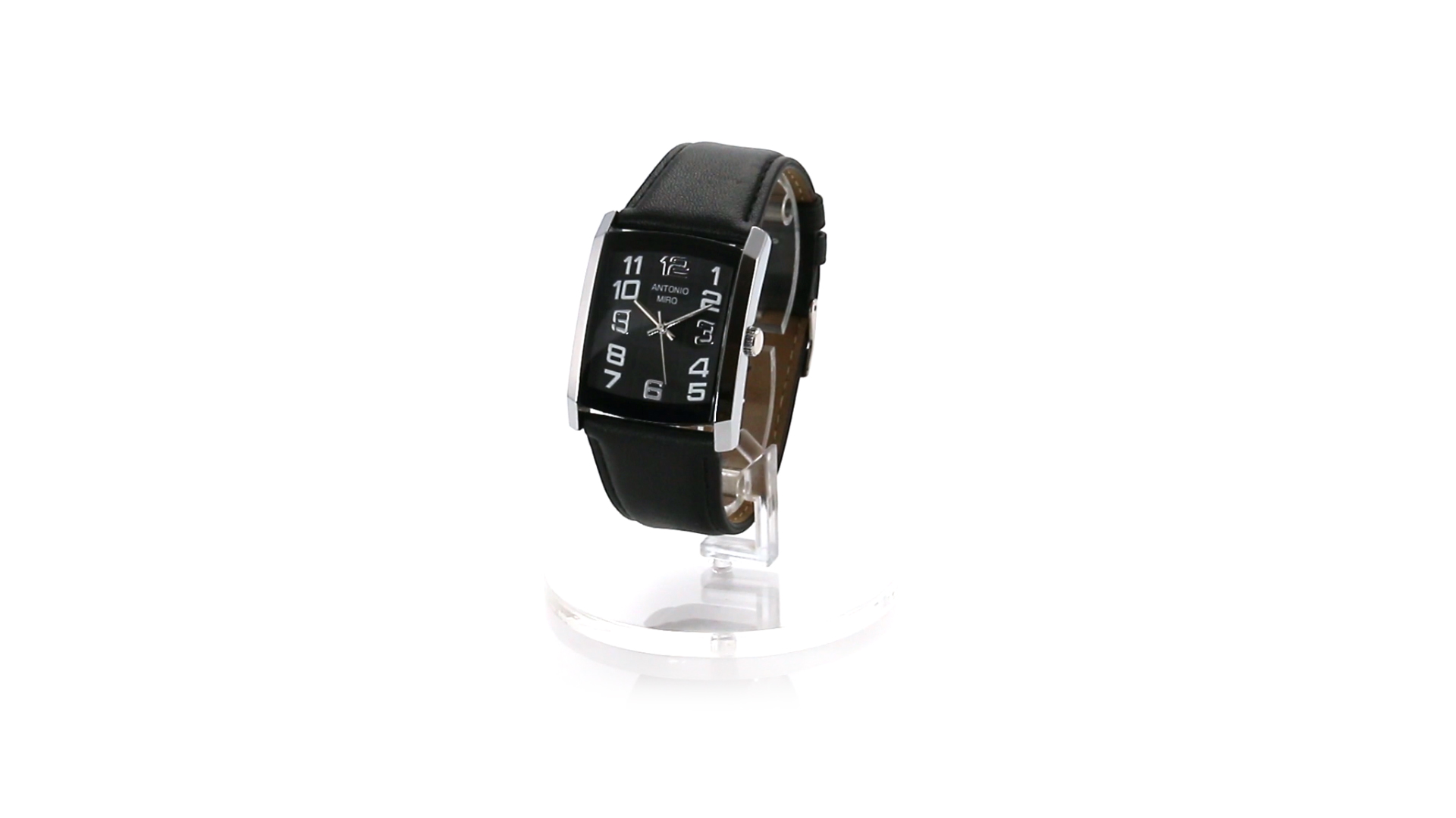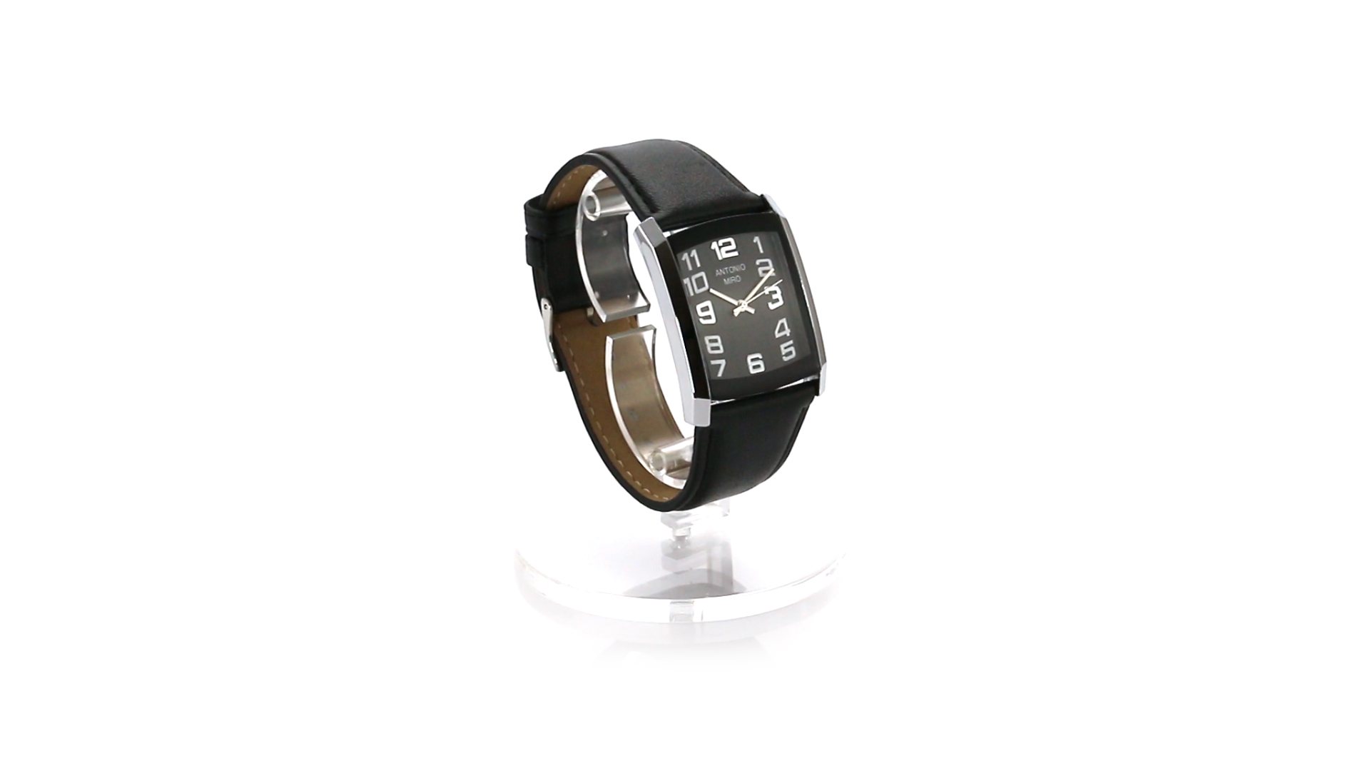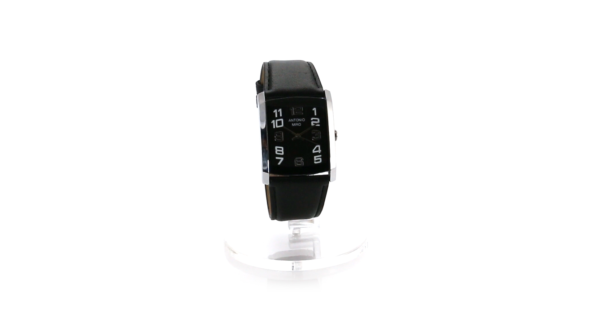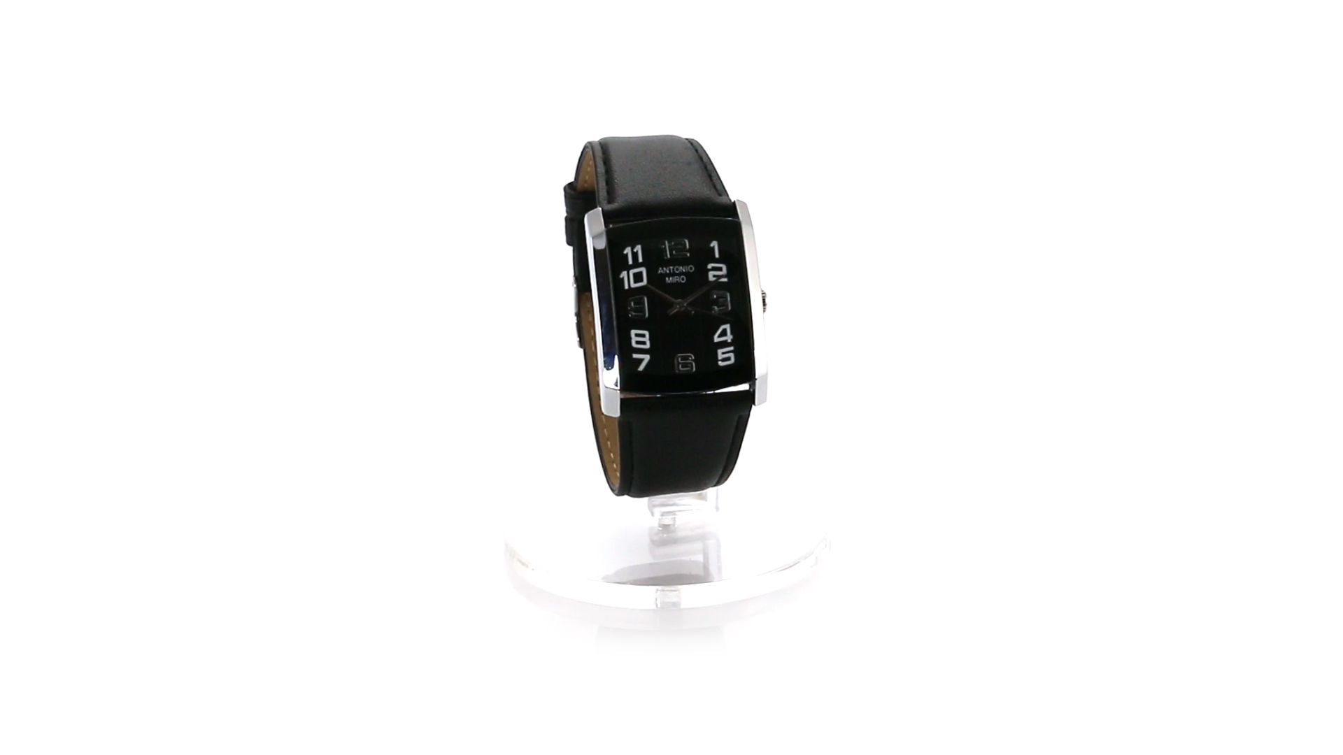 Elegante Armbanduhr von Antonio Miró. Mit Metallgehäuse und rechteckigem Analogzifferblatt mit dem Markenlogo und Mineralglas. Spritzwassergeschützt. Mit japanischem Quarzwerk und verstellbarem Lederarmband mit Schnallenverschluss. Präsentiert in einer individuellen Box in Schwarz mit dem Markenlogo und Stanzung im Inneren.