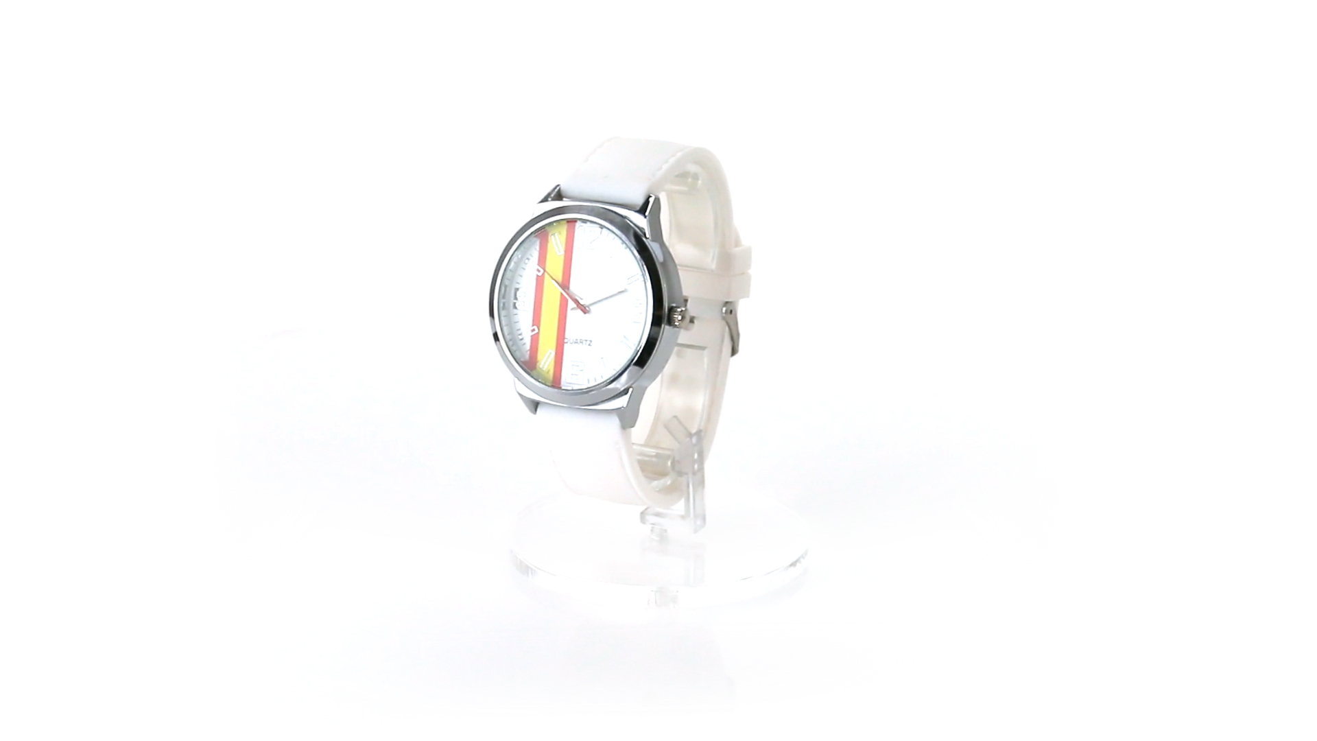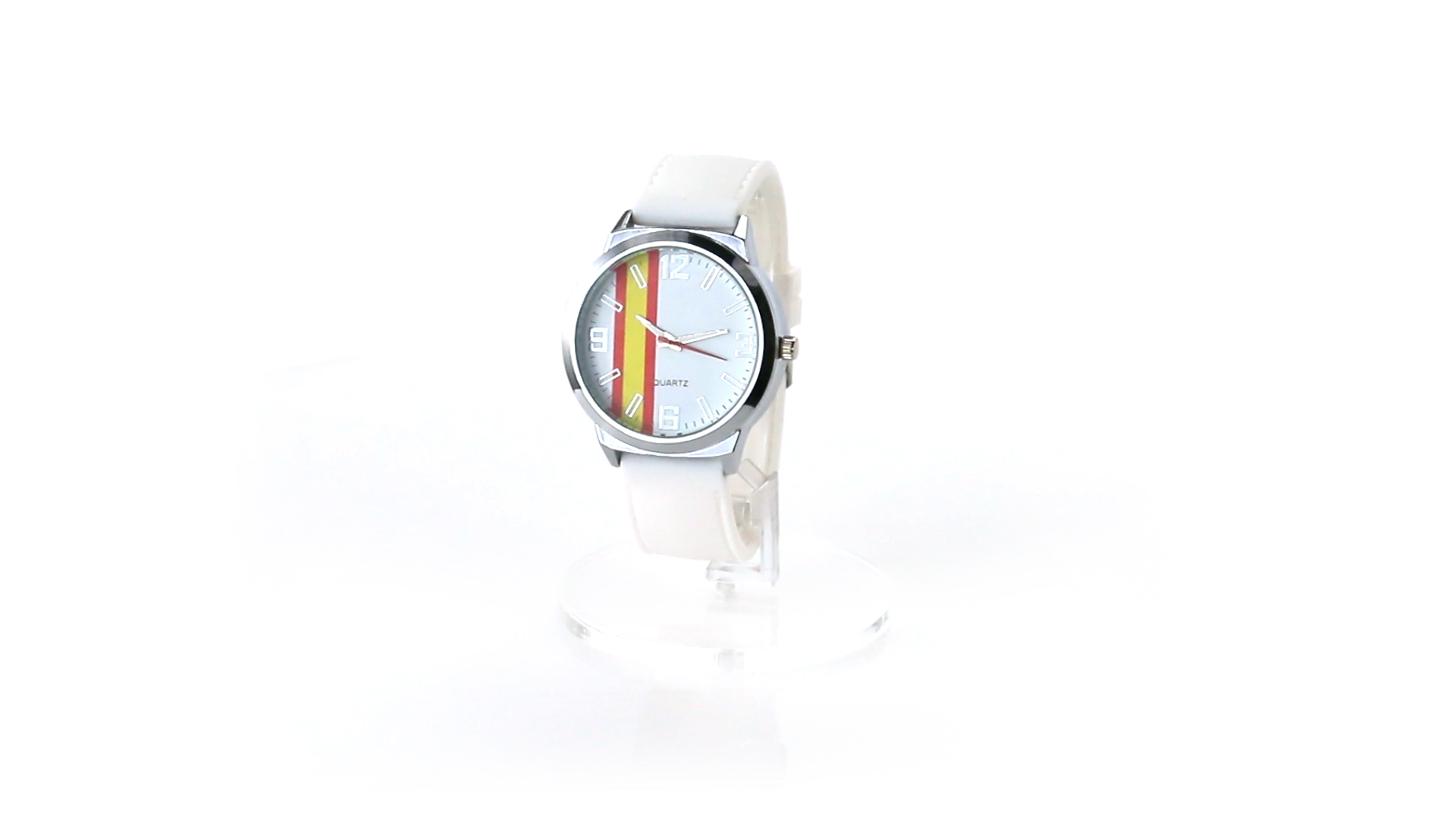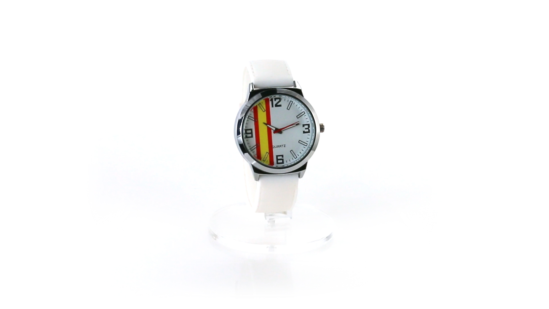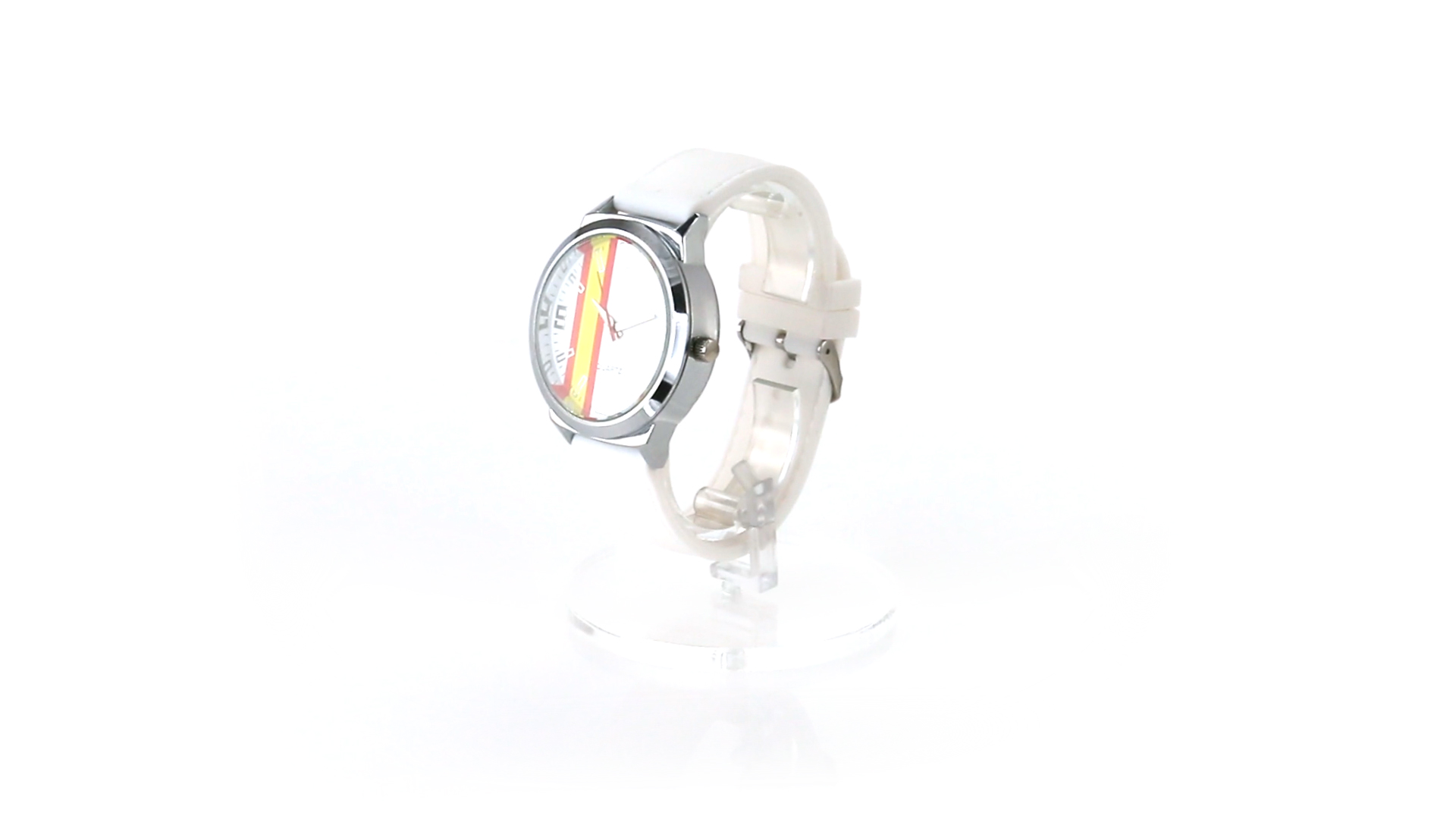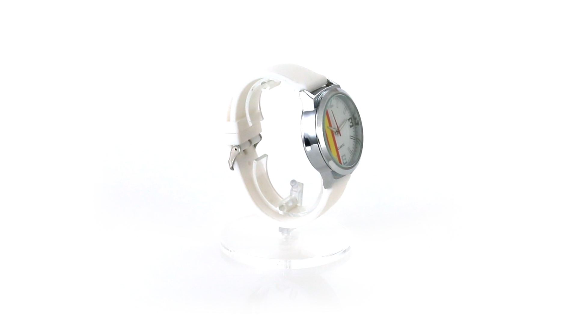 Armbanduhr mit coolem Design und spritzwassergeschütztem Metallgehäuse. Mit kreisförmigem, analogem Zifferblatt mit Farbstreifen und weichem Silikonband mit Klickverschluss. Erhältlich in den Designs Spanien, Italien, Portugal und Frankreich. Präsentiert in einer individuellen Tasche.