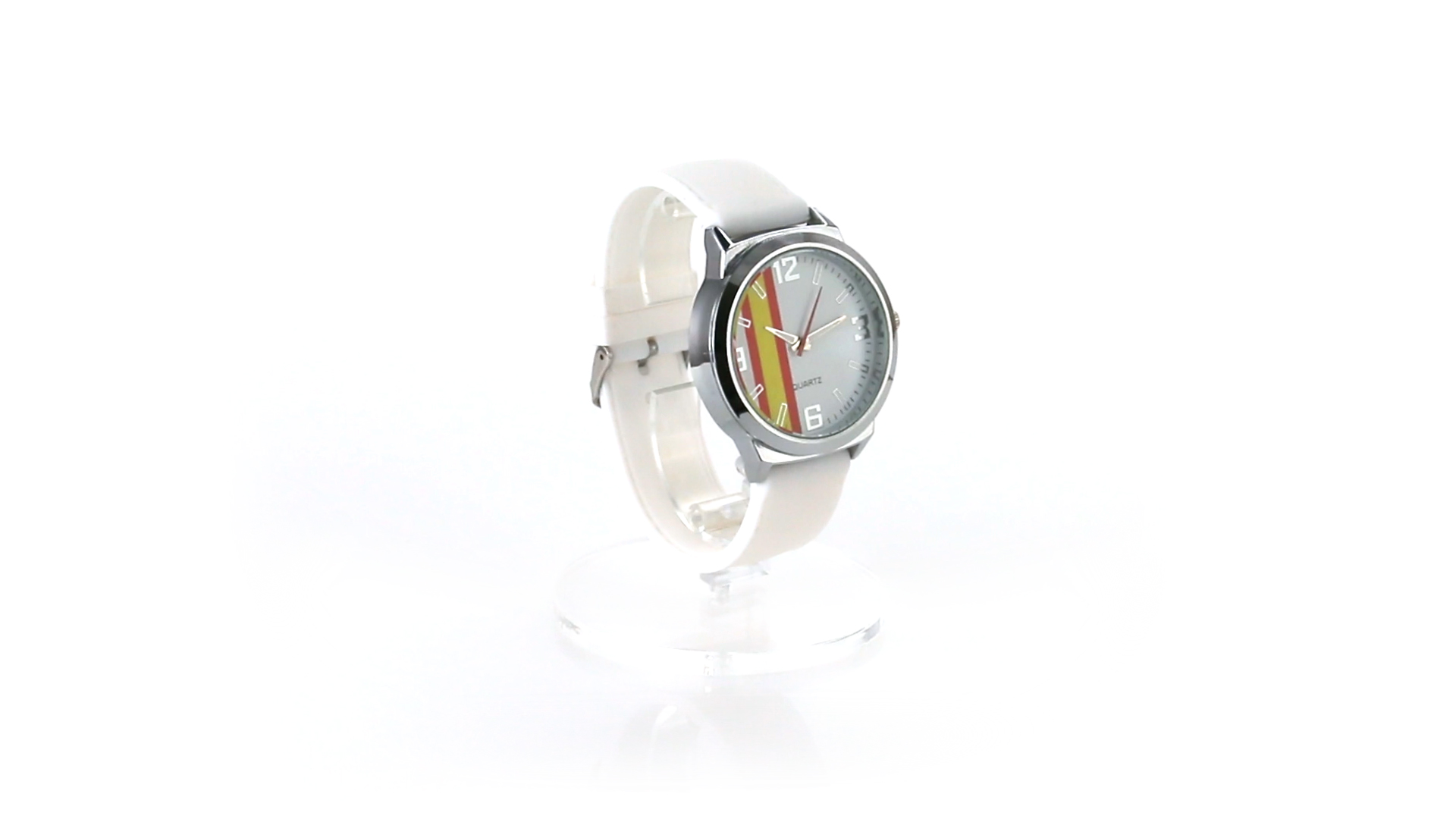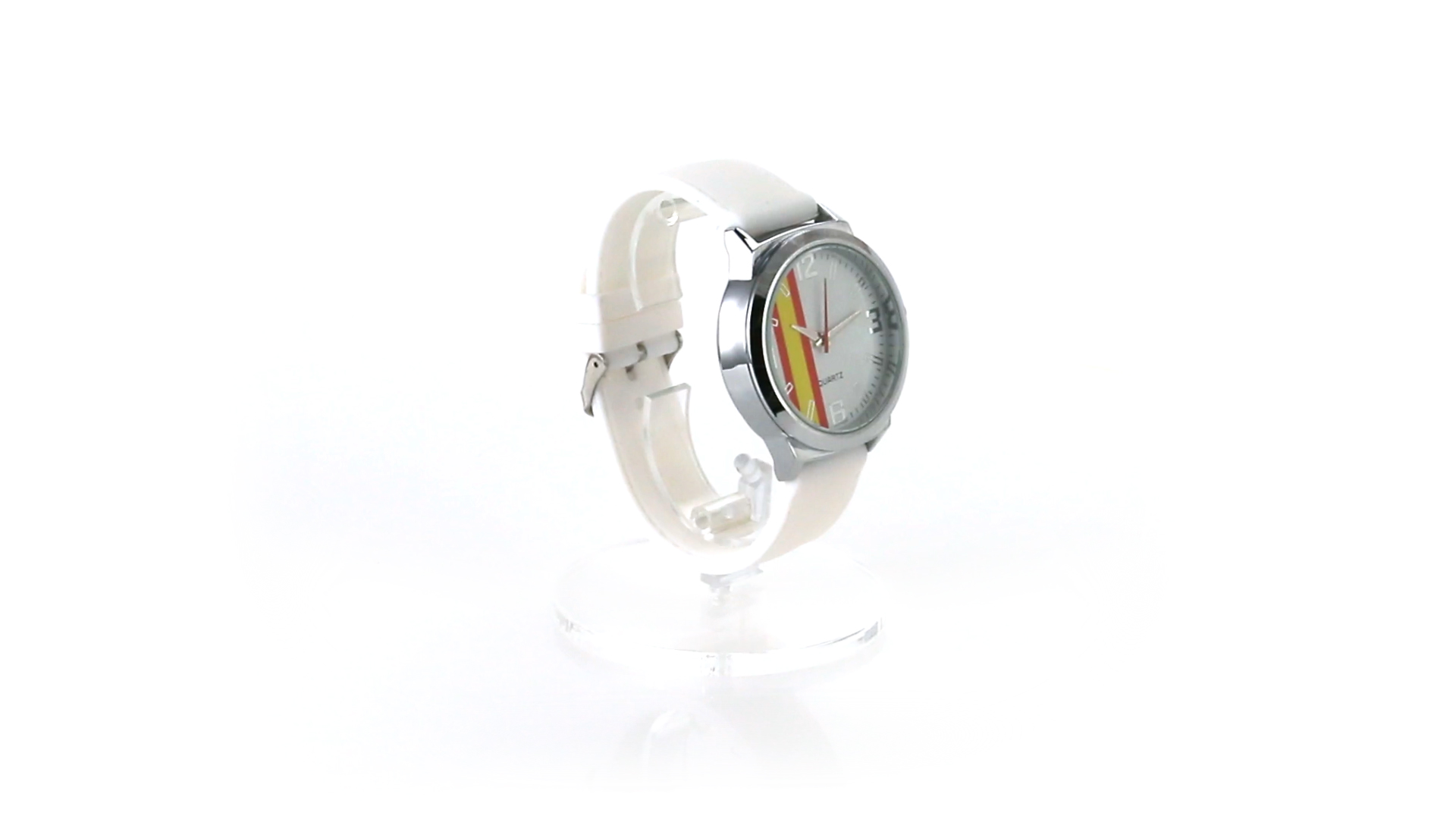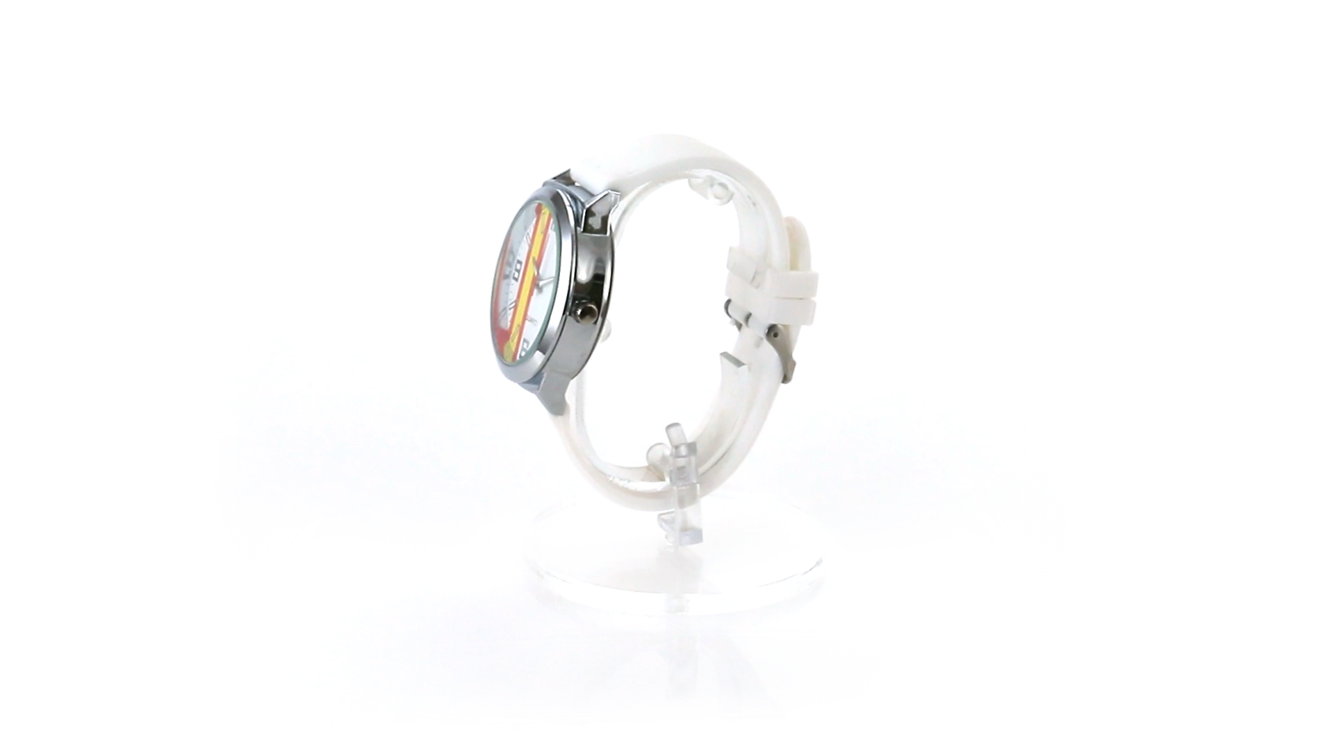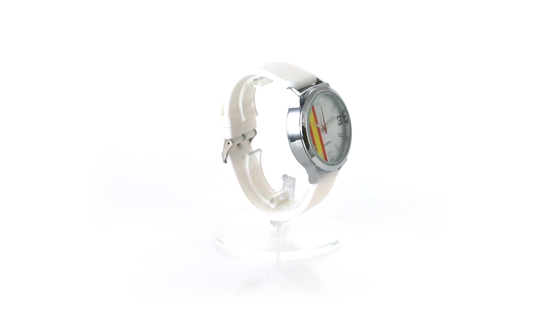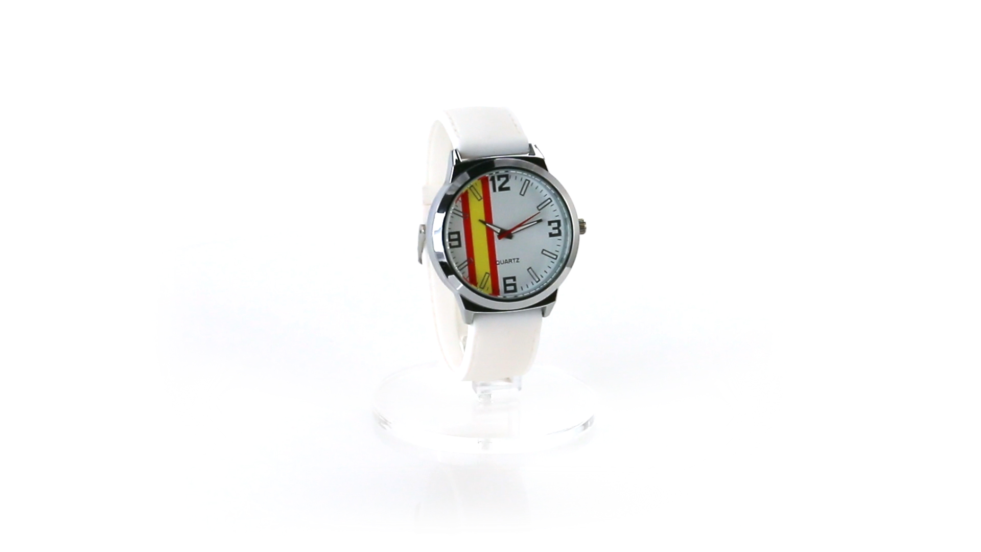 Armbanduhr mit coolem Design und spritzwassergeschütztem Metallgehäuse. Mit kreisförmigem, analogem Zifferblatt mit Farbstreifen und weichem Silikonband mit Klickverschluss. Erhältlich in den Designs Spanien, Italien, Portugal und Frankreich. Präsentiert in einer individuellen Tasche.
