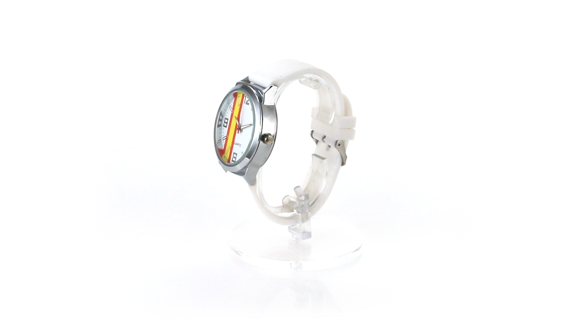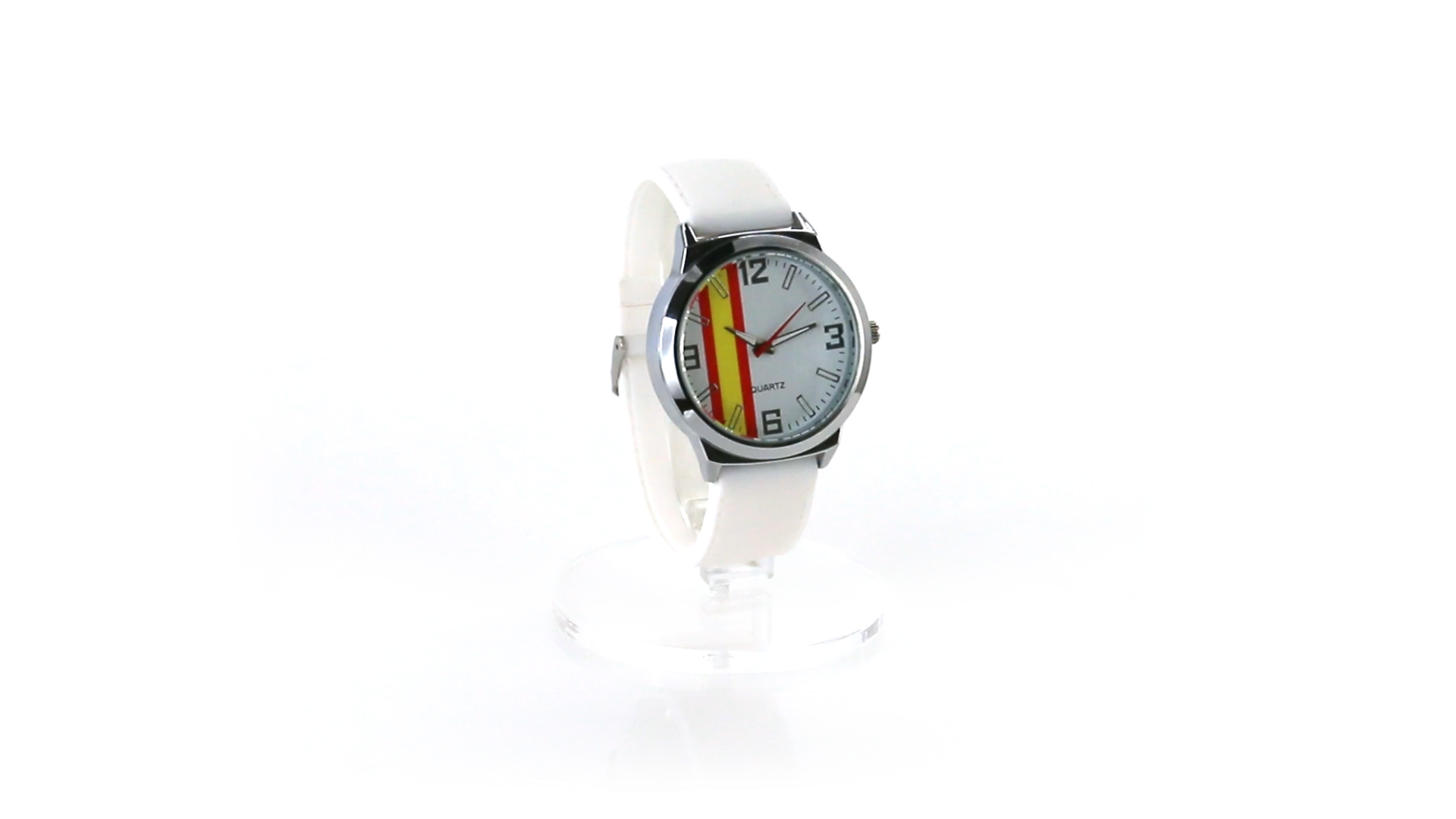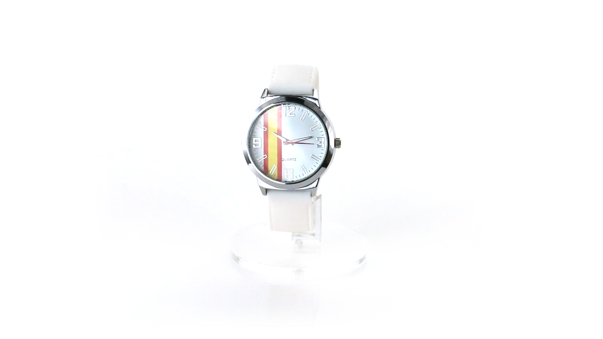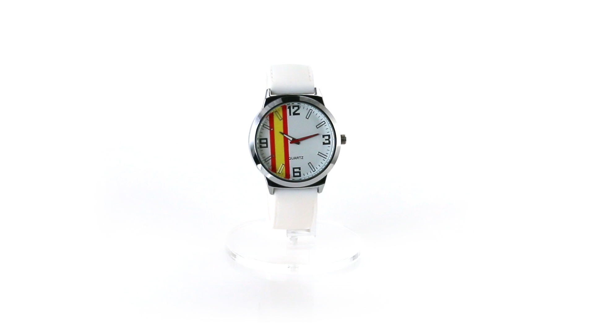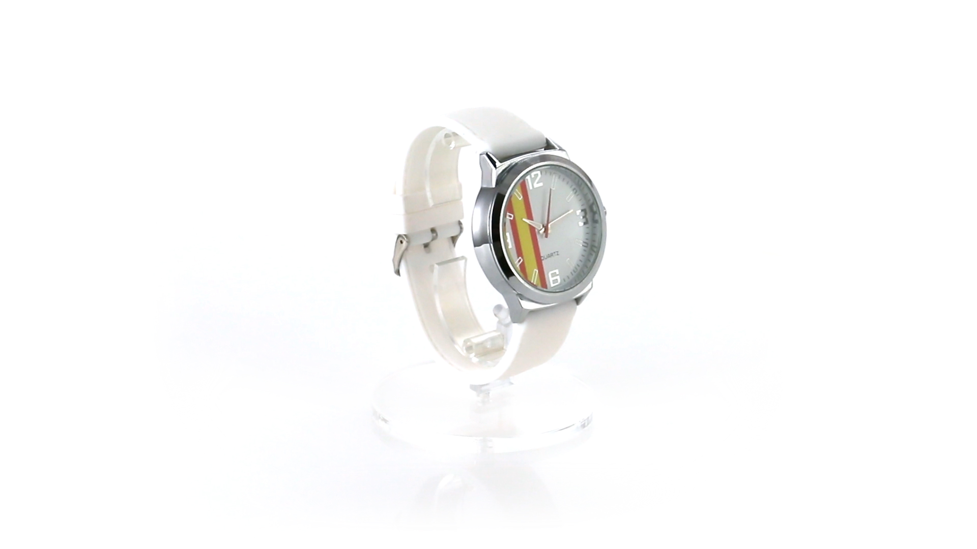 Armbanduhr mit coolem Design und spritzwassergeschütztem Metallgehäuse. Mit kreisförmigem, analogem Zifferblatt mit Farbstreifen und weichem Silikonband mit Klickverschluss. Erhältlich in den Designs Spanien, Italien, Portugal und Frankreich. Präsentiert in einer individuellen Tasche.