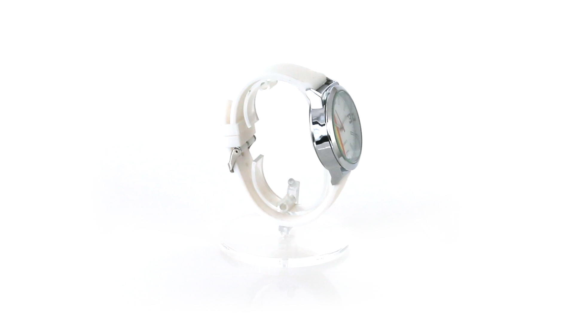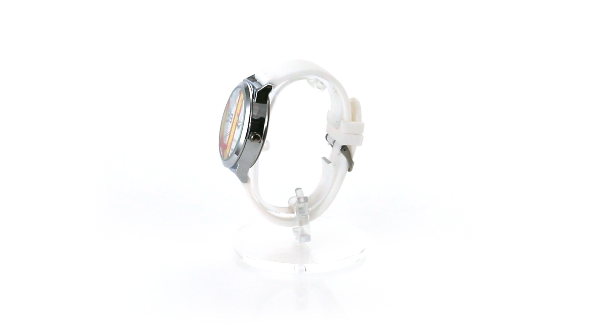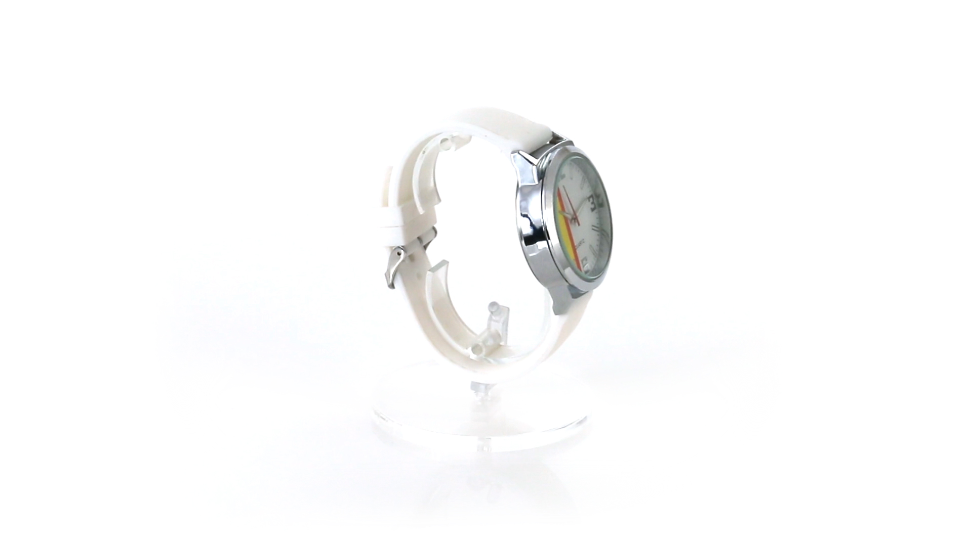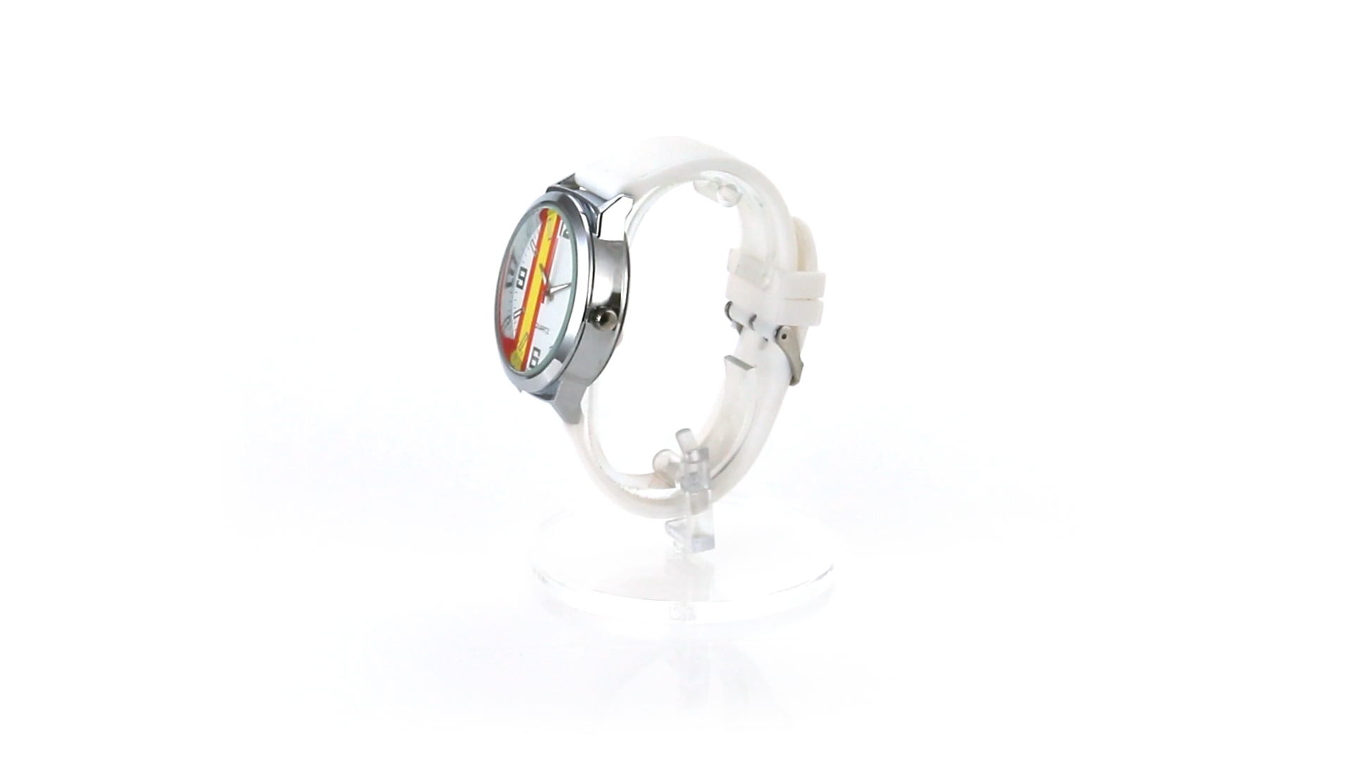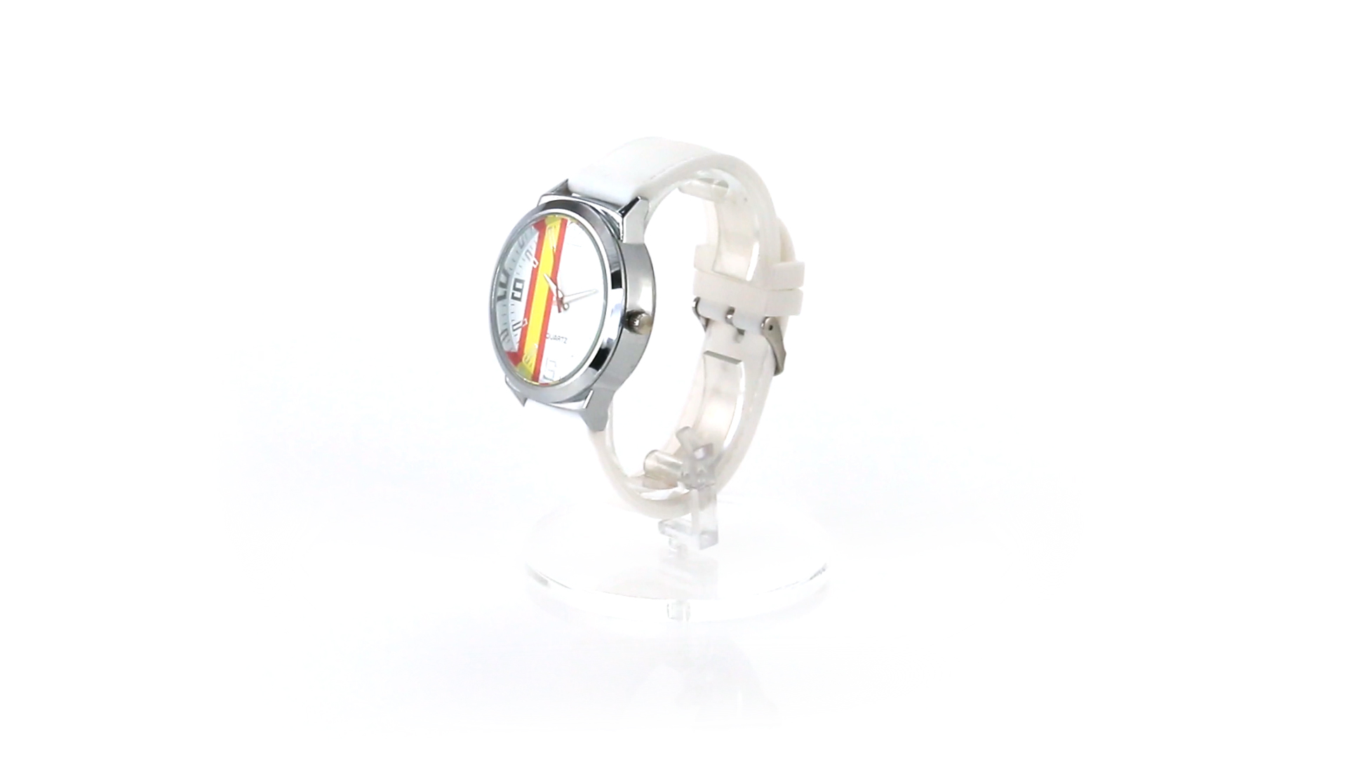 Armbanduhr mit coolem Design und spritzwassergeschütztem Metallgehäuse. Mit kreisförmigem, analogem Zifferblatt mit Farbstreifen und weichem Silikonband mit Klickverschluss. Erhältlich in den Designs Spanien, Italien, Portugal und Frankreich. Präsentiert in einer individuellen Tasche.