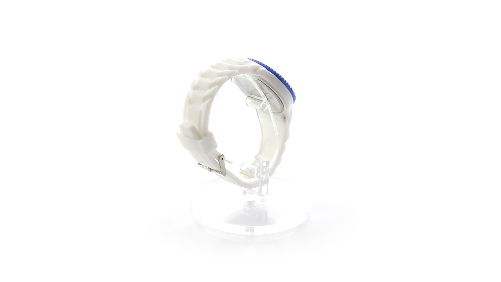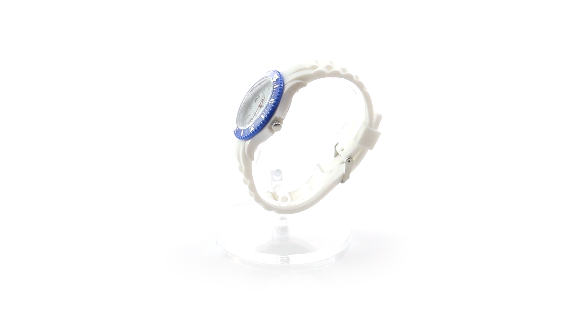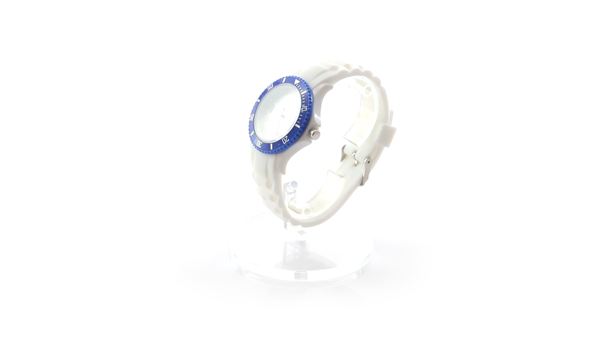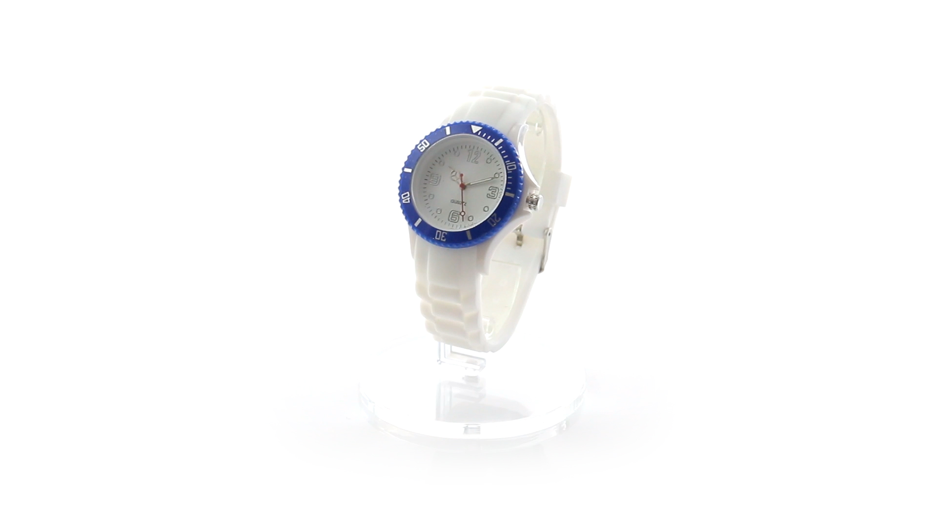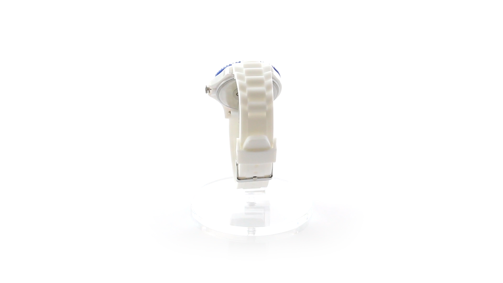 Chronograph-Armbanduhr in origineller zweifarbiger Ausführung. Mit Chronograph in fröhlichen Farben, analogem Zifferblatt und Silikonarmband in Weiss. Spritzwassergeschützt. Präsentiert in einem individuellen Beutel.