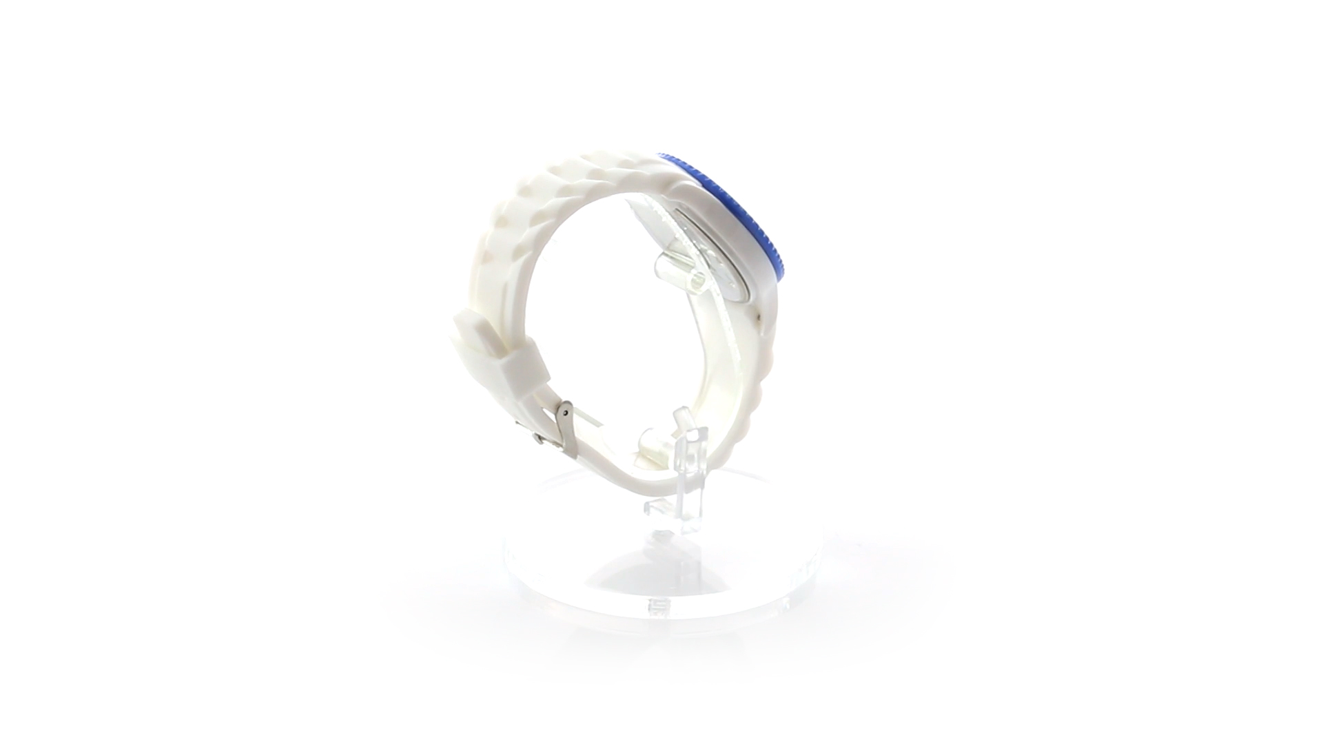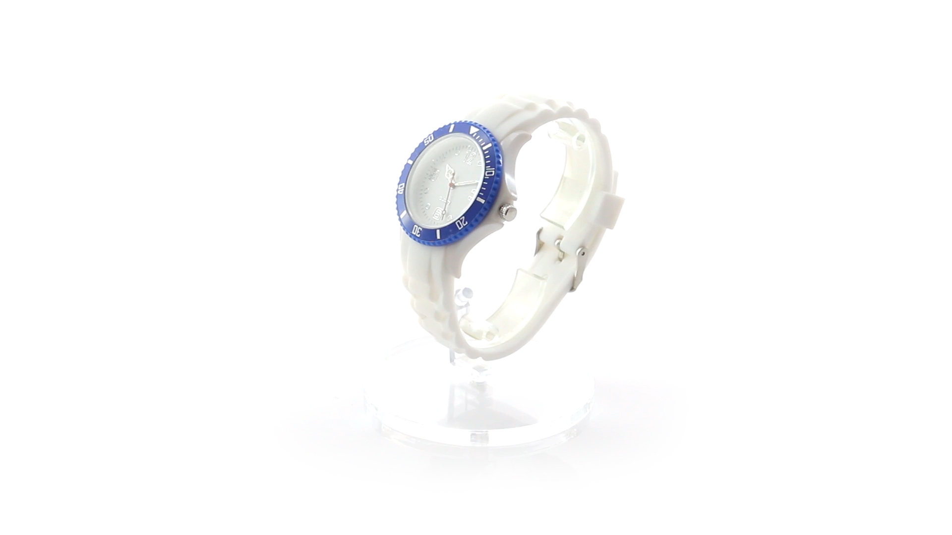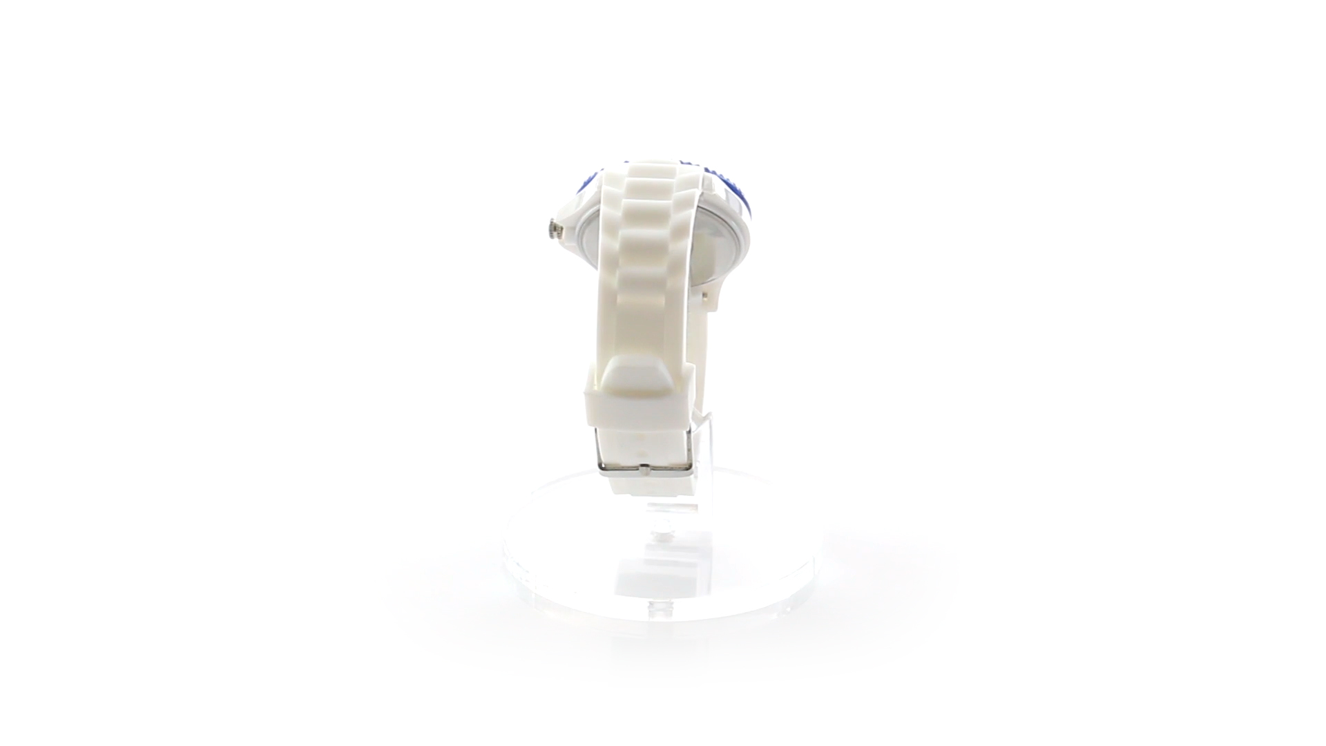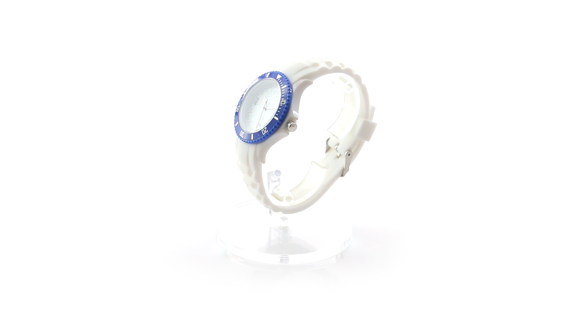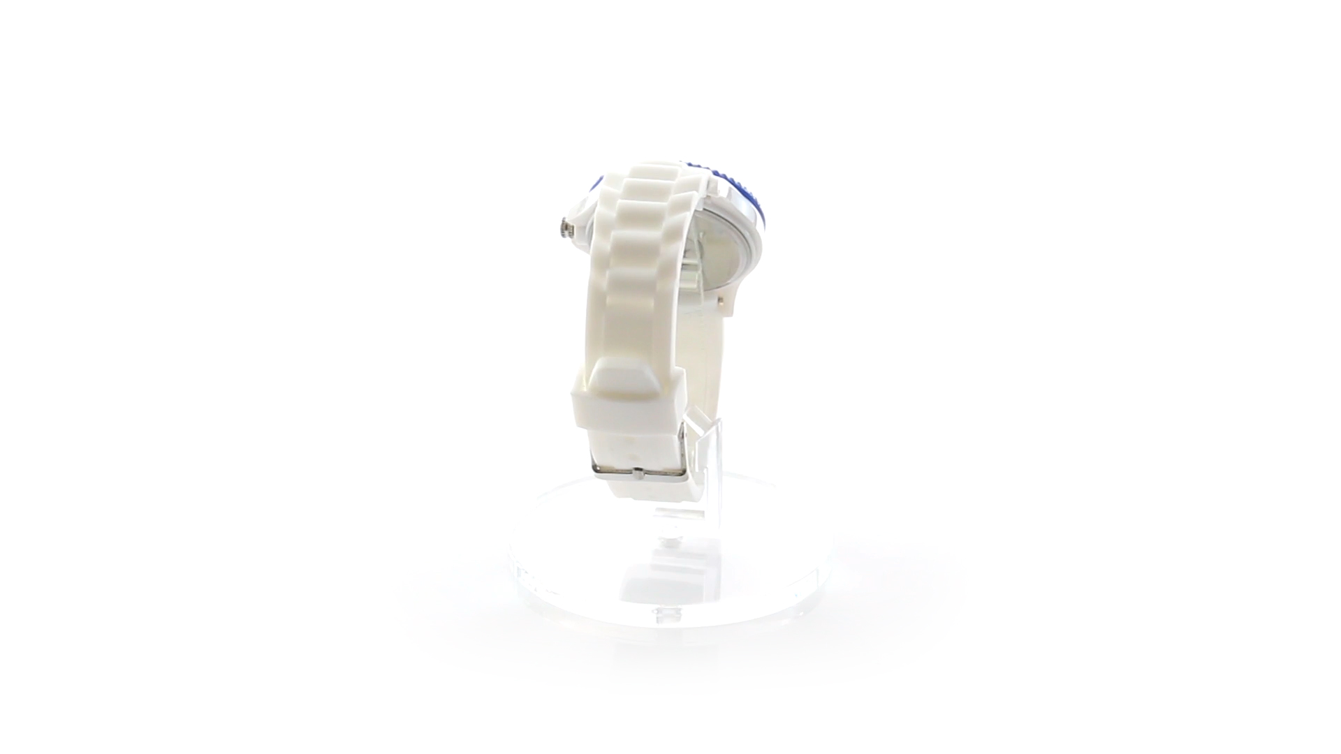 Chronograph-Armbanduhr in origineller zweifarbiger Ausführung. Mit Chronograph in fröhlichen Farben, analogem Zifferblatt und Silikonarmband in Weiss. Spritzwassergeschützt. Präsentiert in einem individuellen Beutel.