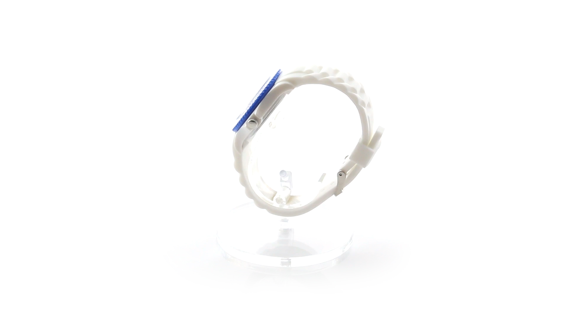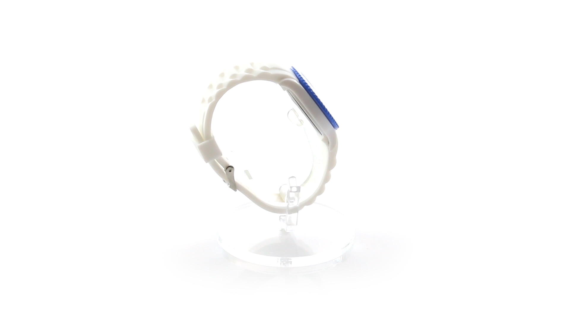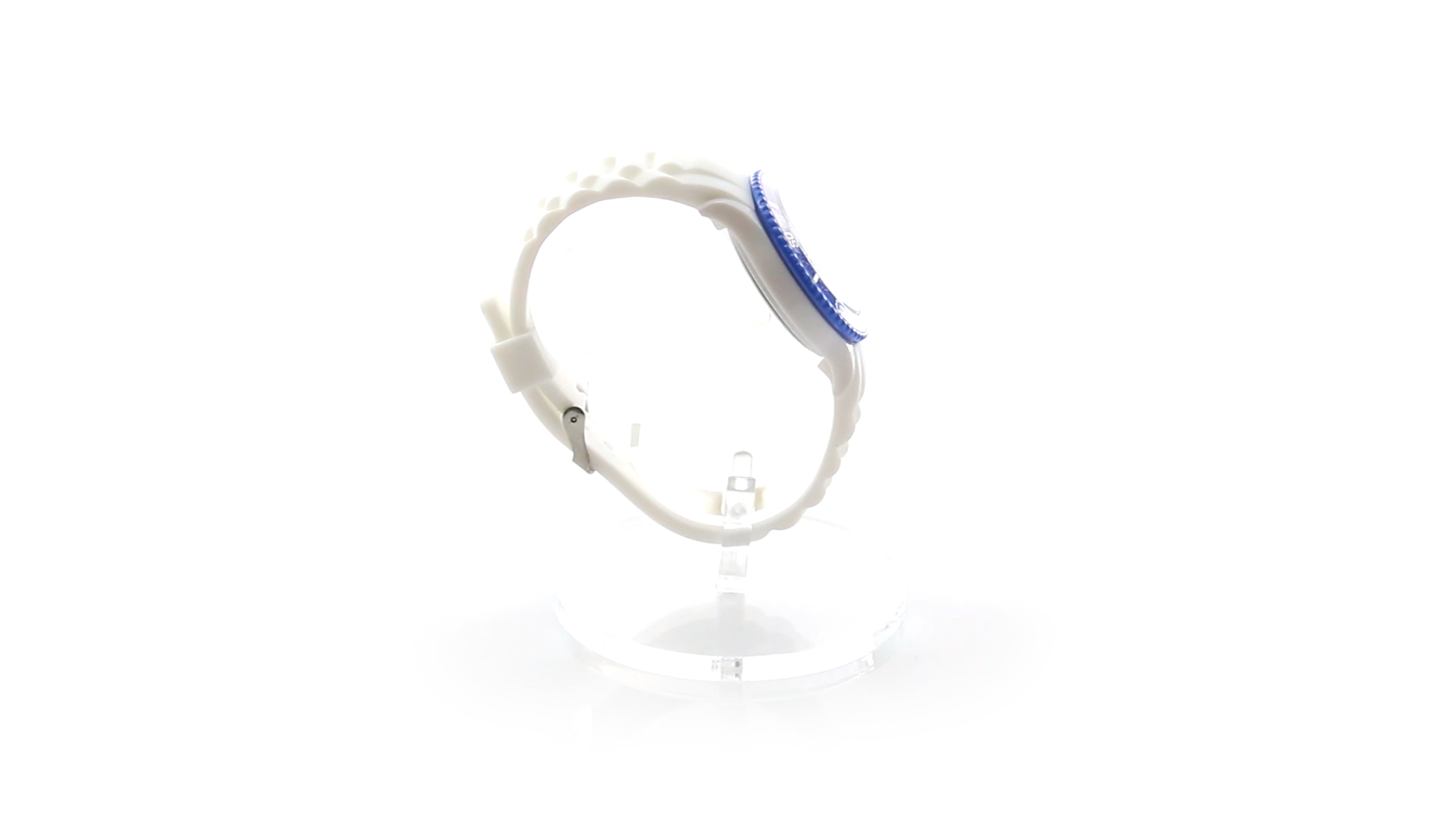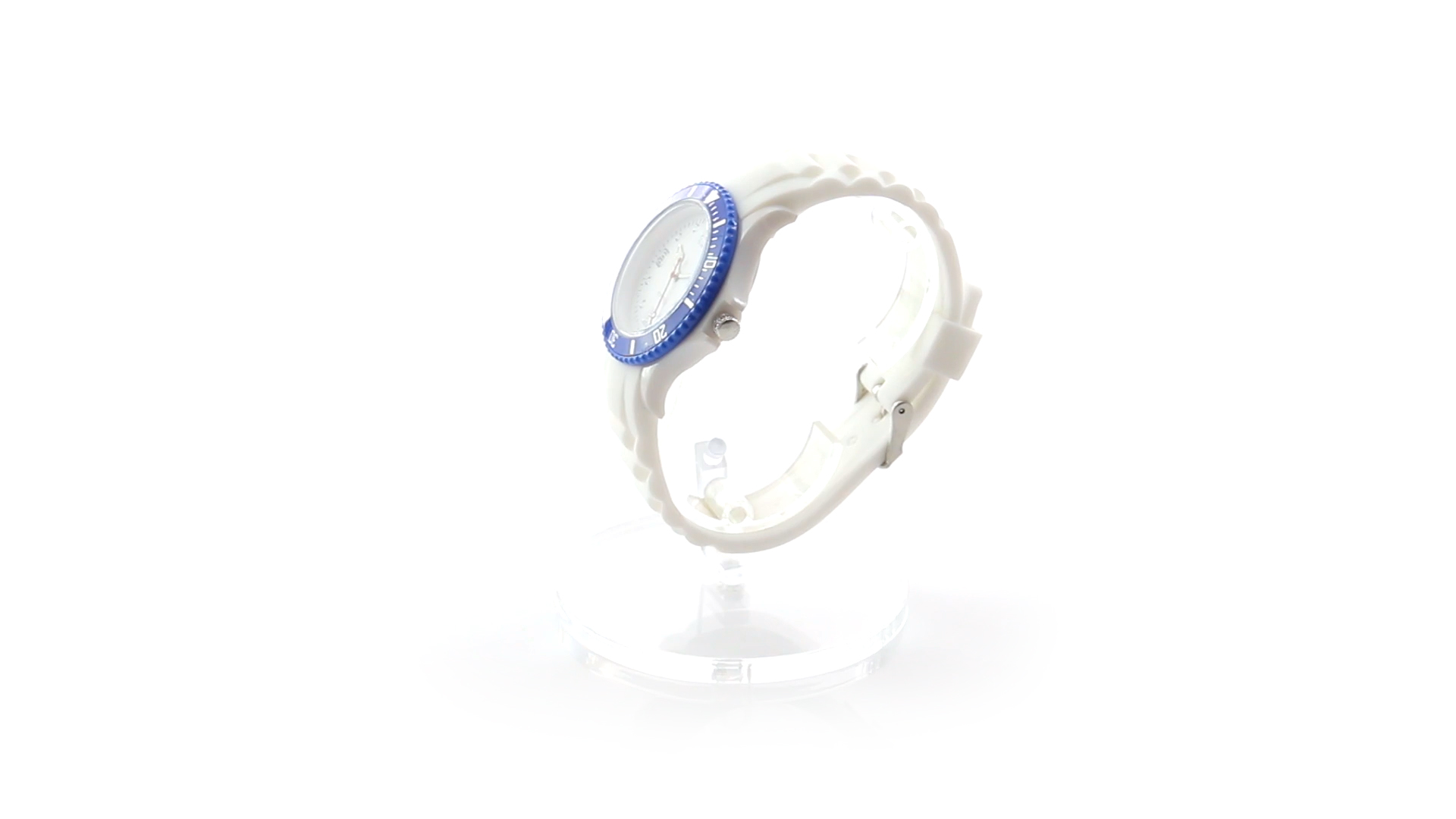 Chronograph-Armbanduhr in origineller zweifarbiger Ausführung. Mit Chronograph in fröhlichen Farben, analogem Zifferblatt und Silikonarmband in Weiss. Spritzwassergeschützt. Präsentiert in einem individuellen Beutel.