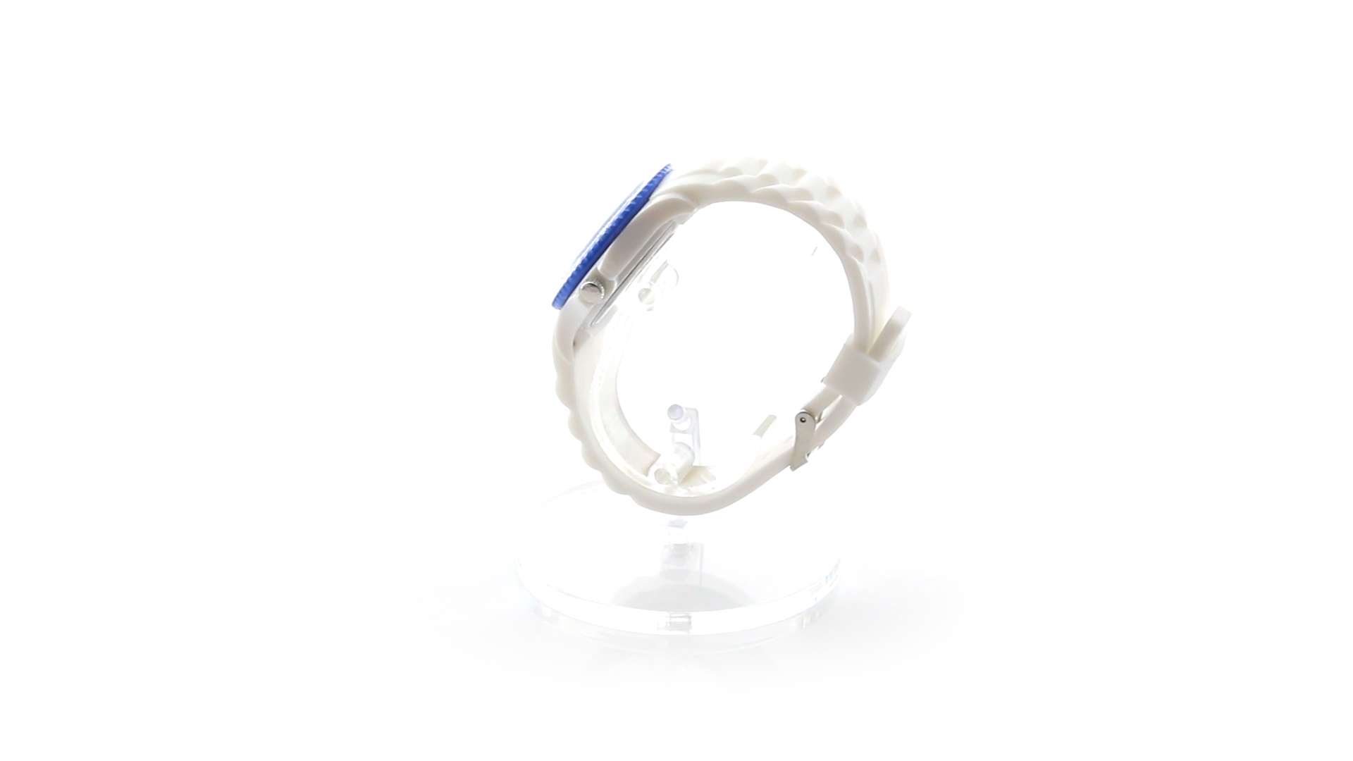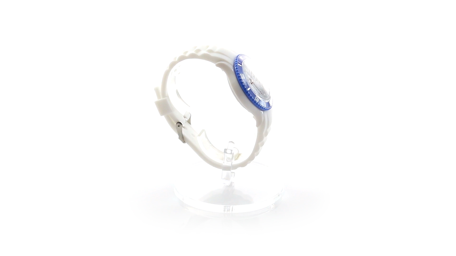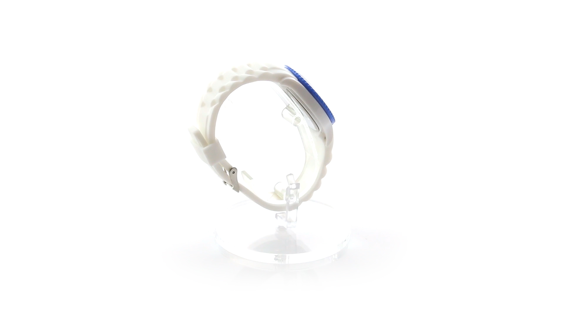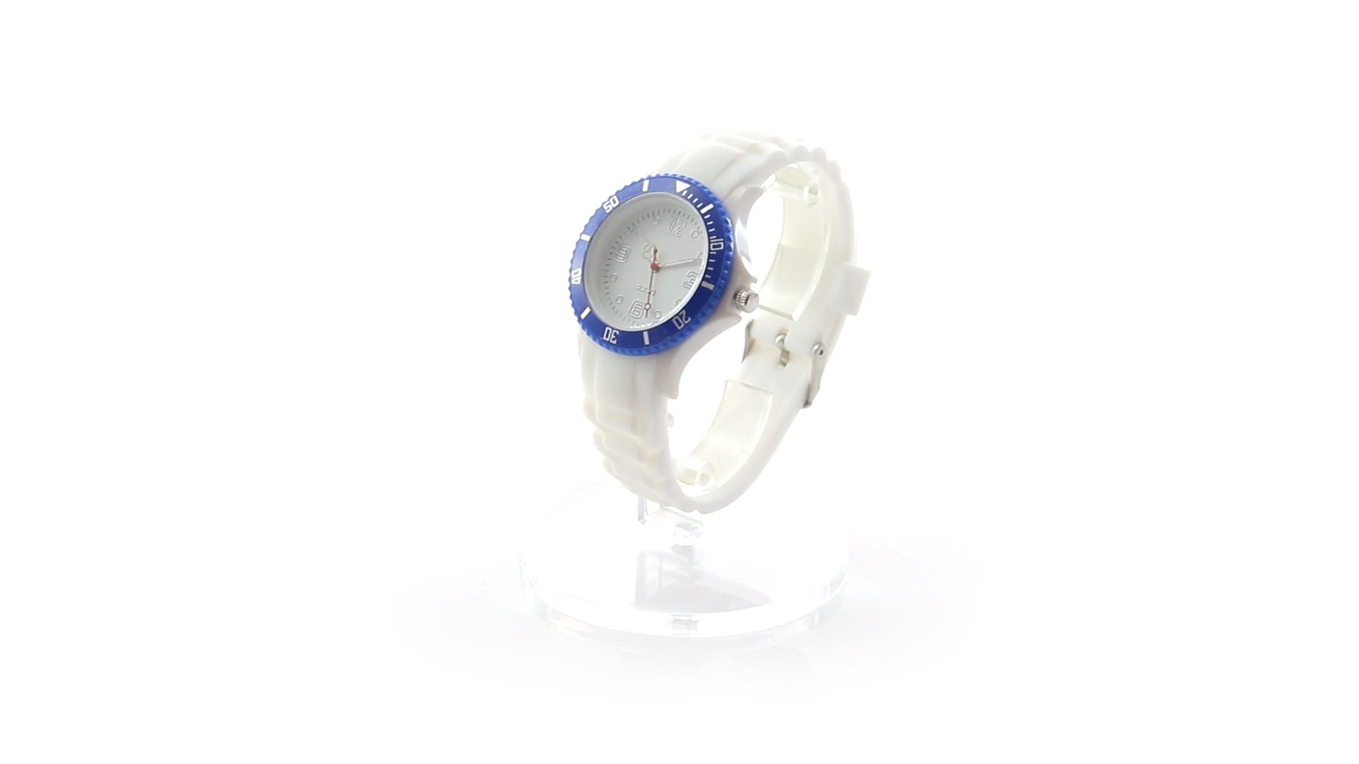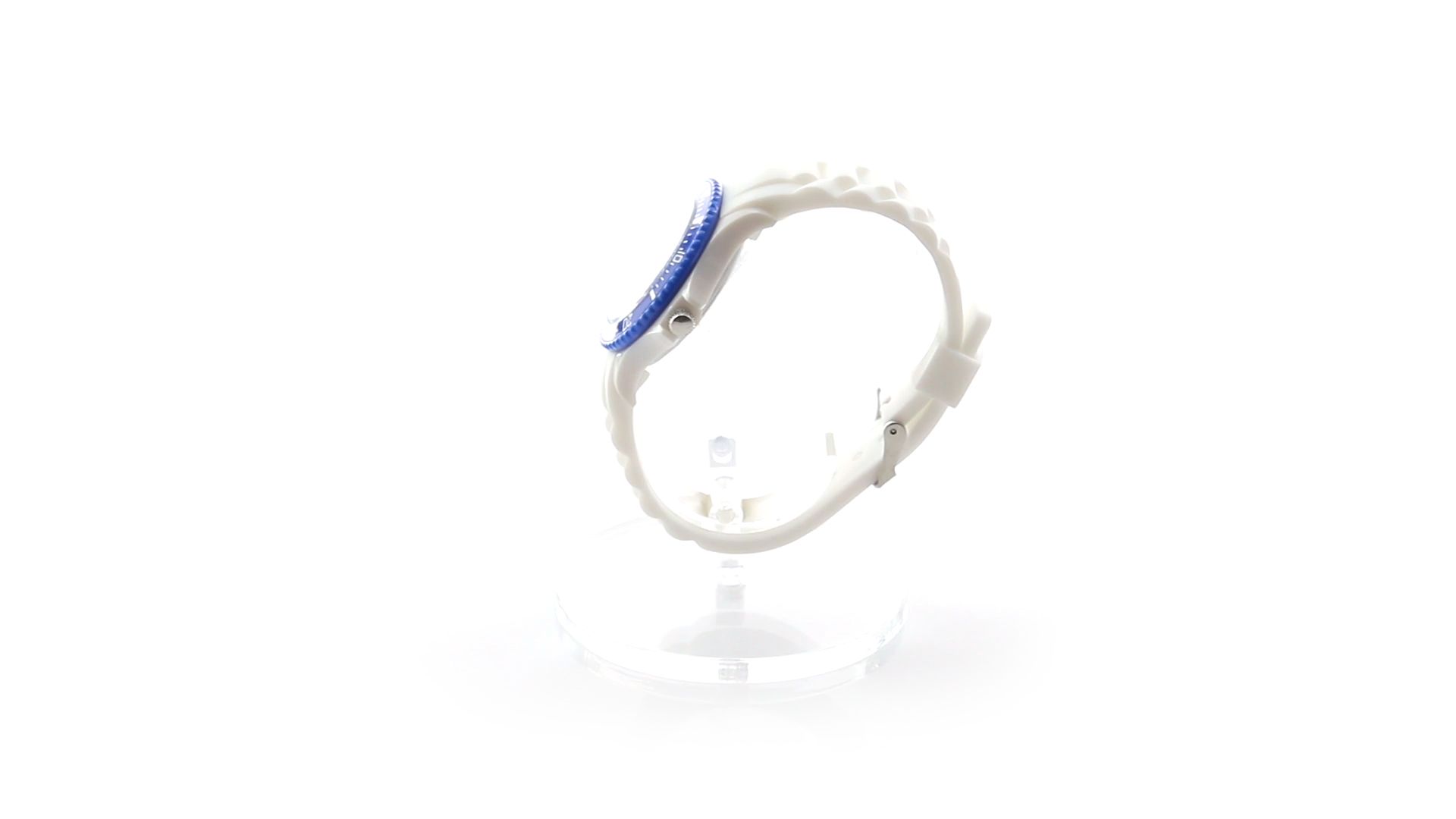 Chronograph-Armbanduhr in origineller zweifarbiger Ausführung. Mit Chronograph in fröhlichen Farben, analogem Zifferblatt und Silikonarmband in Weiss. Spritzwassergeschützt. Präsentiert in einem individuellen Beutel.