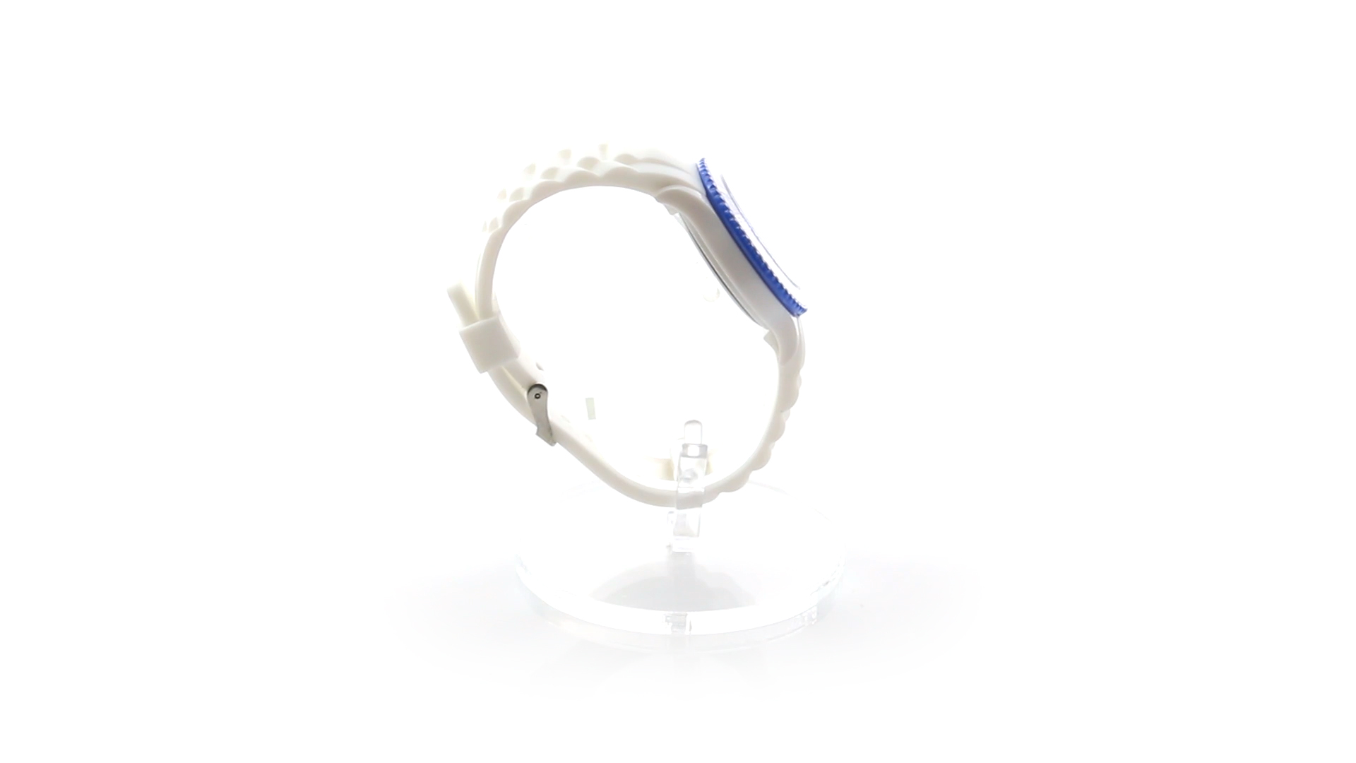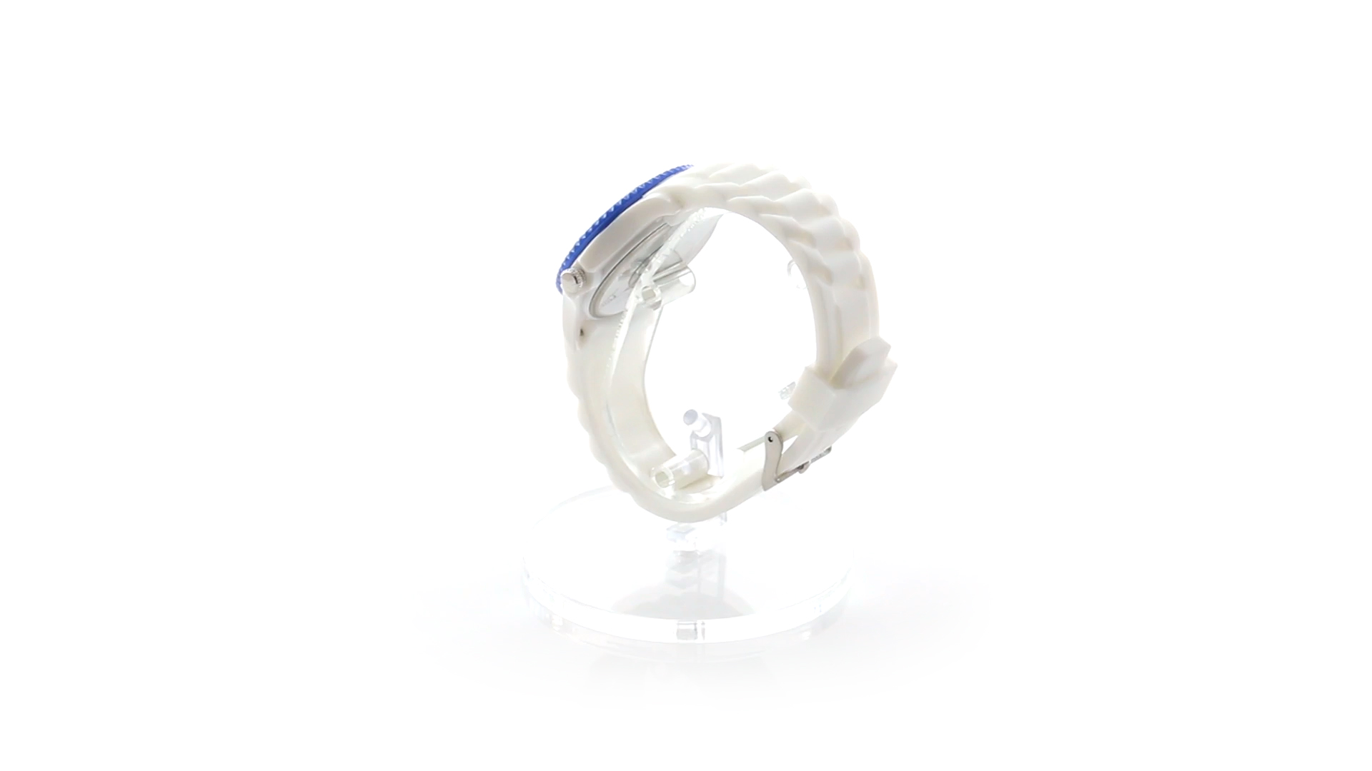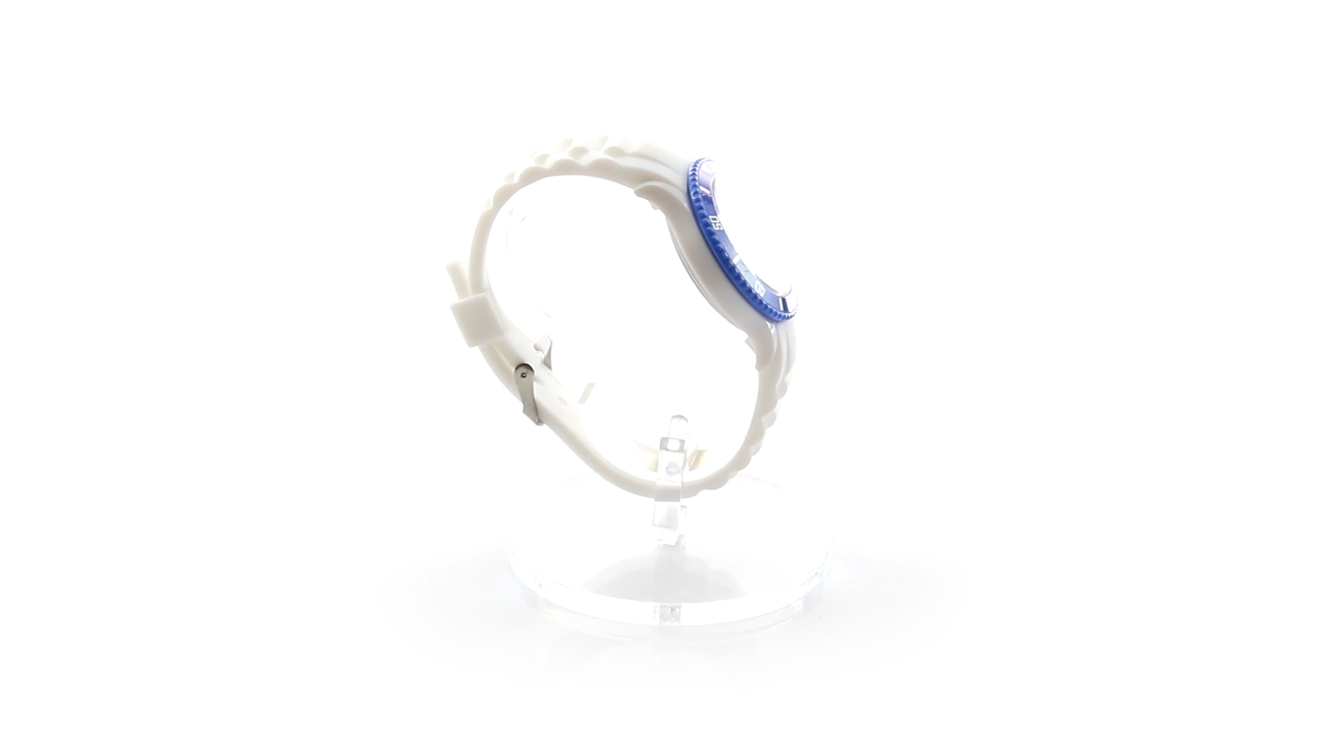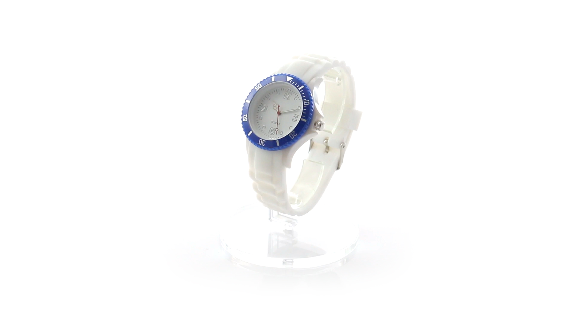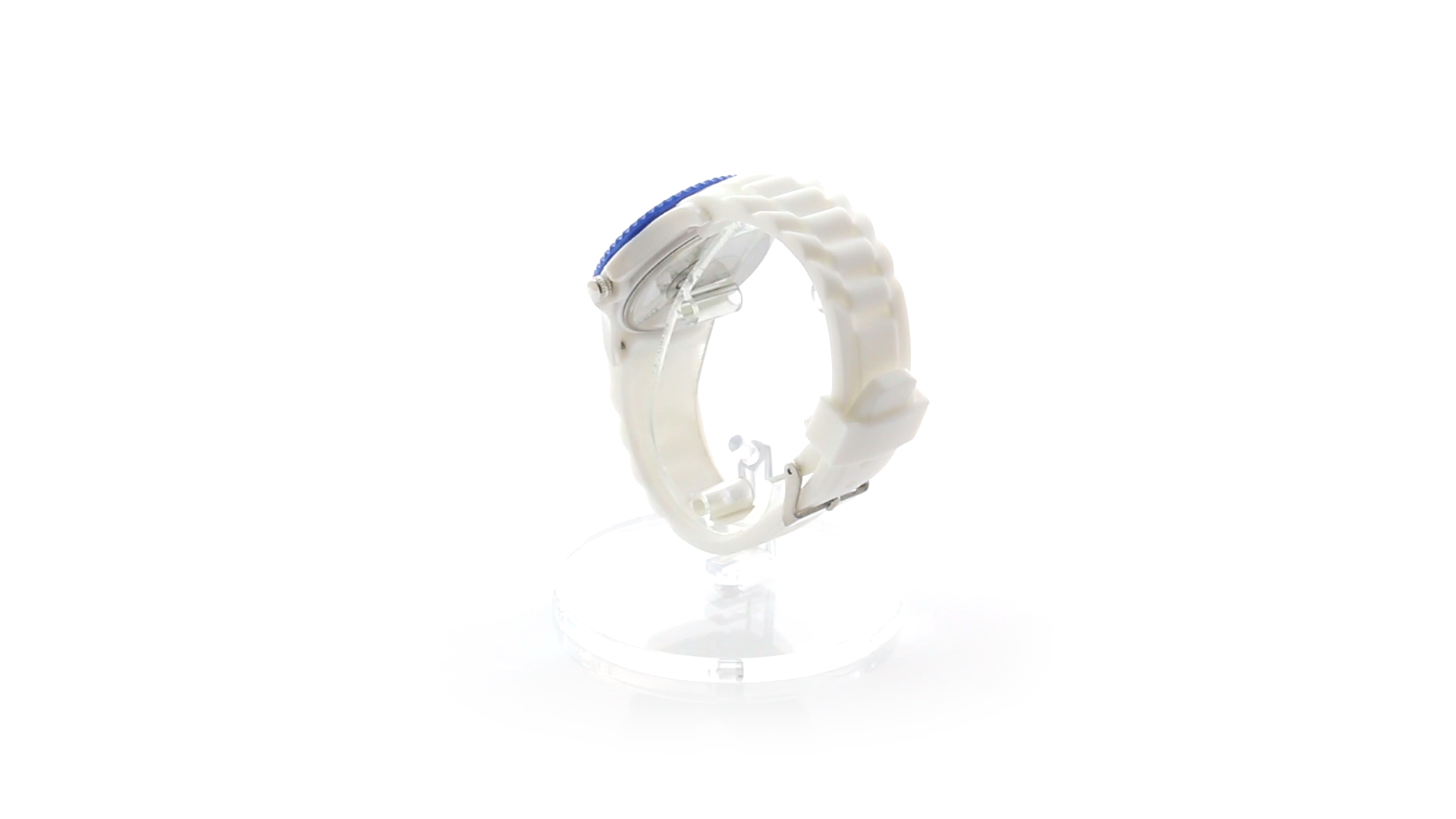 Chronograph-Armbanduhr in origineller zweifarbiger Ausführung. Mit Chronograph in fröhlichen Farben, analogem Zifferblatt und Silikonarmband in Weiss. Spritzwassergeschützt. Präsentiert in einem individuellen Beutel.