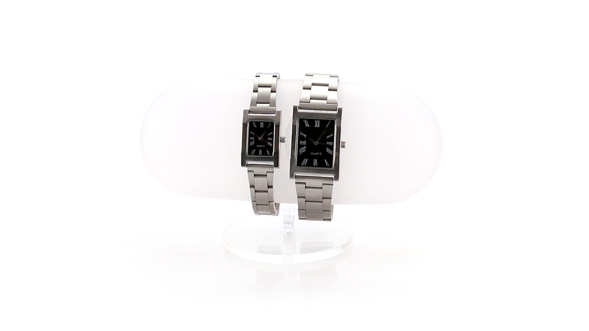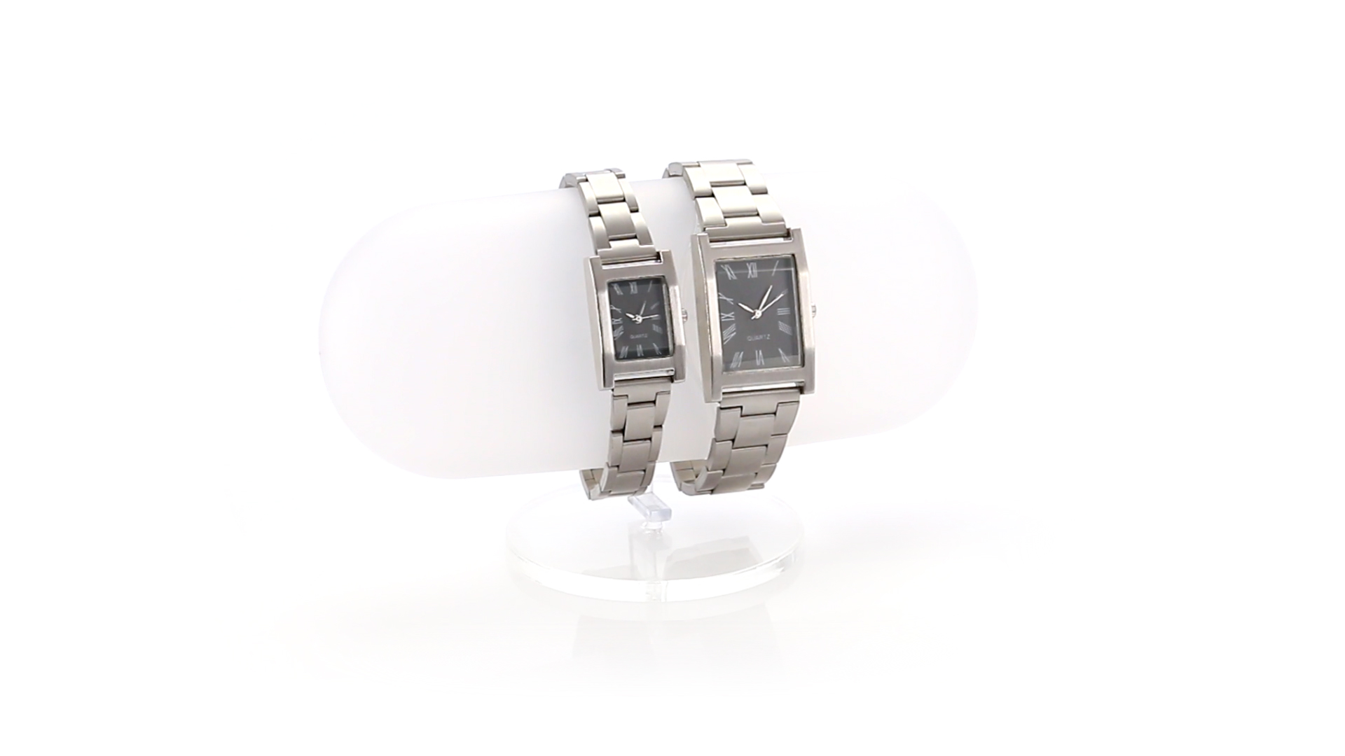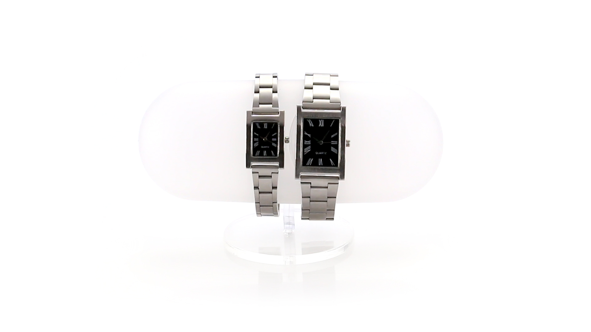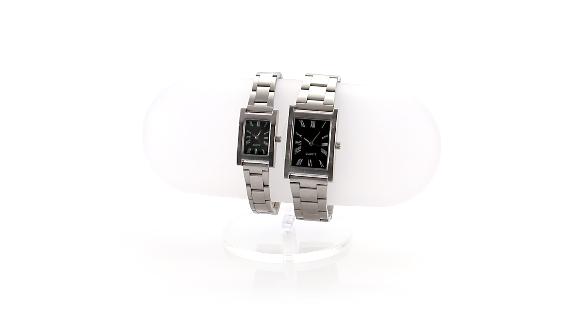 Elegantes Armbanduhren-Set für Mann und Frau. Metallgehäuse mit rechteckigem Analog-Zifferblatt sowie verstellbarem Metallband. Präsentiert in einer individuellen schwarzen Schachtel mit Magnetverschluss.
